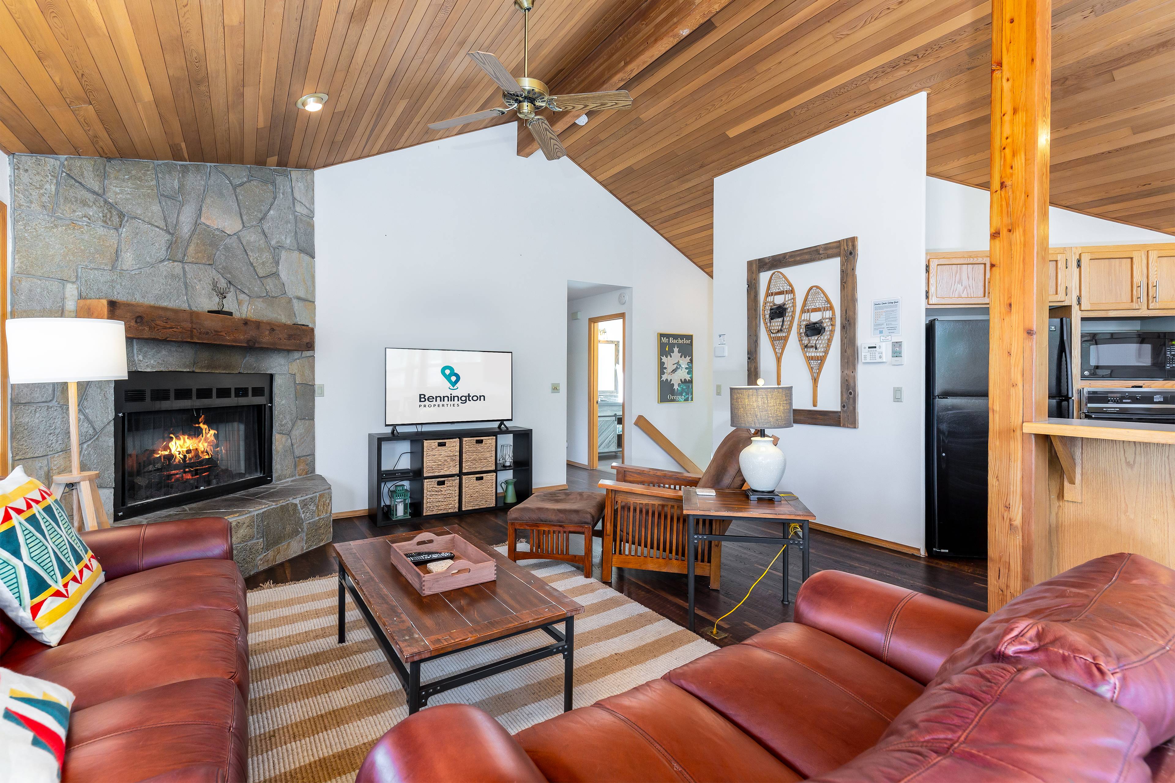 Inside this reverse-living home, you'll find the living space with vaulted ceilings and an open layout, creating an inviting atmosphere for entertaining and spending quality time with loved ones. Abundant windows, cozy furnishings, stylish decor, and an abundance of natural light enhance the overall charm and comfort of the home. There is a large Smart TV for streaming your favorite apps.
