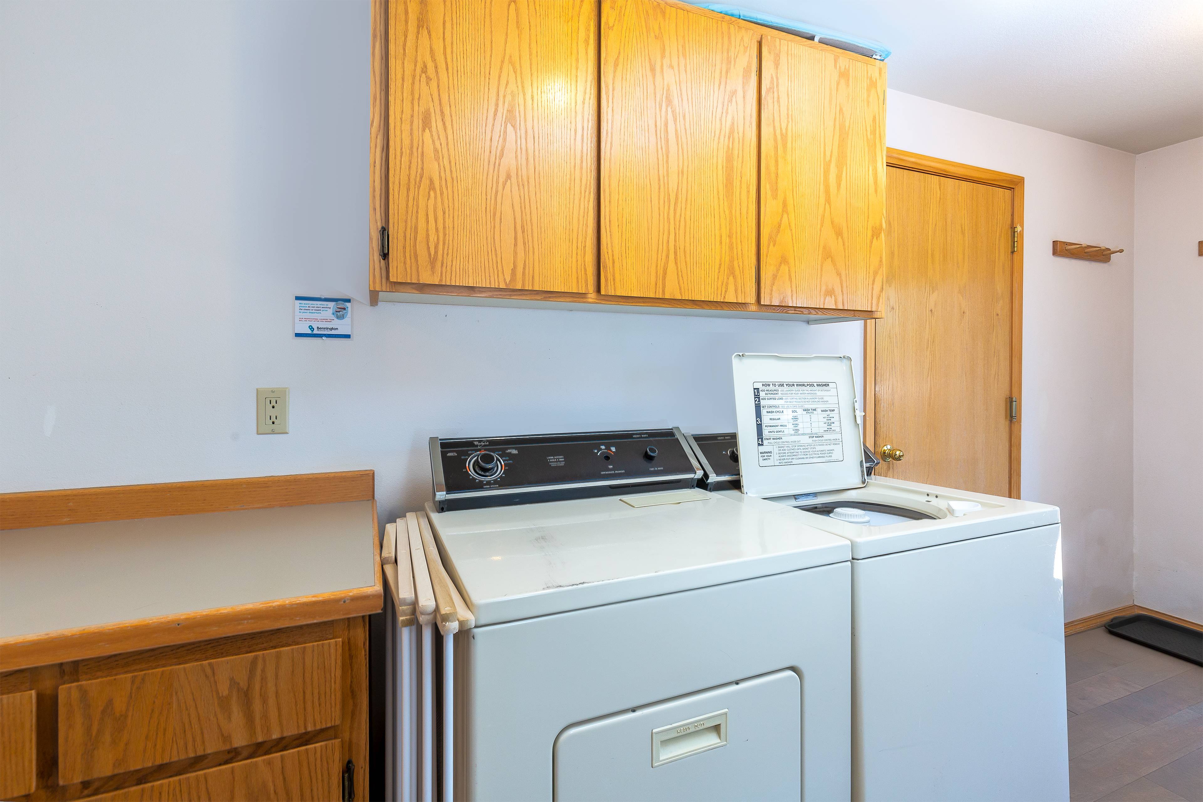 Downstairs are two additional bedrooms. Bedroom one is a queen bedroom, and the other bedroom has a queen bed and three twin beds, plus a rollaway twin, for additional sleeping. Between these rooms is a shared full bathroom with shower over tub. All beds have new mattresses. Both downstairs bedrooms have a Smart TV and DVD player.