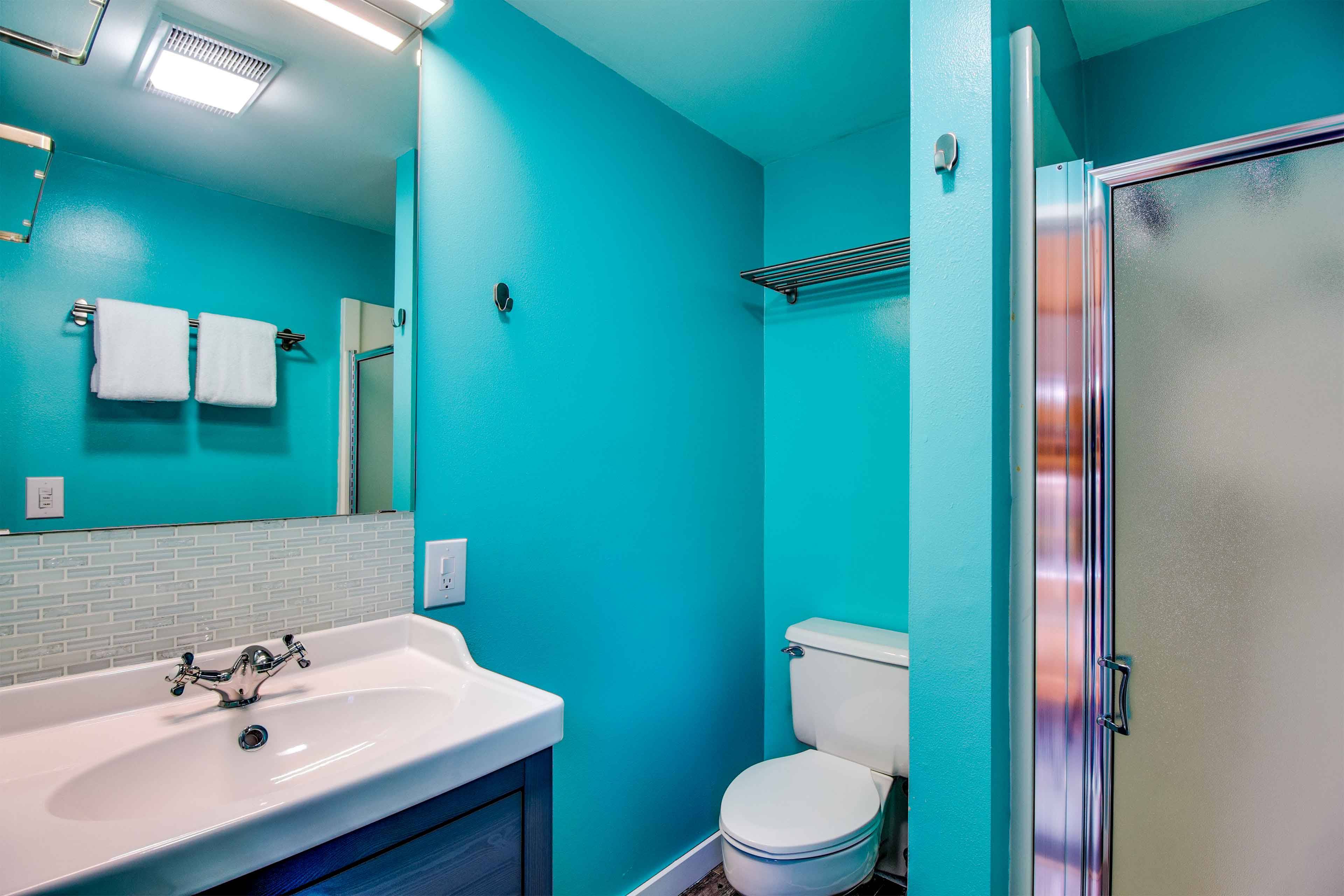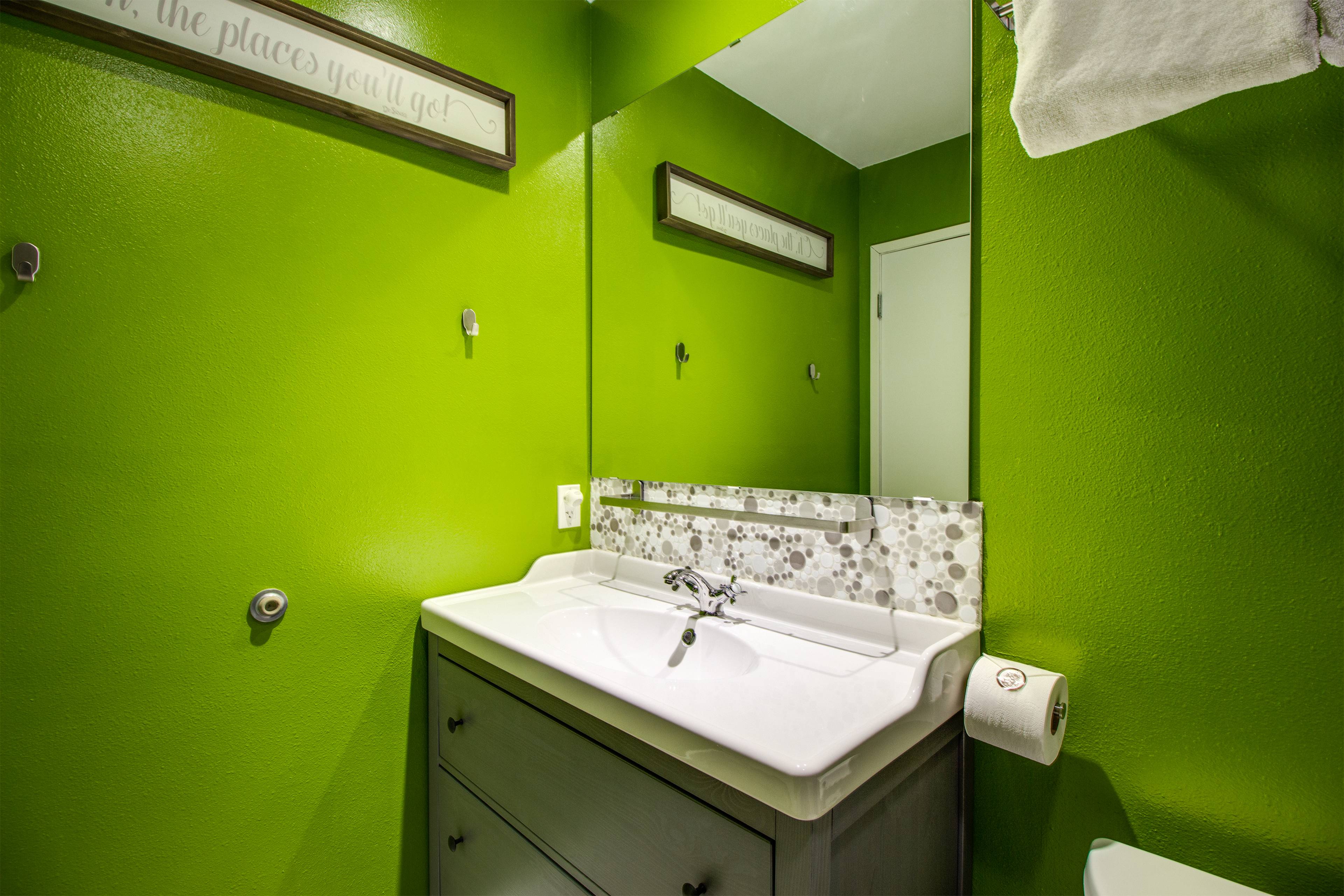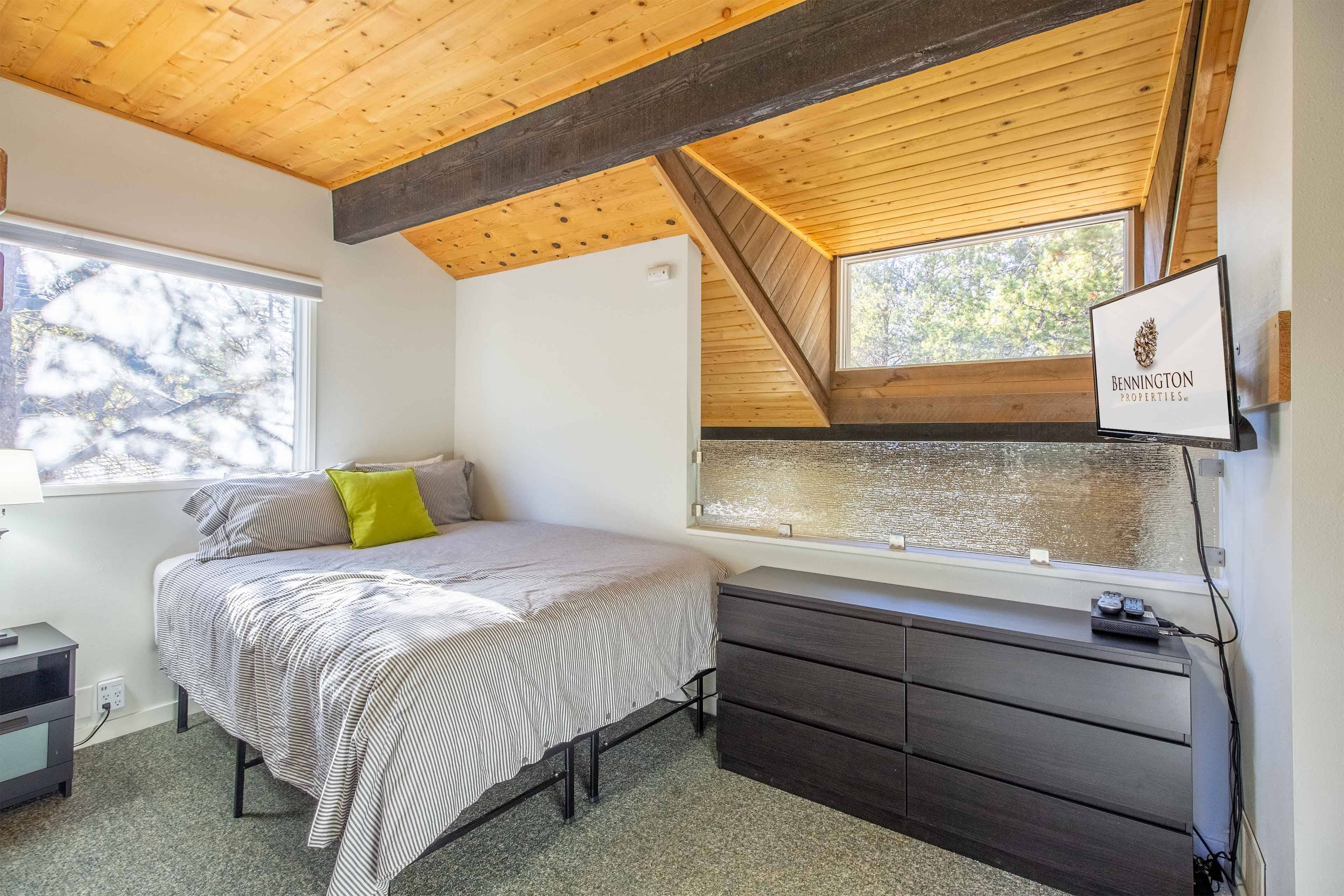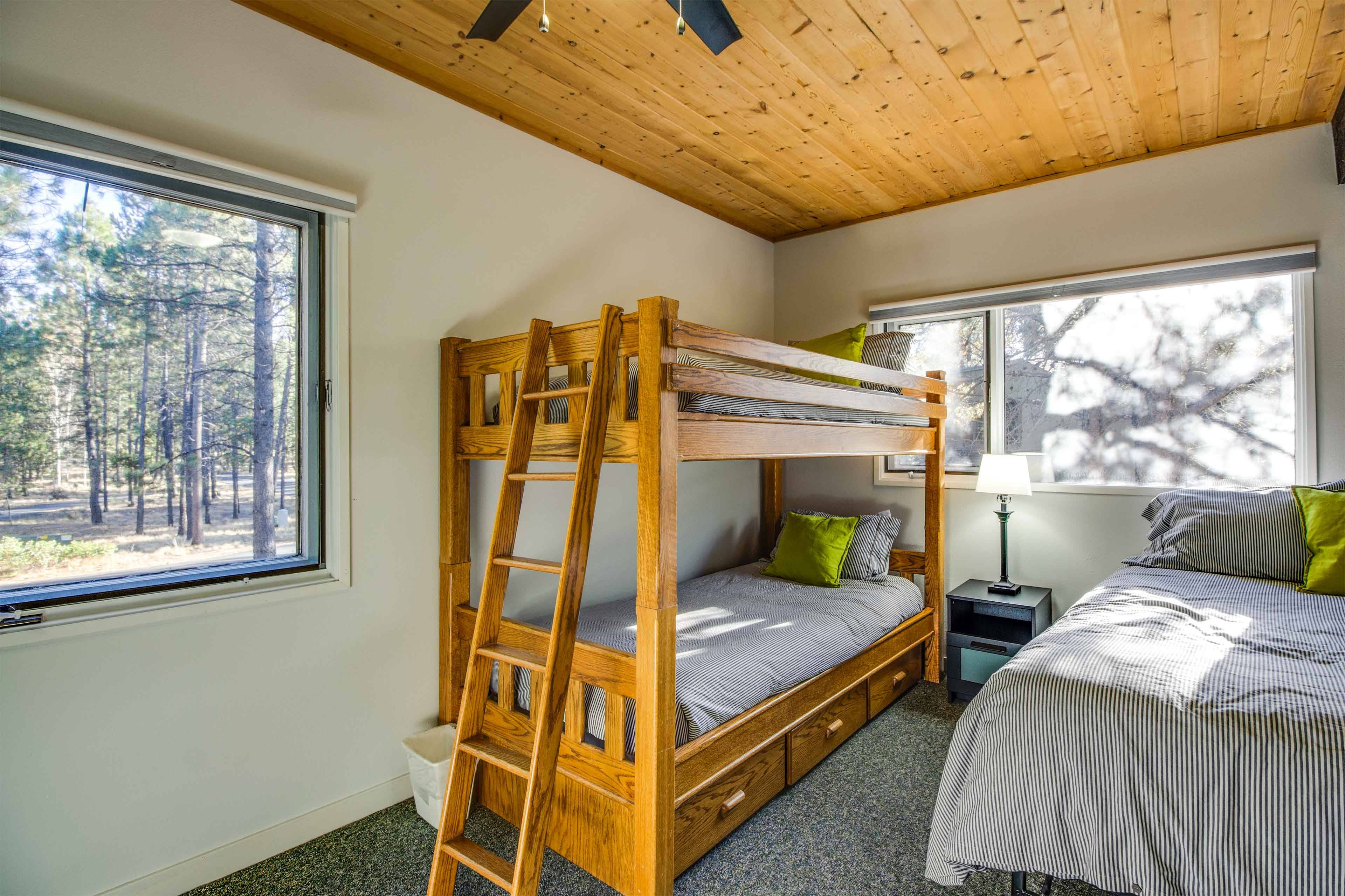 Head upstairs to the open loft with a queen bed, twin bunk bed and a private bathroom.