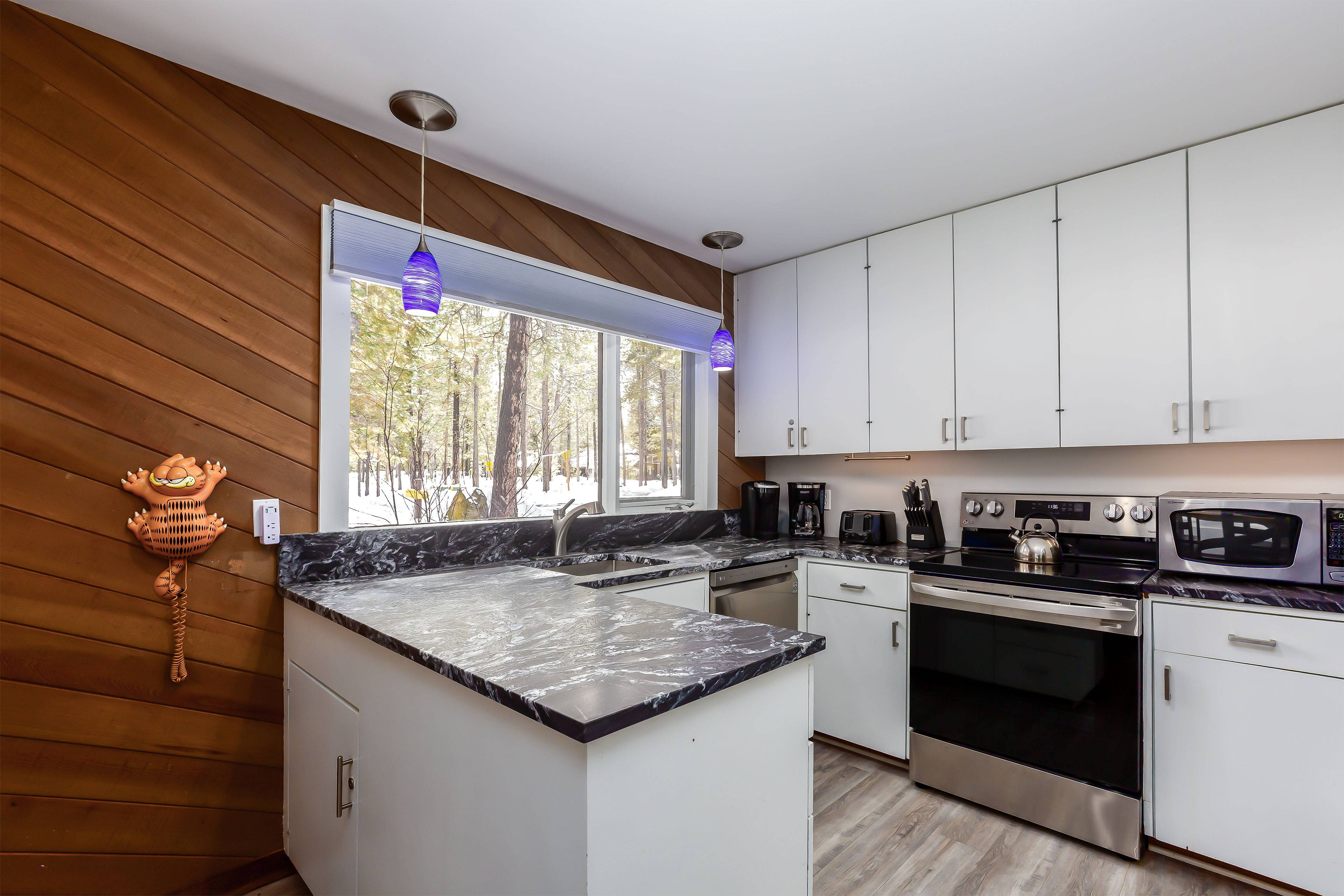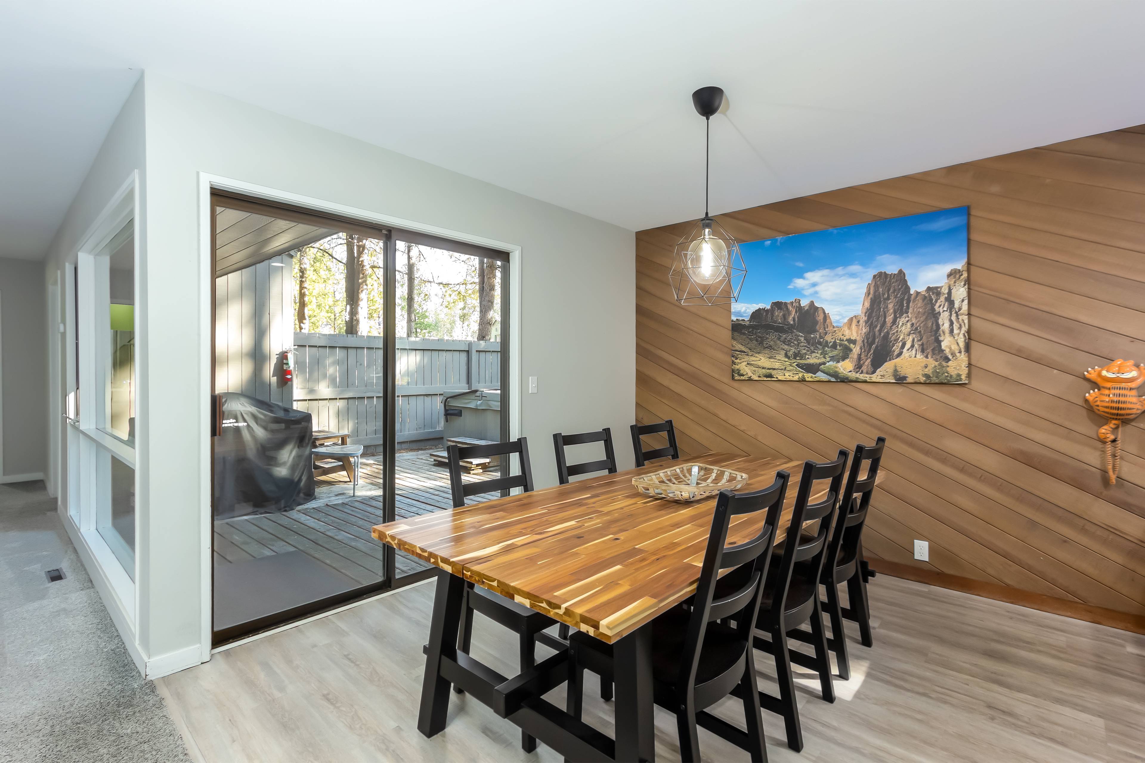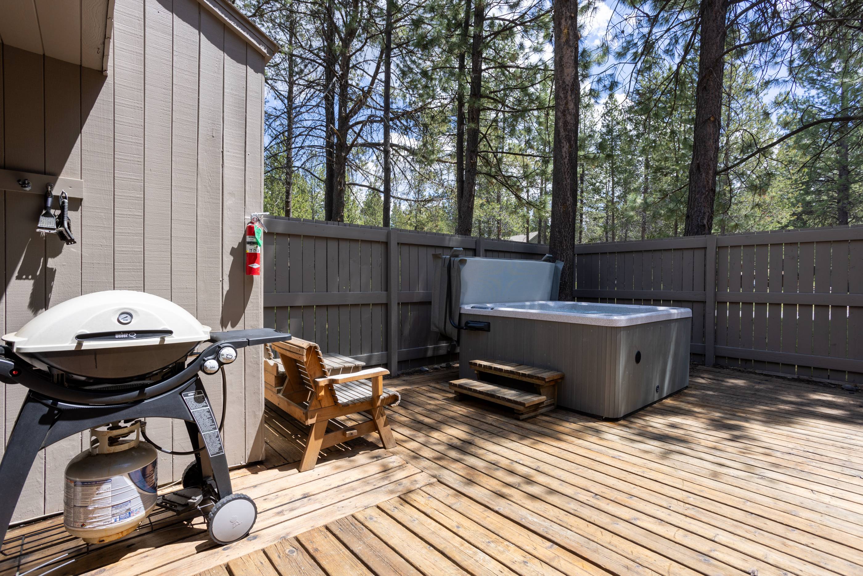The living area has a flat screen TV and a wood burning, stone fireplace that creates a great cozy feeling on a Sunriver winter night. The enclosed private patio is great for soaking under the stars in the hot tub or grilling in the summer months.