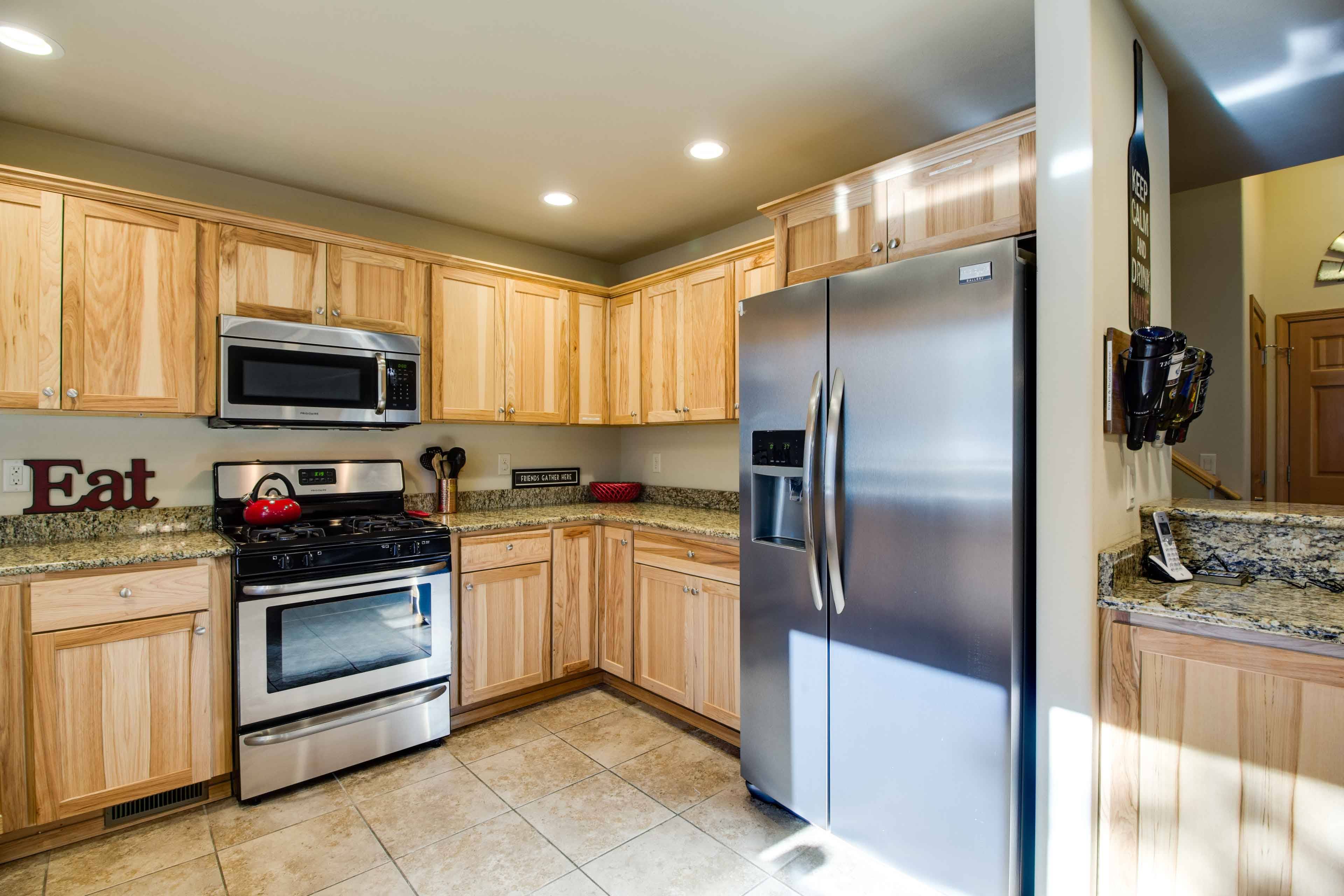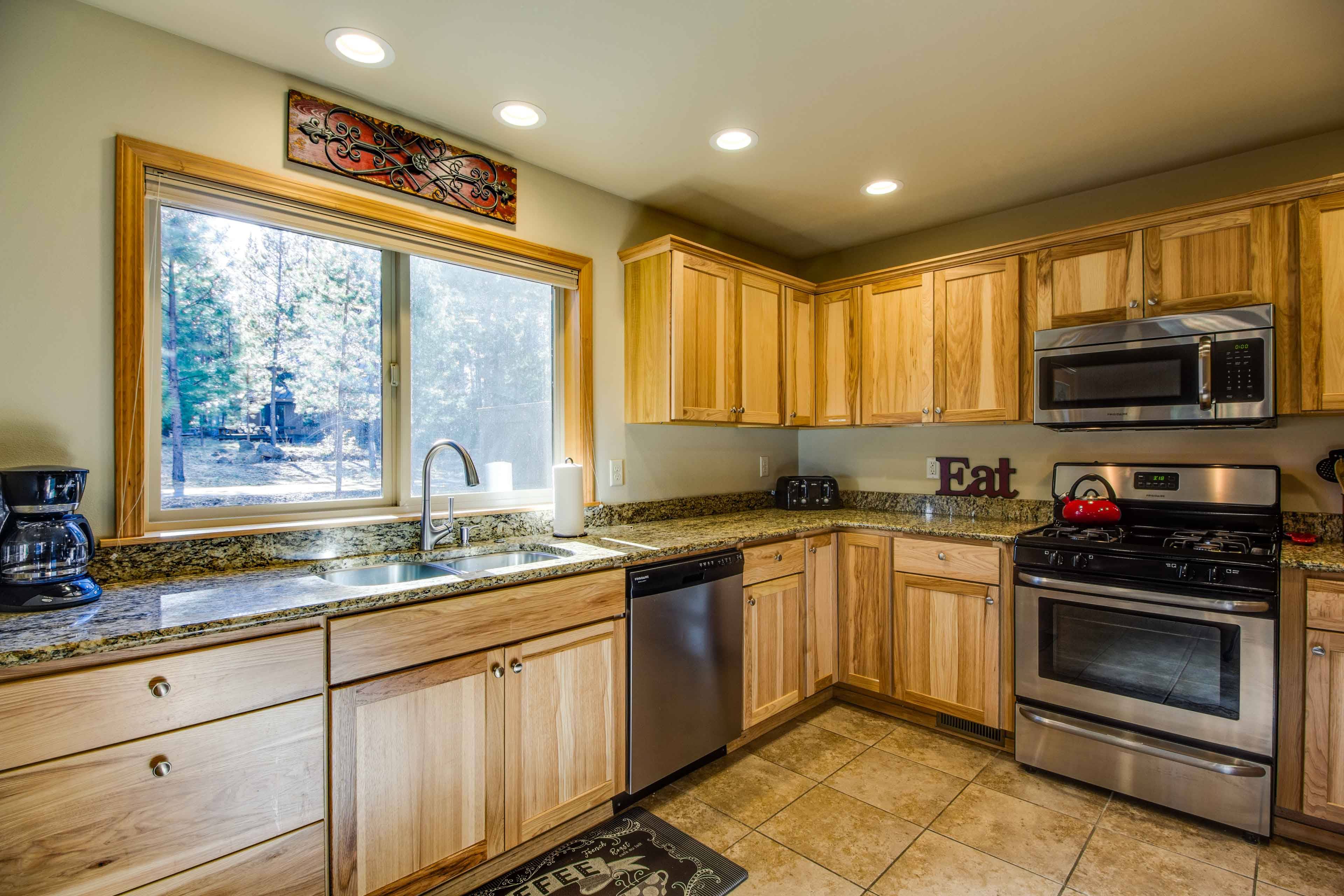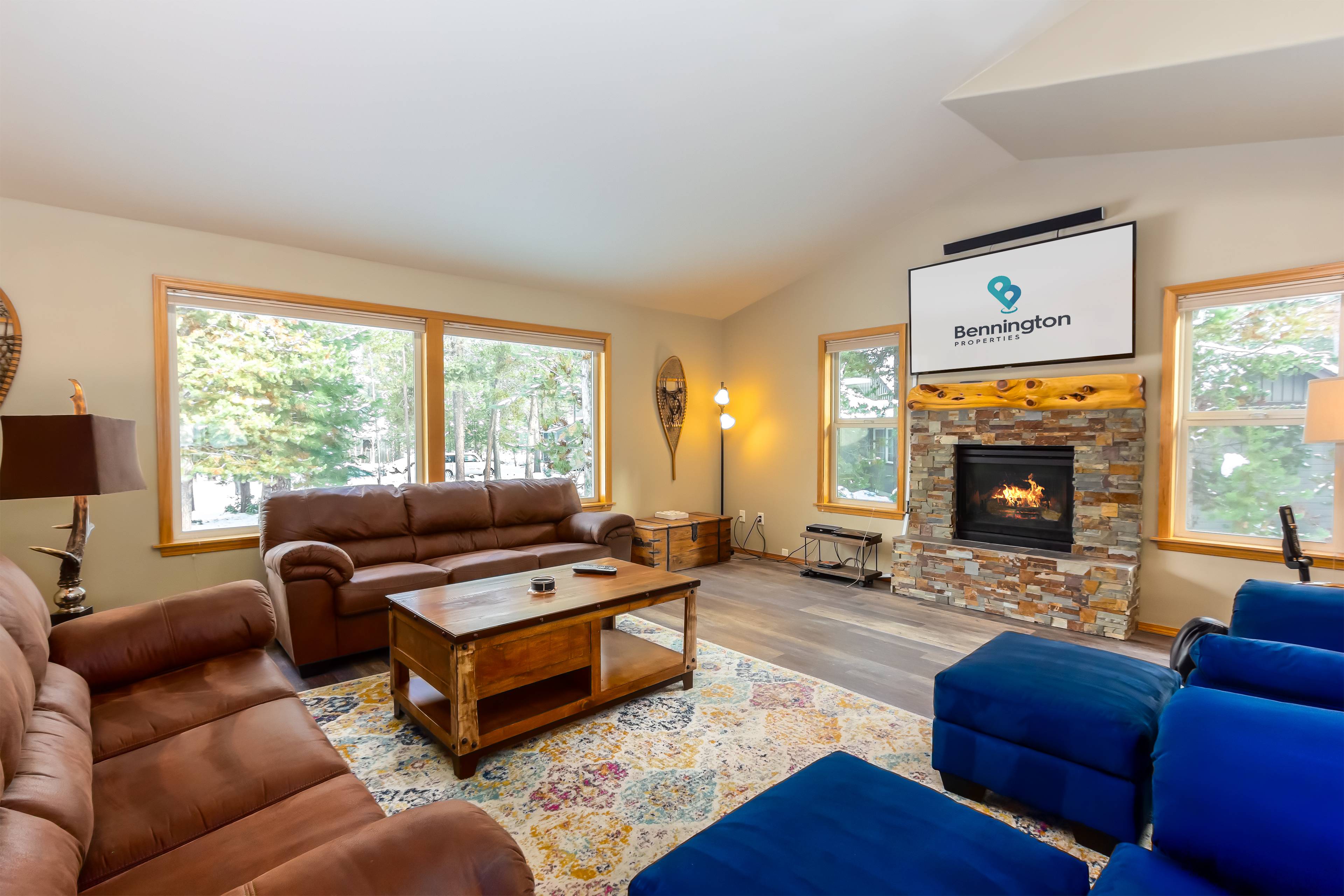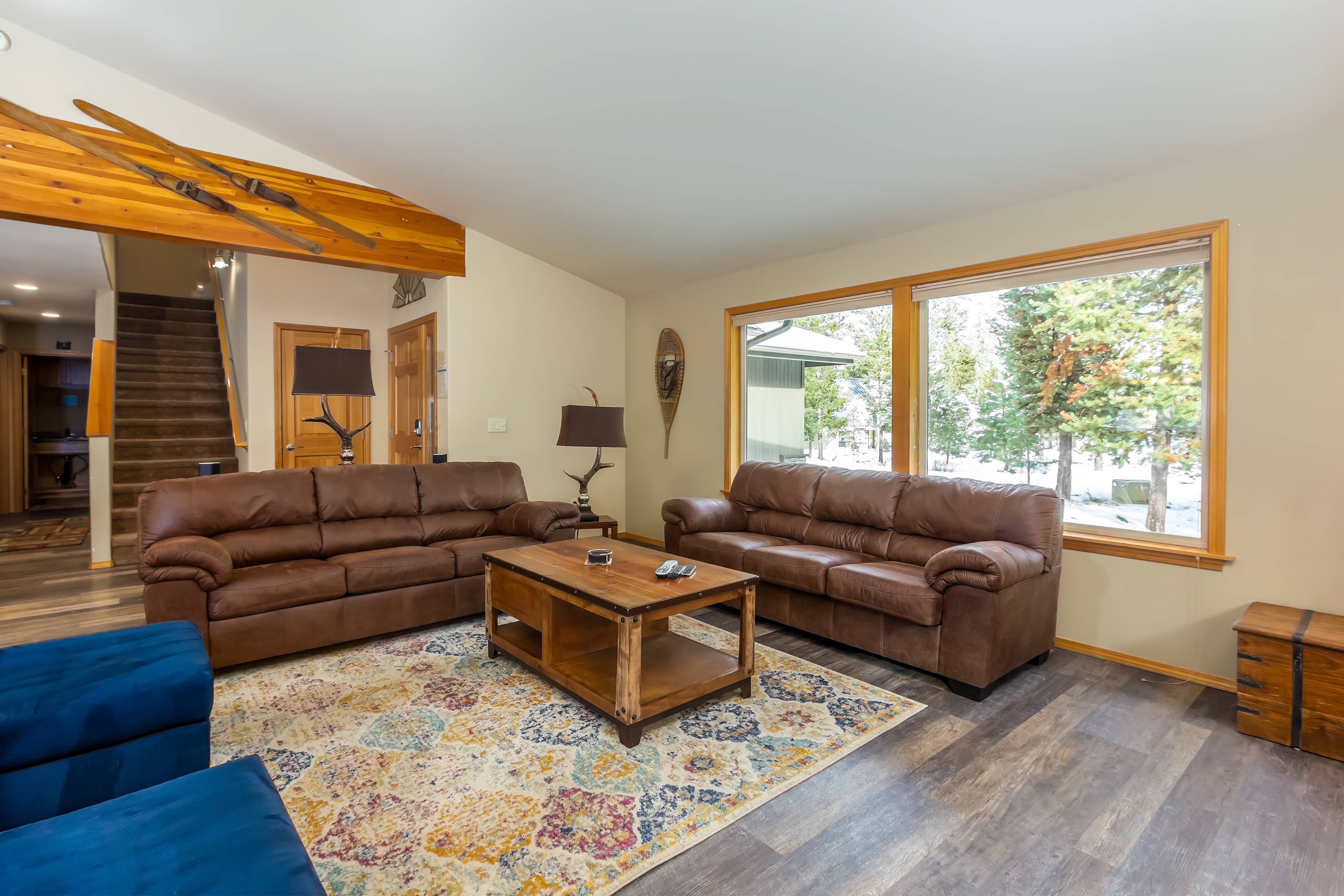 The inviting living room features a gas fireplace, large TV, and comfy sectional—ideal for movie night. The well-stocked kitchen makes cooking easy, and the dining area seats 10, so everyone can gather together.