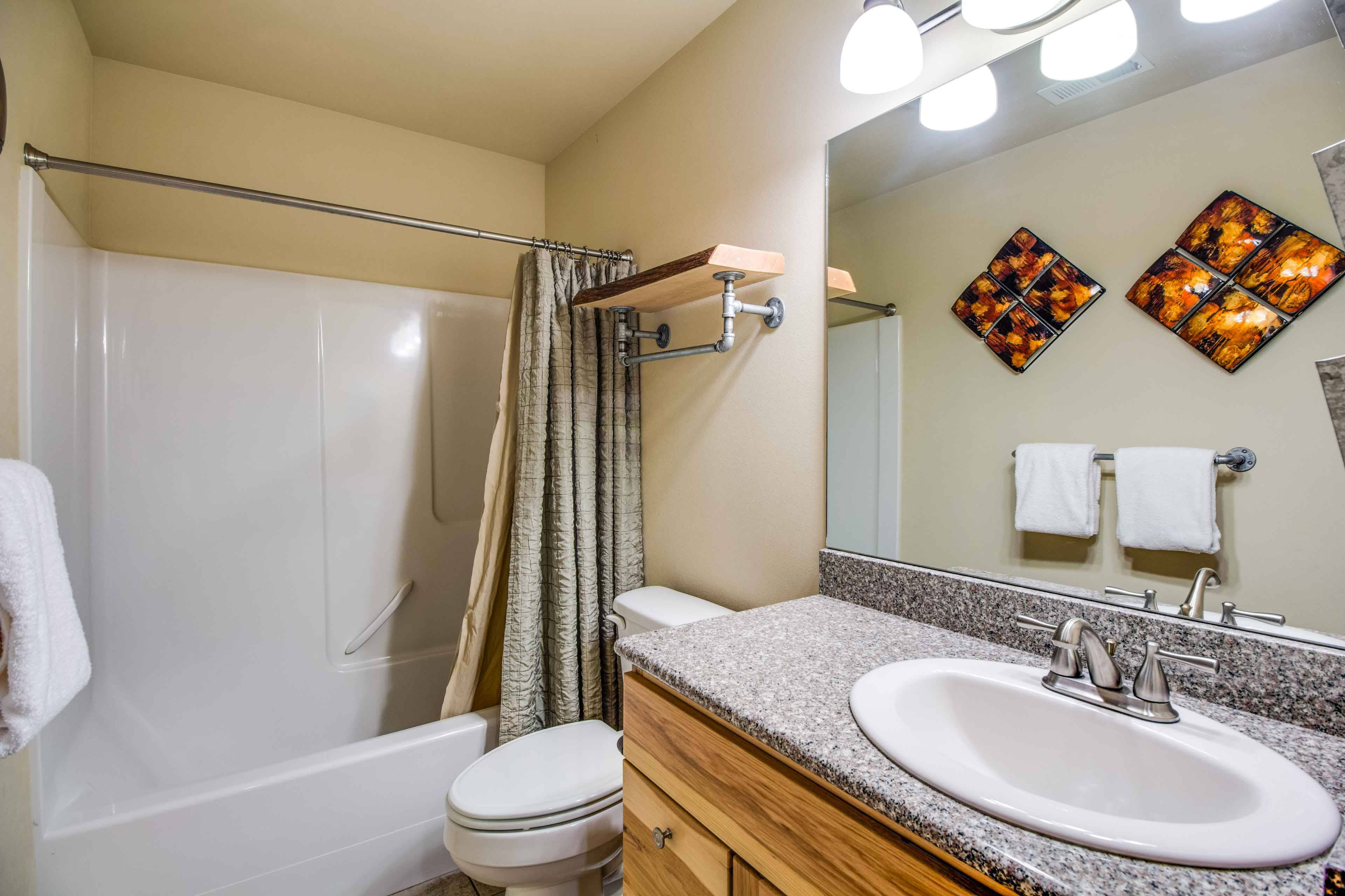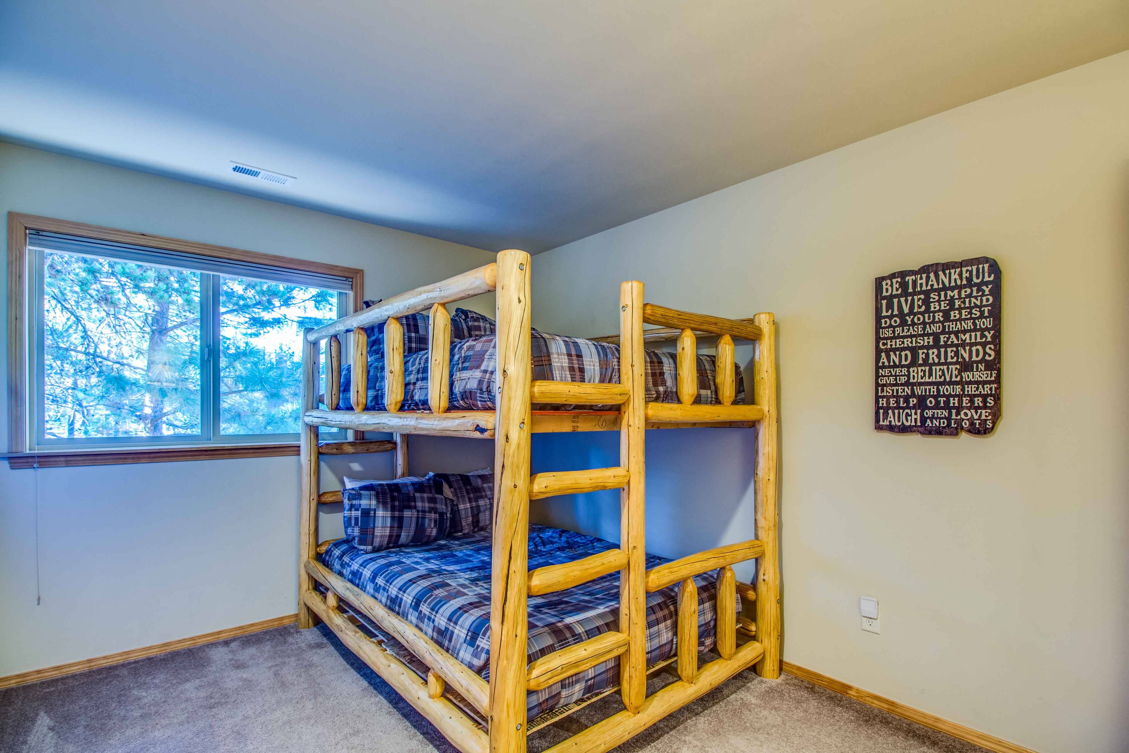 Downstairs, you’ll find a spacious King Ensuite with a TV and direct access to the back deck and hot tub, a guest half bath, and a laundry room. Upstairs is a loft stocked with games and four more bedrooms: a King Ensuite with private bath, two queen-over-queen bunk rooms, and another King Ensuite with a walk-in shower. There’s also a full guest bath upstairs with a shower/tub combo.
