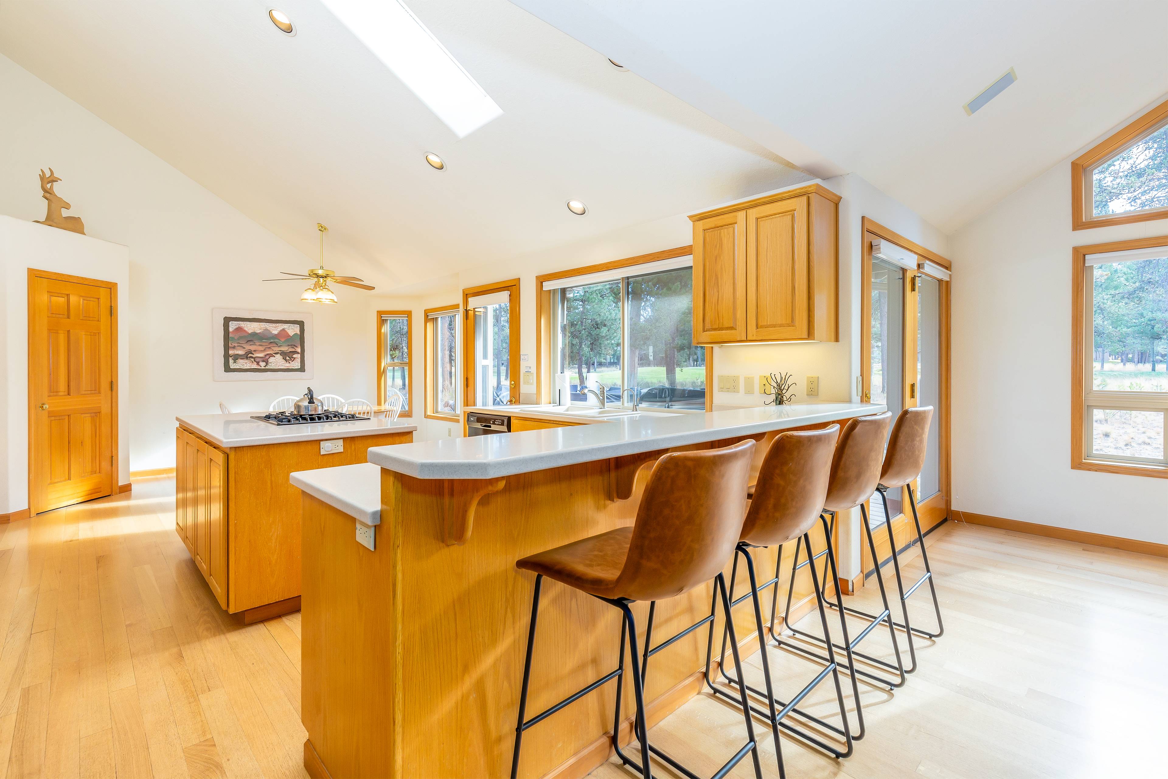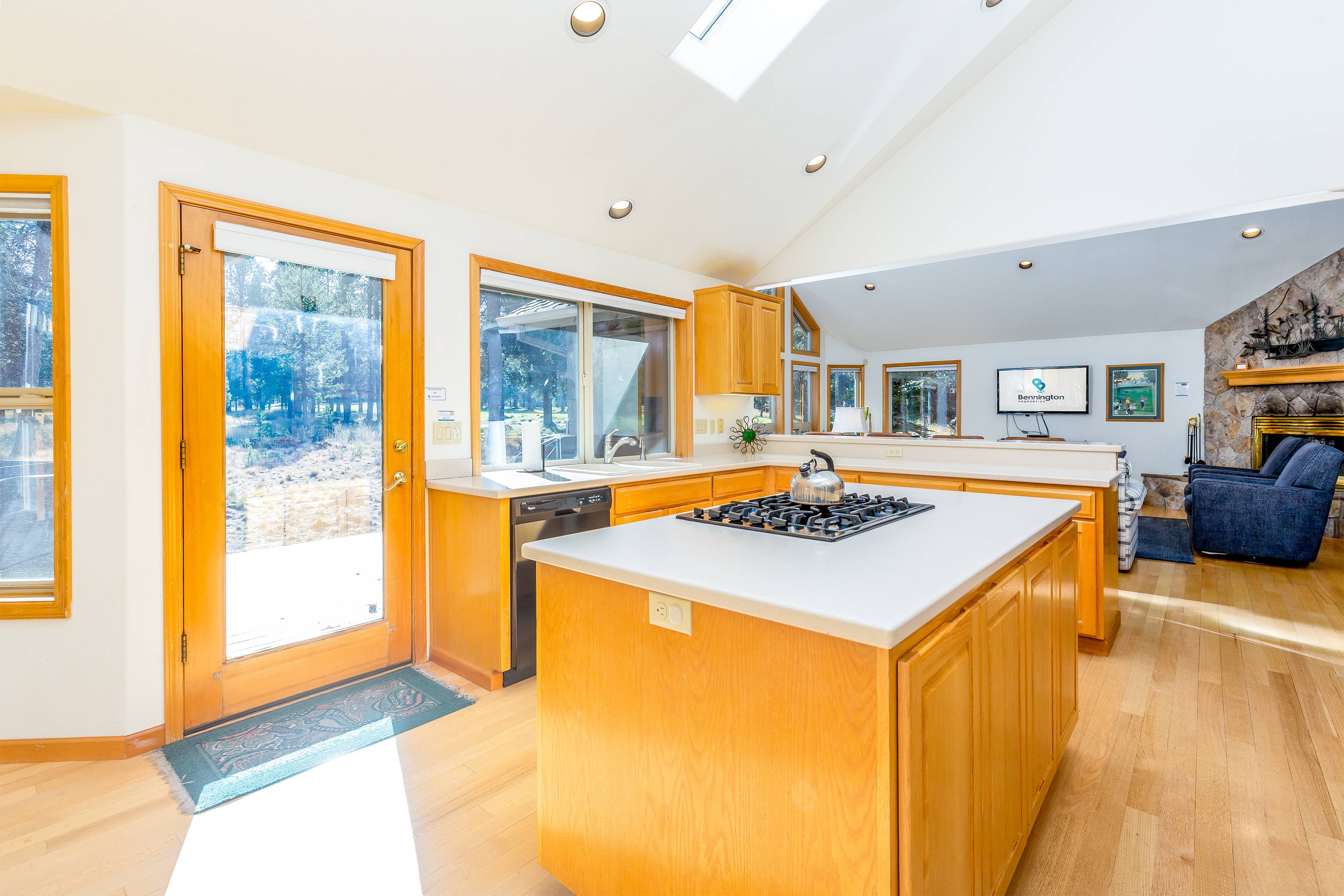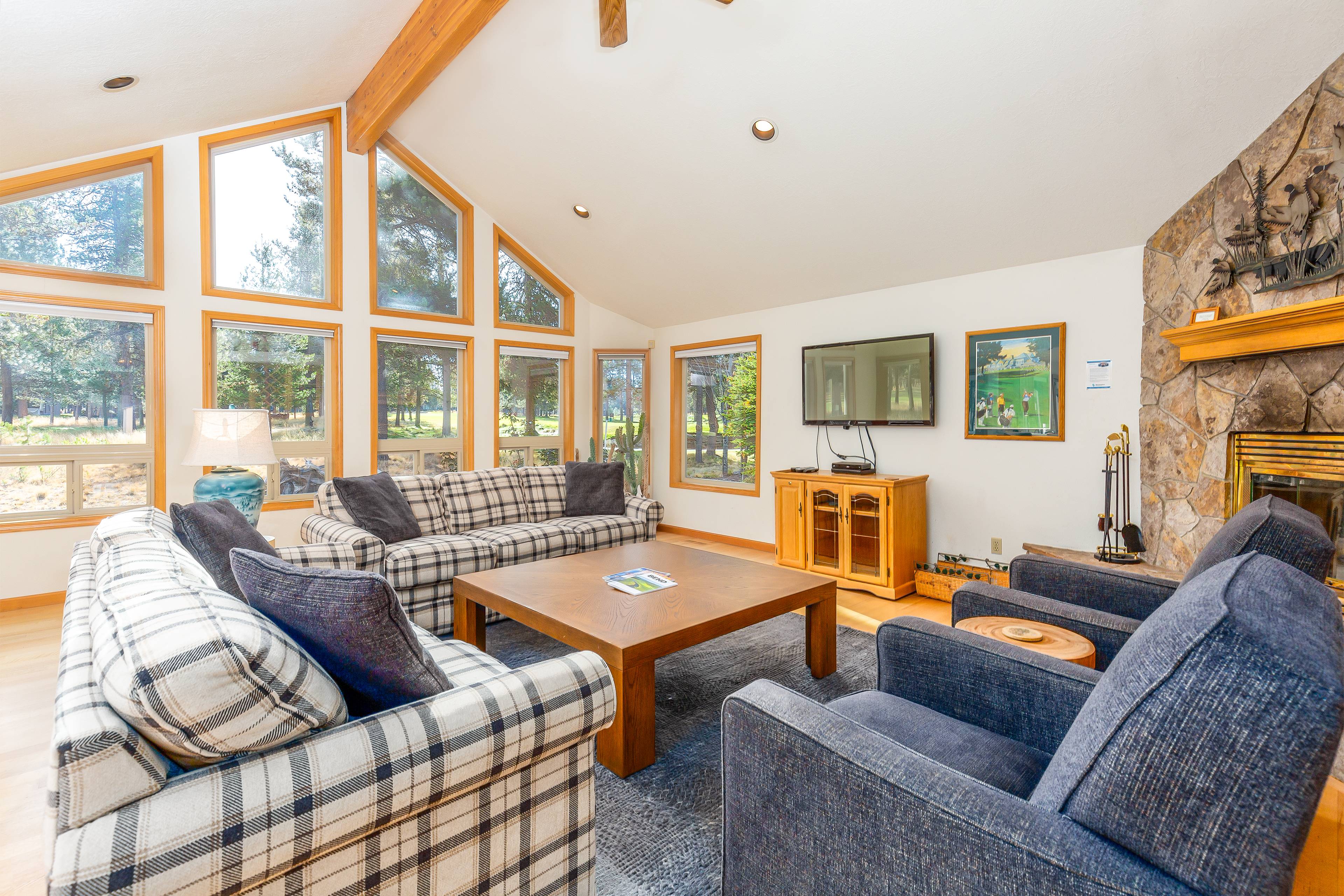 Step into a bright, welcoming space where a generous open living area awaits. The kitchen, dining, and living areas are perfectly designed for hosting memorable gatherings. The kitchen, fully equipped for culinary creations, features abundant counter space, a large island, and a breakfast bar that beckons you to start your day with a steaming cup of coffee. With two distinct dining areas, there's always a perfect spot for mealtime. The living room, adorned with a stacked rock fireplace, a large TV, and brand-new furnishings, offers a cozy retreat at the end of an active day of play in Sunriver.