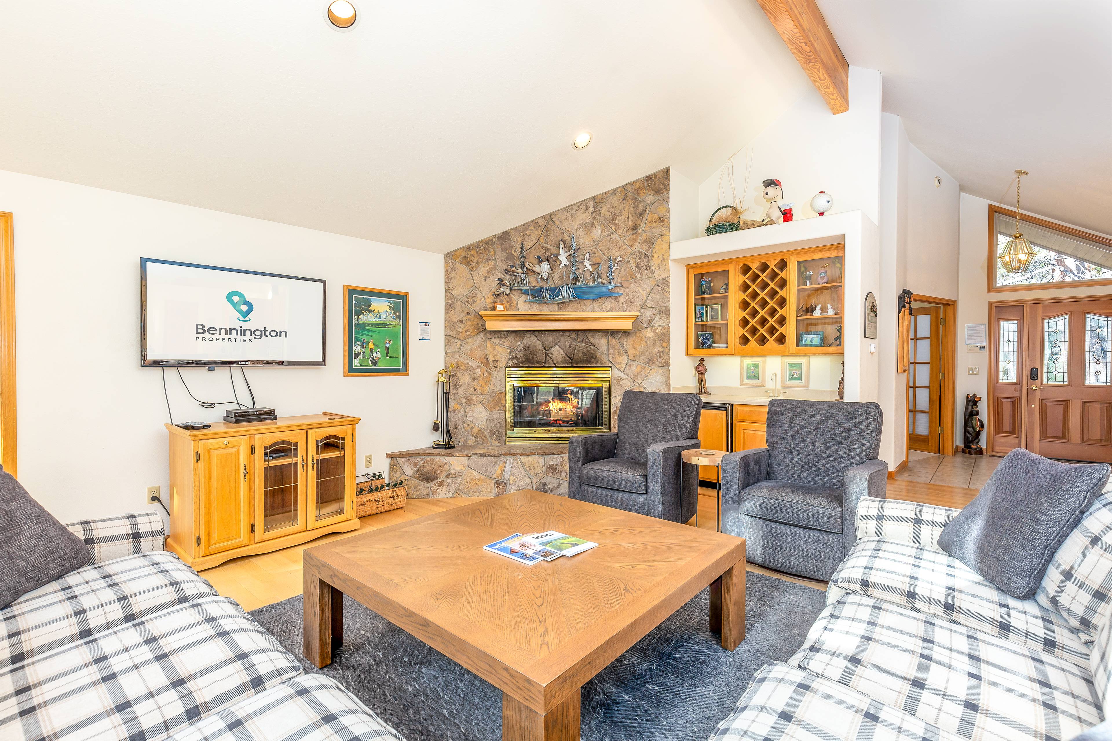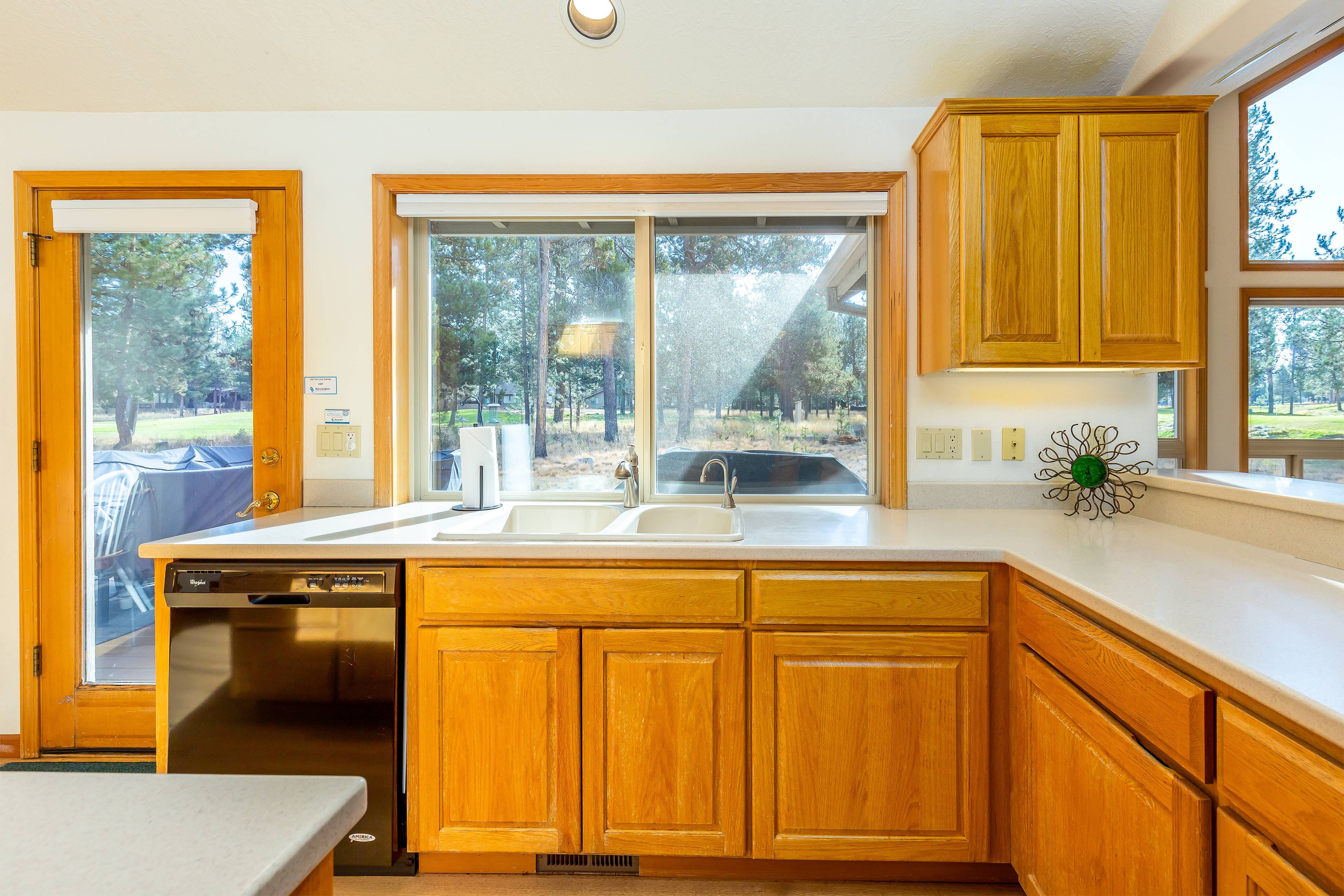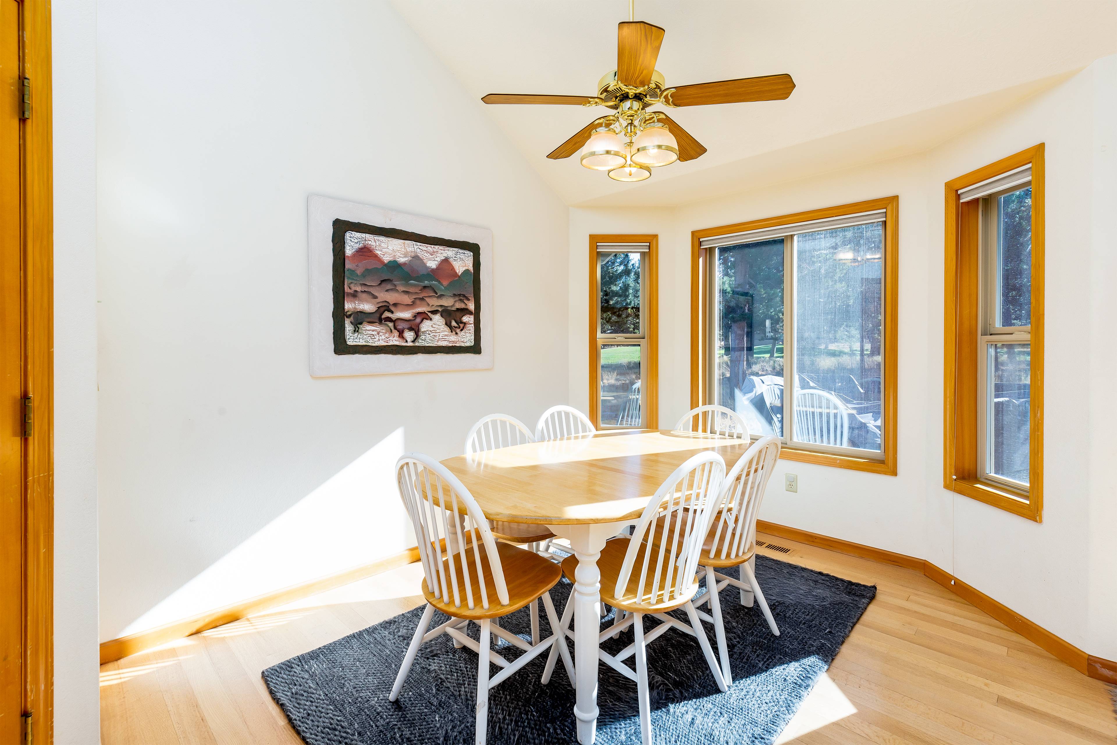 Step into a bright, welcoming space where a generous open living area awaits. The kitchen, dining, and living areas are perfectly designed for hosting memorable gatherings. The kitchen, fully equipped for culinary creations, features abundant counter space, a large island, and a breakfast bar that beckons you to start your day with a steaming cup of coffee. With two distinct dining areas, there's always a perfect spot for mealtime. The living room, adorned with a stacked rock fireplace, a large TV, and brand-new furnishings, offers a cozy retreat at the end of an active day of play in Sunriver.