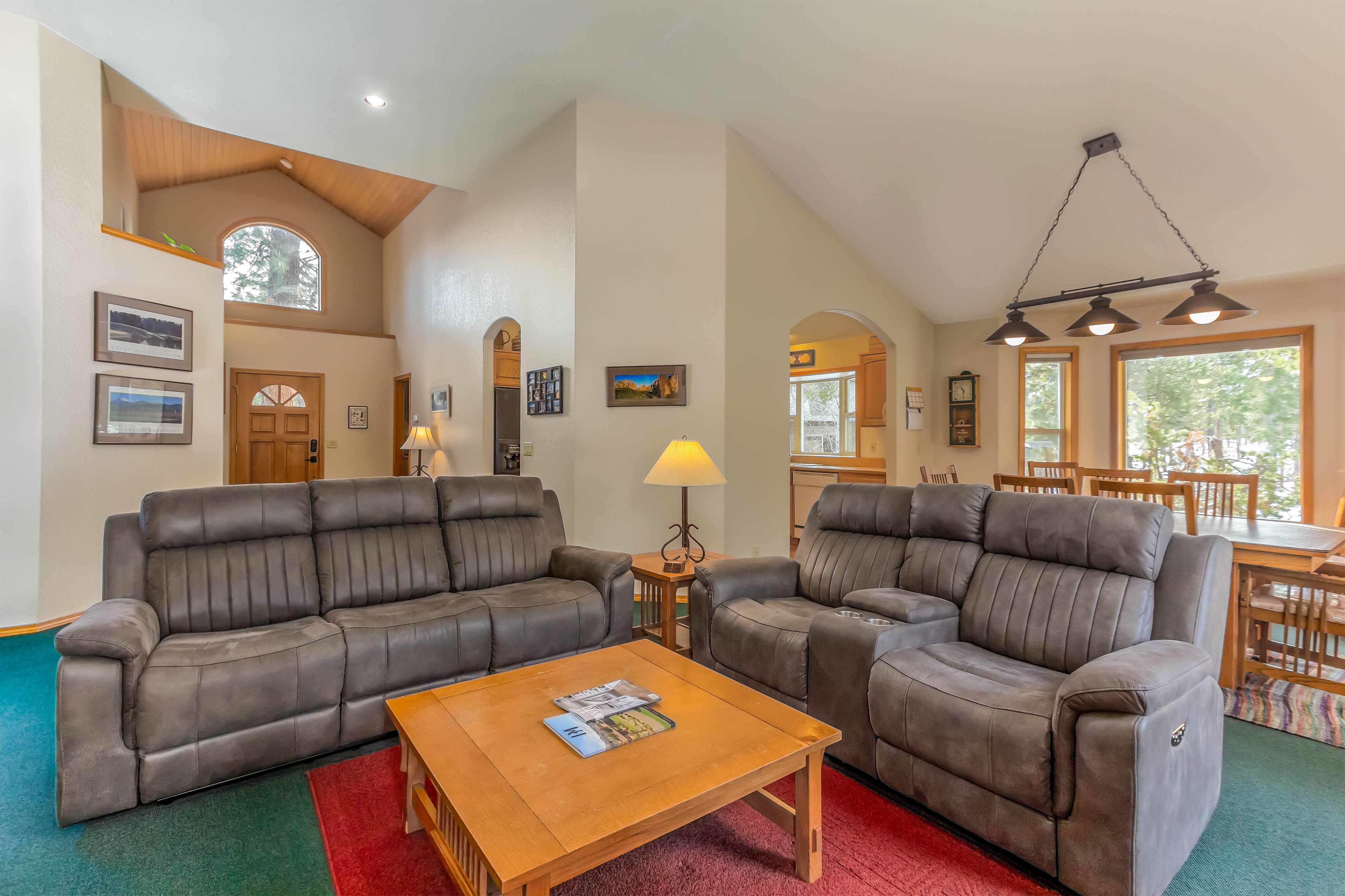 The light-filled living room invite you to relax by the cozy gas fireplace or enjoy a movie night on the flat screen TV. The dining area off the kitchen gives access to the back deck and private hot tub. The dining area has seating for 8. Everything you need for your next culinary creation can be found in the well-equipped kitchen.