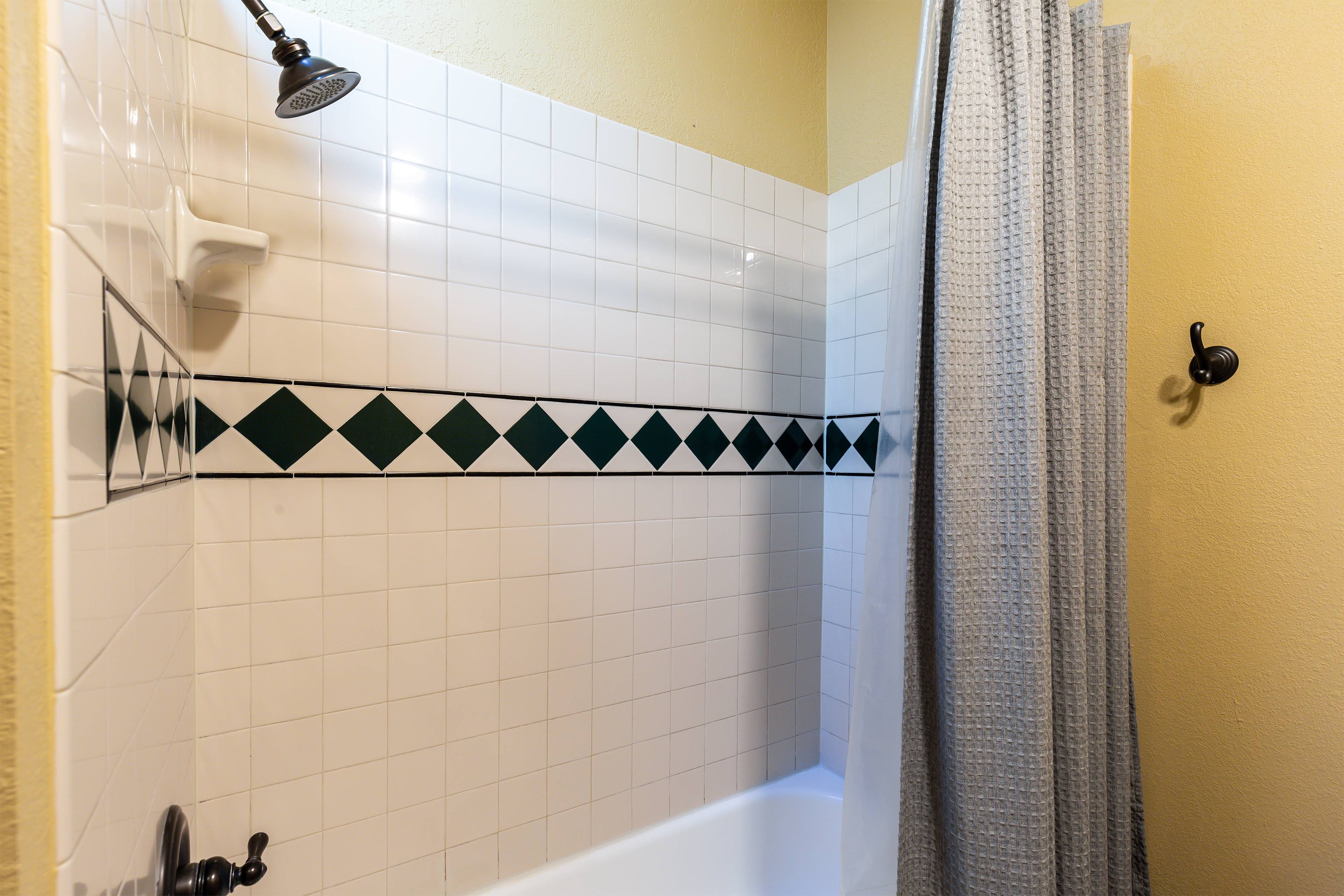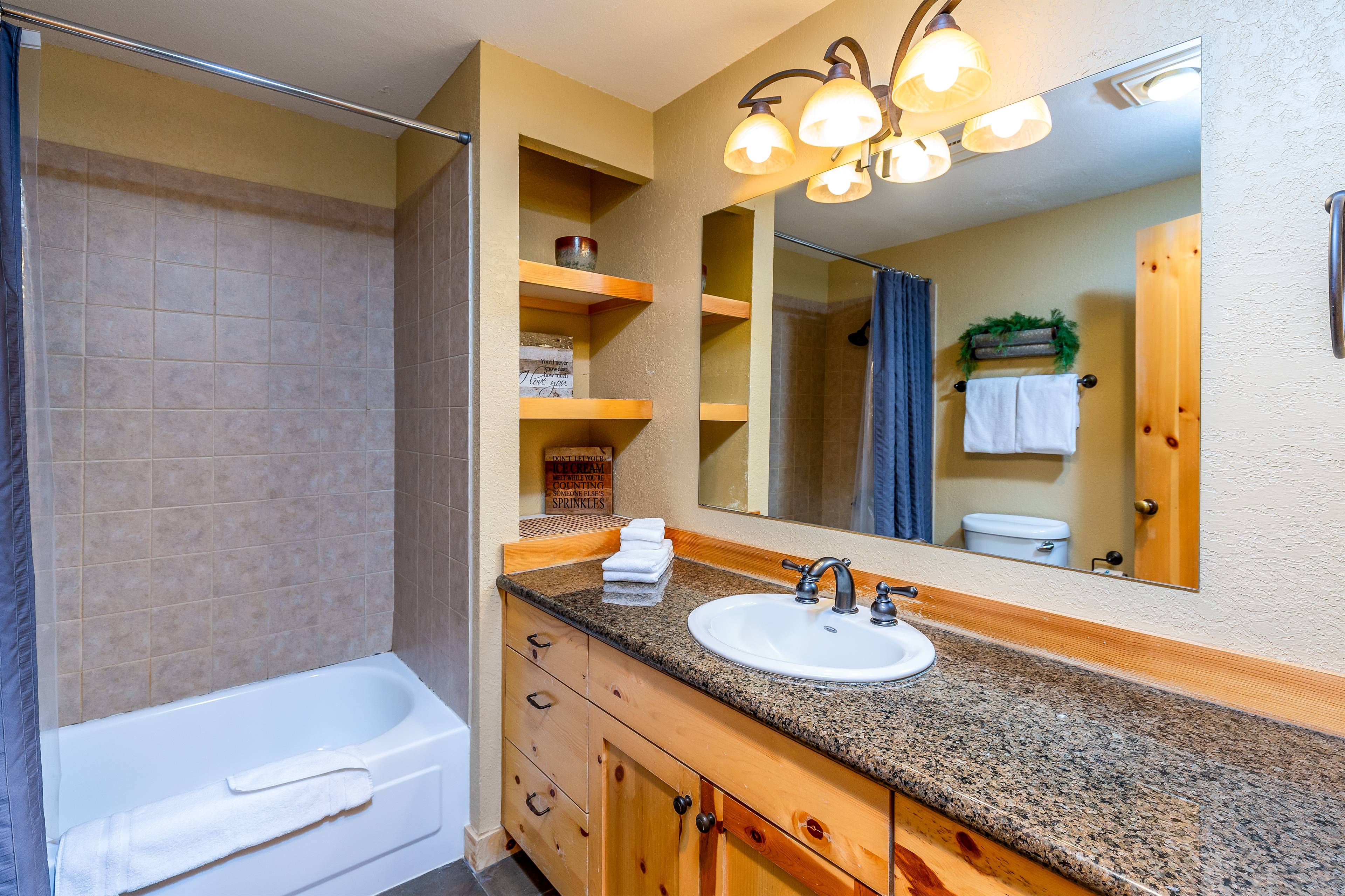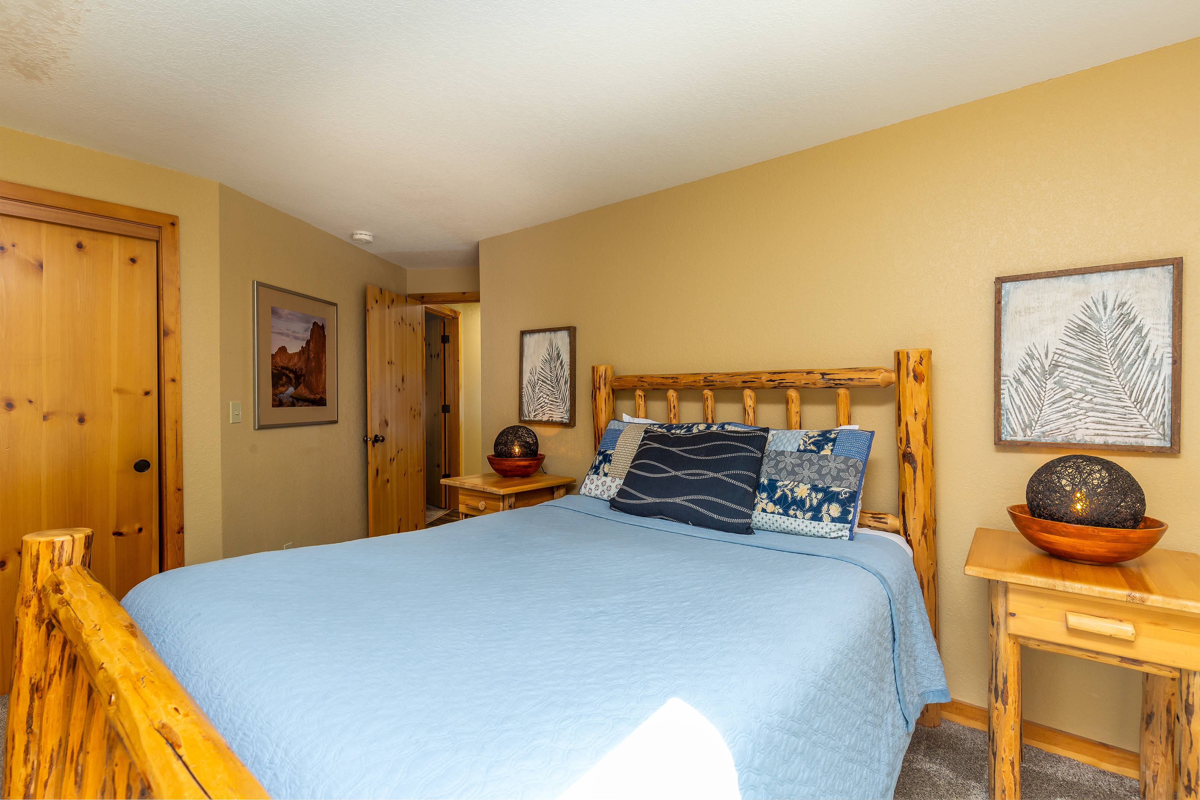 Relax in one of the comfy leather chairs or sofa downstairs in the living room of this open concept home.. The downstairs features two bedrooms and a full bath with shower/tub combo. The first bedroom has a comfy queen bed, TV and large closet. The second bedroom features two charming twin bunk beds, TV and a closet full of books and toys for our younger travelers.