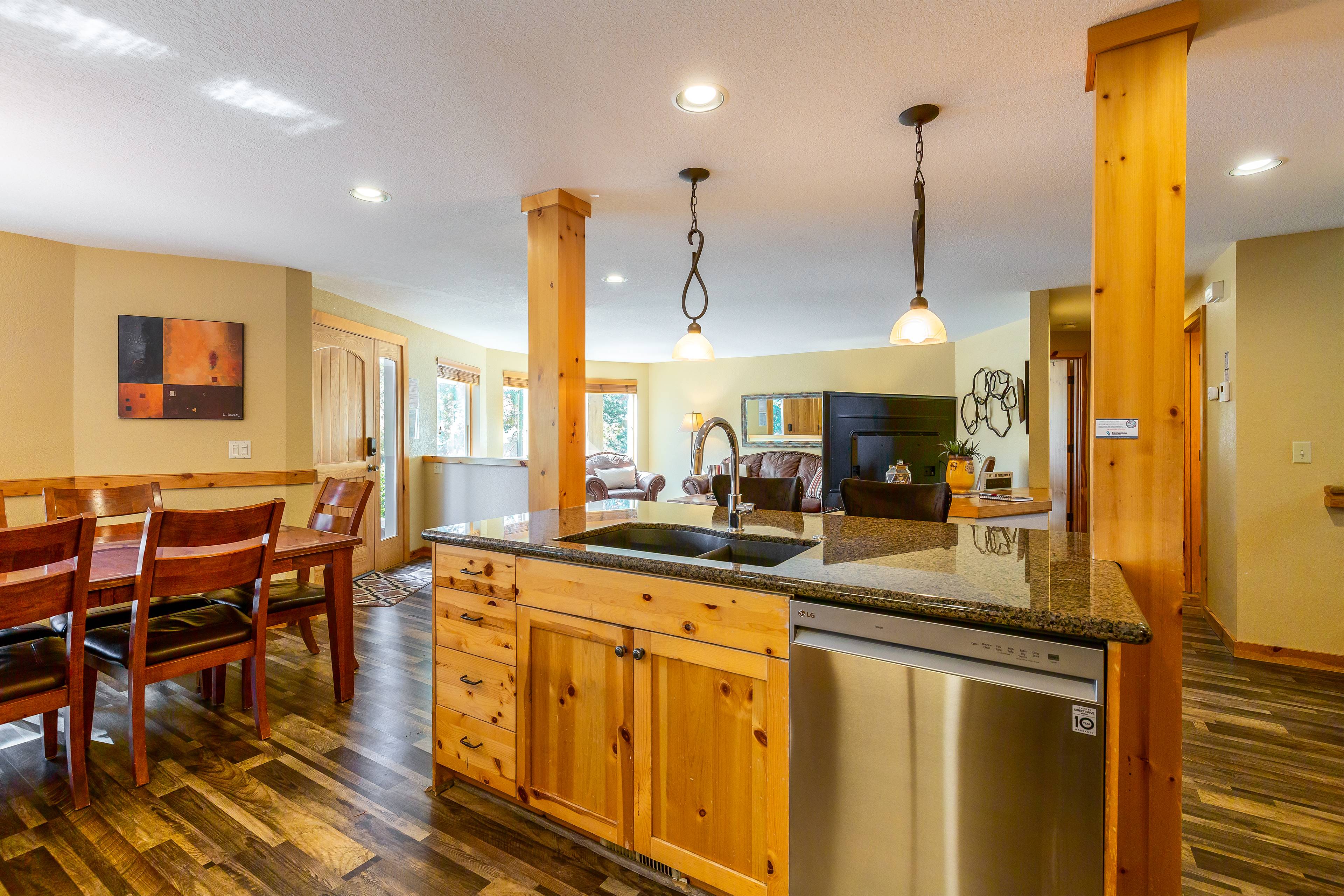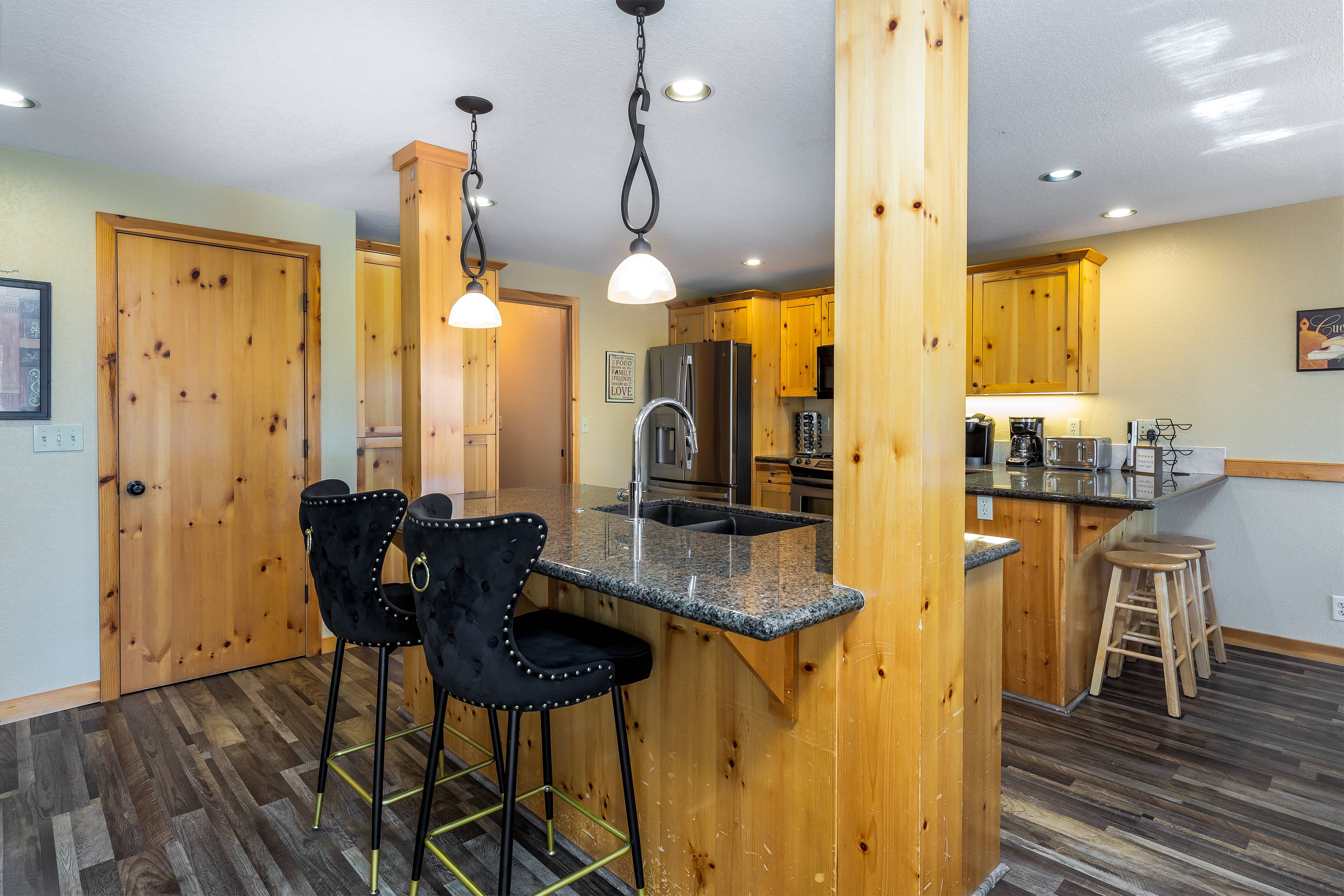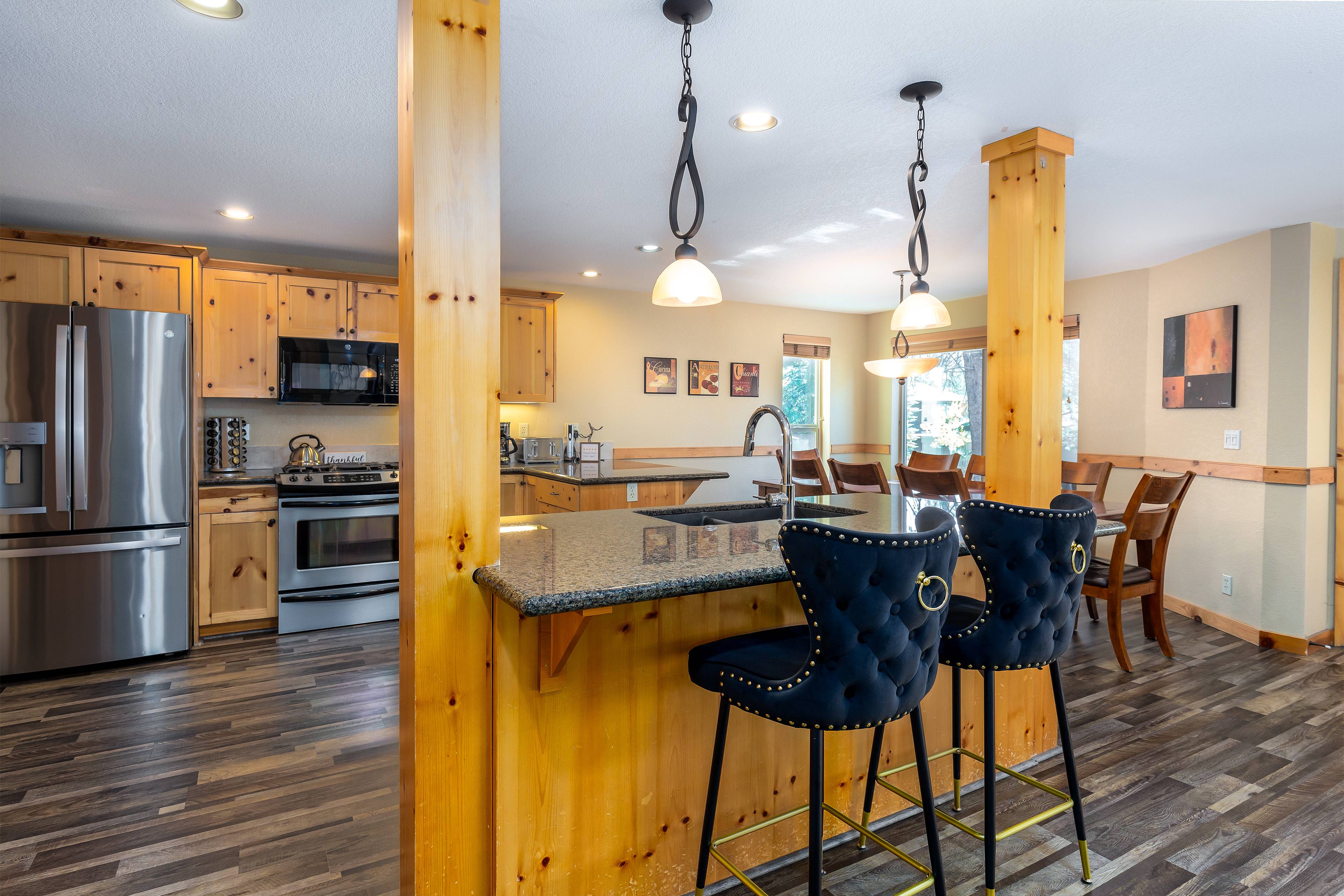 Wood and stone accents with high ceilings give this home an inviting lodge feel, while the newly remodeled kitchen/dining area with hardwood floors, granite countertops, and stainless steel appliances make entertaining a breeze. There is seating for 8 at the dining table with room for 8 more at the kitchen bars.