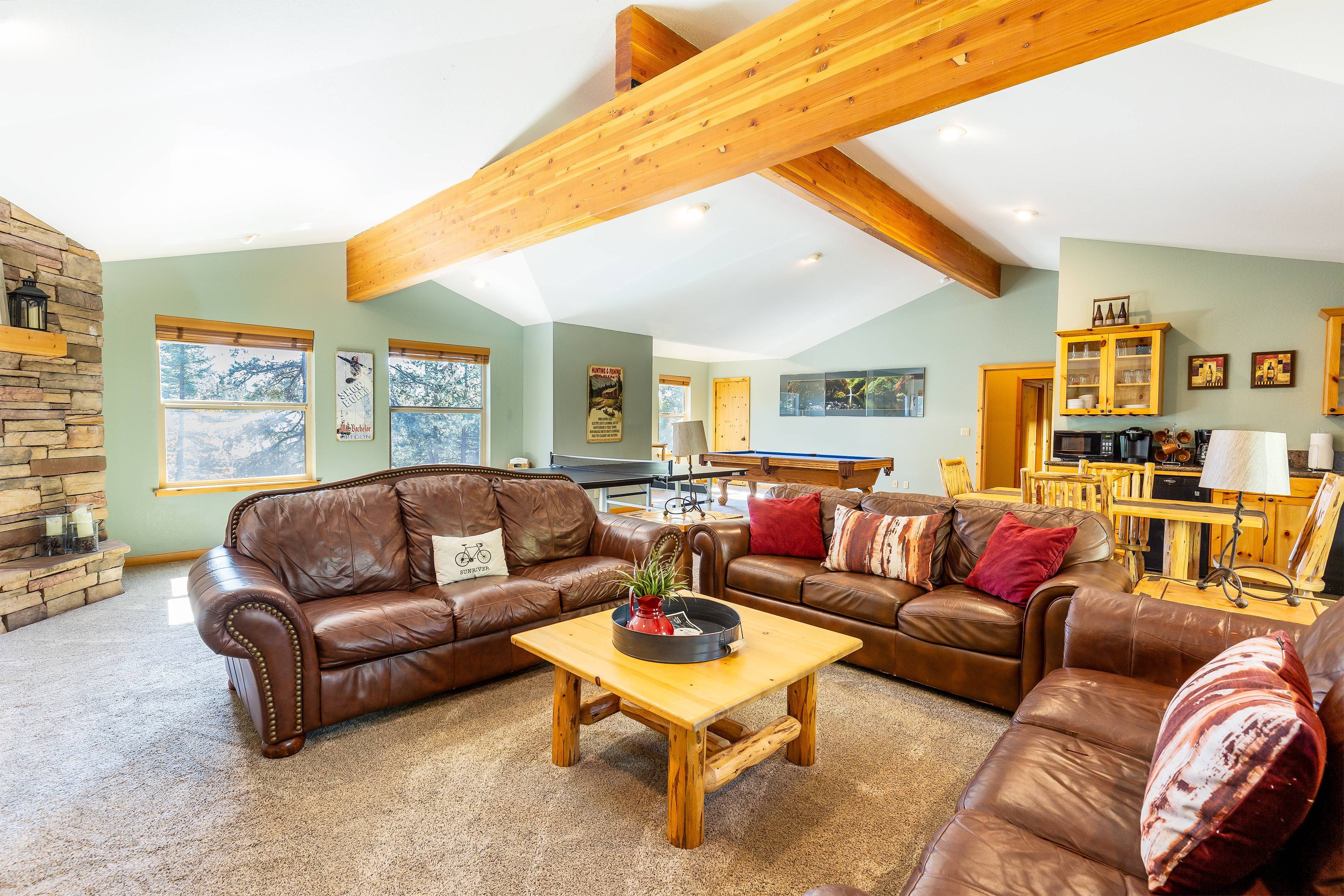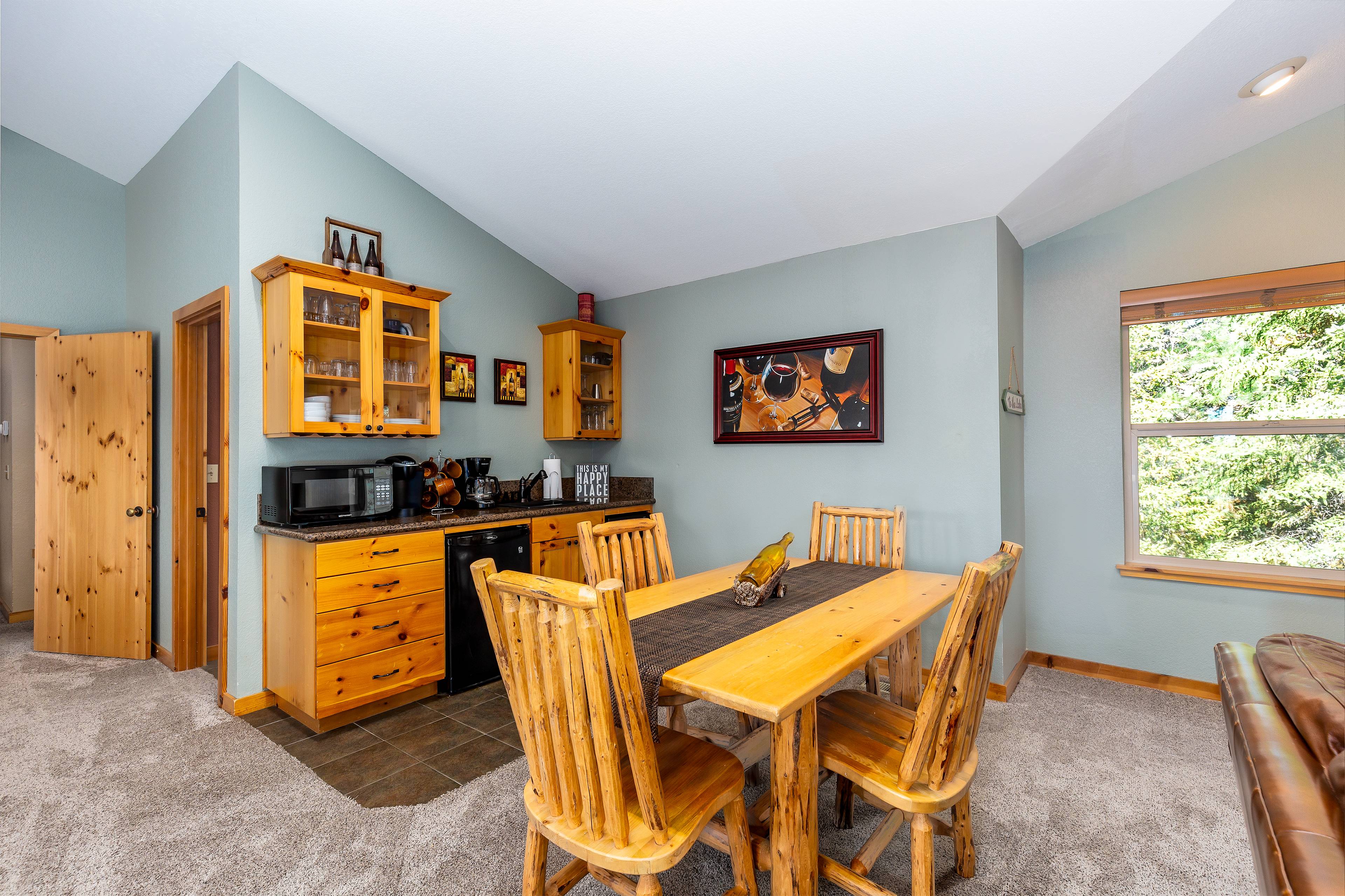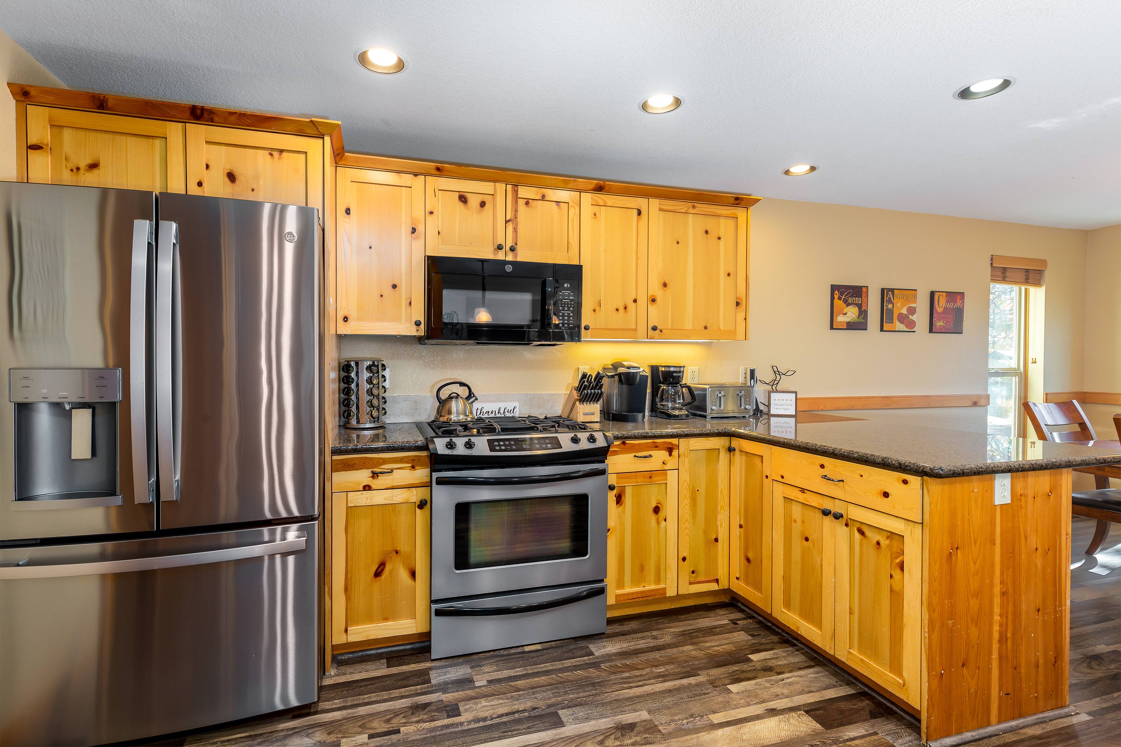 Wood and stone accents with high ceilings give this home an inviting lodge feel, while the newly remodeled kitchen/dining area with hardwood floors, granite countertops, and stainless steel appliances make entertaining a breeze. There is seating for 8 at the dining table with room for 8 more at the kitchen bars.