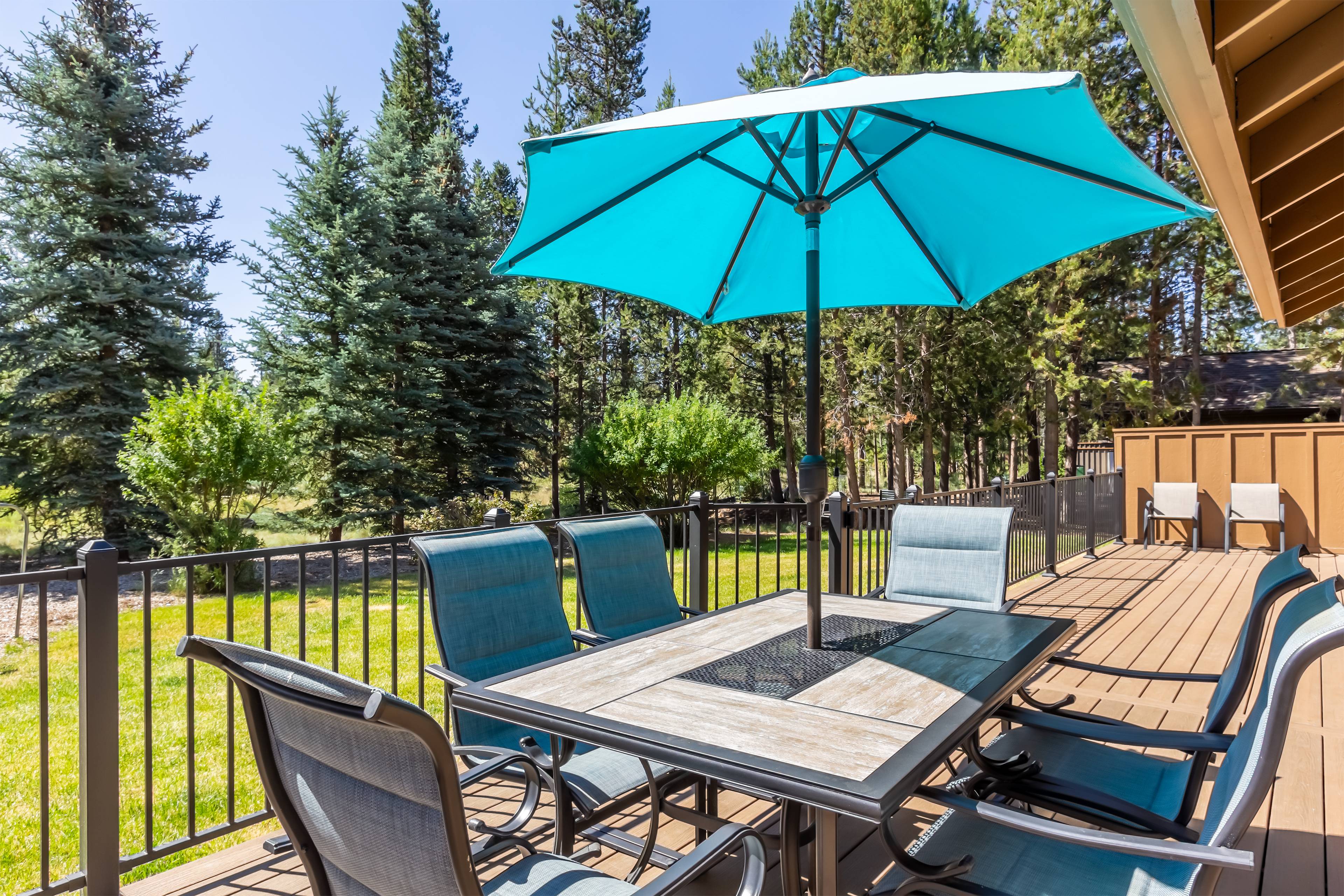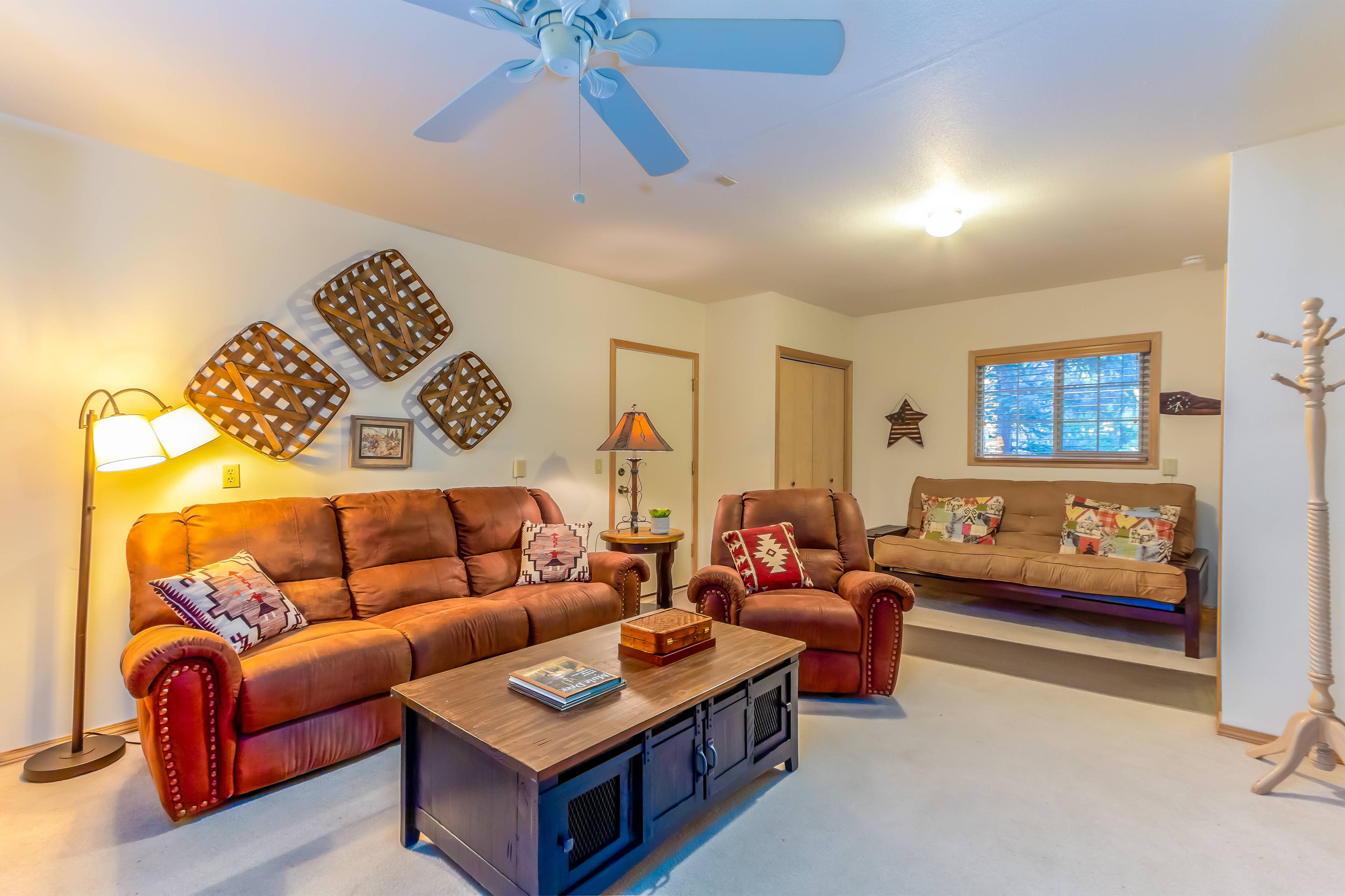 Get ready for an unforgettable family-friendly Sunriver vacation! This air conditioned single-level, 3-bedroom, 2-bath home is set up with fun and comfort in mind. Gather in the spacious living room with a gas fireplace, plush leather furnishings, and a large Smart TV. Or enjoy some downtime in the cozy bonus room, offering extra lounging space, twin bunkbeds, and books to unwind.