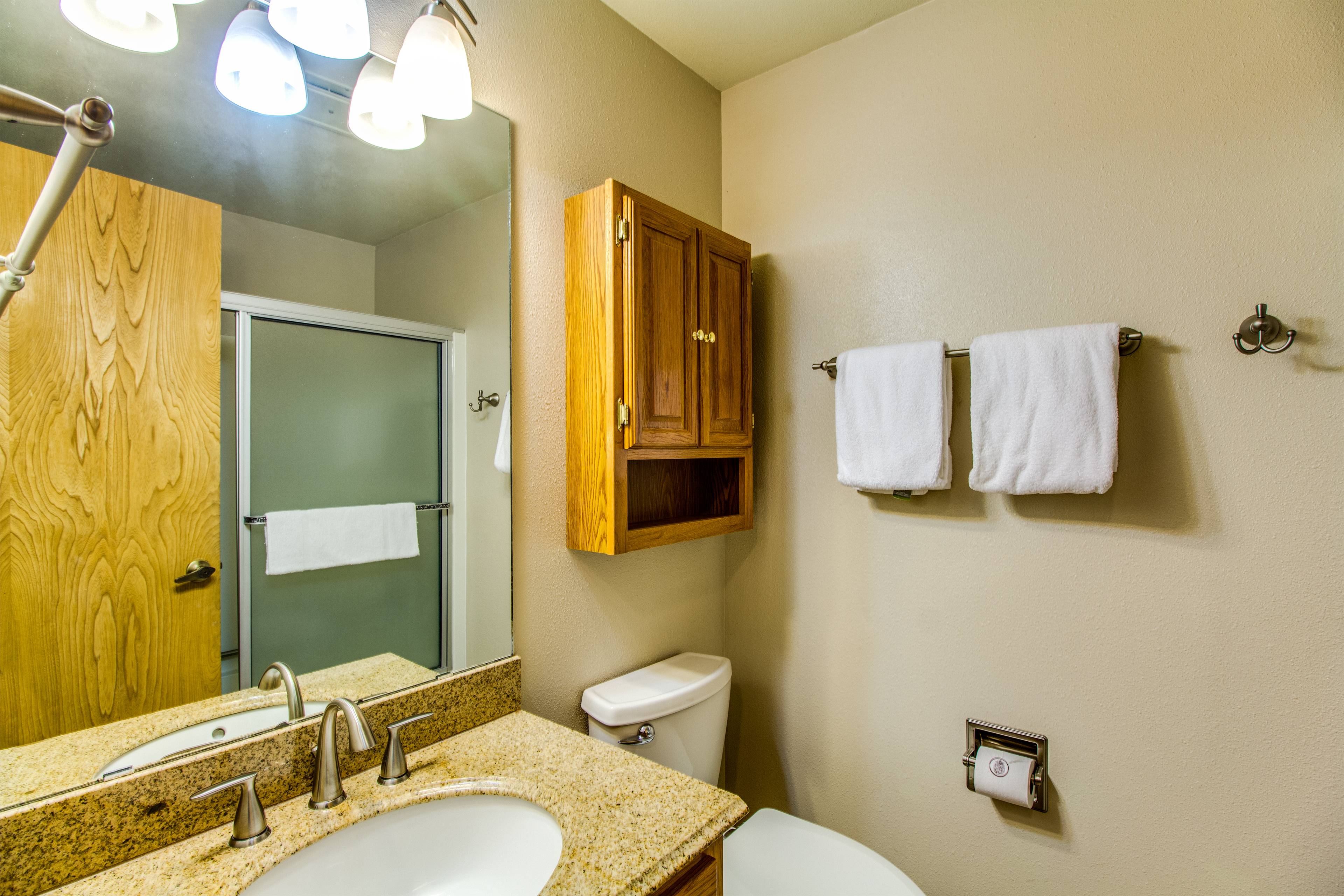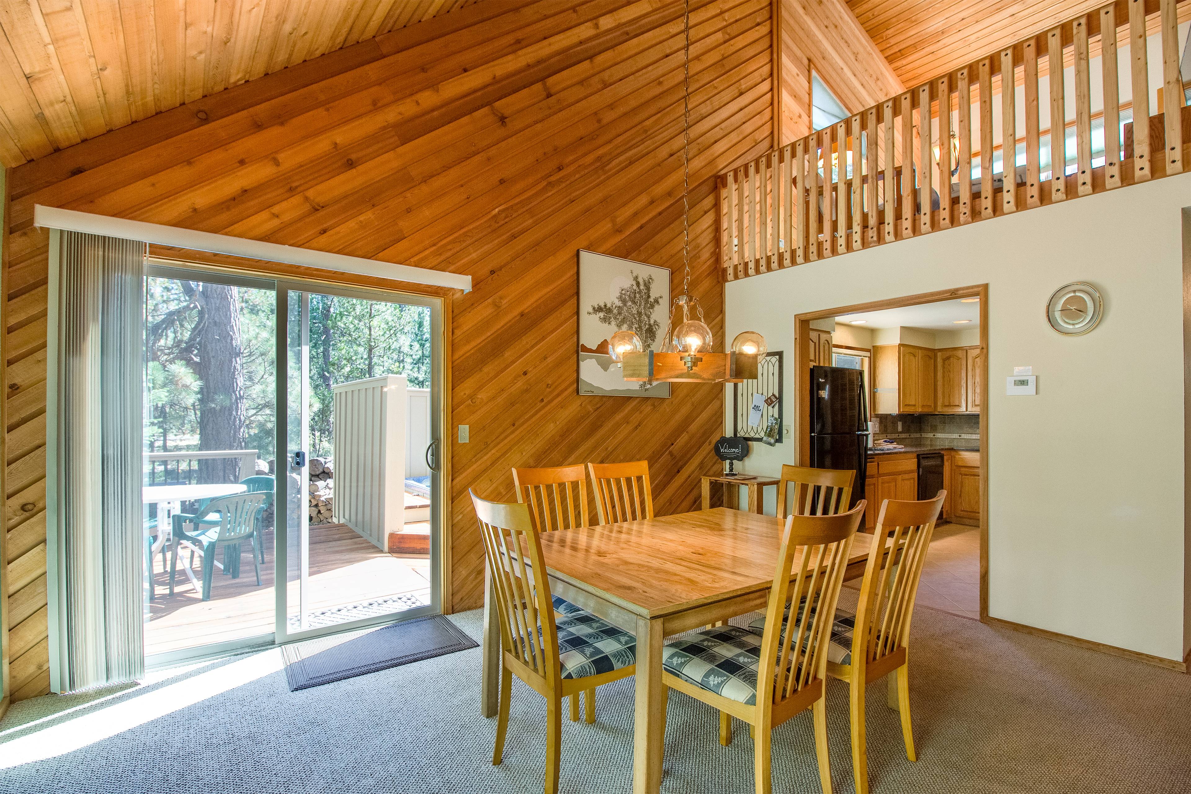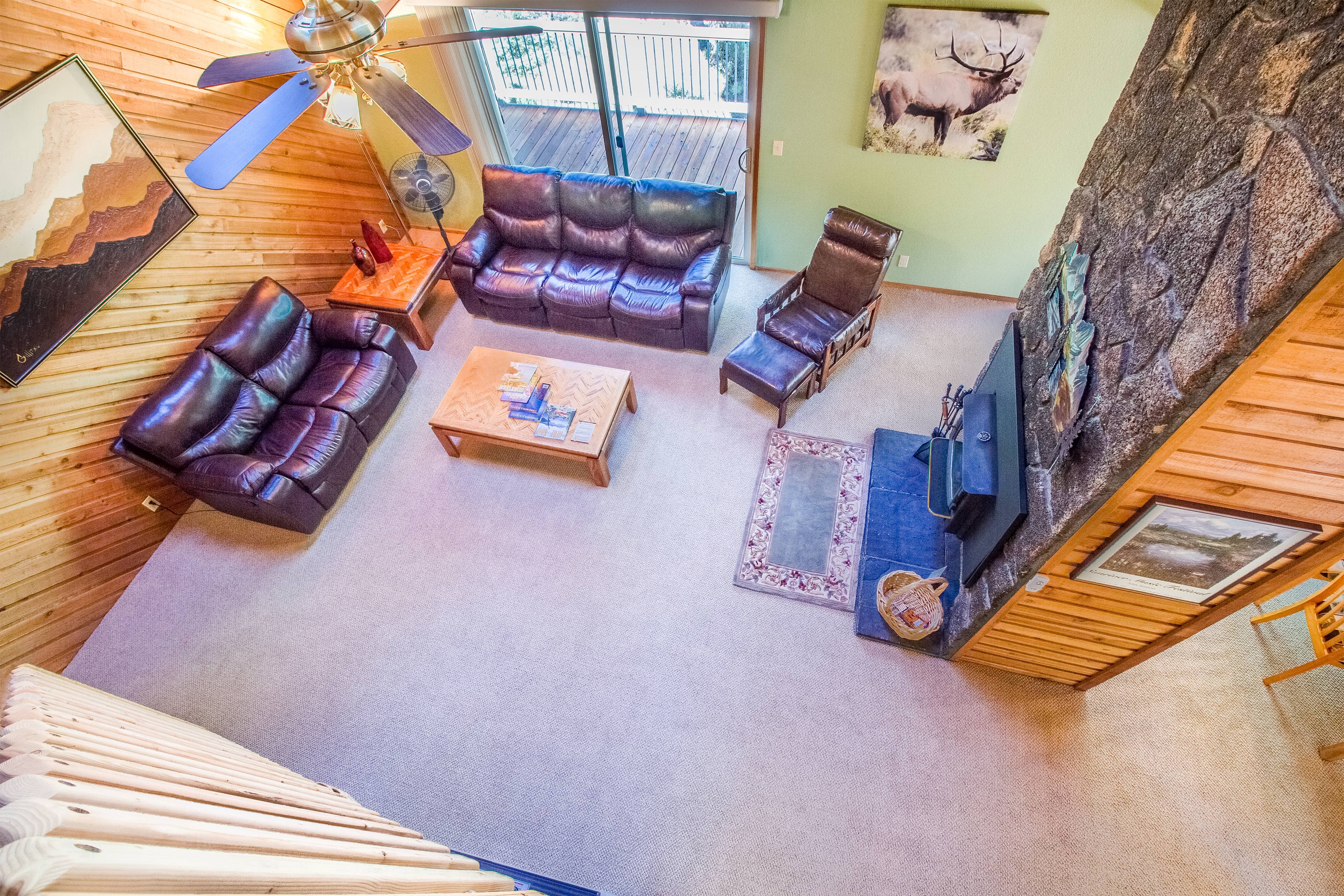 This spacious 2 bedroom home welcomes you with comfortable leather furnishings, gorgeous wood ceilings and a wood burning fireplace to chill out after a long day of Sunriver activities. The adjacent kitchen has beautiful granite counter tops and everything you need to whip up your family favorite meals. The attached dining room has seating for 6.