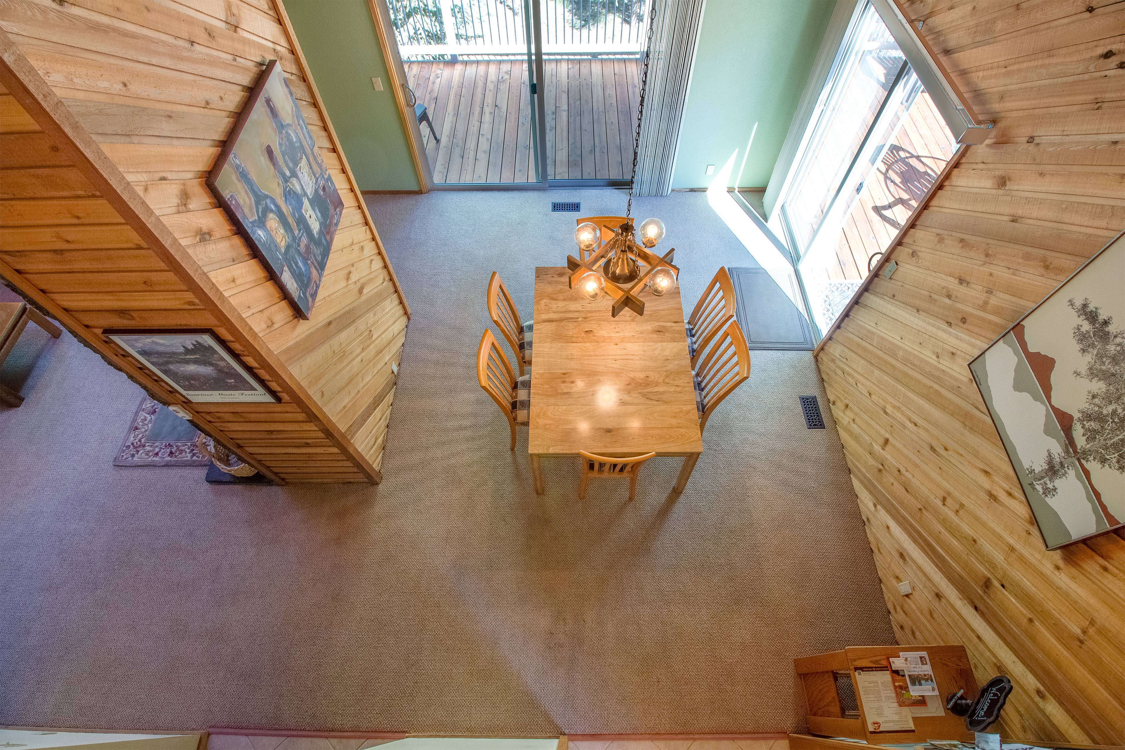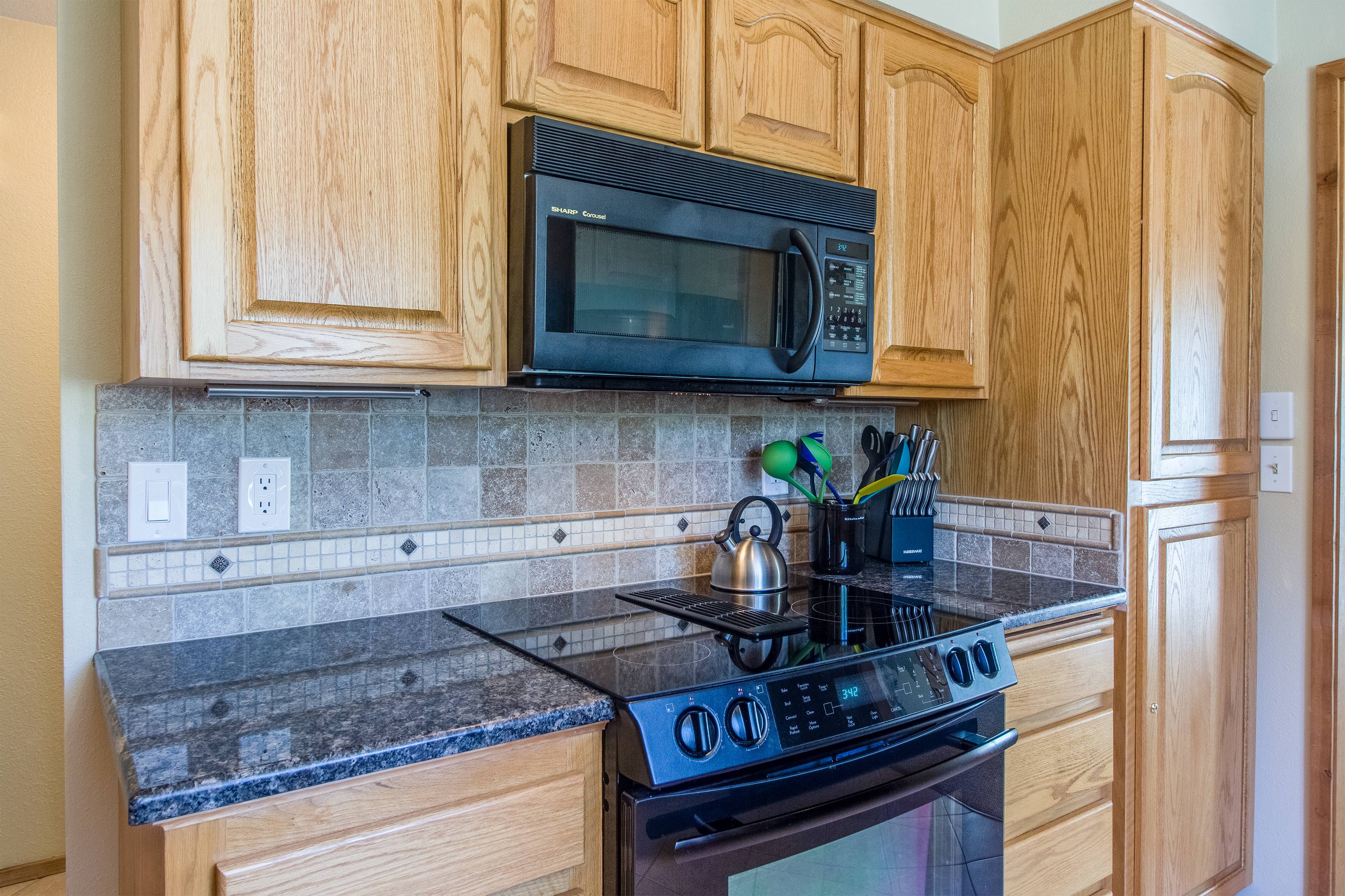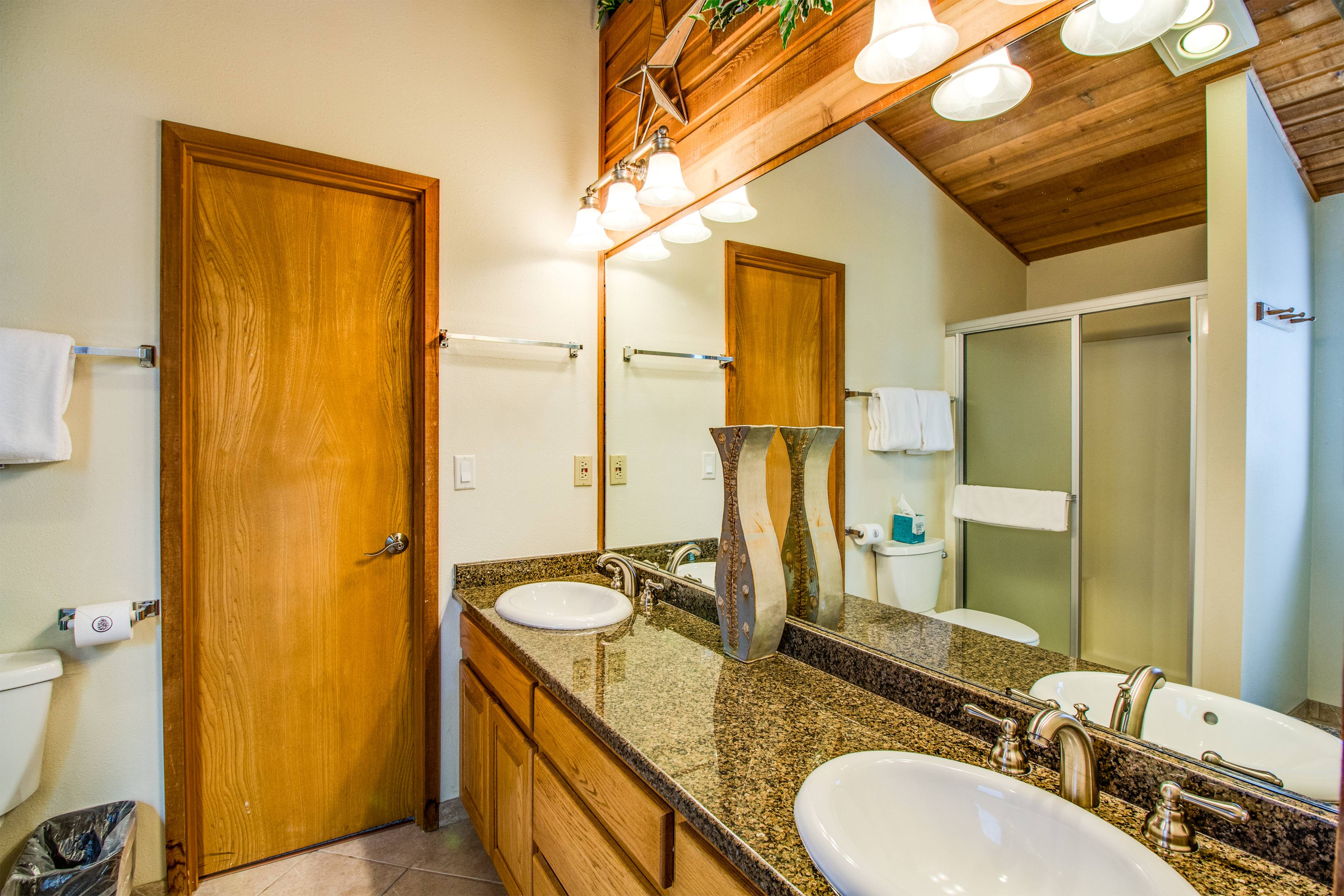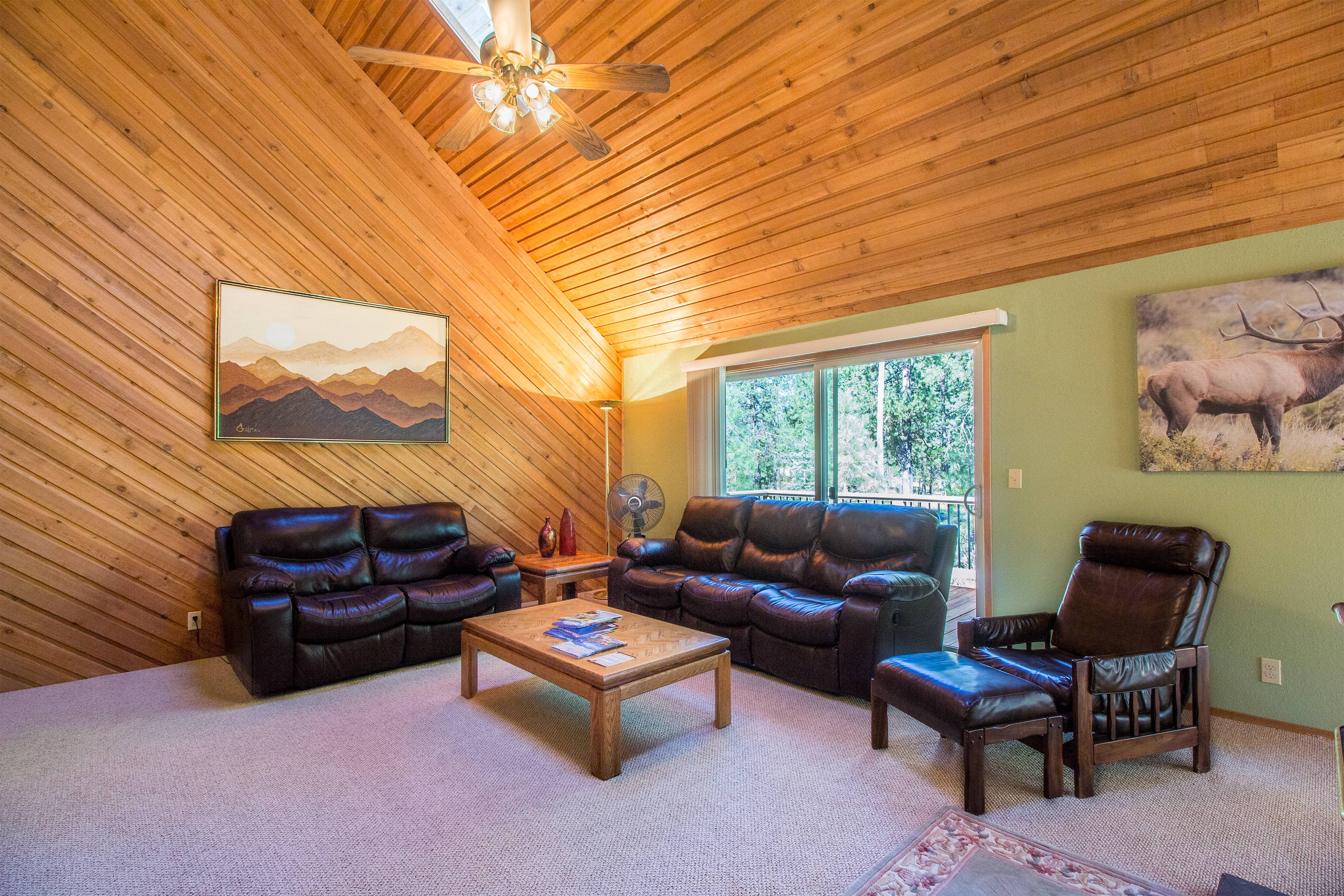 This spacious 2 bedroom home welcomes you with comfortable leather furnishings, gorgeous wood ceilings and a wood burning fireplace to chill out after a long day of Sunriver activities. The adjacent kitchen has beautiful granite counter tops and everything you need to whip up your family favorite meals. The attached dining room has seating for 6.