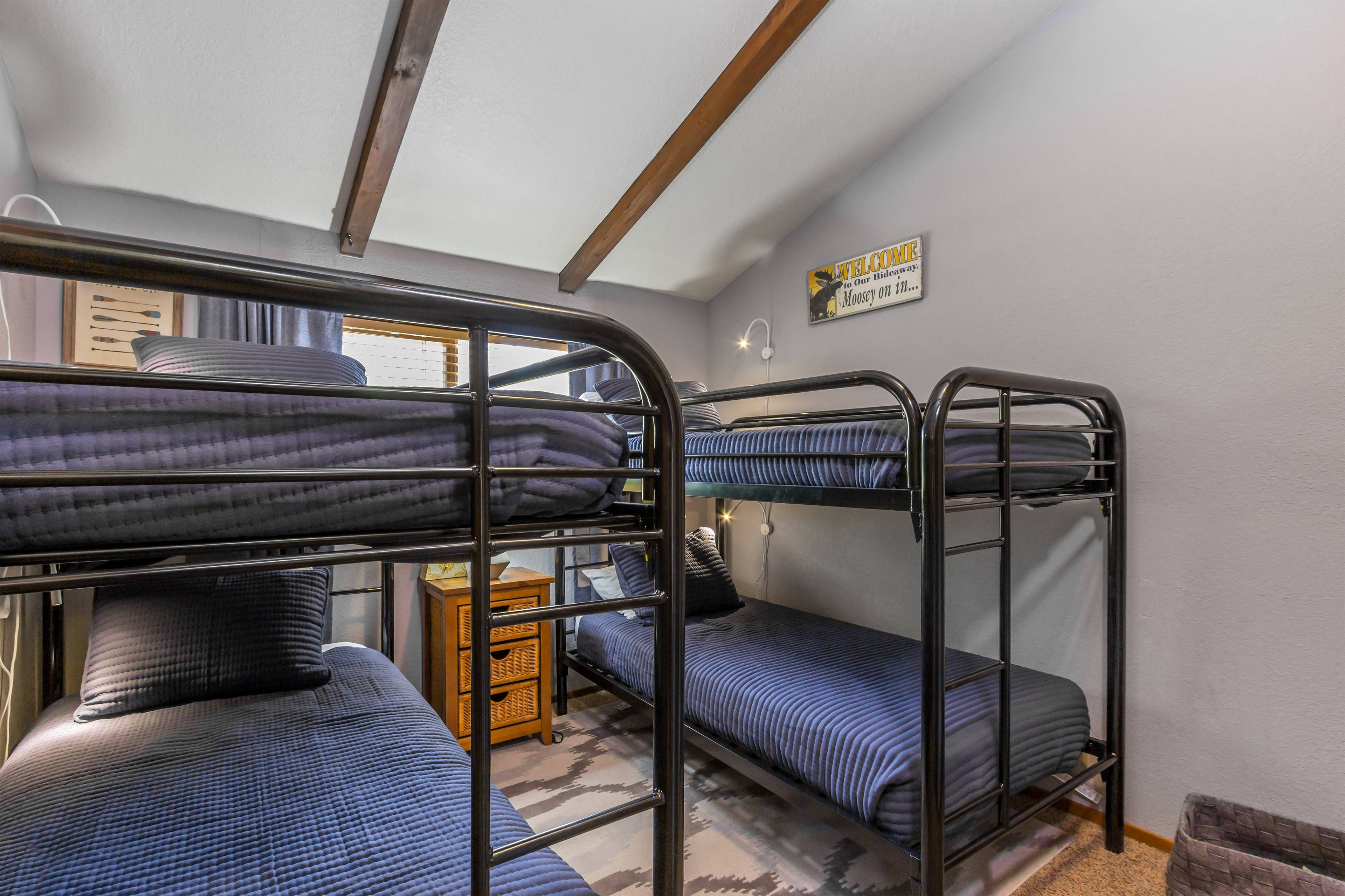 Head upstairs for three more bedrooms and one full bathroom, a king bedroom, a queen bedroom, and, a bunk room with two sets of twin bunk beds. The bathroom is a jack-and-jill accessible via the king and queen bedrooms.