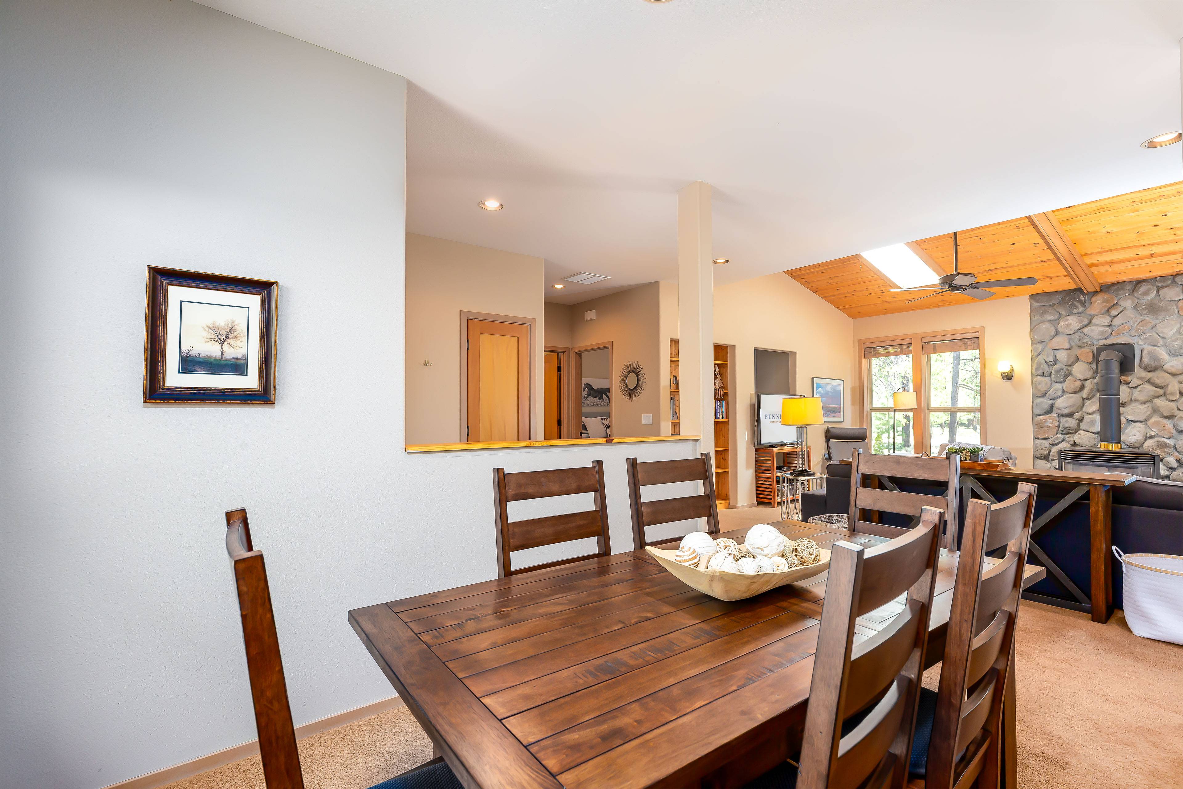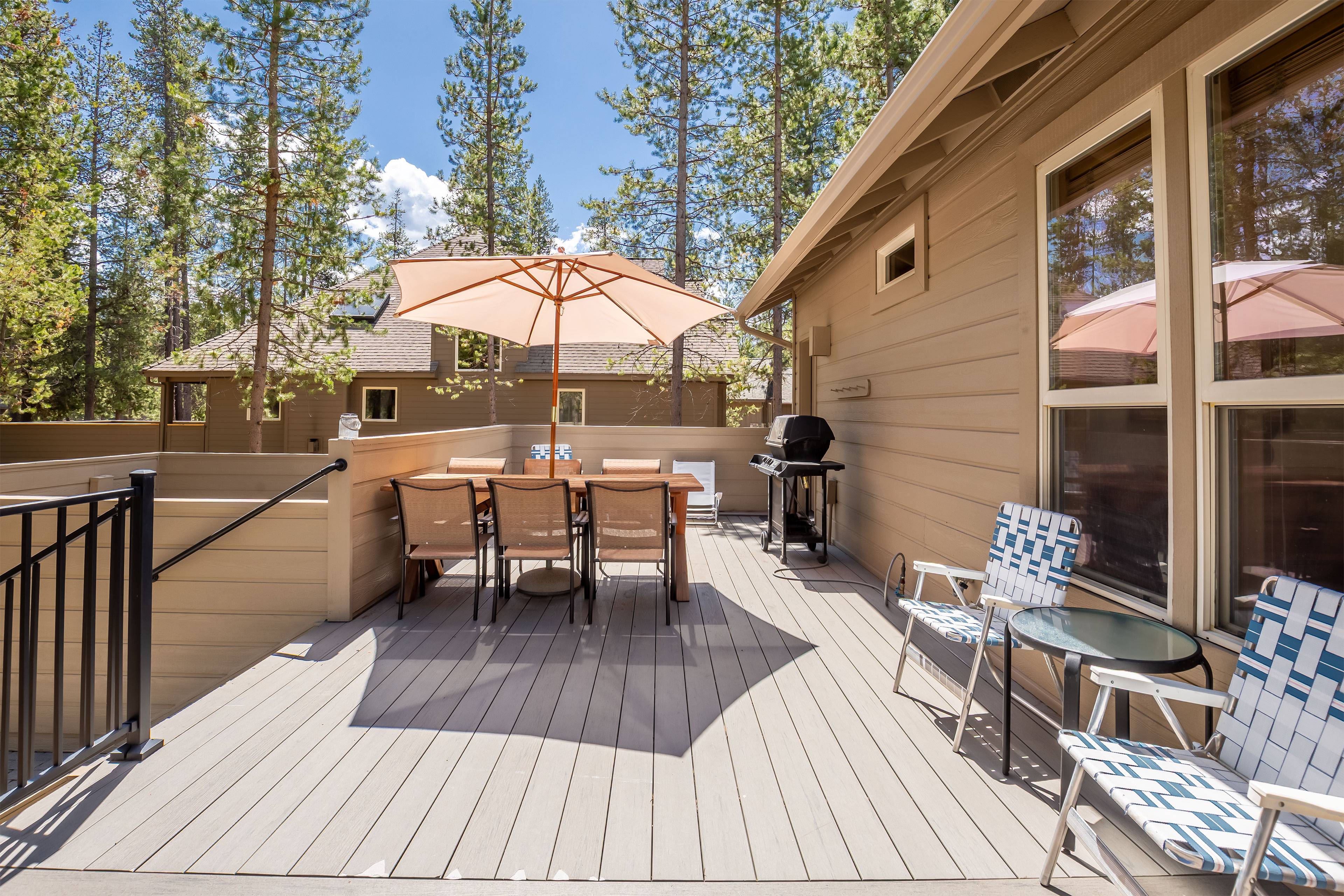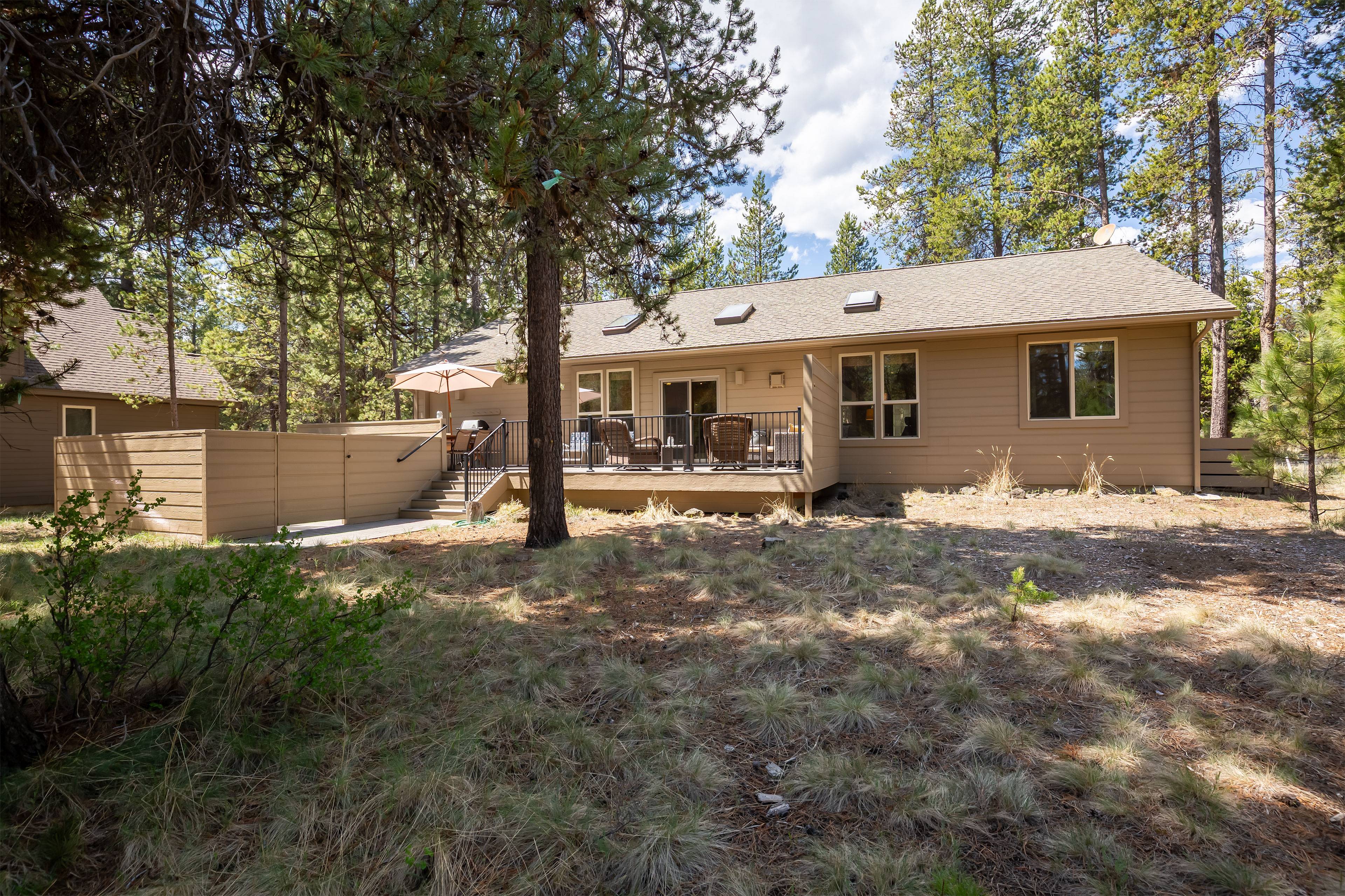 The open living area invites you to kick back with comfortable furnishings, Smart TV, DVD player, and gas fireplace, creating the perfect atmosphere for relaxation. Central AC keeps things cool in summer, and the fully stocked kitchen makes dining easy. Step outside onto your private deck for morning coffee or evening stargazing in the private hot tub — pure Sunriver peace.