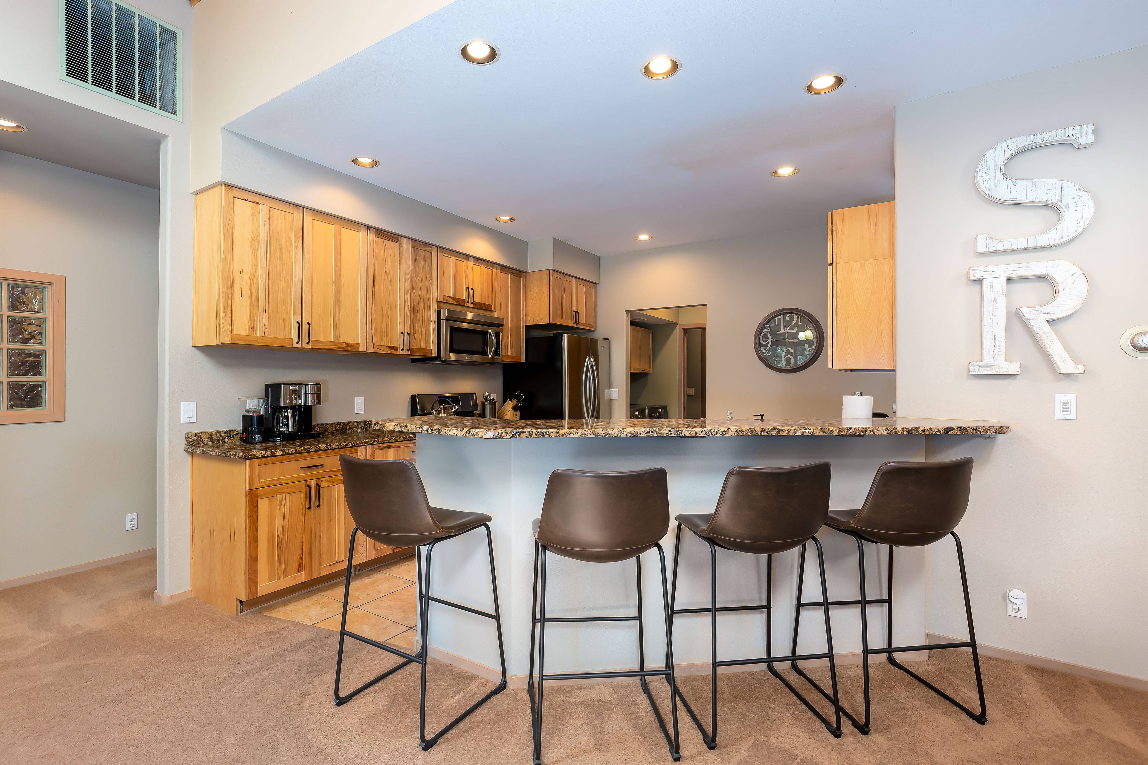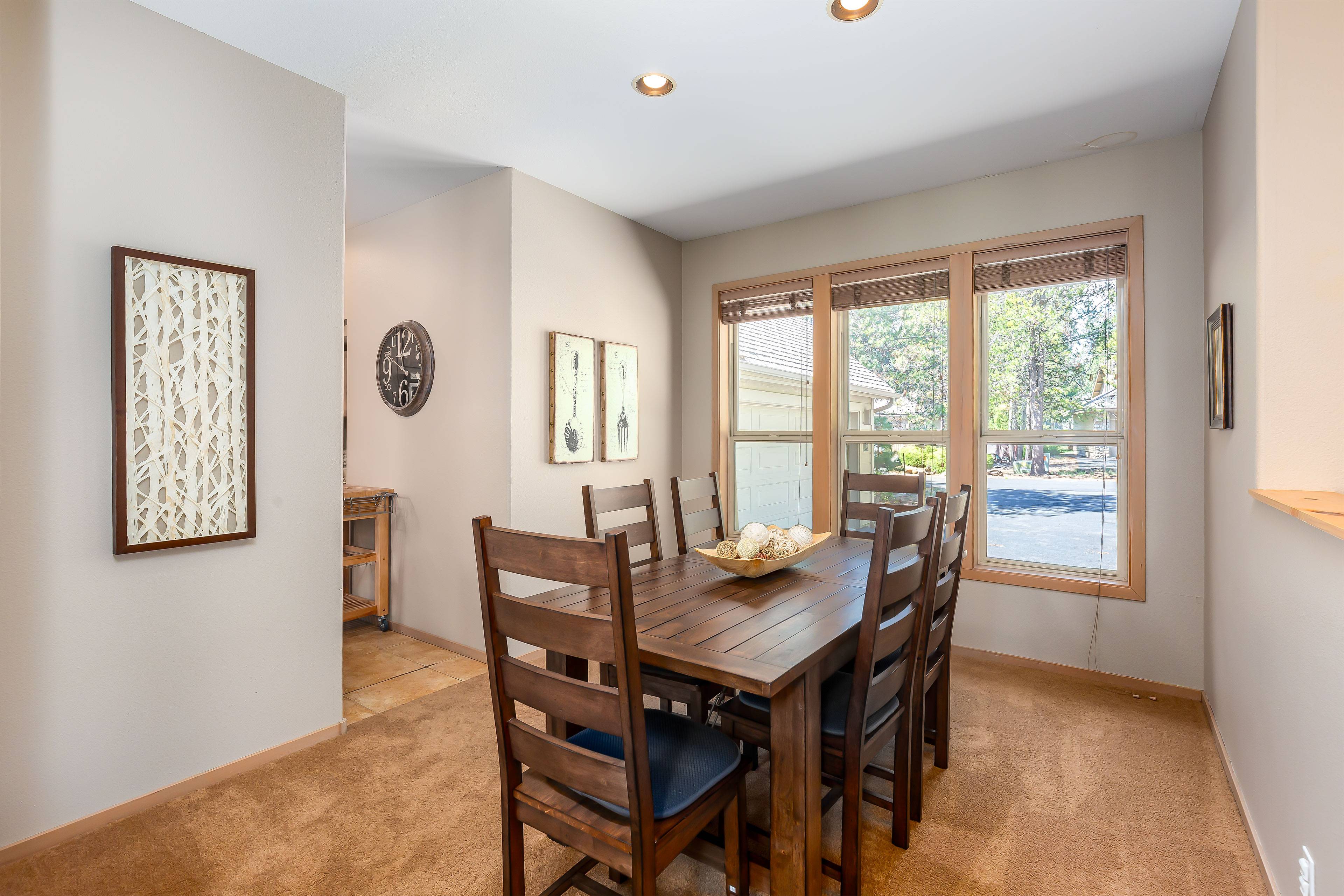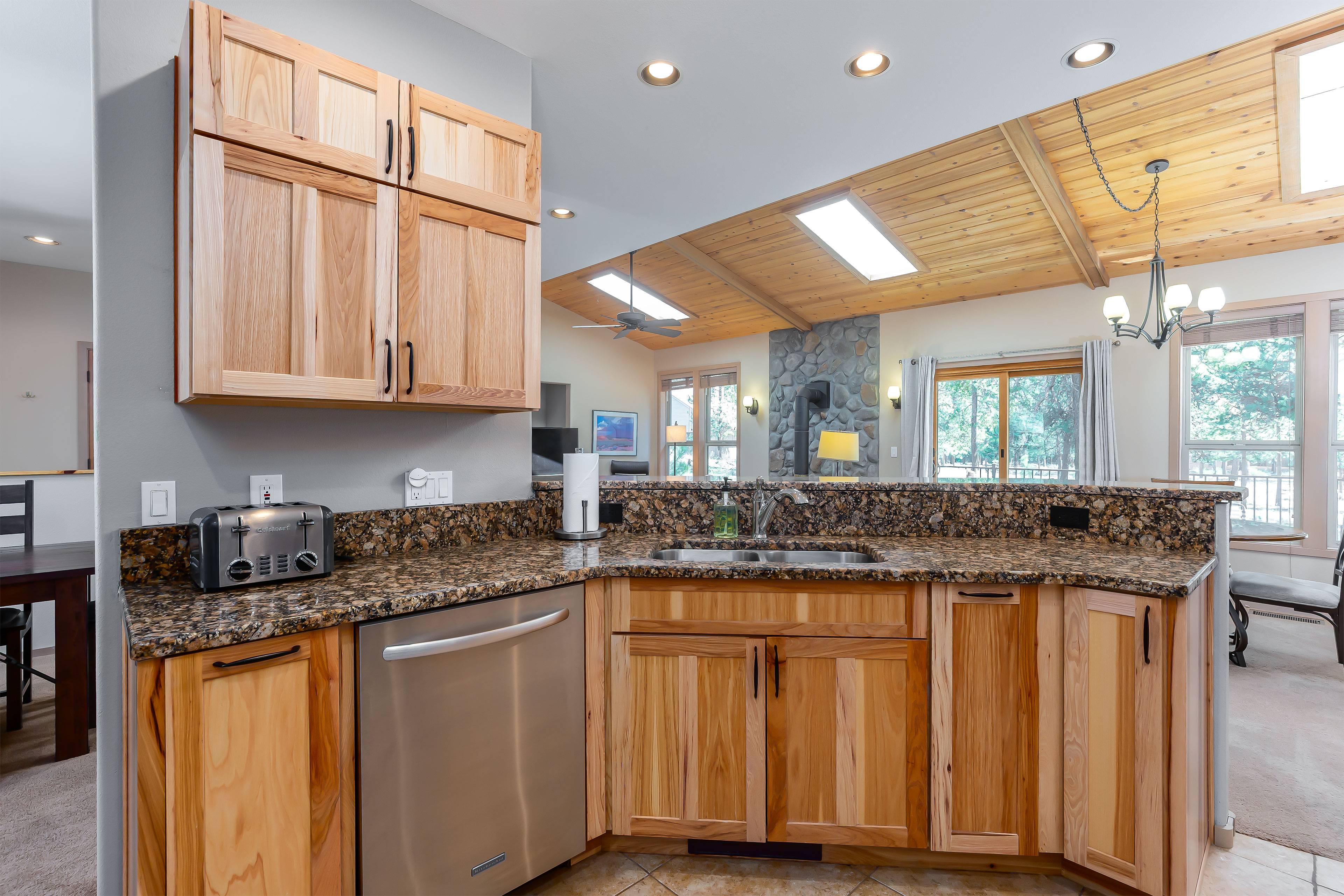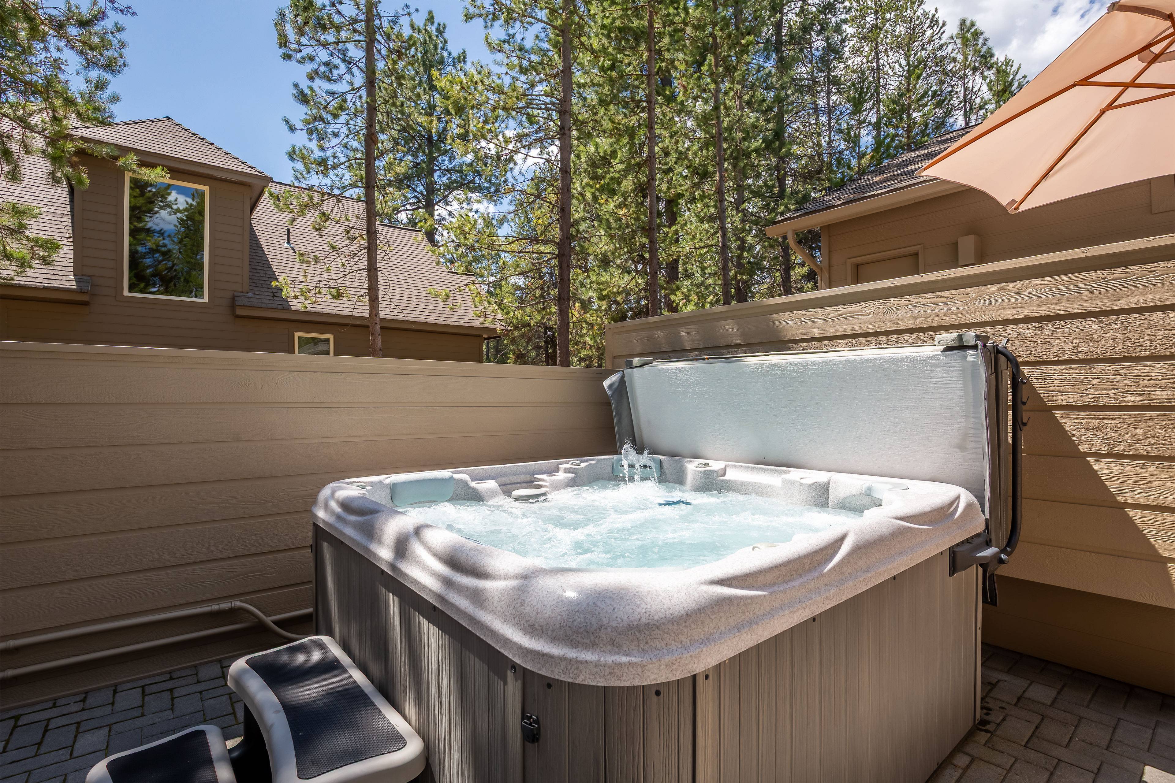 The open living area invites you to kick back with comfortable furnishings, Smart TV, DVD player, and gas fireplace, creating the perfect atmosphere for relaxation. Central AC keeps things cool in summer, and the fully stocked kitchen makes dining easy. Step outside onto your private deck for morning coffee or evening stargazing in the private hot tub — pure Sunriver peace.