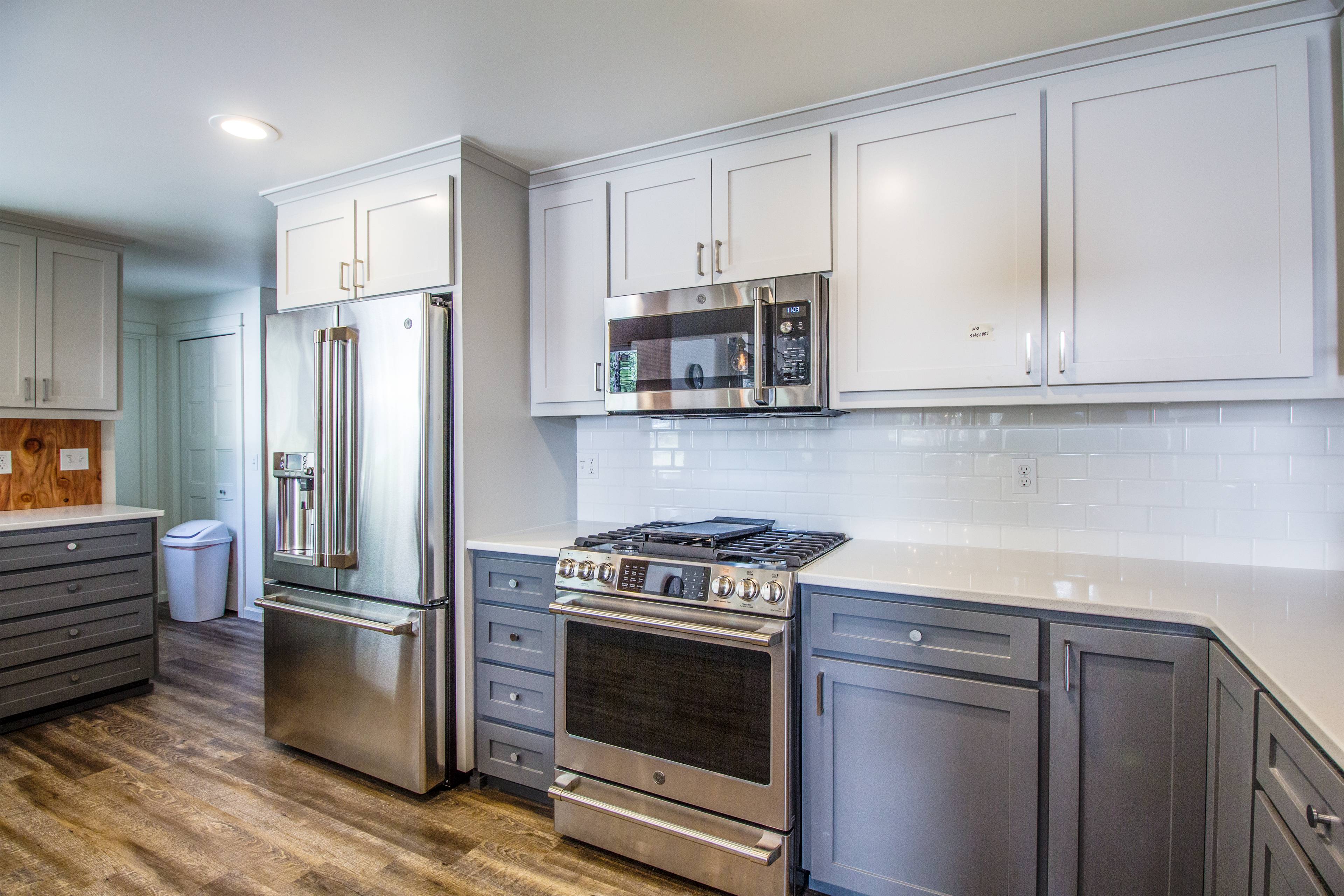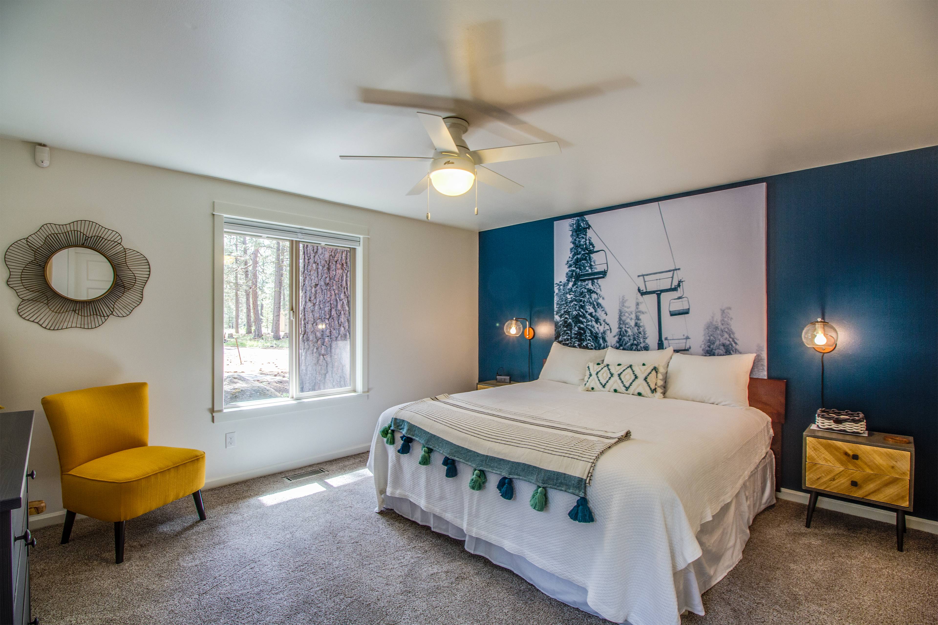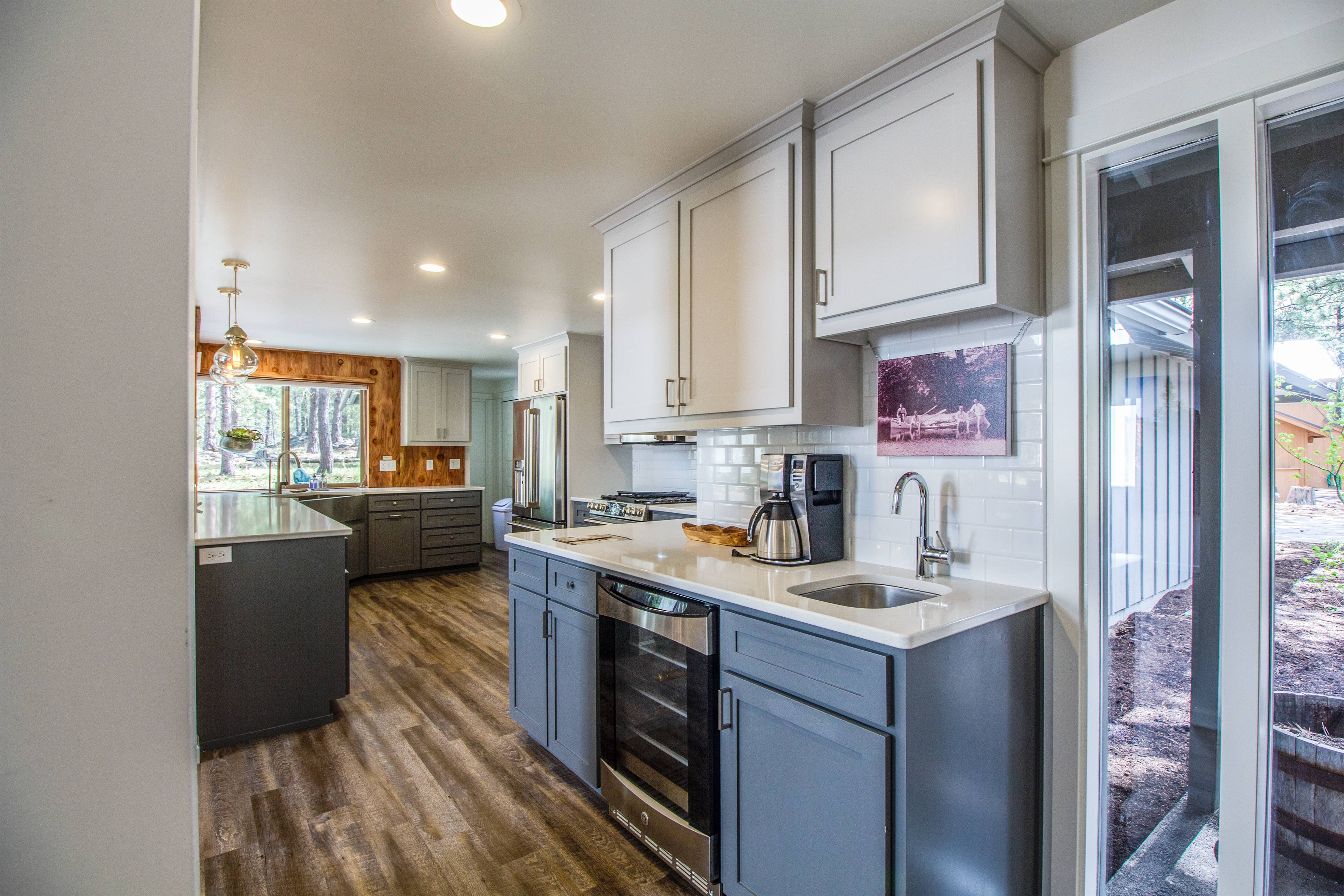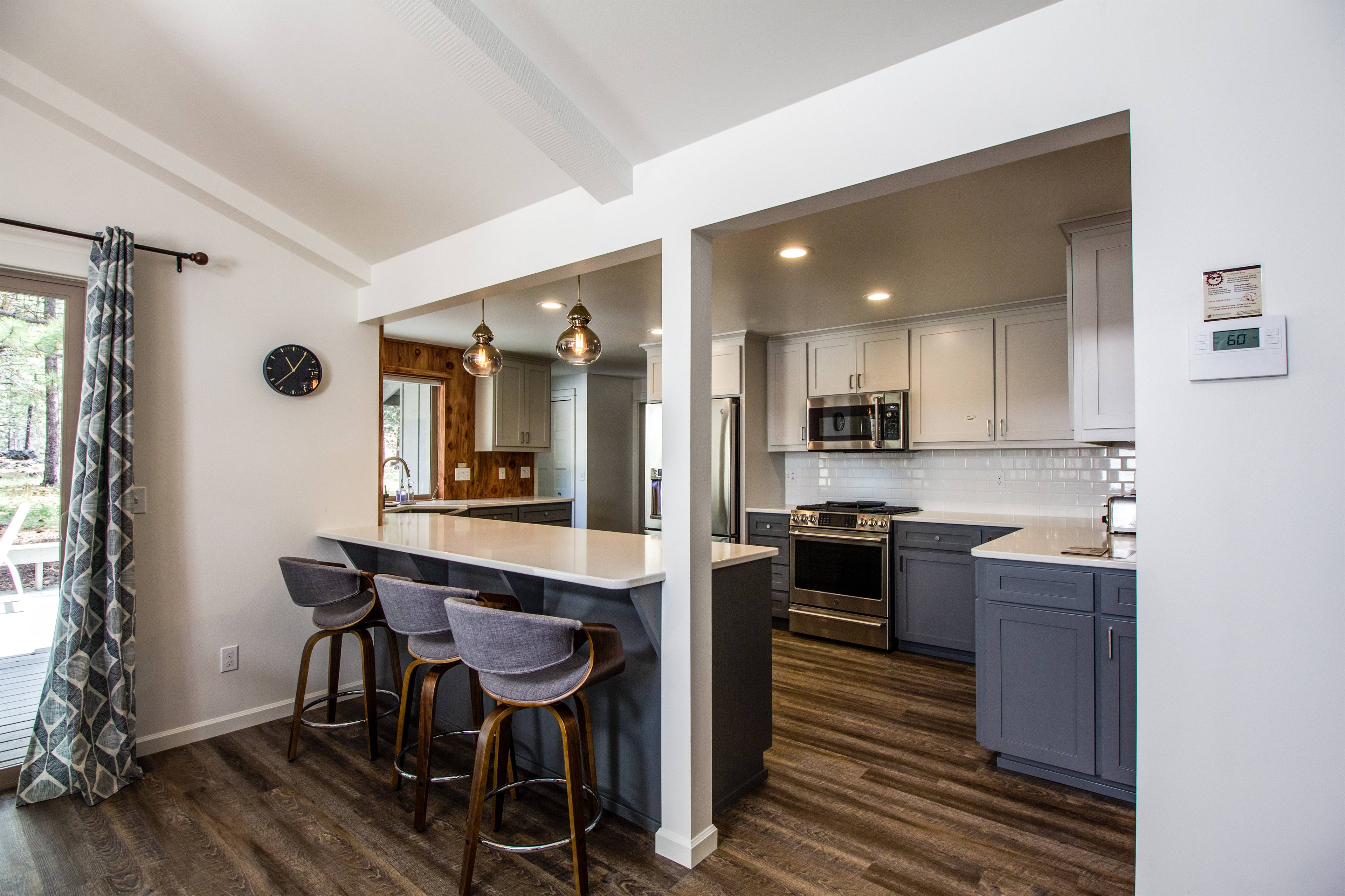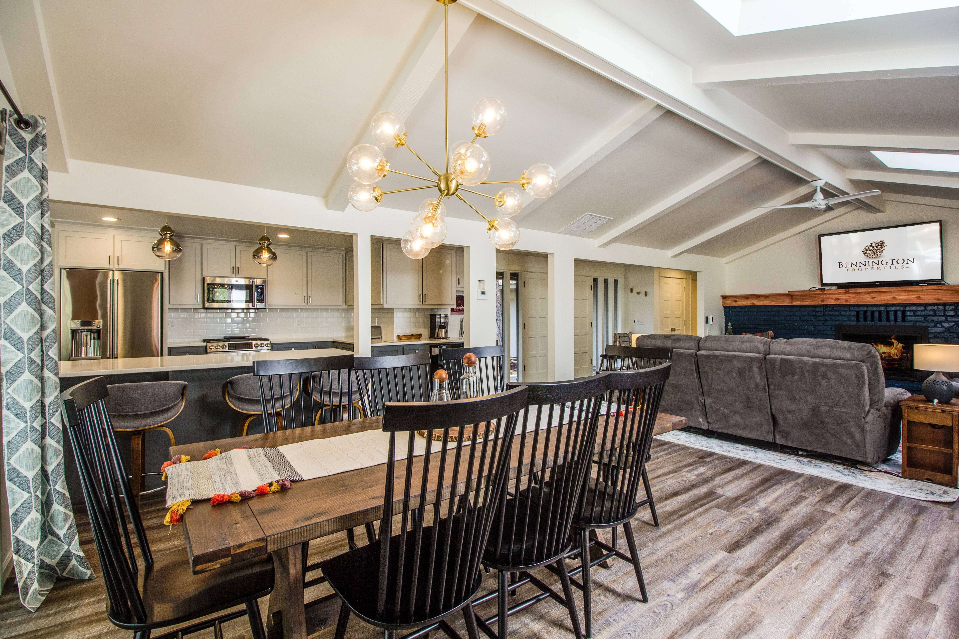 This beautiful, single-level home features a gas fireplace, air conditioning, modern furnishings, and gorgeous natural light. The living room opens to a spacious dining area with seating for 8. The updated kitchen features hardwood floors, a breakfast bar with seating for 3 more, plus beautifully crafted countertops, perfect for the chef in your group. Modern appliances and all the cooking utensils you will need to whip up a gourmet meal are included.