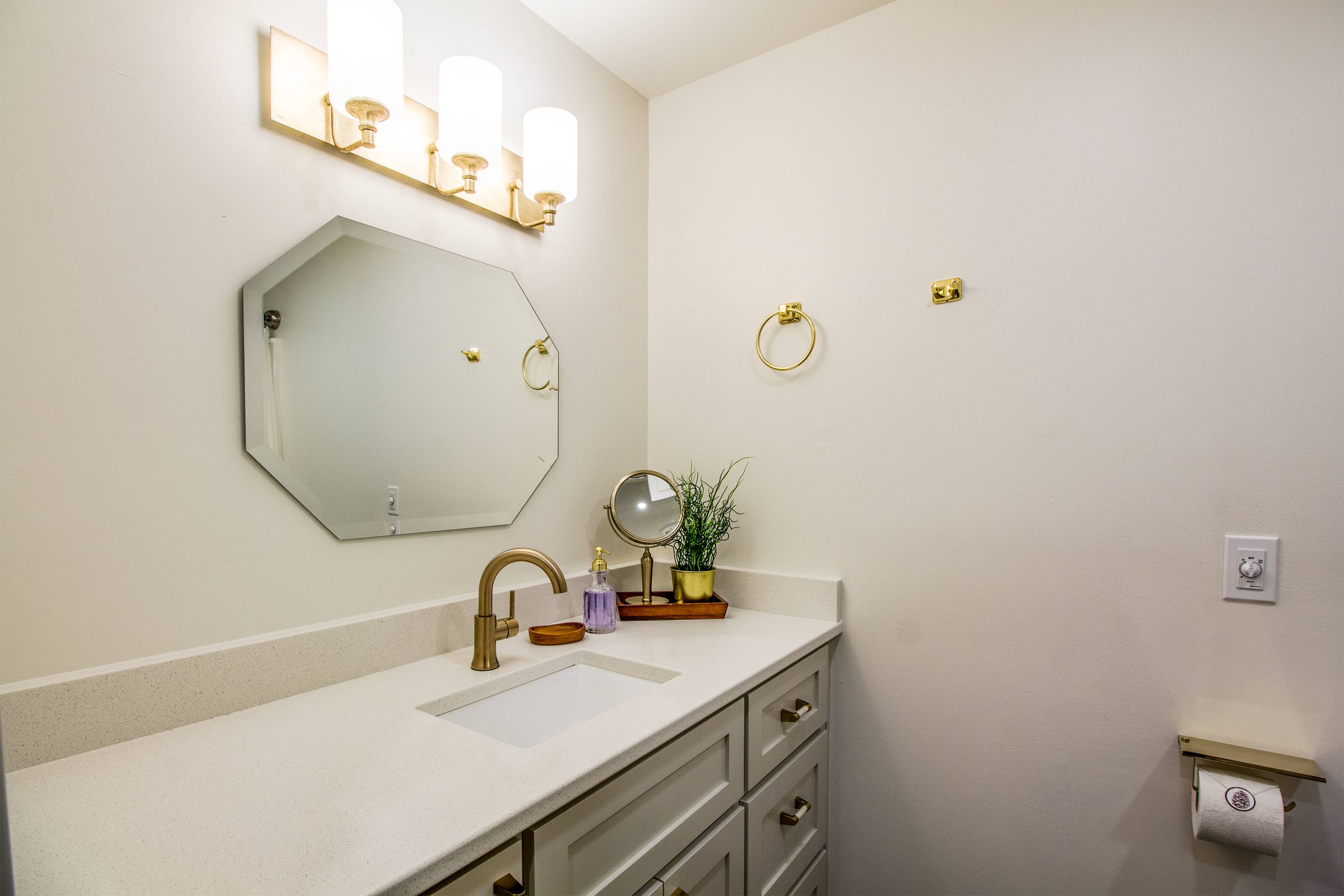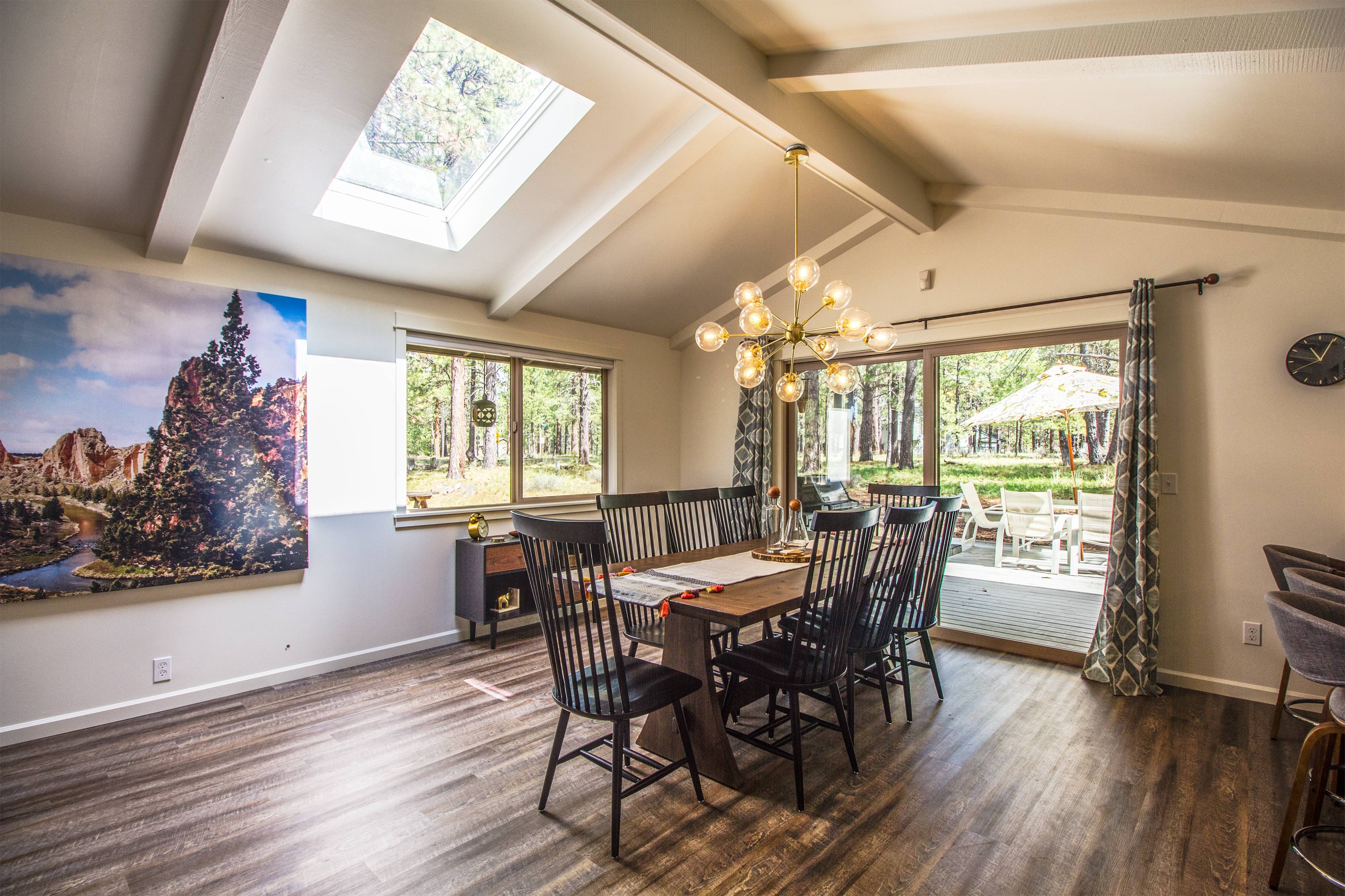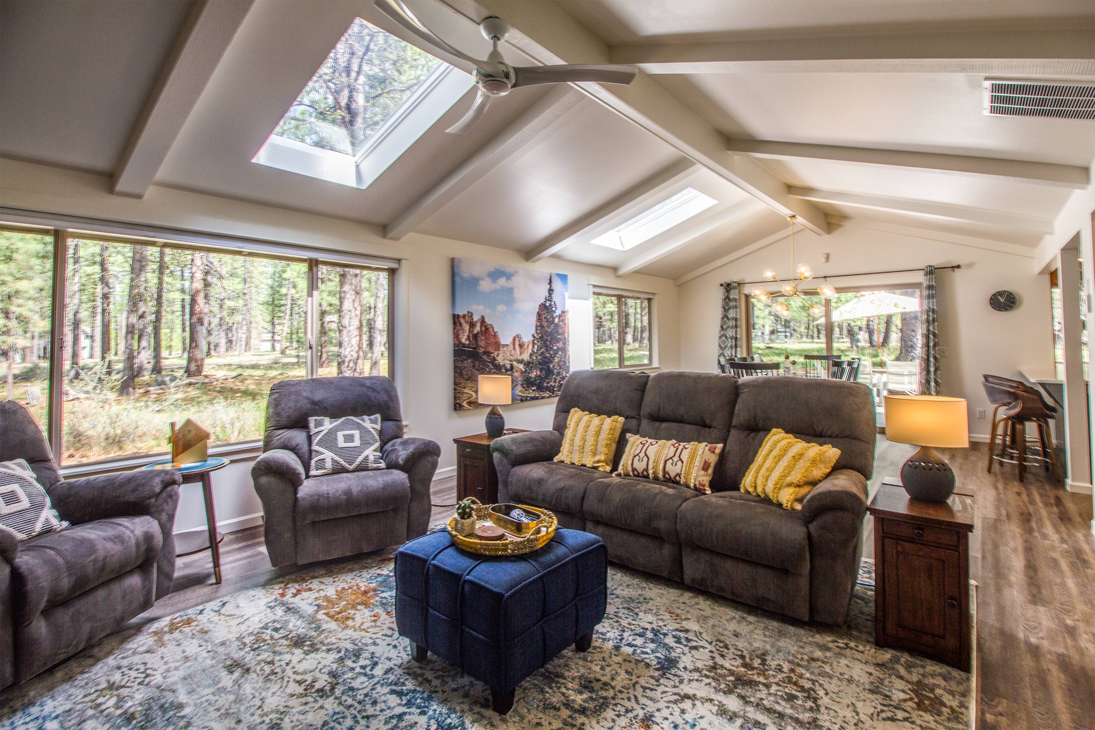 Pack light - everything you need is here. If you like to cook, you'll be really pleased with the kitchen and its equipment. If you don't cook, it's also just beautiful to look at. On all levels, our experience @ 2 Quartz Mountain Lane exceeded every expectation. From the booking experience to check-in and out, the processes were simple. The house was lovely. We had a large family group renting houses all around Sunriver from several rental groups, and the consensus was that 2 Quartz Mountain stood out. Great layout, beautifully furnished and decorated, and very well equipped. The windows were really nice - not only to provide scenic views, but opened to fill the house with fresh air and cross breezes. We are used to renting homes at the NC coast and were a little worried about no AC in most of SUnriver homes, but it was beautiful. For a few chilly mornings we even warmed up by the gas fireplace. This was our first rental experience in Oregon and the extra touches were helpful and thoughtful for out of towners (i.e. having cleaning supplies for dishes and laundry). We did not have pets or children, but it's clear there are special touches for families traveling with either or both. We look forward to returning.