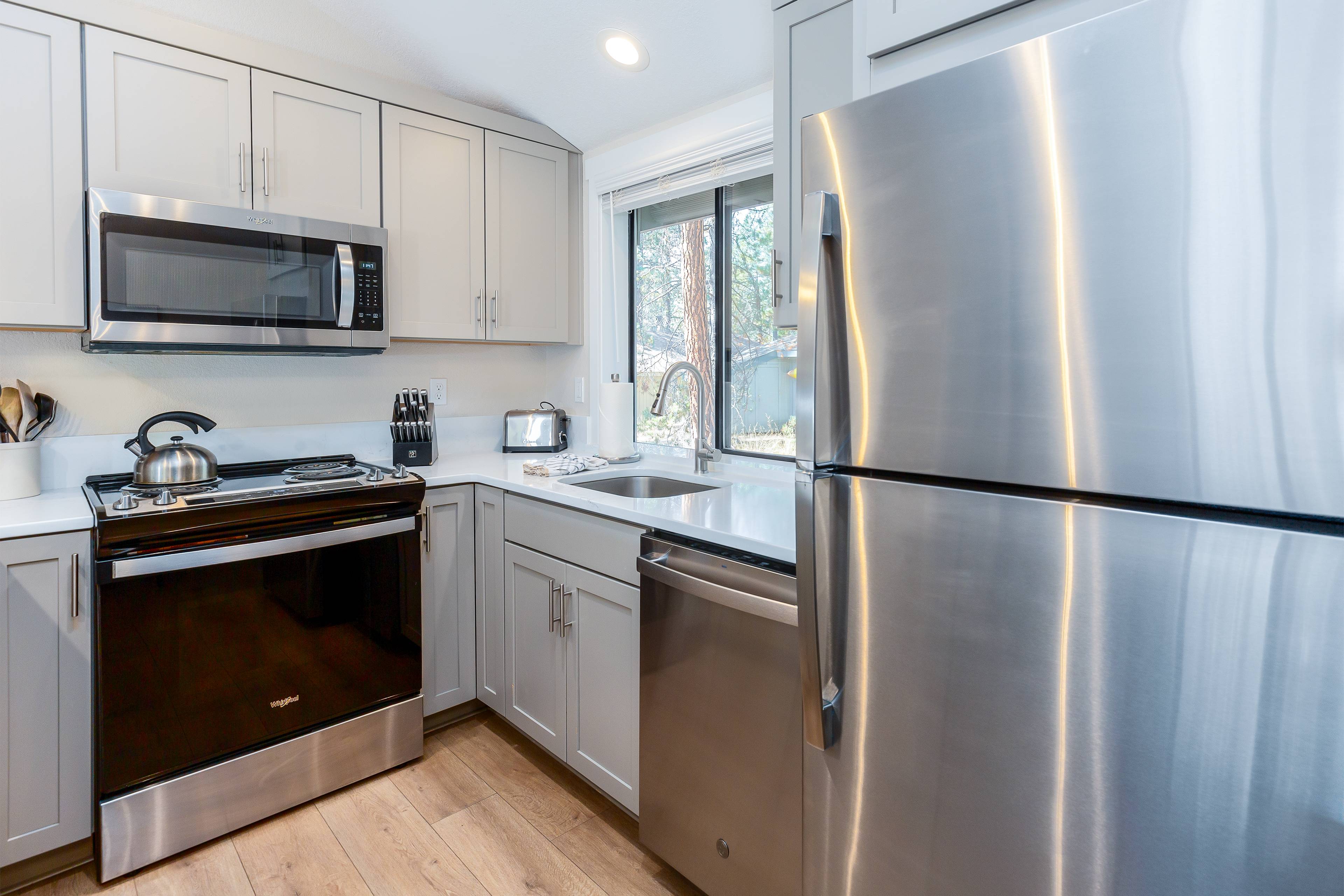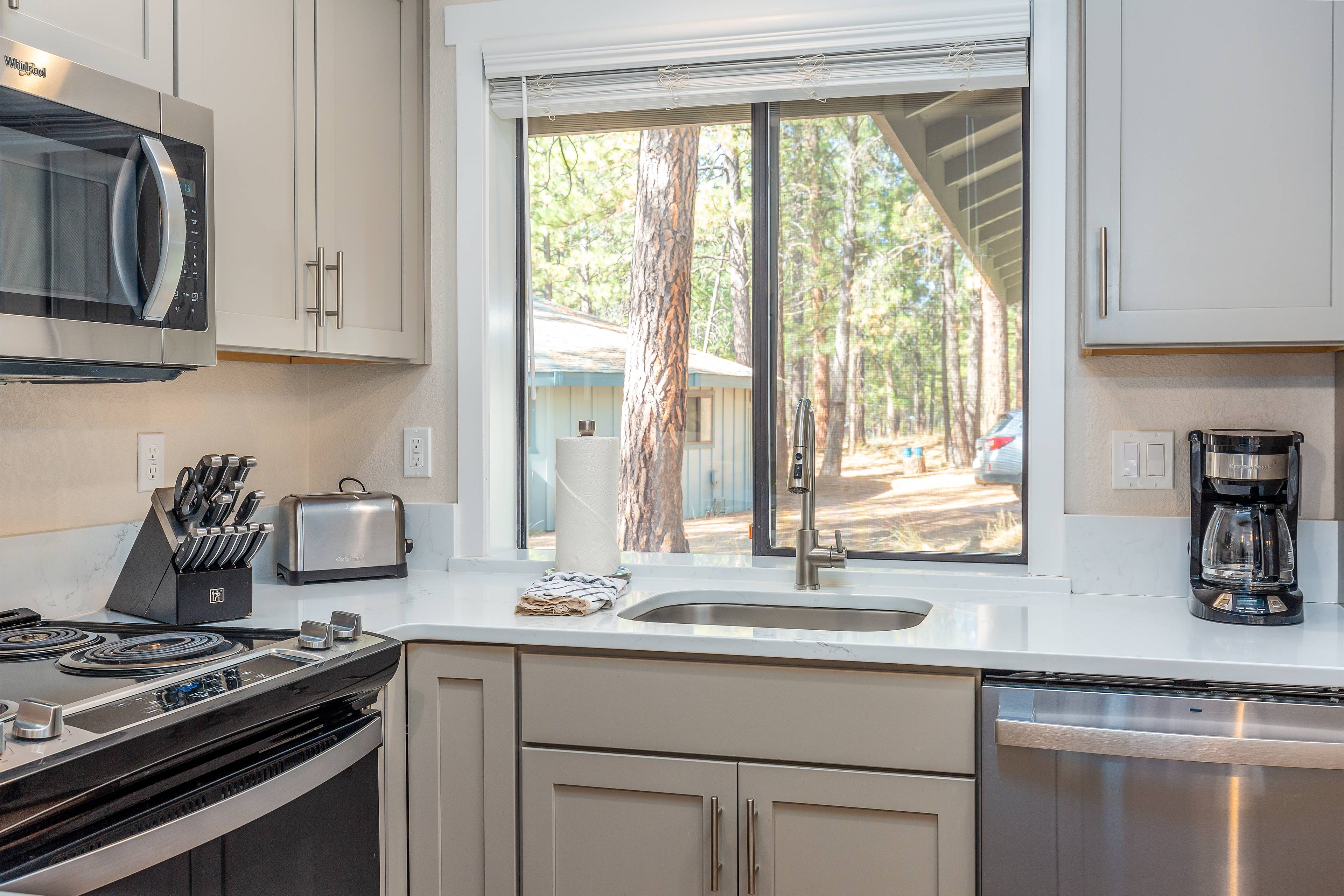 The kitchen has lots of options for pots, pans, cutting board, knives, measuring cups, etc. We did a lot of cooking when we stayed here and didn't need to use any of the utensils or other cooking implements we brought just in case. Thank you for this wonderful home to stay in Sunriver!