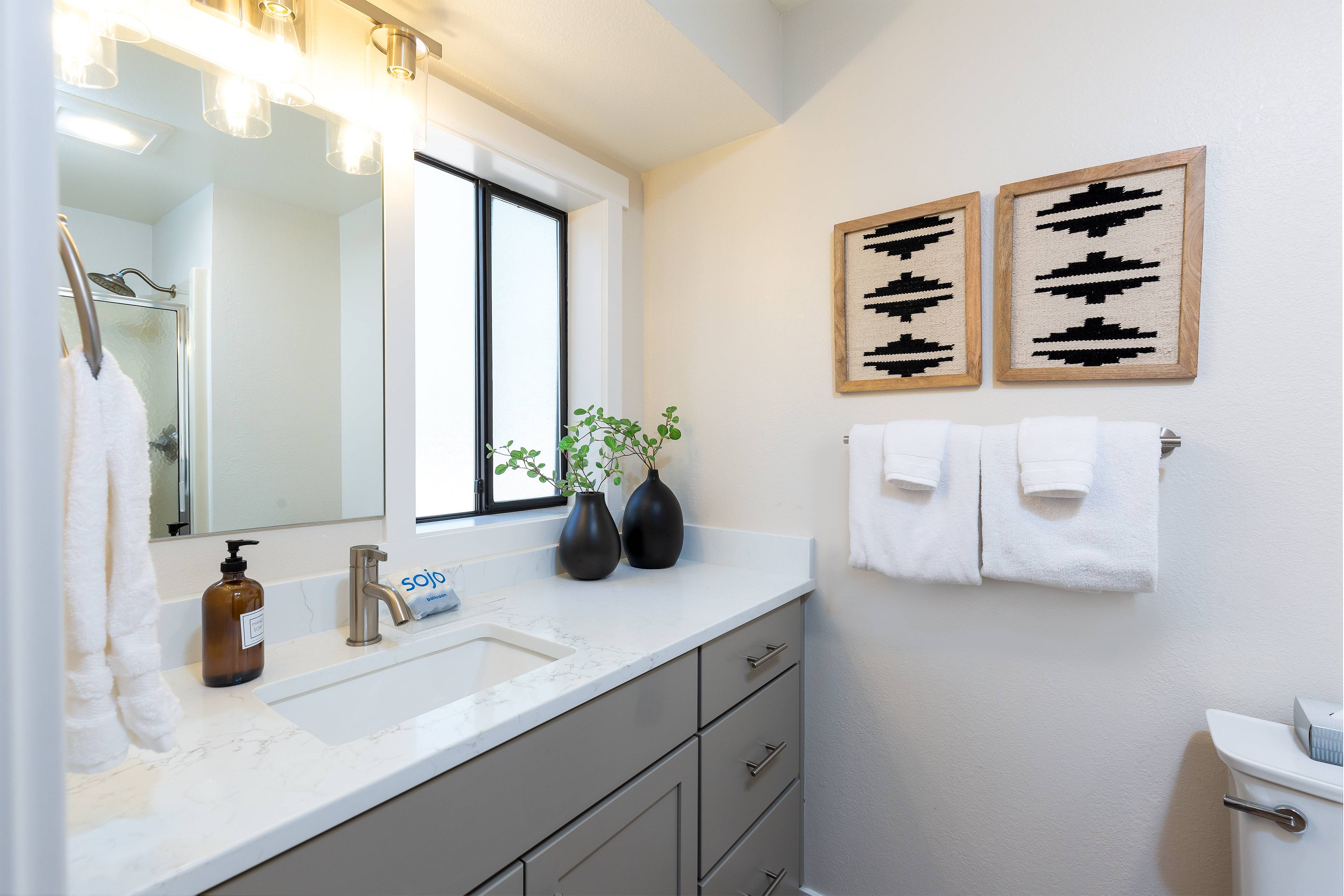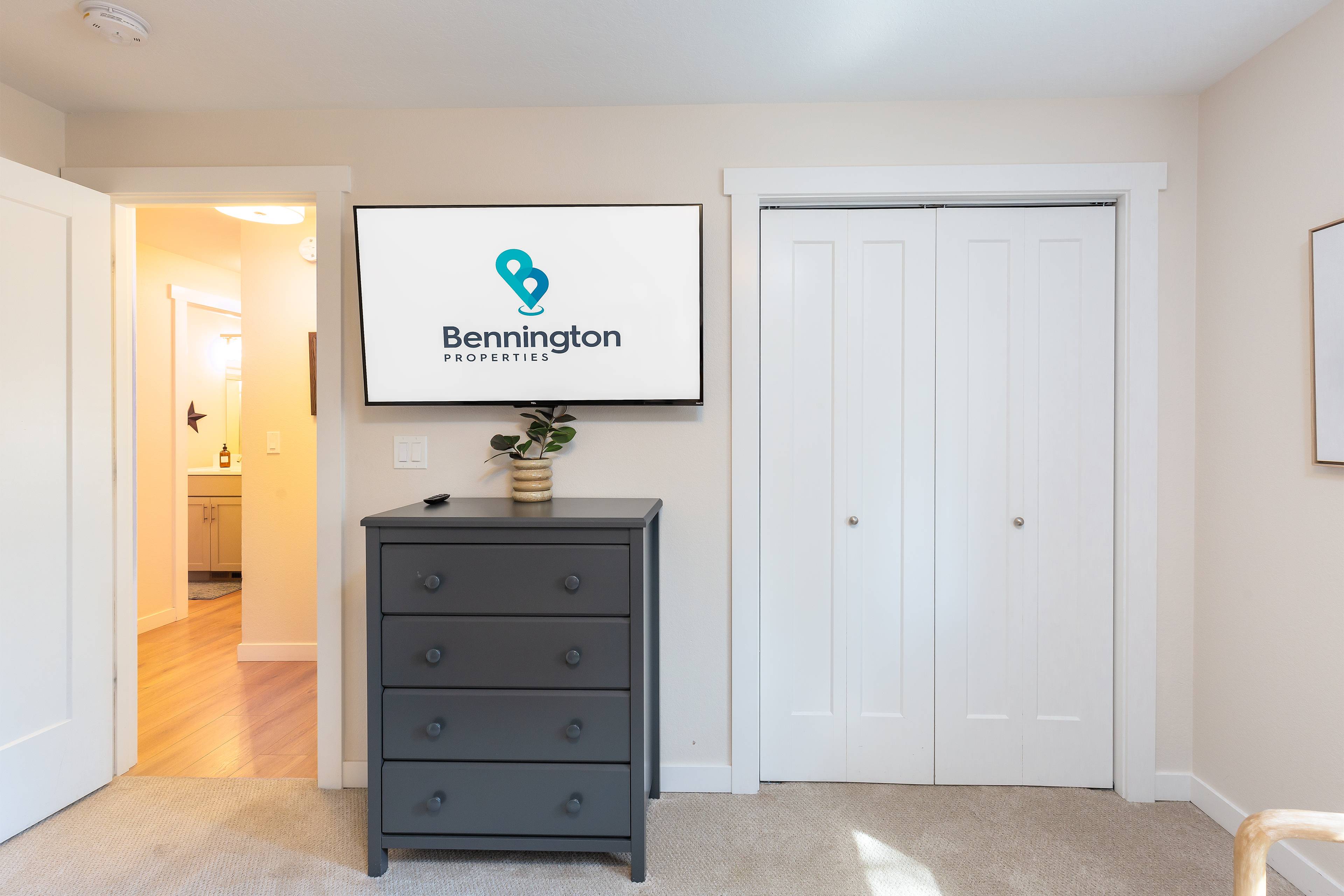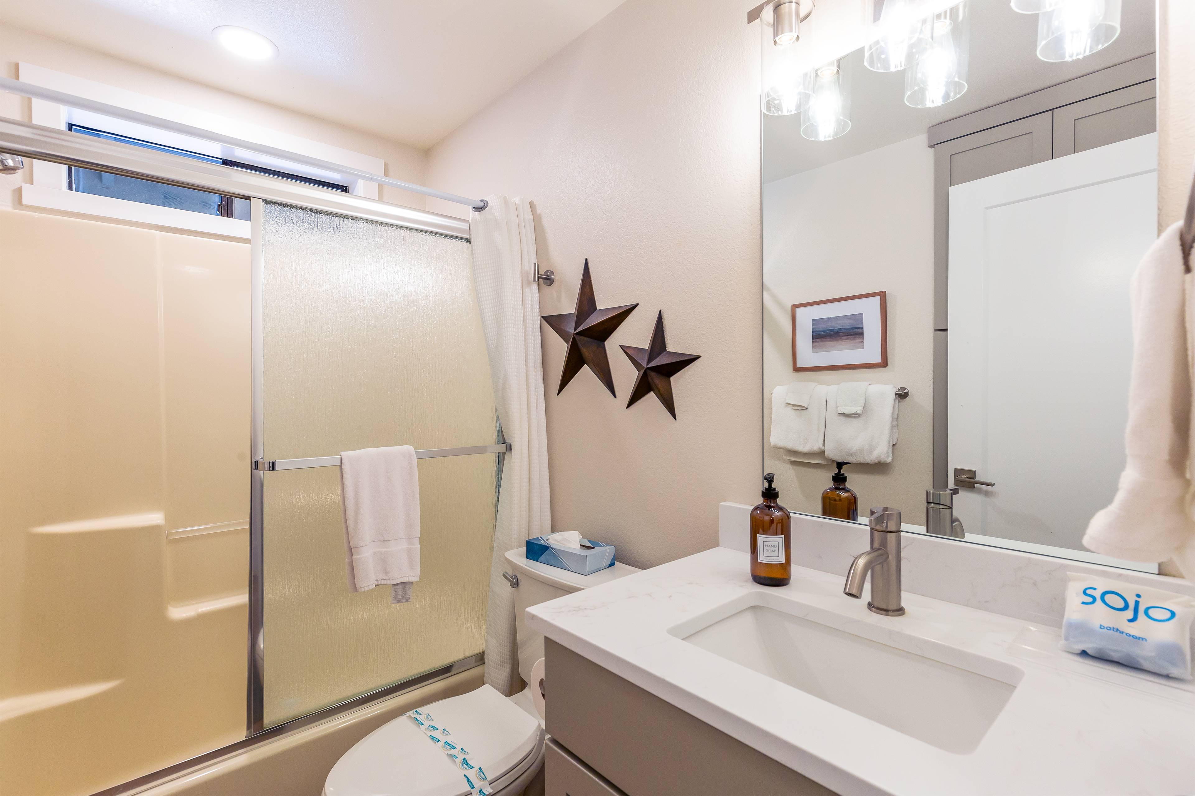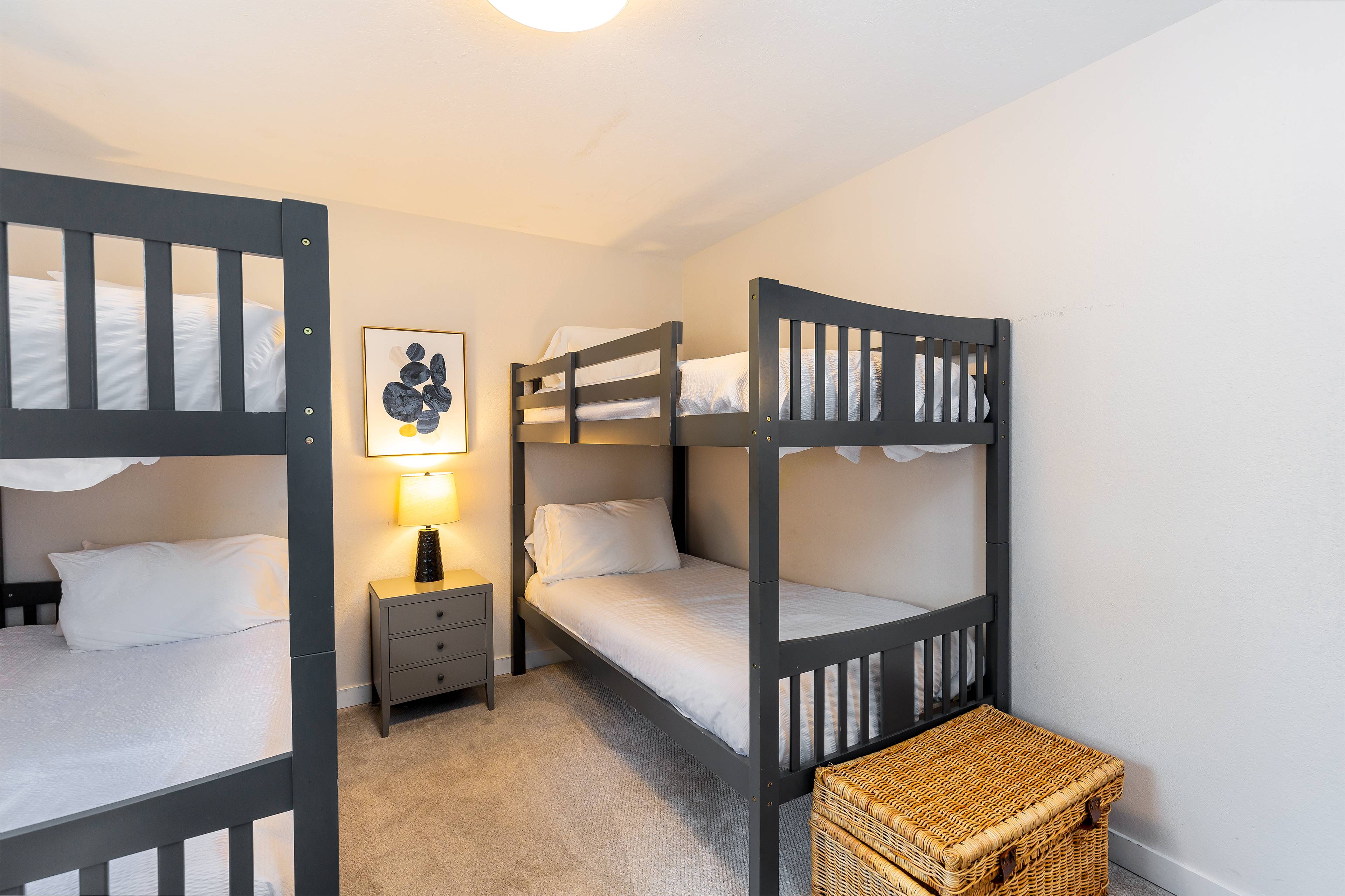 The primary suite features a king bed and private bathroom with walk-in shower. Bedroom two features a queen bed and the bunk room holds two twin-over-twin bunks that can comfortably fit 4 kiddos. All bedrooms have a Smart TV for binge-watching your favorite shows.