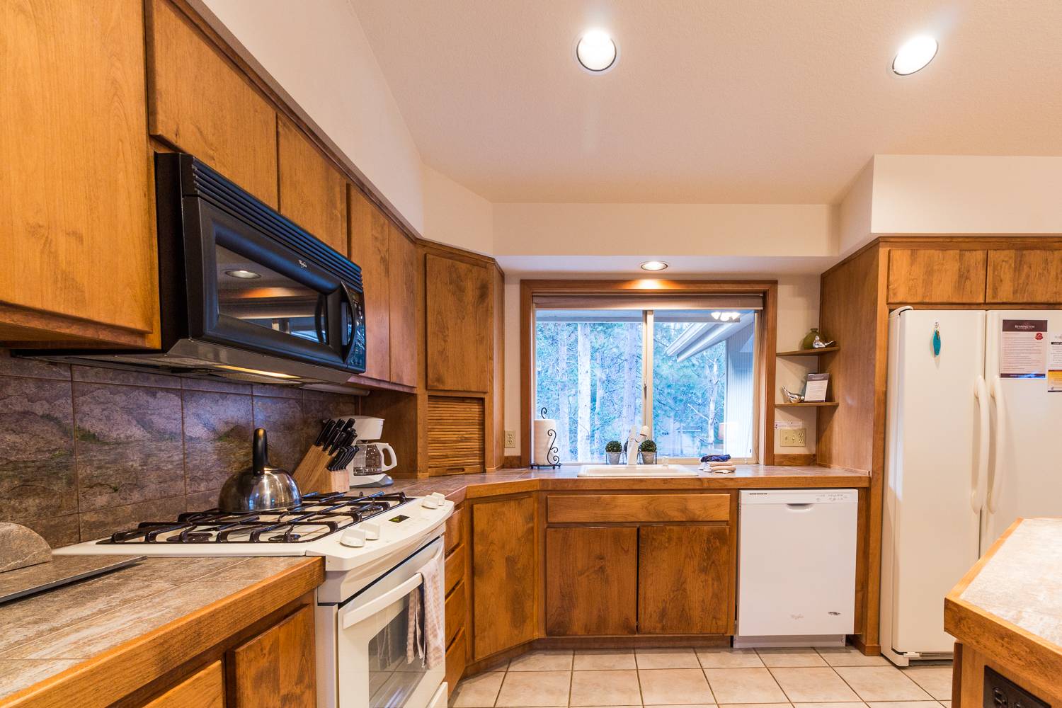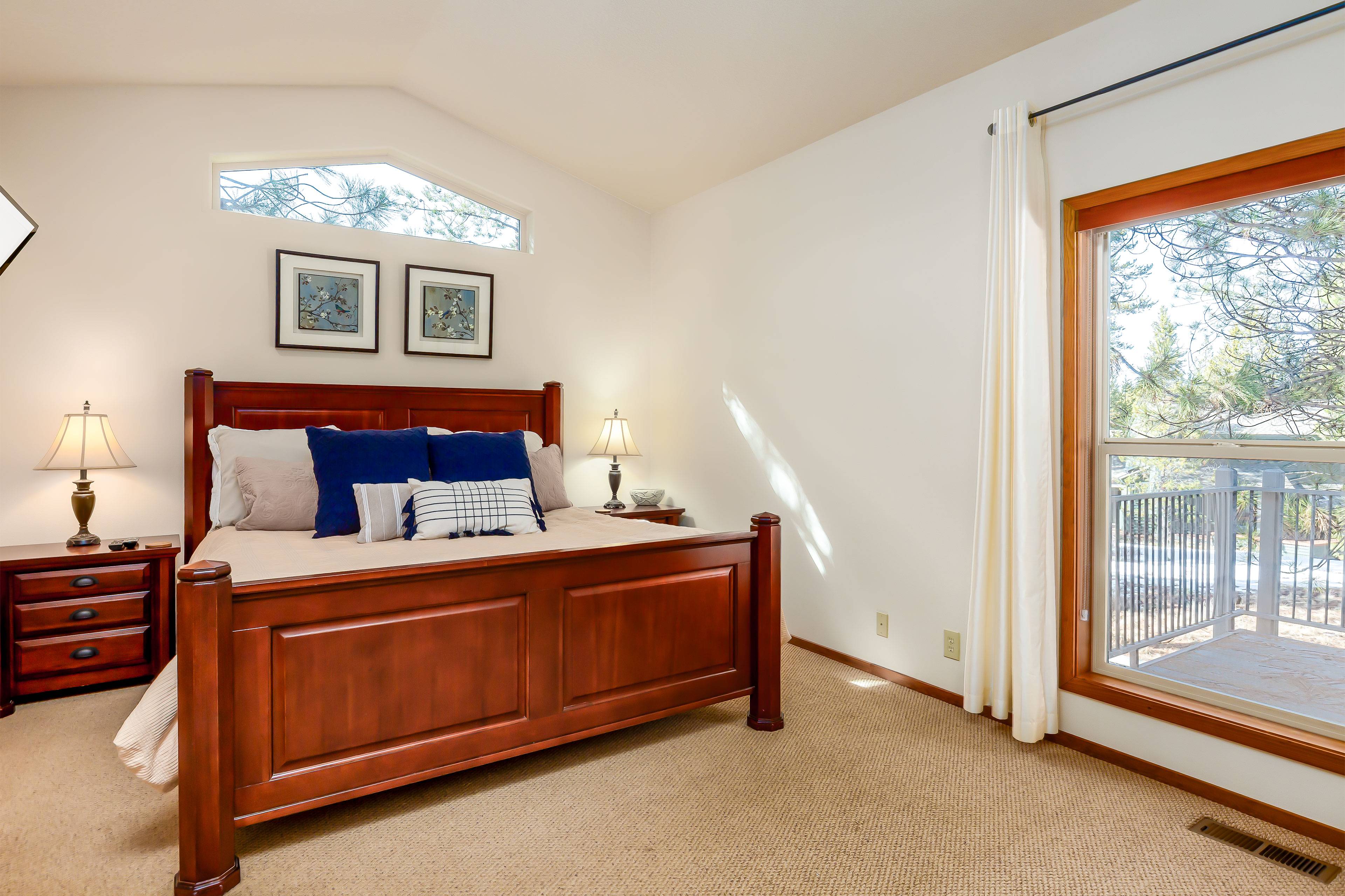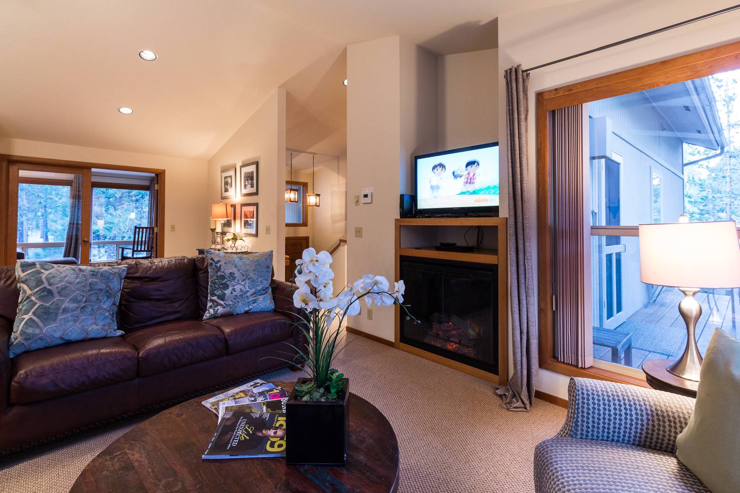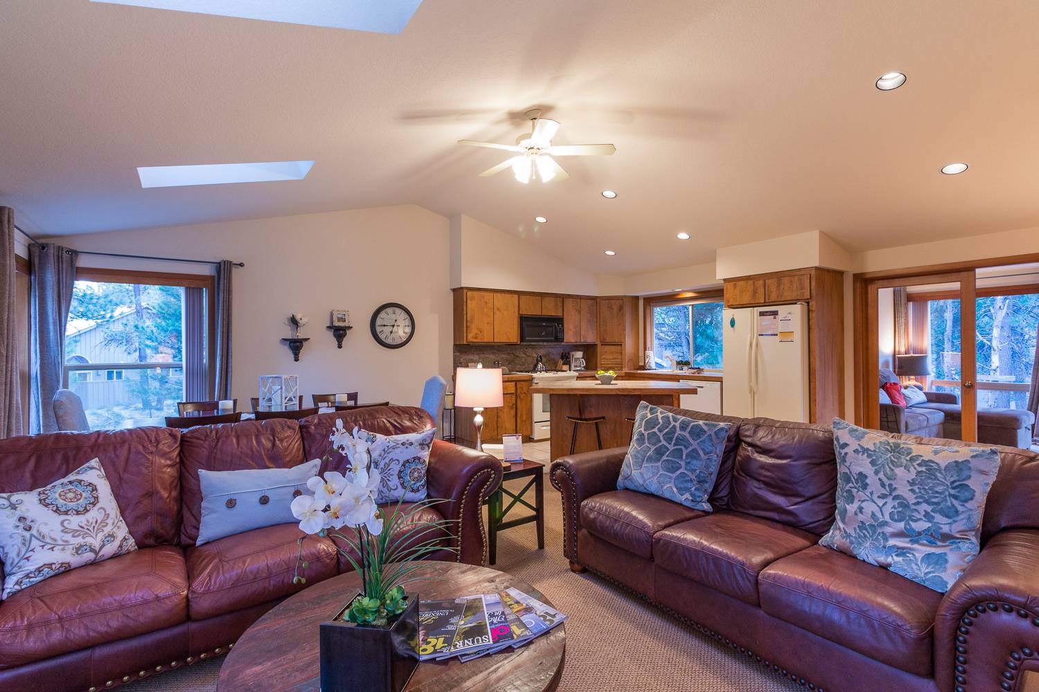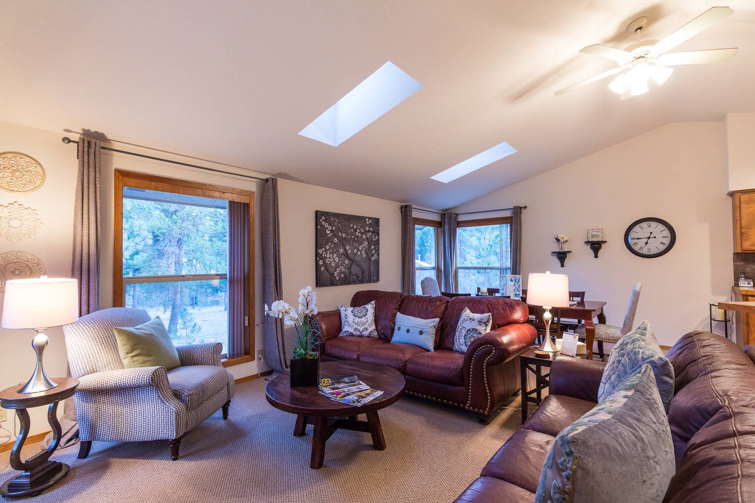 This spacious, reverse-living home is your perfect getaway home in Sunriver. Cozy leather sofas, gas fireplace and tons of light welcome you in the open-concept living area. The kitchen is fully stocked with all your cooking essentials and the adjacent dining room offers seating for 8 plus 2 at the breakfast bar. Curl up with your favorite book in the sitting room and when you are ready to retire, a huge king ensuite with private bath round out this level.