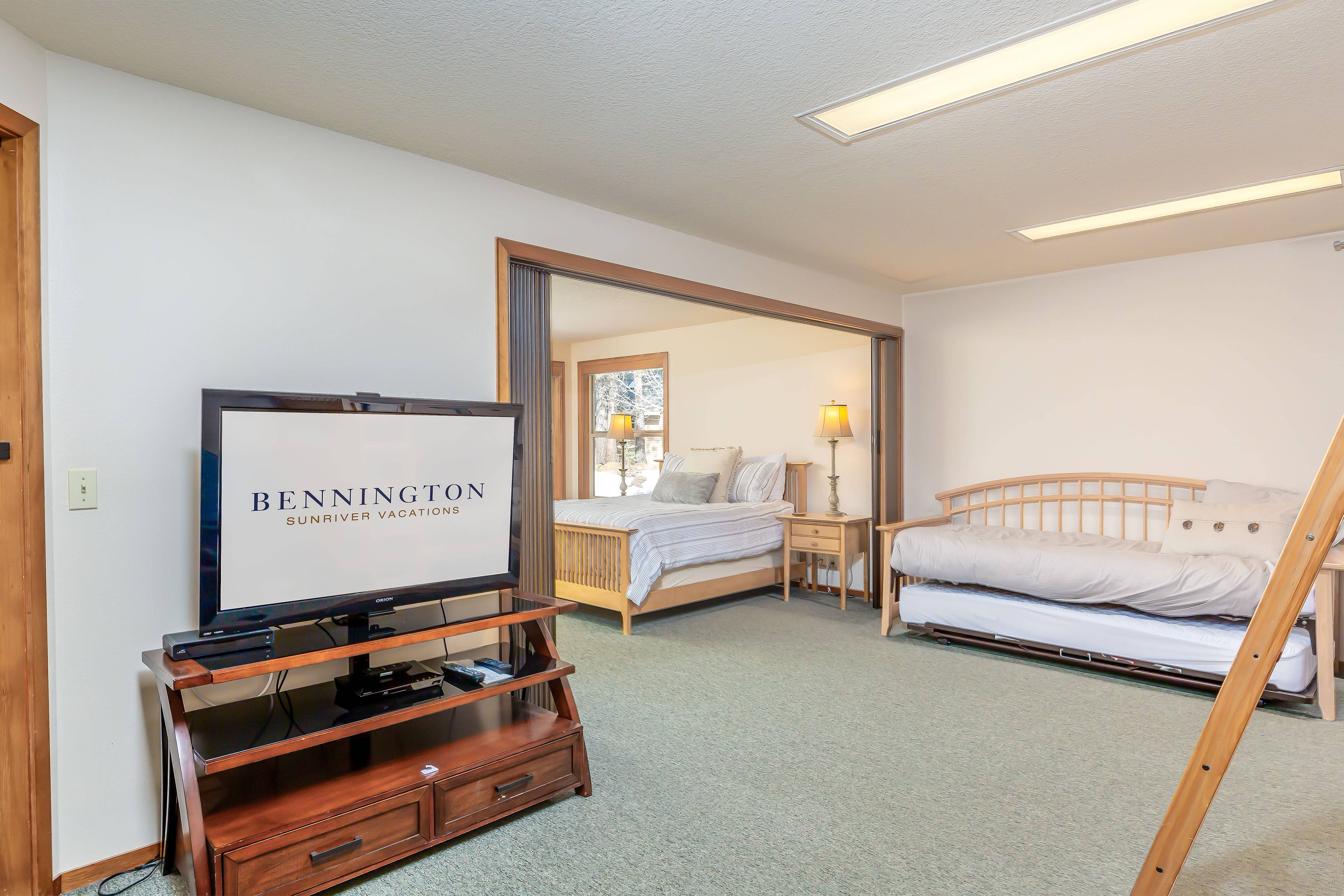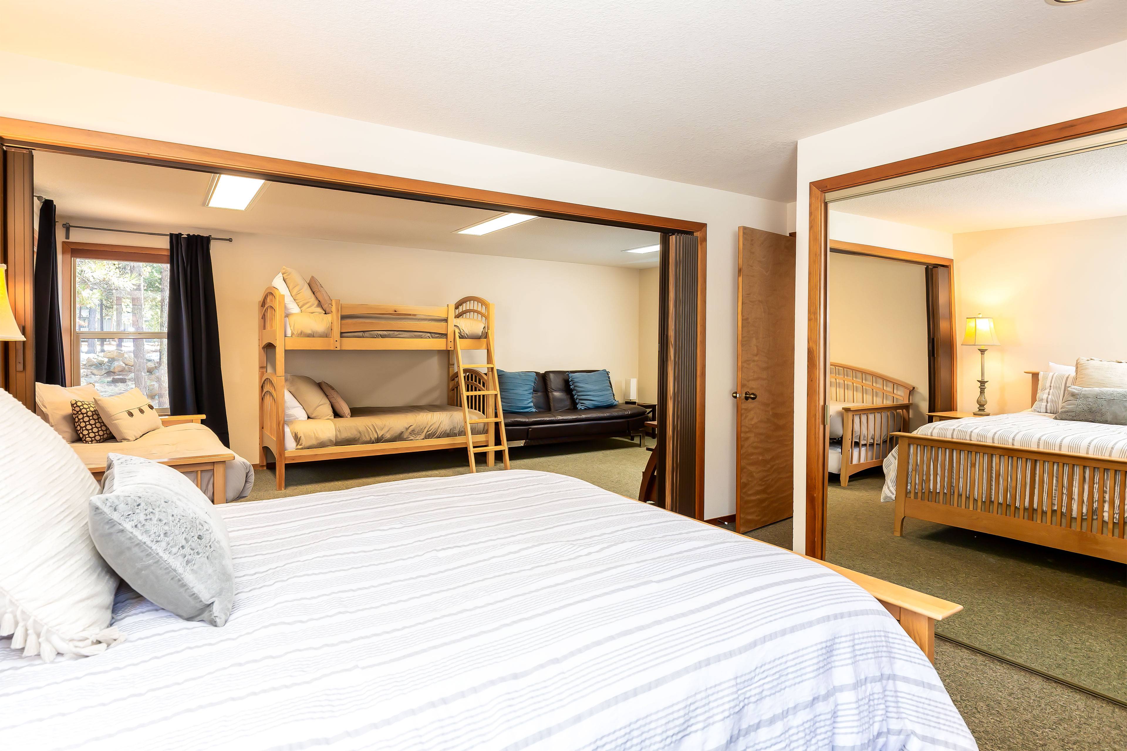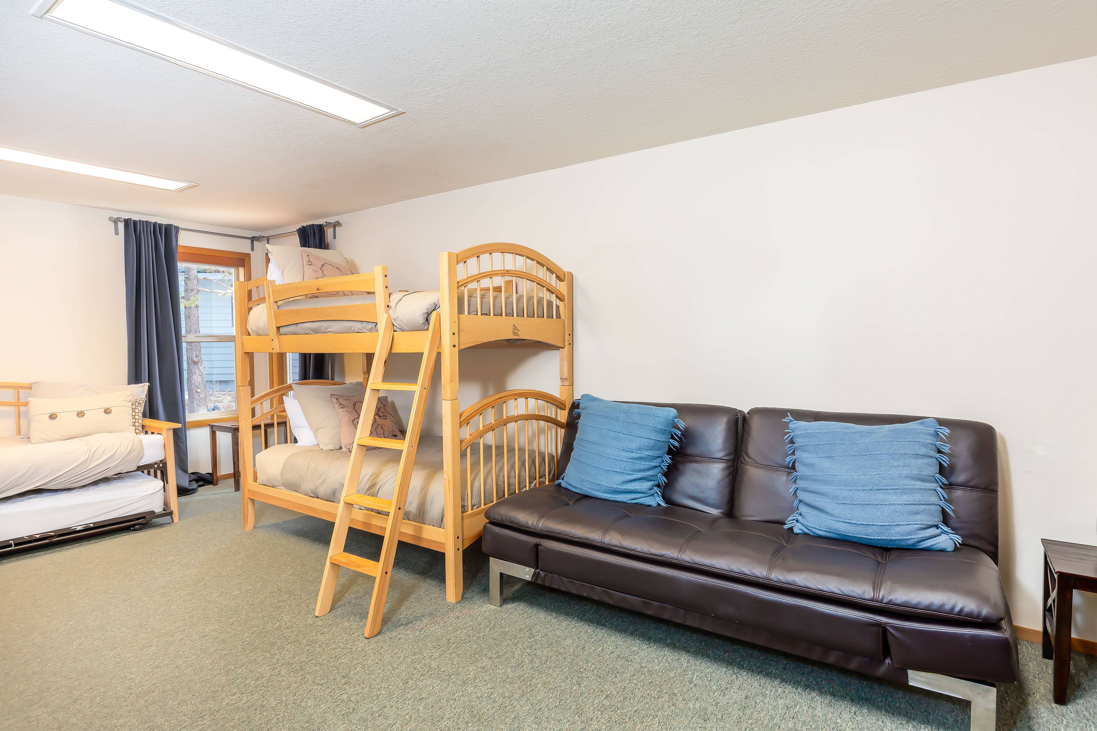 Head downstairs to the super fun bunk room with twin over twin bunk bed, daybed w/ twin trundle, and a futon. The third bedroom features a queen bed with TV. The second full bathroom and the laundry room are also located on this level.