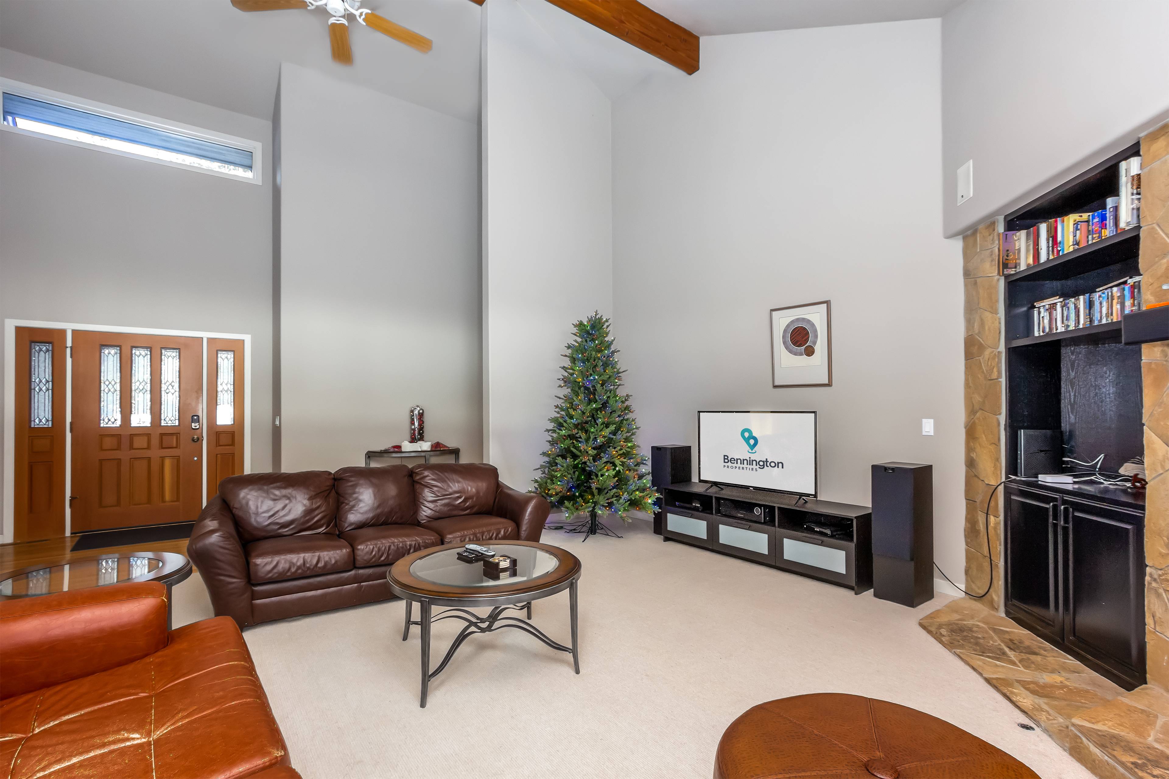 The open-concept layout features vaulted ceilings and tons of natural light. The living, dining and kitchen areas are combined to keep everyone close together. In the living room, enjoy features such as a gas fireplace, Smart TV and, a DVD player. The kitchen and dining room connection makes meal time a snap, and you'll be able to whip up your family's favorite meals in our fully stocked kitchen. Or enjoy dining al fresco on the back deck with views of the golf course.