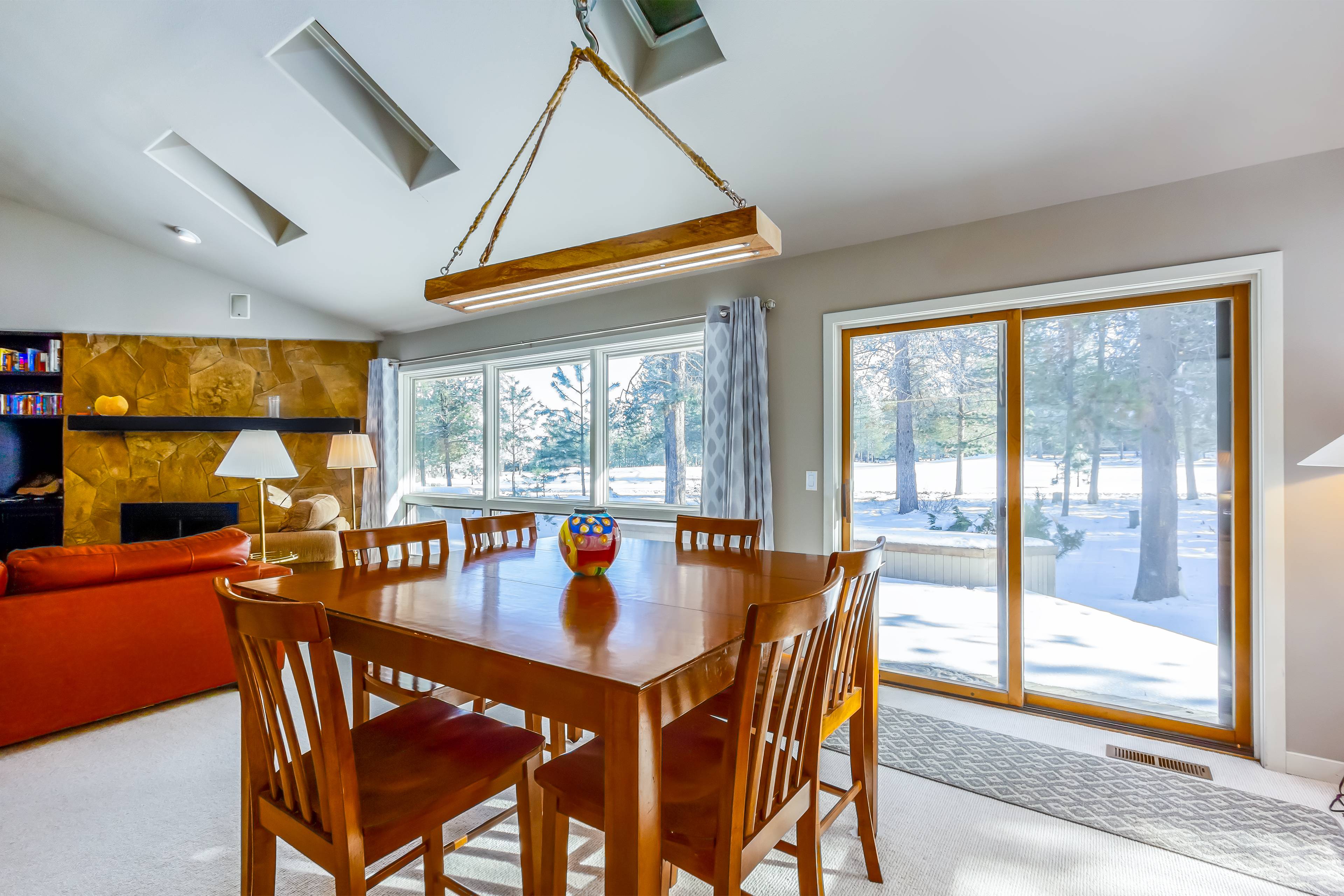 The open-concept layout features vaulted ceilings and tons of natural light. The living, dining and kitchen areas are combined to keep everyone close together. In the living room, enjoy features such as a gas fireplace, Smart TV and, a DVD player. The kitchen and dining room connection makes meal time a snap, and you'll be able to whip up your family's favorite meals in our fully stocked kitchen. Or enjoy dining al fresco on the back deck with views of the golf course.