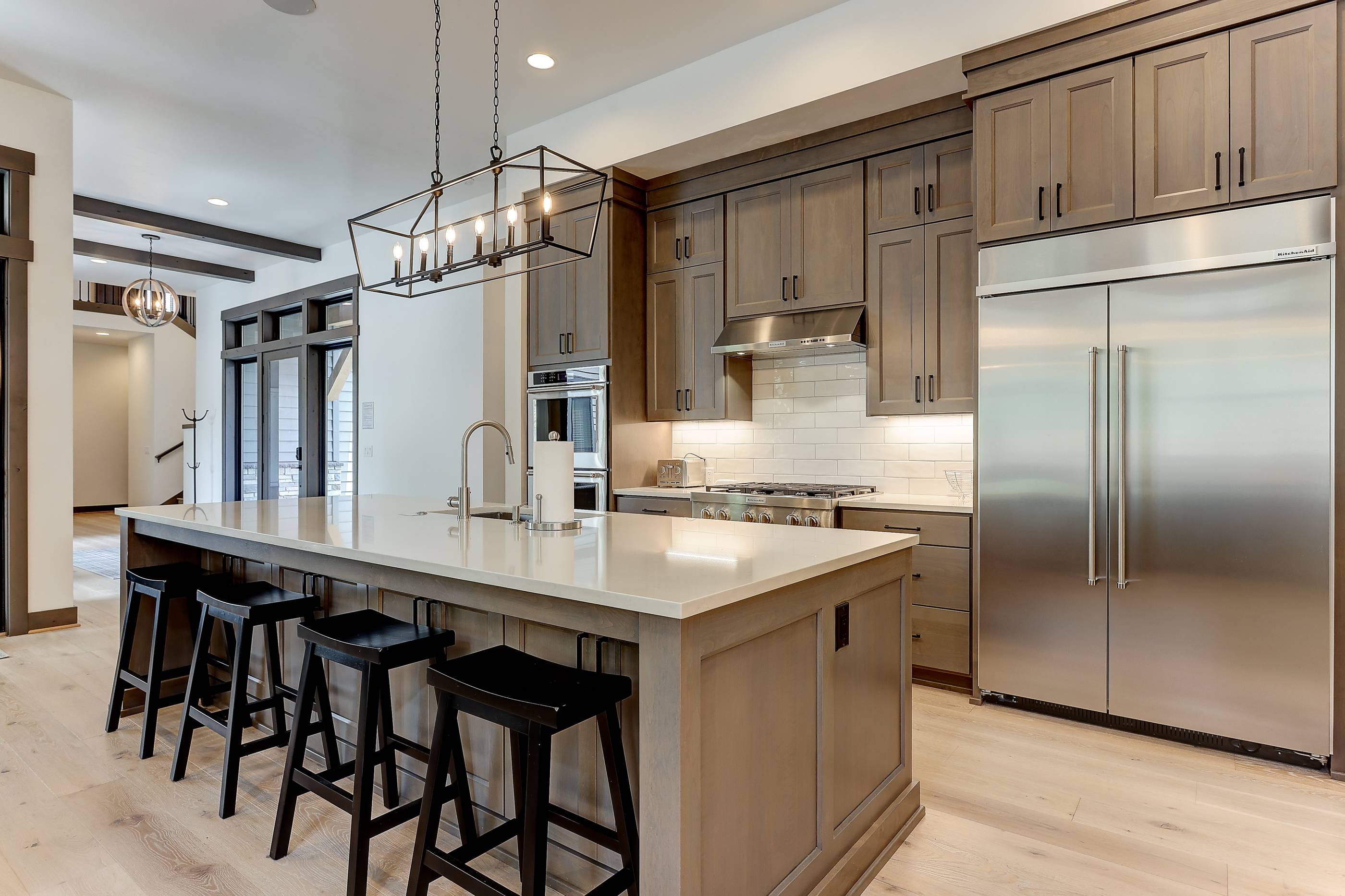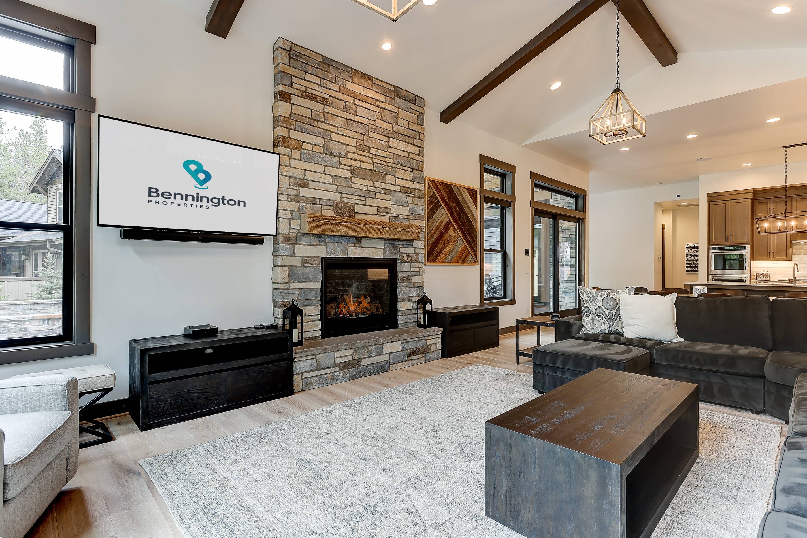 The living room features modern, comfortable furnishings, a gas fireplace, and a large Smart TV. The fully stocked gourmet kitchen is spacious with plenty of counter and table seating for the whole group. This home has a Pack-n-Play and a high chair available for those travelling with small children.