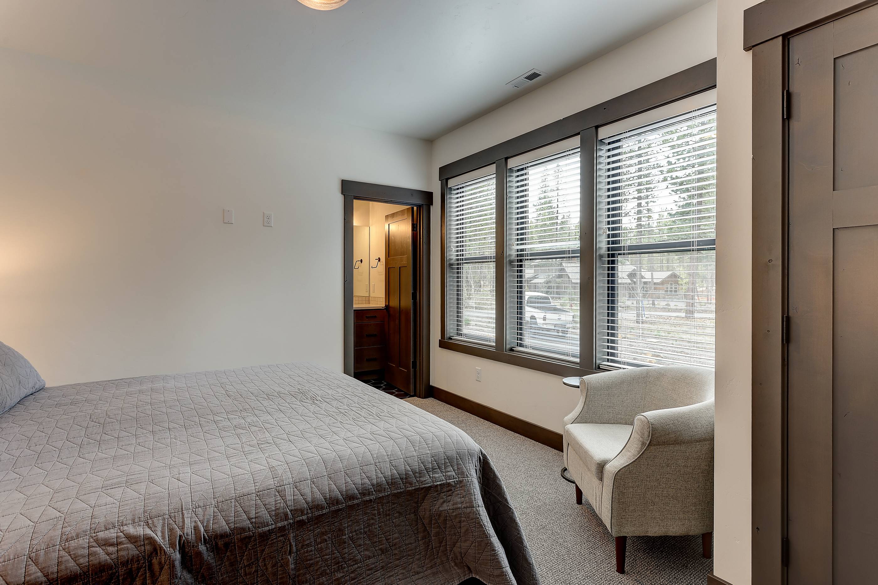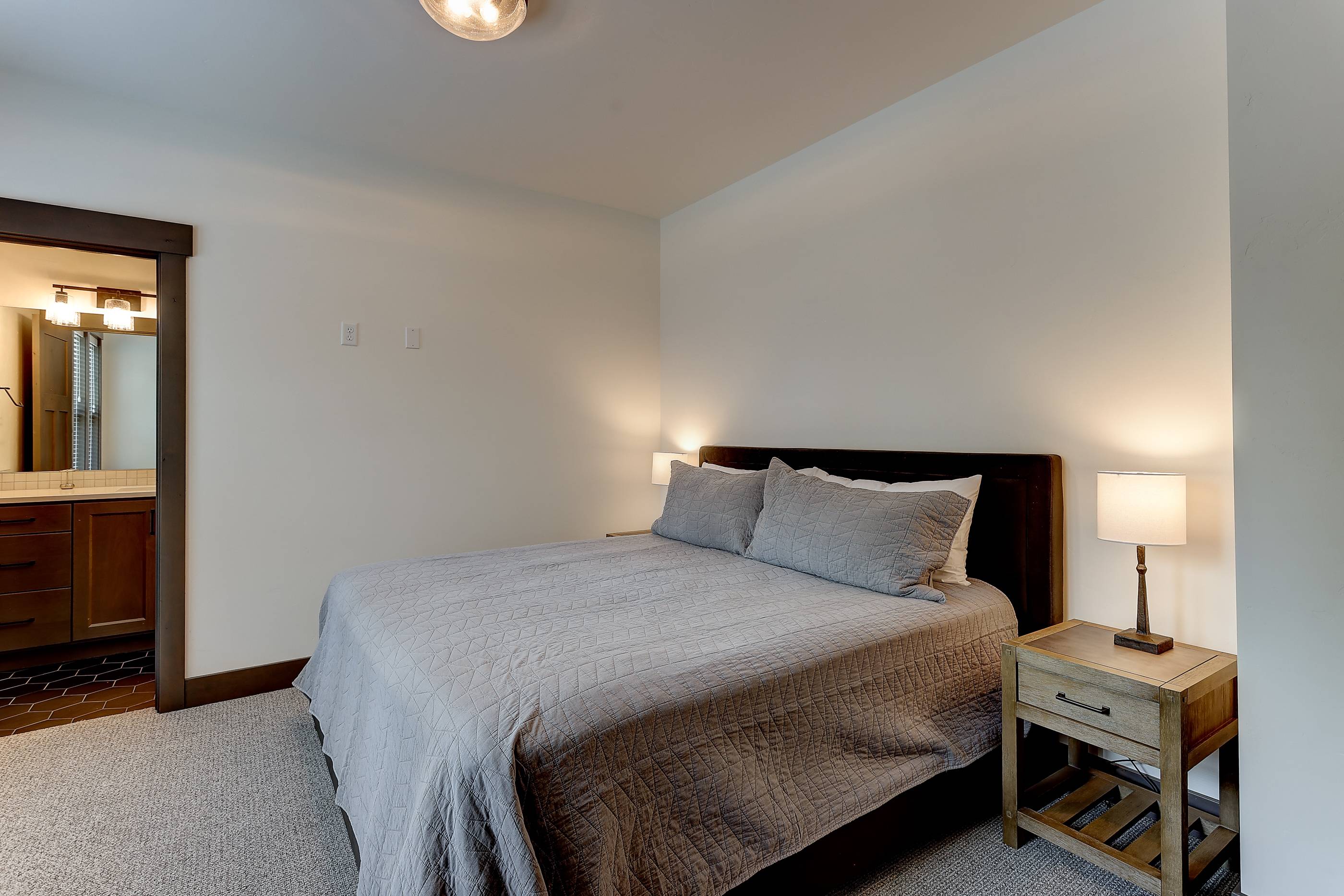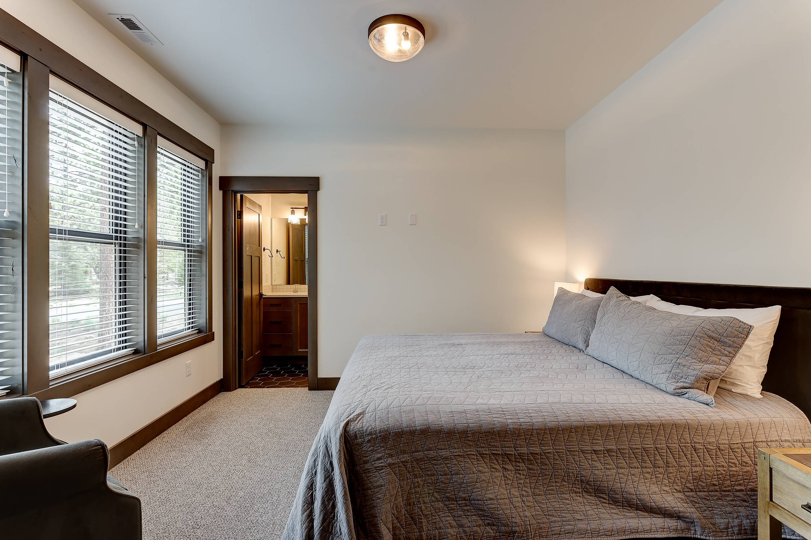The primary King suite is on the main floor and includes a California King bed, an attached bathroom with walk-in shower, and Smart TV. It also has a work station that includes monitor.