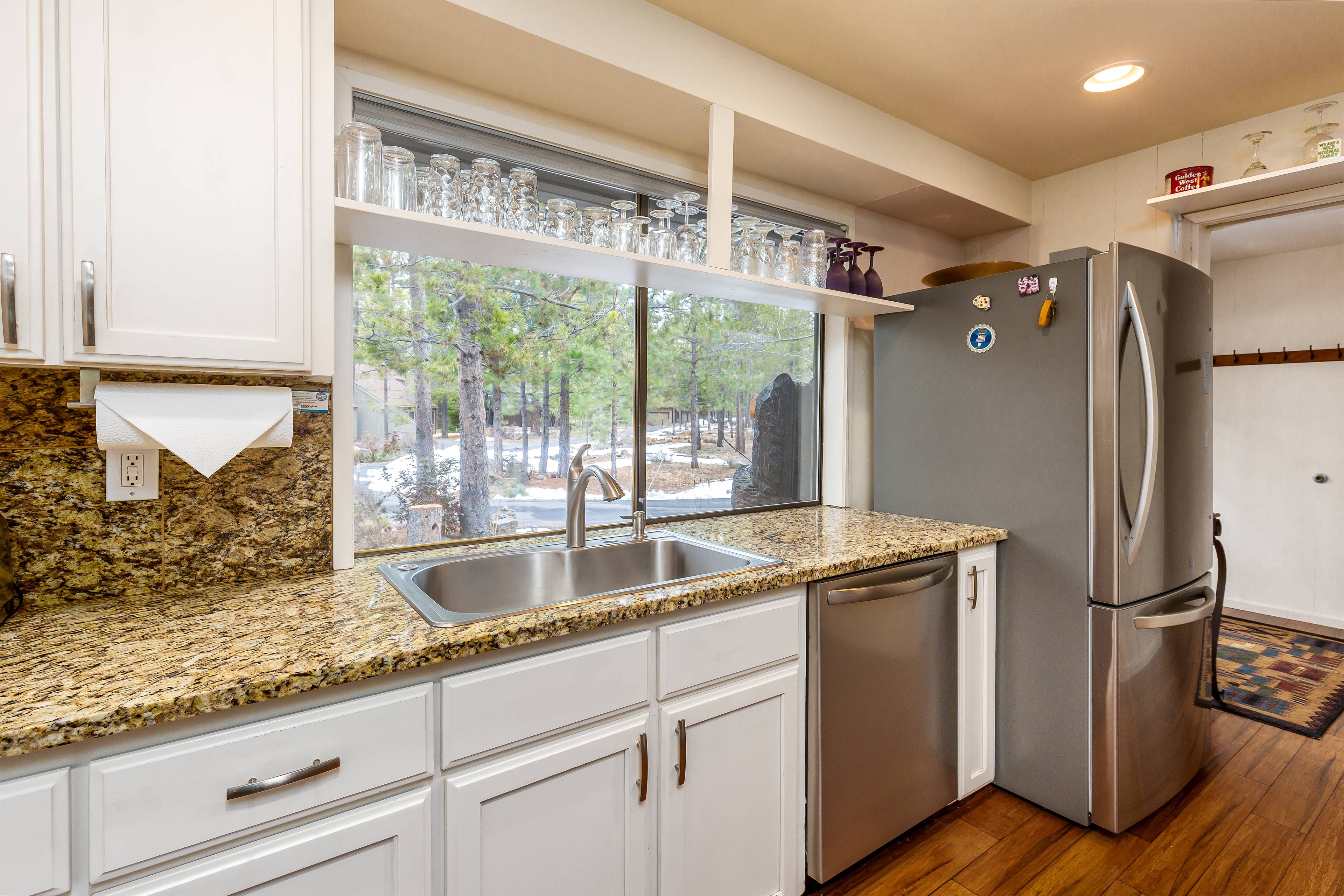 This charming and well-decorated home is perfectly located in the heart of Sunriver, a short walk to the Village at Sunriver and SHARC. With large family and dining spaces inside and out, vaulted ceilings and big windows, the house is set up for families and friends to relax and enjoy all Sunriver has to offer.