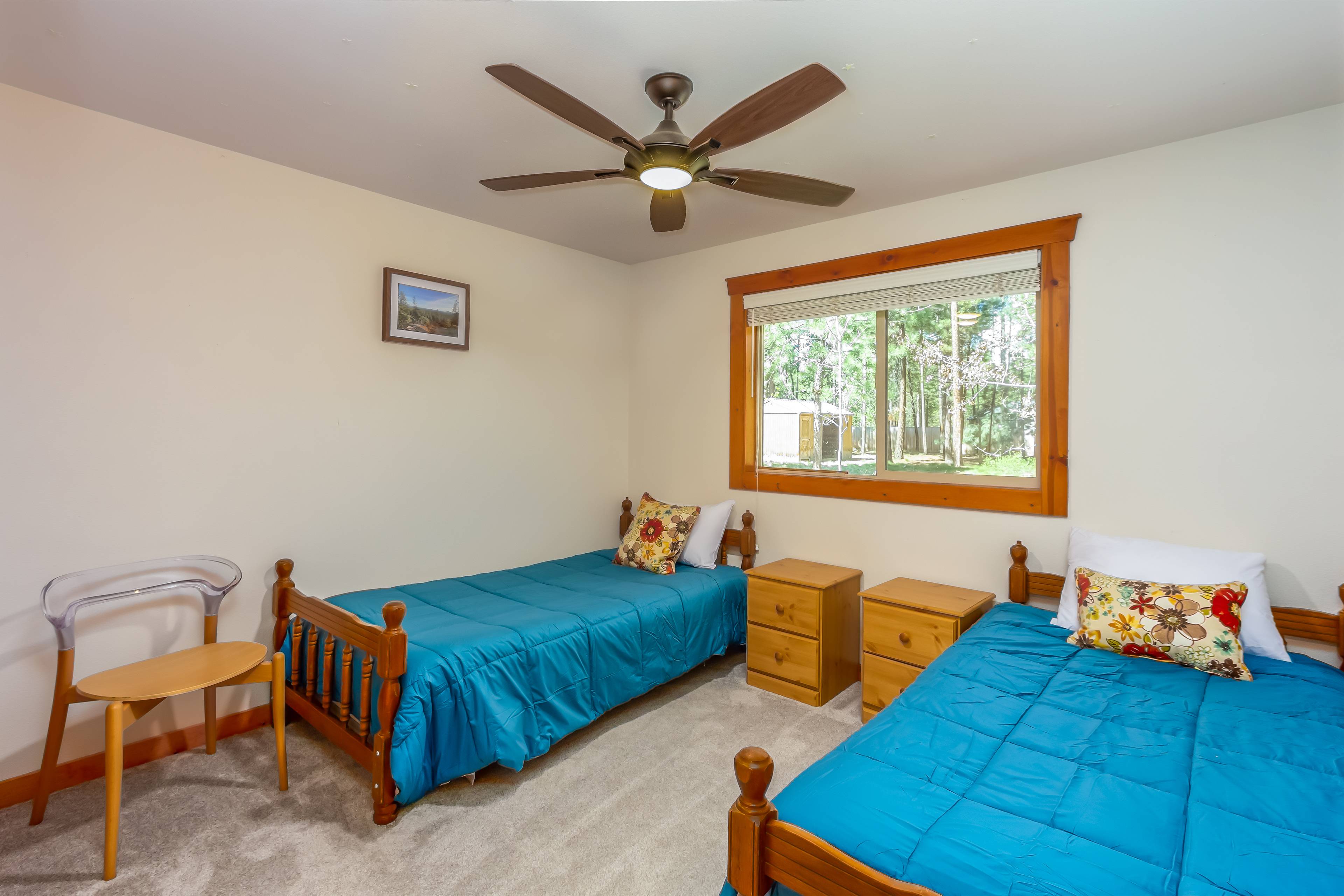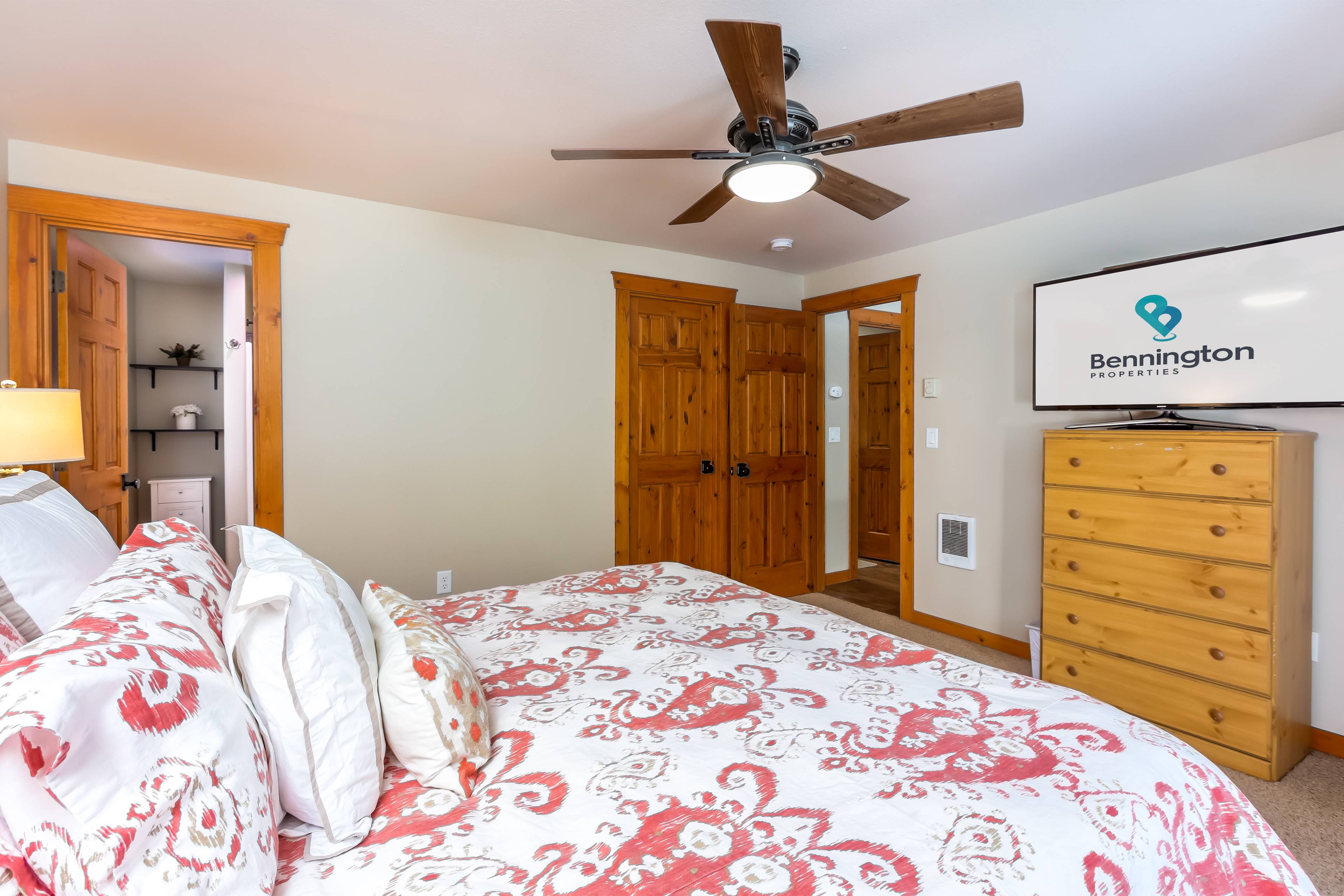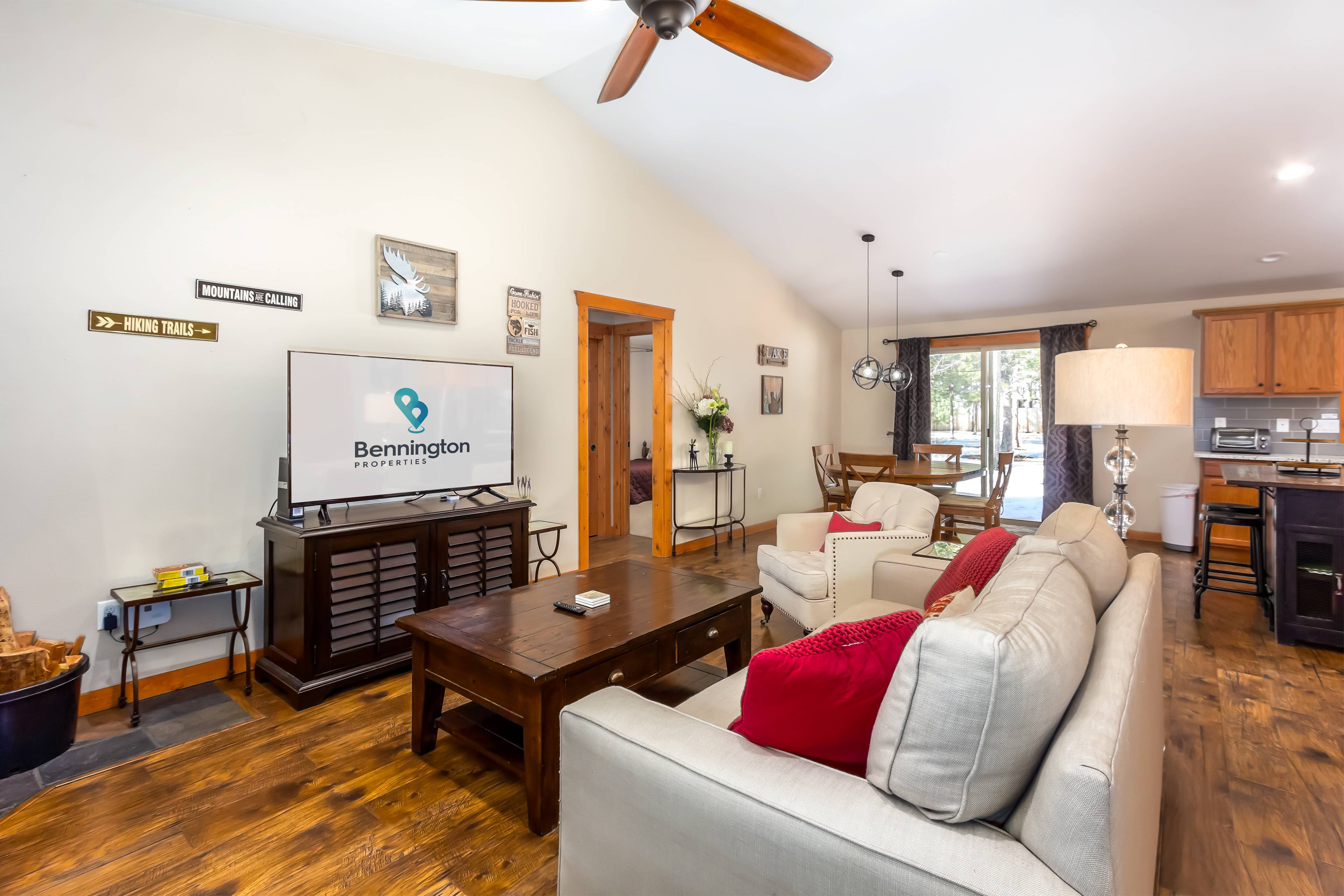 The large primary suite features a king-sized bed, attached private bathroom, smart TV and direct access to the hot tub area. The two additional bedrooms, 1 with a queen bed and the other with 2 twins, plus a full bathroom are located on the other side of the home offering nice separation from the primary.