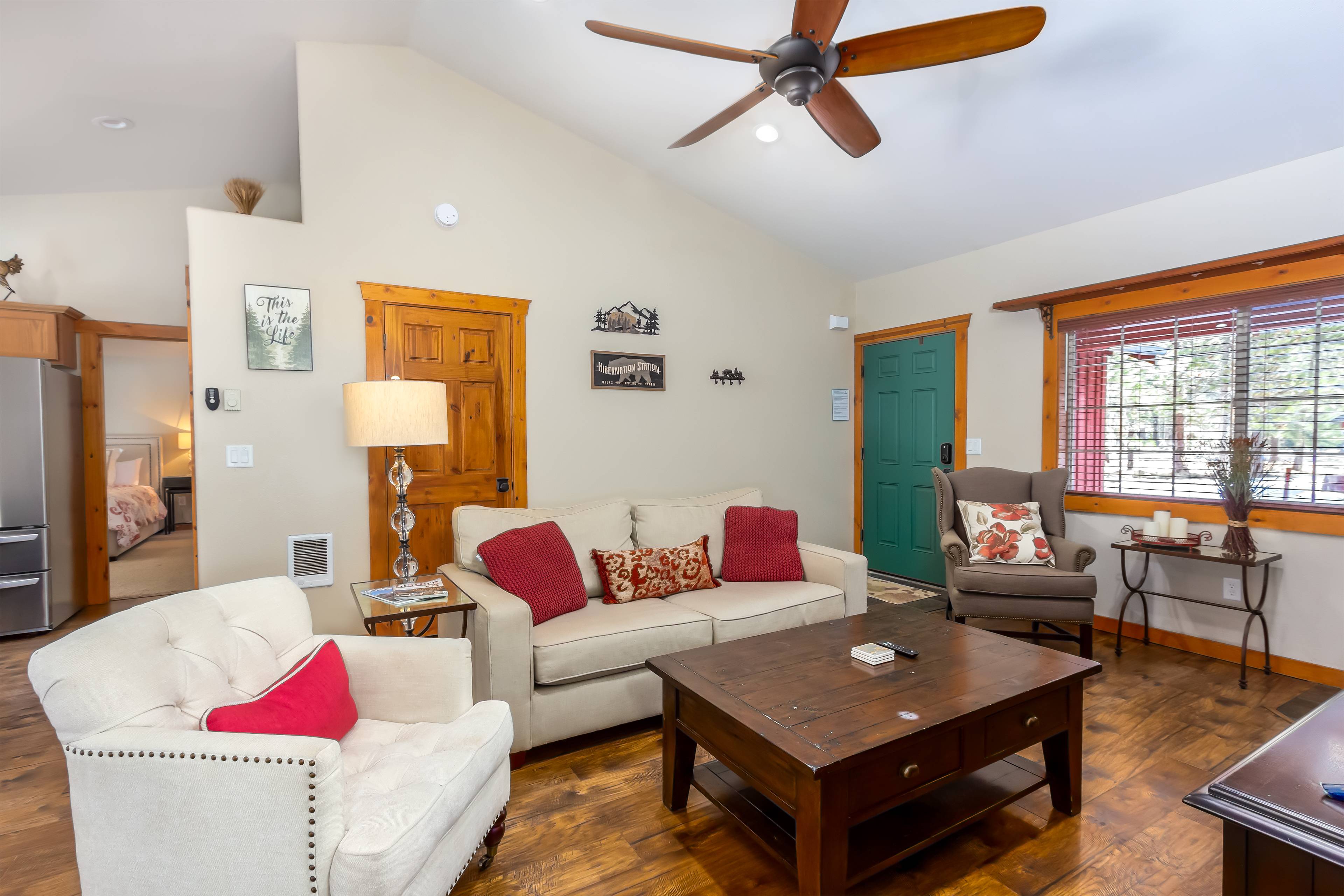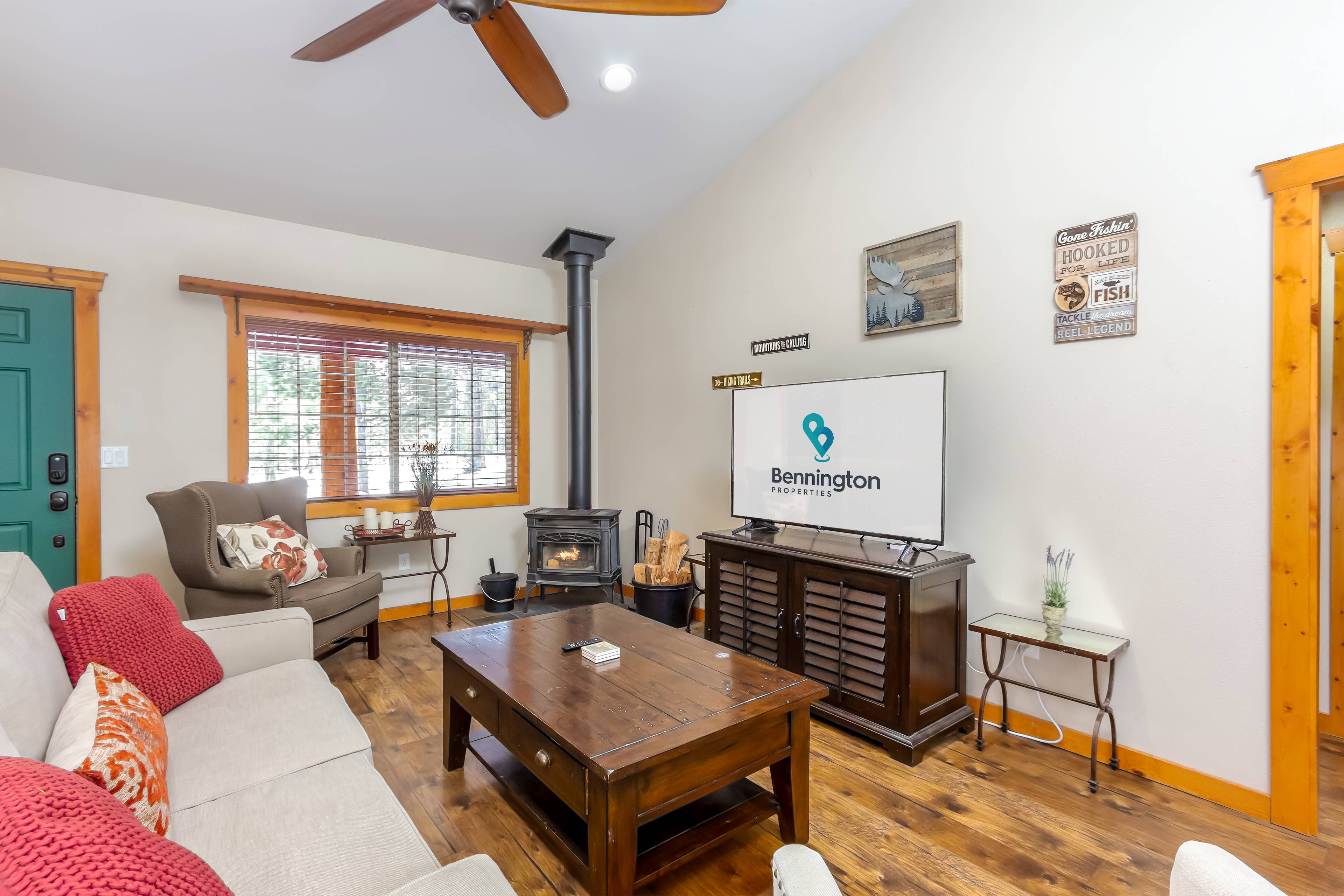 The living area features a smart TV and free-standing wood burning fireplace on those cool Central Oregon evenings.
