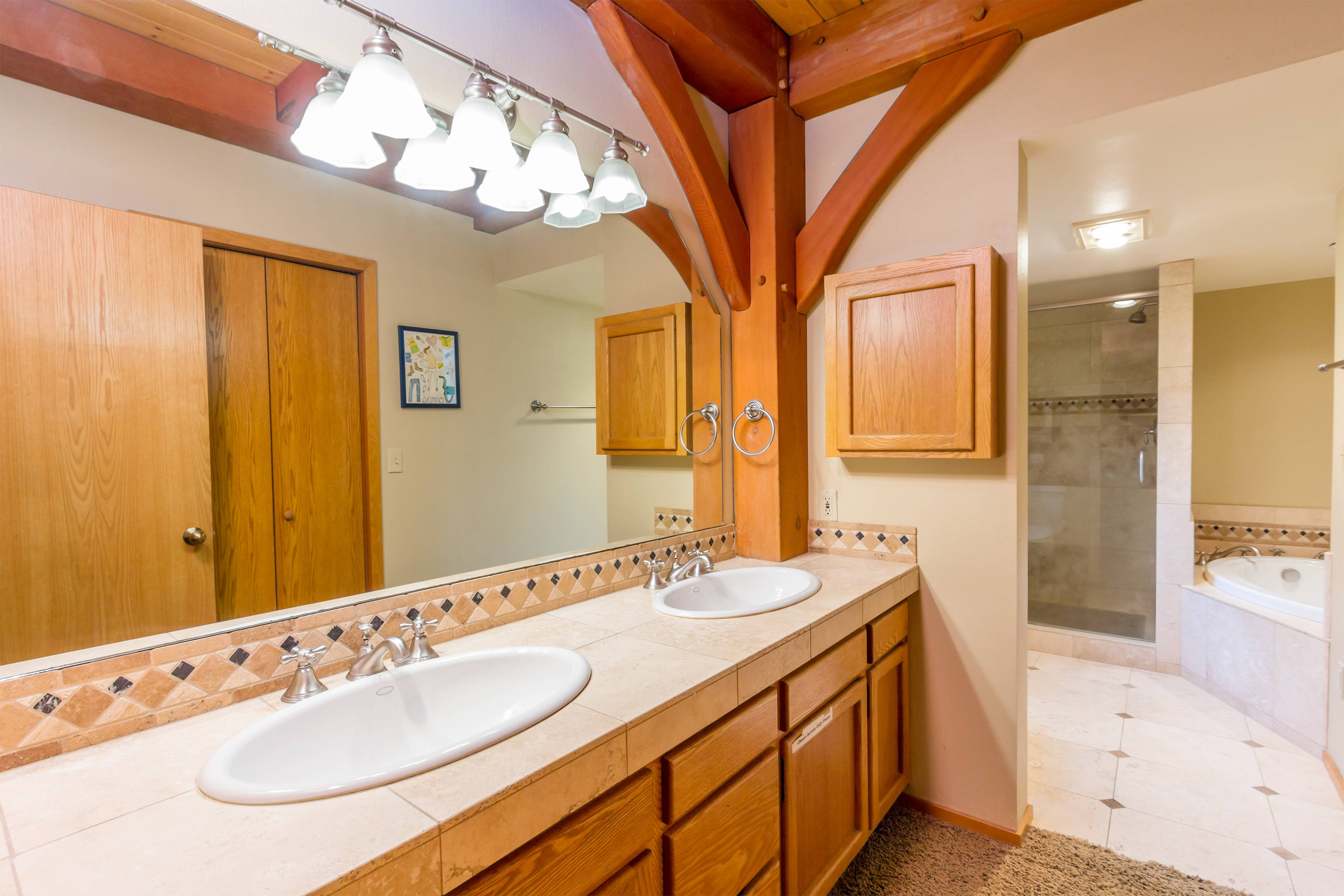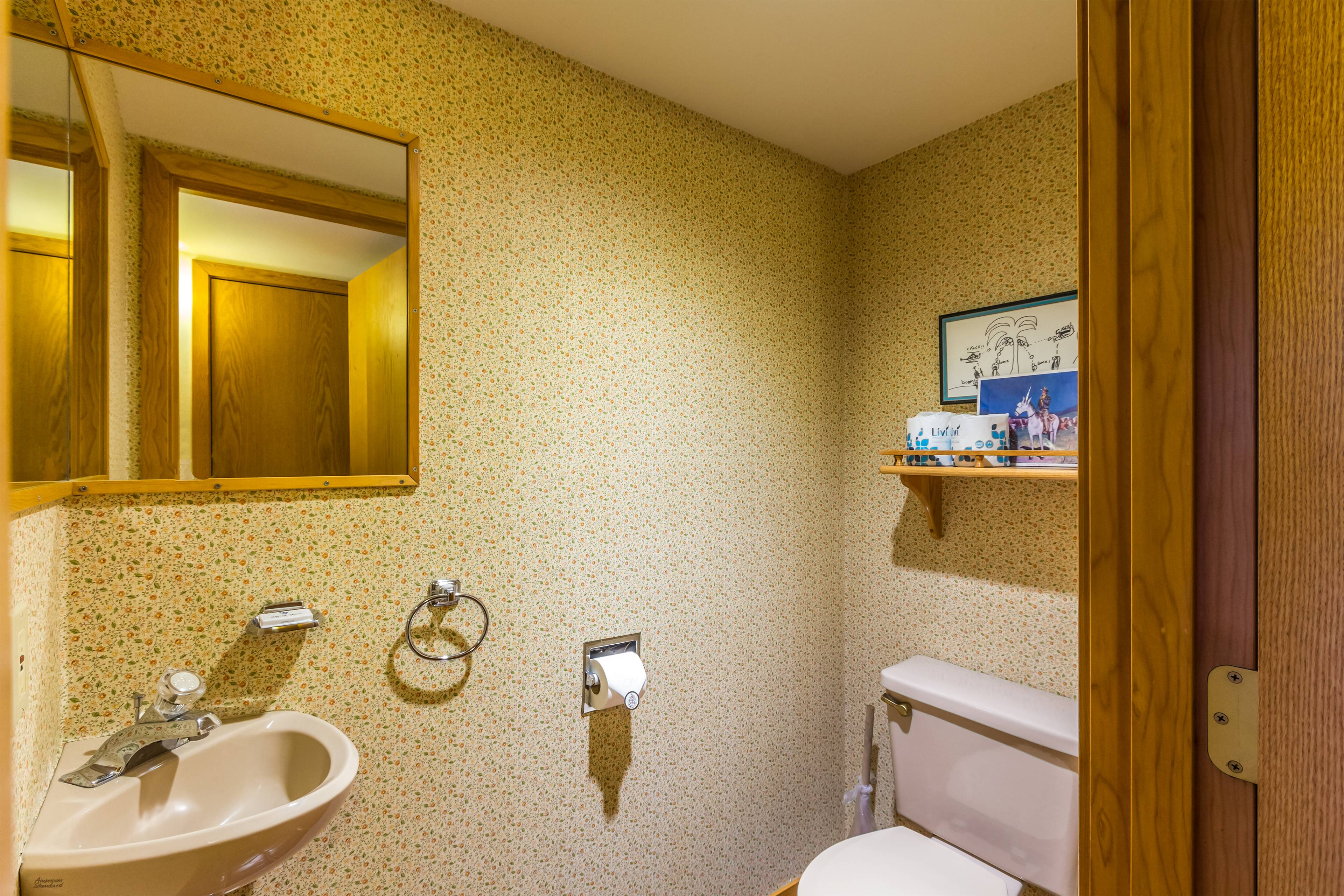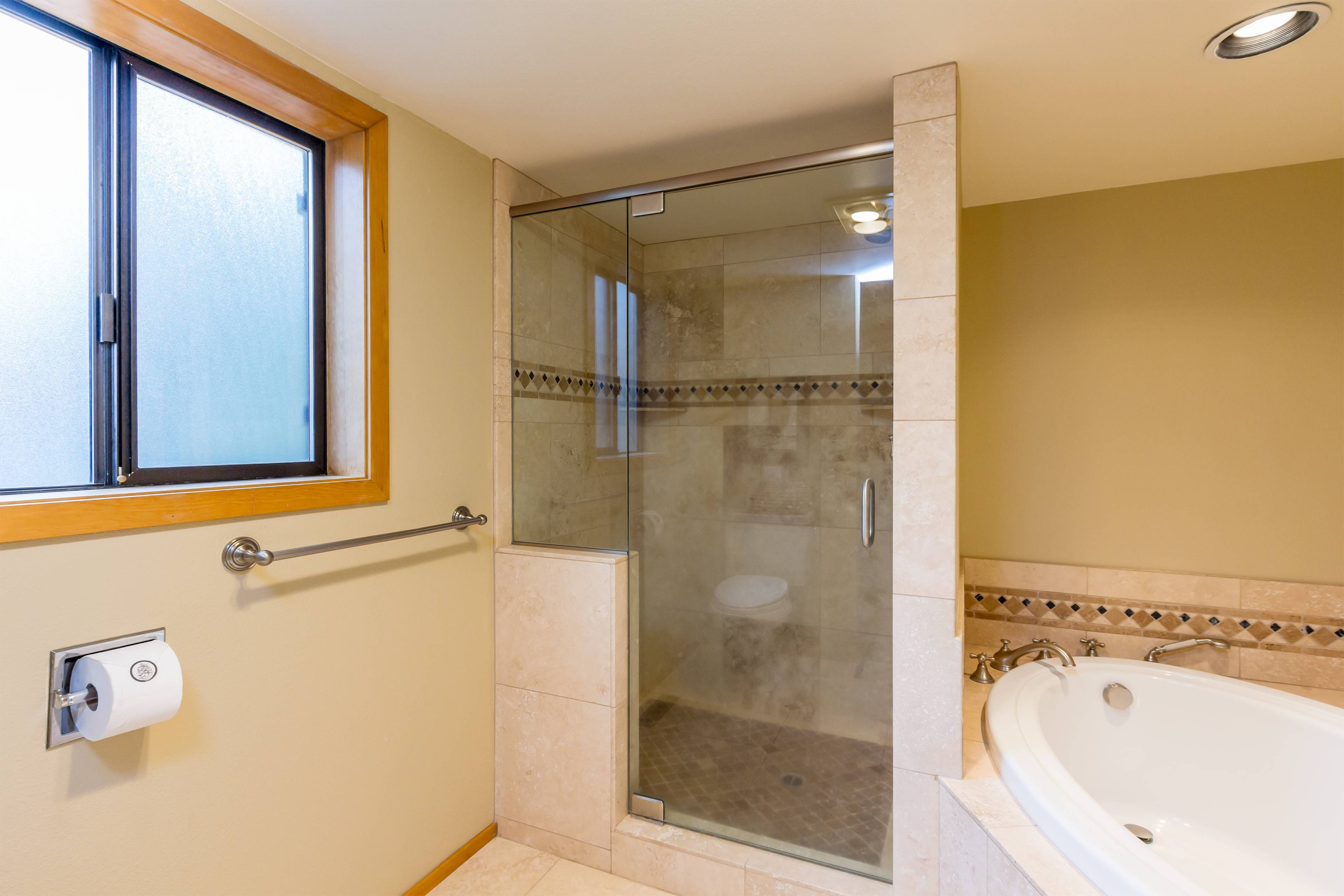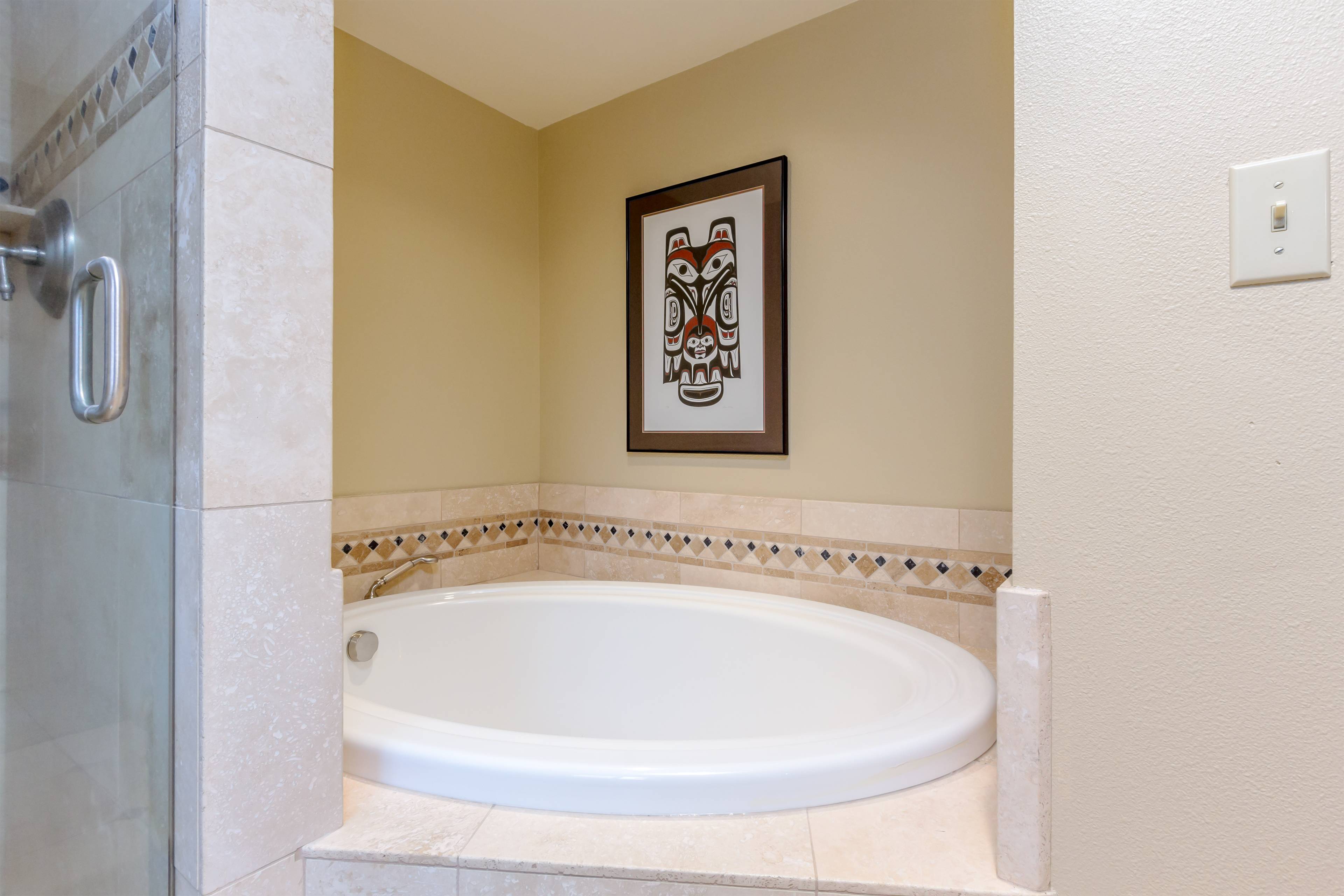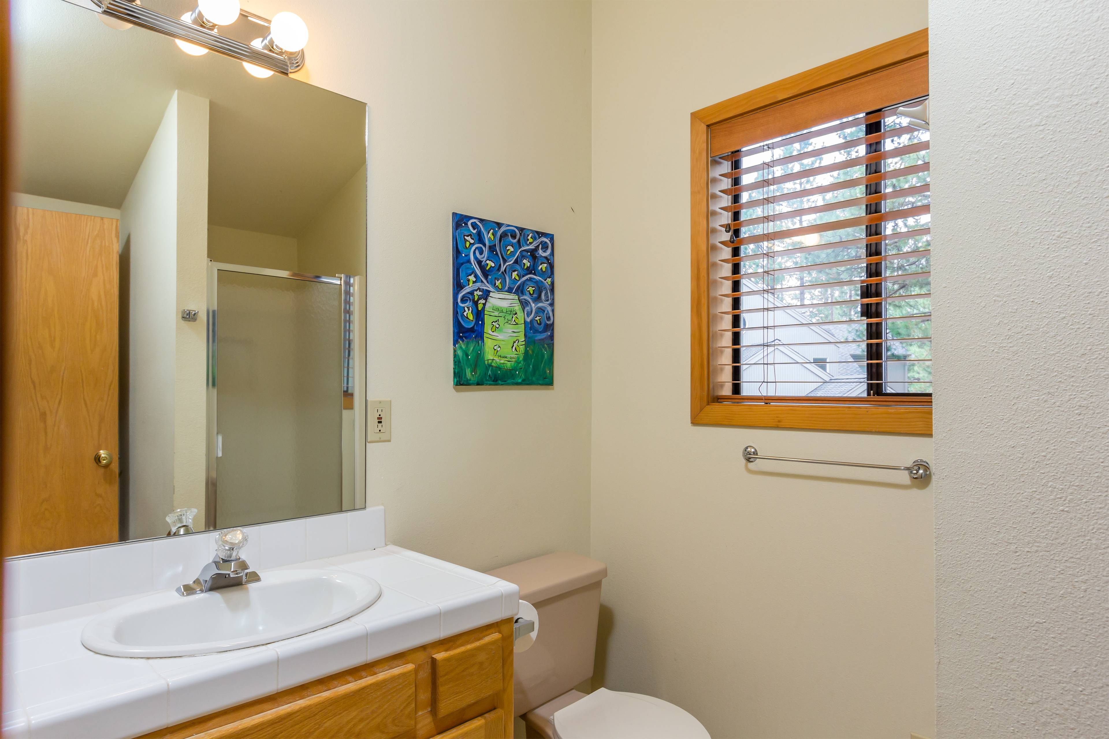 Just beyond, the primary suite offers a King bed, TV, and an attached bath—dual sinks, a walk-in shower, and a deep soaking tub where you can melt away the day’s adventures. A half bath sits conveniently off the entry.