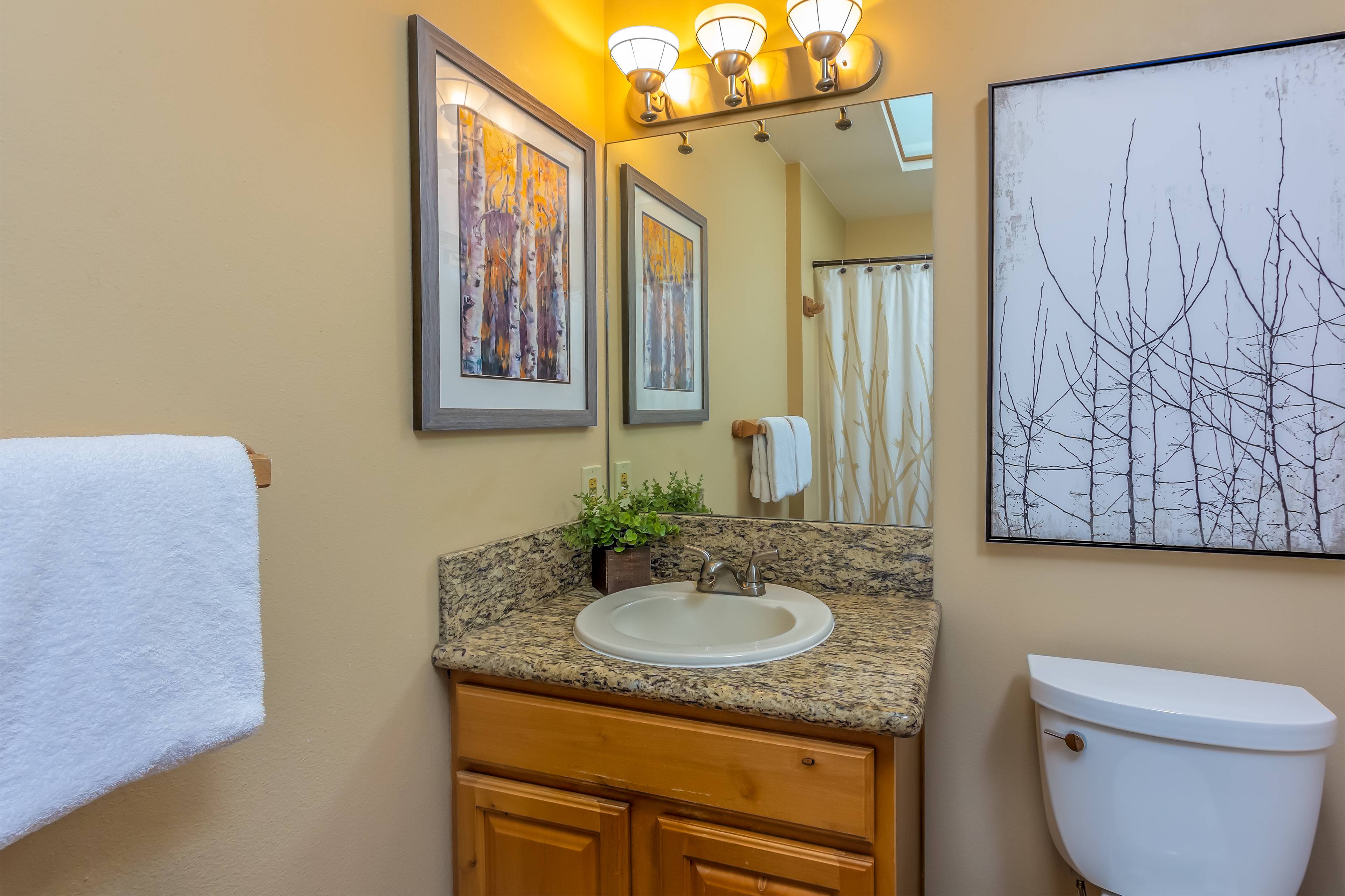 The main level invites gathering with its open living area, complete with cozy leather seating, a sleeper sofa, board games, and a gas fireplace framed by large windows. From here, step onto the deck for fresh mountain air or a soak in the hot tub. The adjacent dining room and kitchen provide everything needed to share meals and moments—granite counters, stainless appliances, induction cooktop, and a large dining table where stories are told long after the plates are cleared.