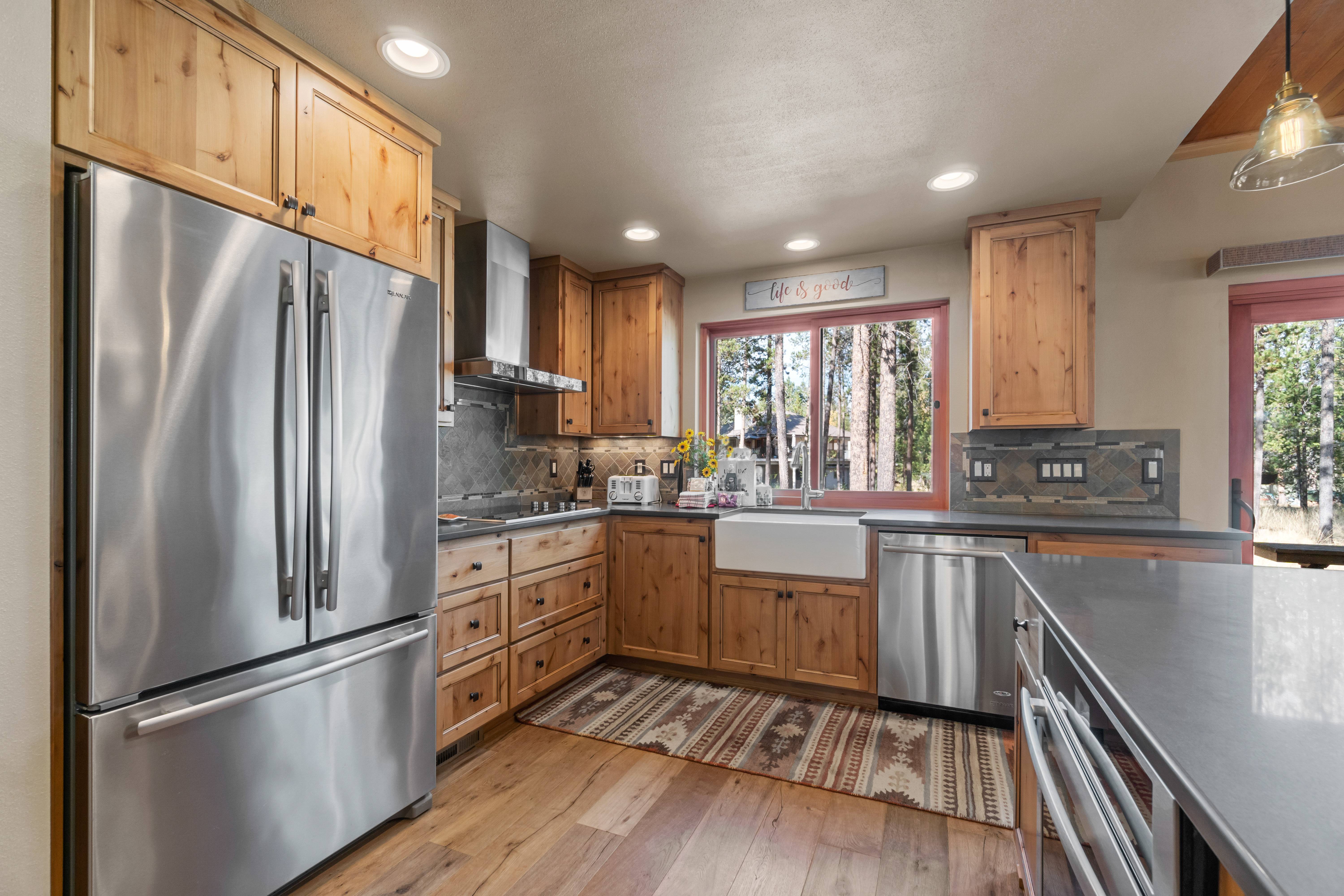 This spacious Sunriver home is the perfect getaway for your next Sunriver vacation. As you enter the home you will notice the gorgeous wood ceilings, hardwood floors, cozy furnishings, cable TV, DVD player and gas fireplace in the open concept living space. The recently updated kitchen features quartz countertops, a farmhouse sink, breakfast bar, stainless steel appliances, custom cabinets, and a wet bar. Adjacent to the kitchen is the dining room with seating for 6, plus 2 at the breakfast bar.