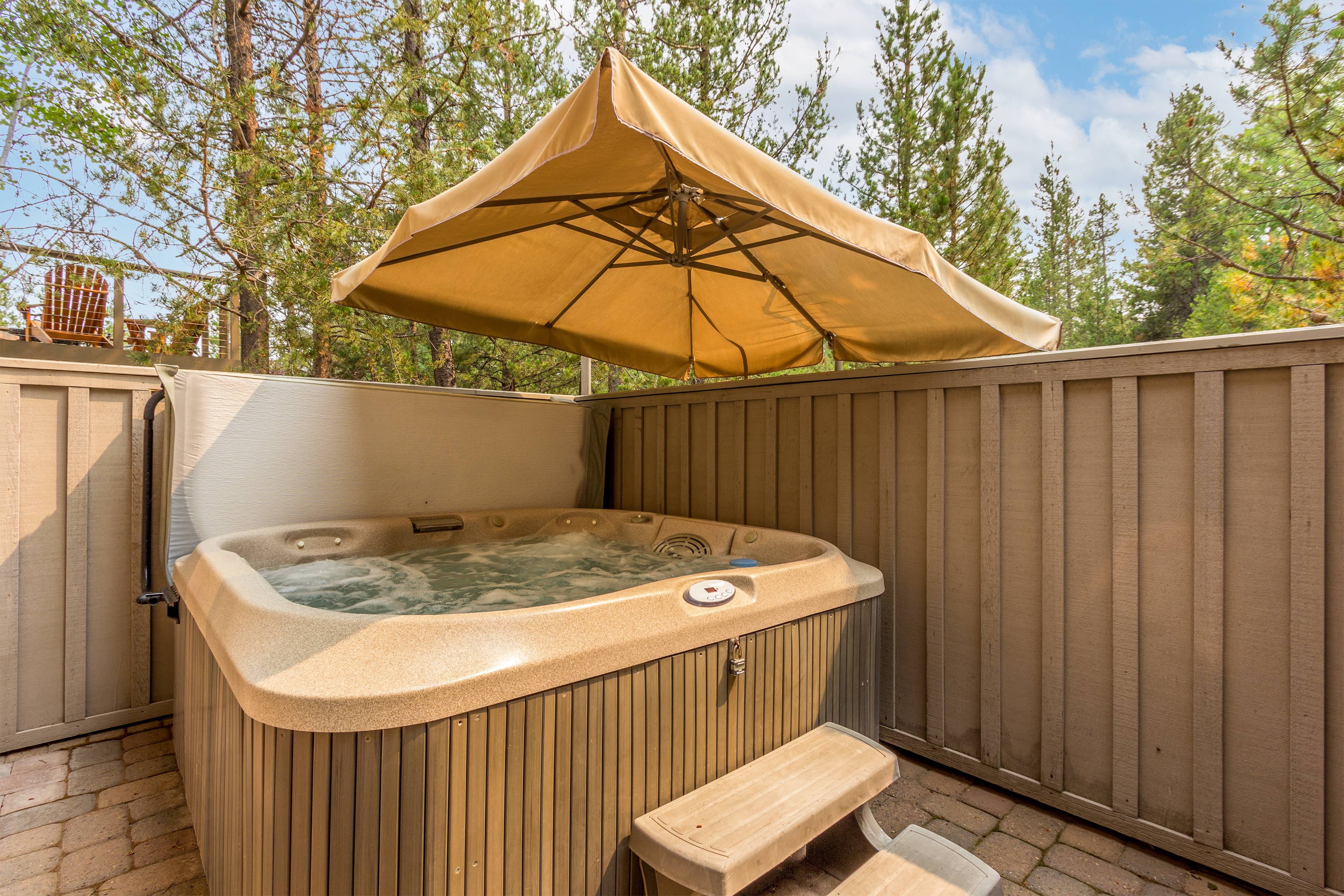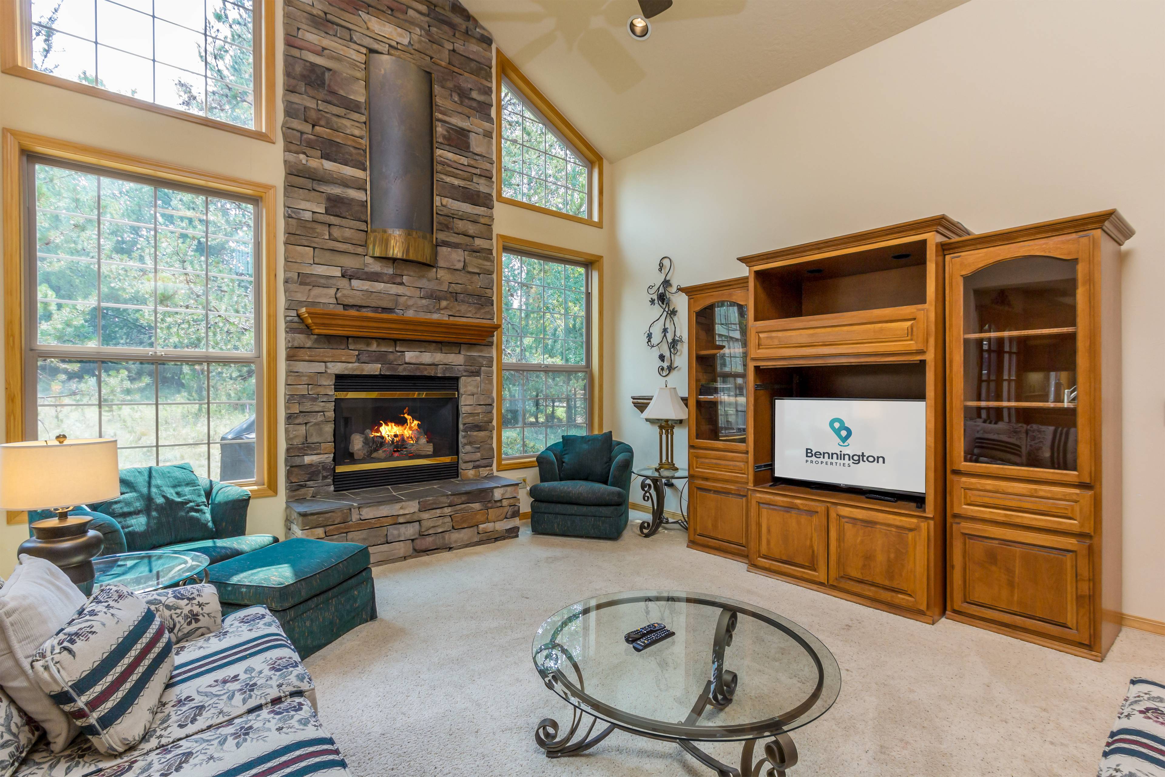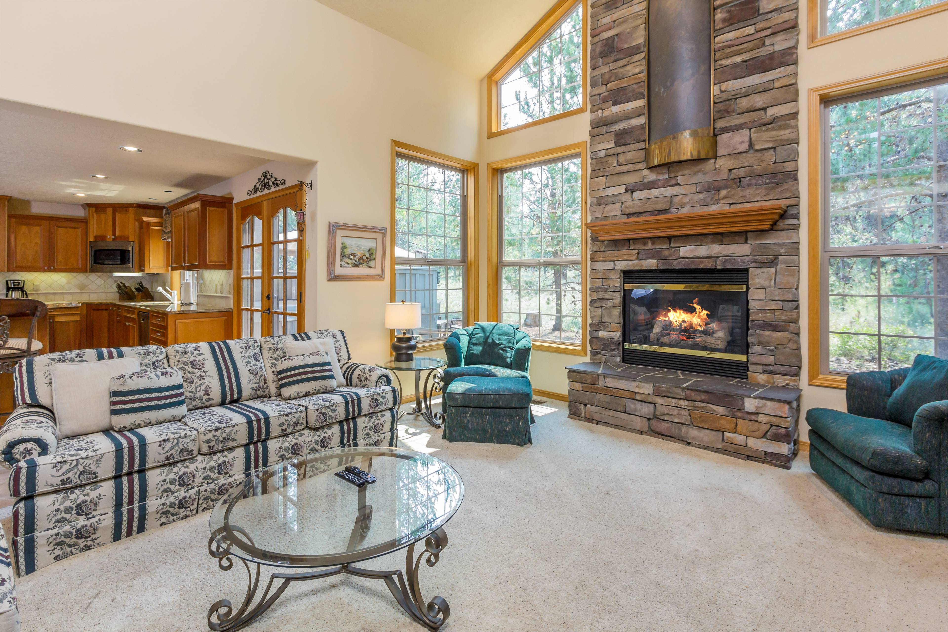 This centrally located Sunriver home is bright and cheery and the spacious floor plan is perfect for gathering the family. The living room boasts comfortable seating, a flat screen TV, and gas fireplace. The kitchen is well stocked, including a gas stove and bar seating. Step outside to find patio seating, a gas grill and private hot tub, surrounded by the forest.