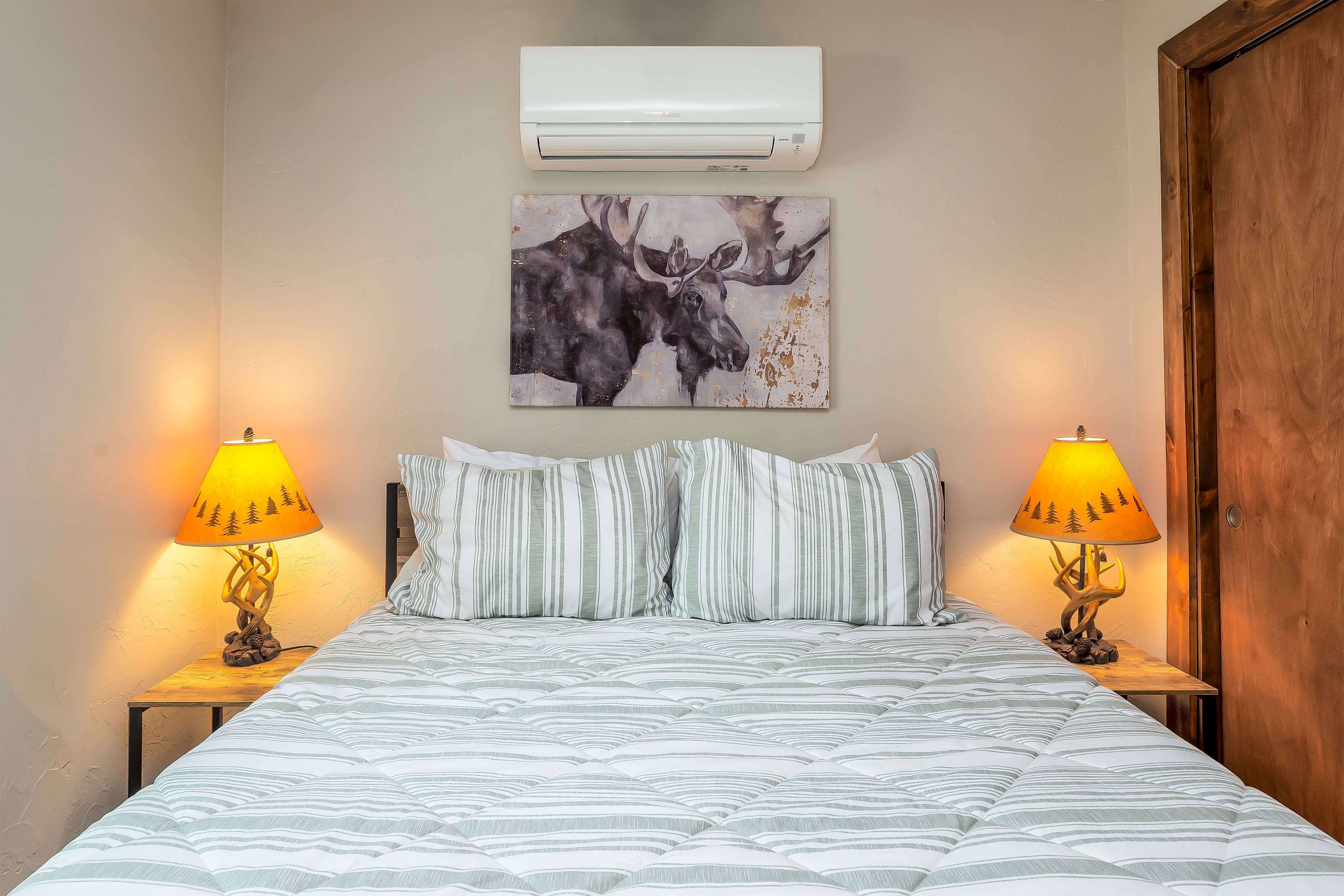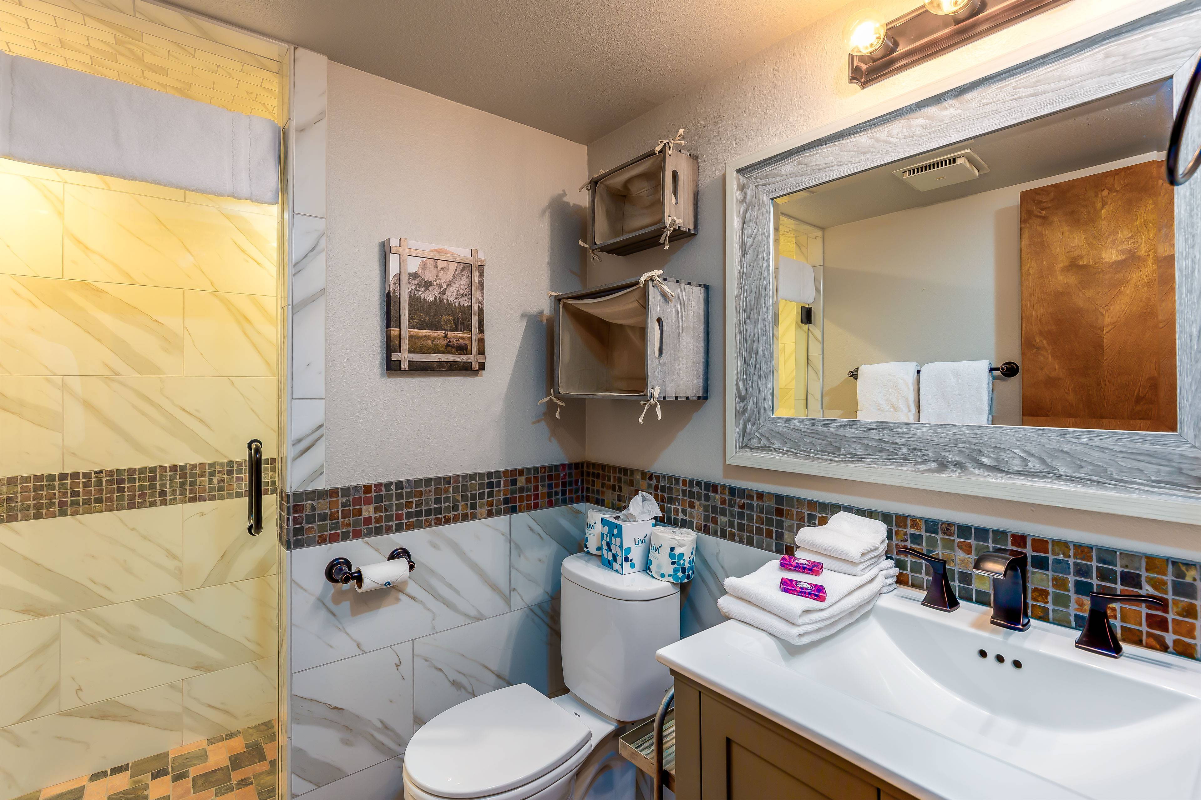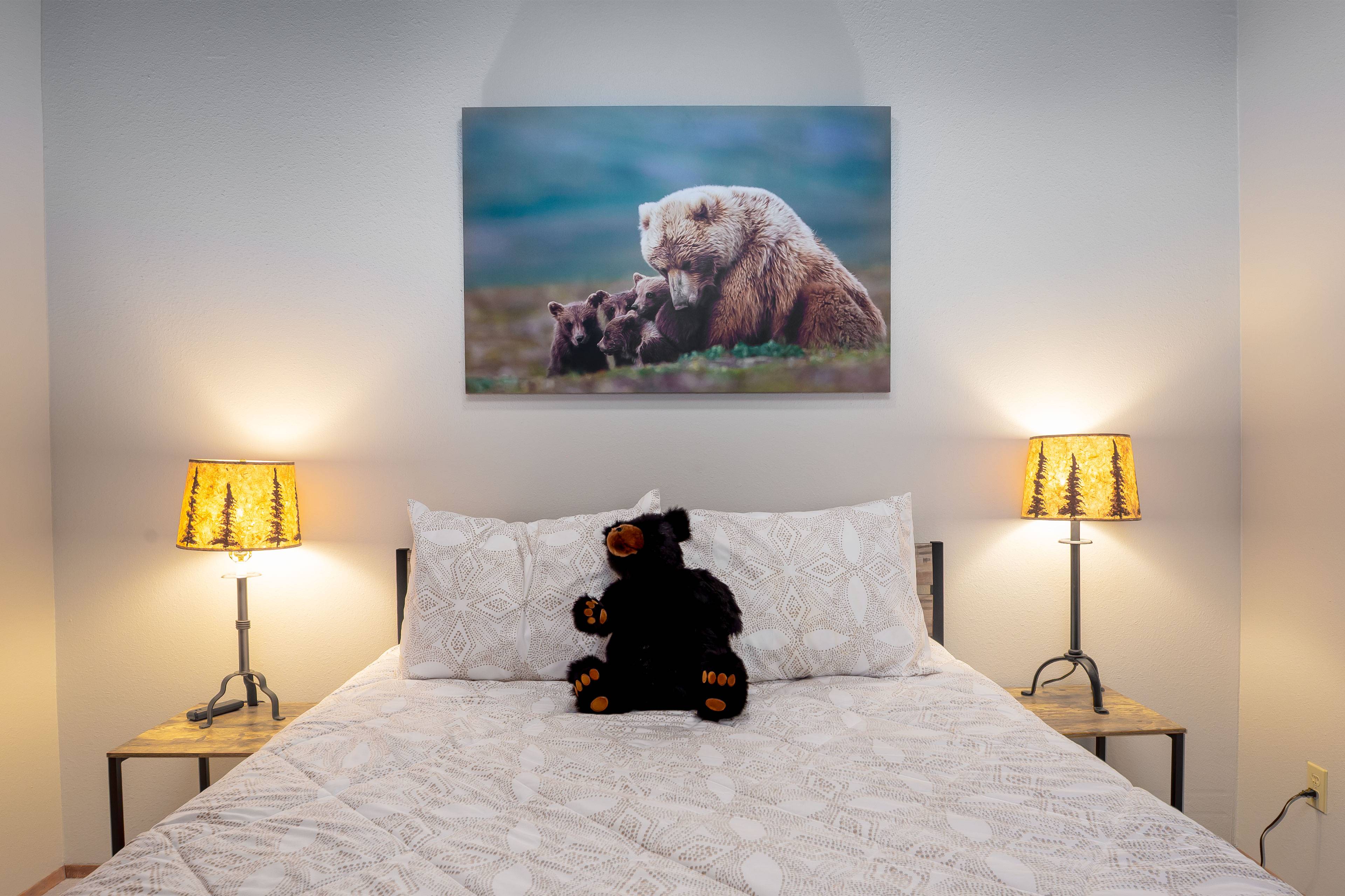 Timber 7 was a wonderful layout for our family with two bedrooms up front for the adults and an air conditioned bedroom in the back off the playroom for the kids. This allowed for a quiet space for naps and nighttime, so the adults could play games at the spacious dinning table without disturbing the kids. The front two bedrooms did not have air, but with the windows open at night and the ceiling fans we were able to cool it off for sleeping, until the forest fire hit and it was to smoky to have the windows open. Thank goodness that was for only one night for us. There is a large deck in the back with ample room to sit. The house backs up to the train track, with trains going by 2-4 times during the day, which the kids loved to watch. We did have several nights where 1-3 trains went by, then we had one night that there were not any. The location was great, close to Fort Rock Park, the SHARC (which 8 passes were provided) and the Village, which was an easy bike ride for the 6 year old.