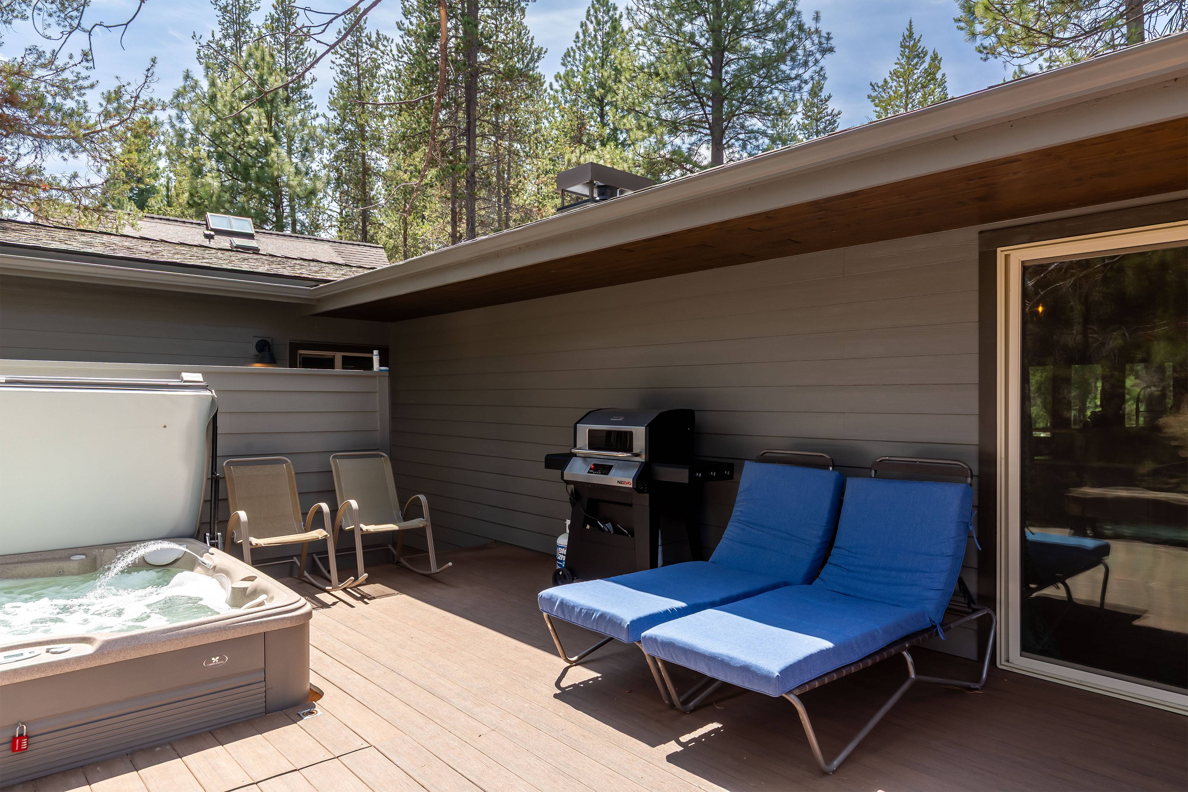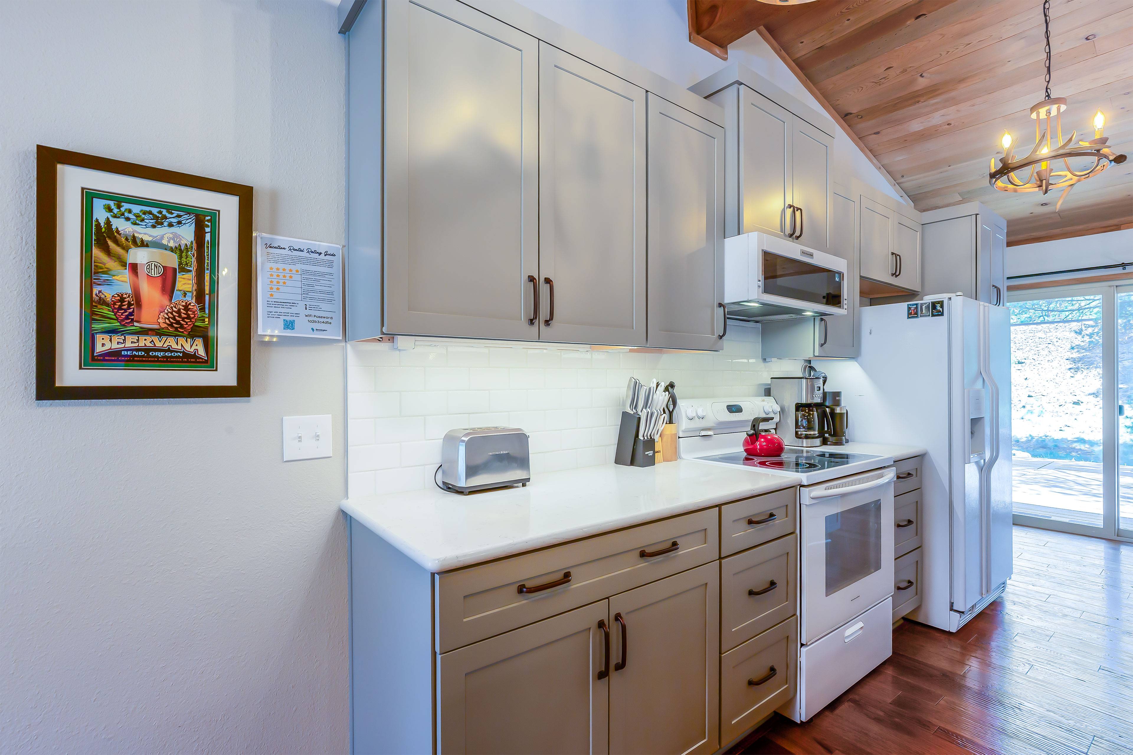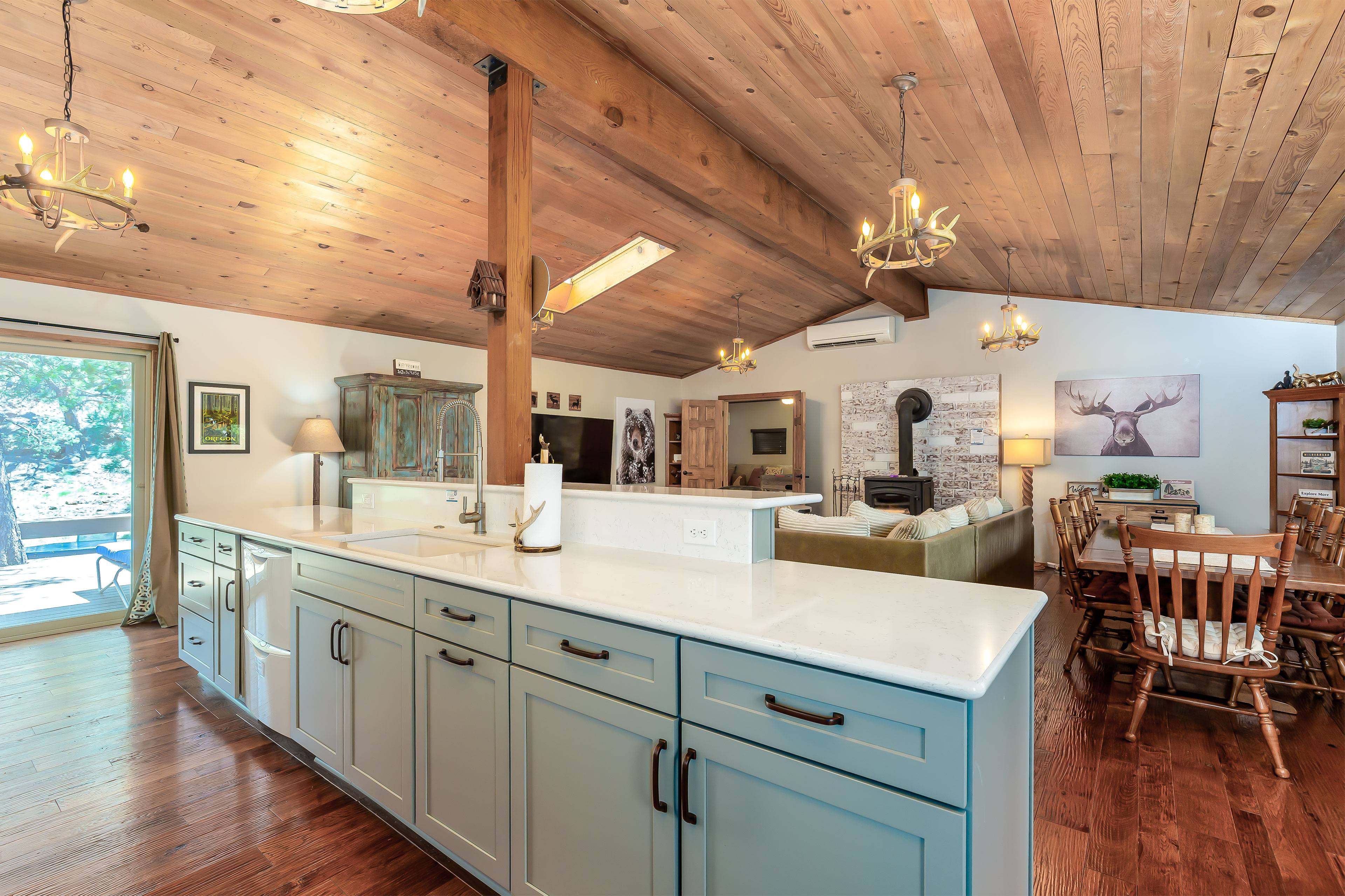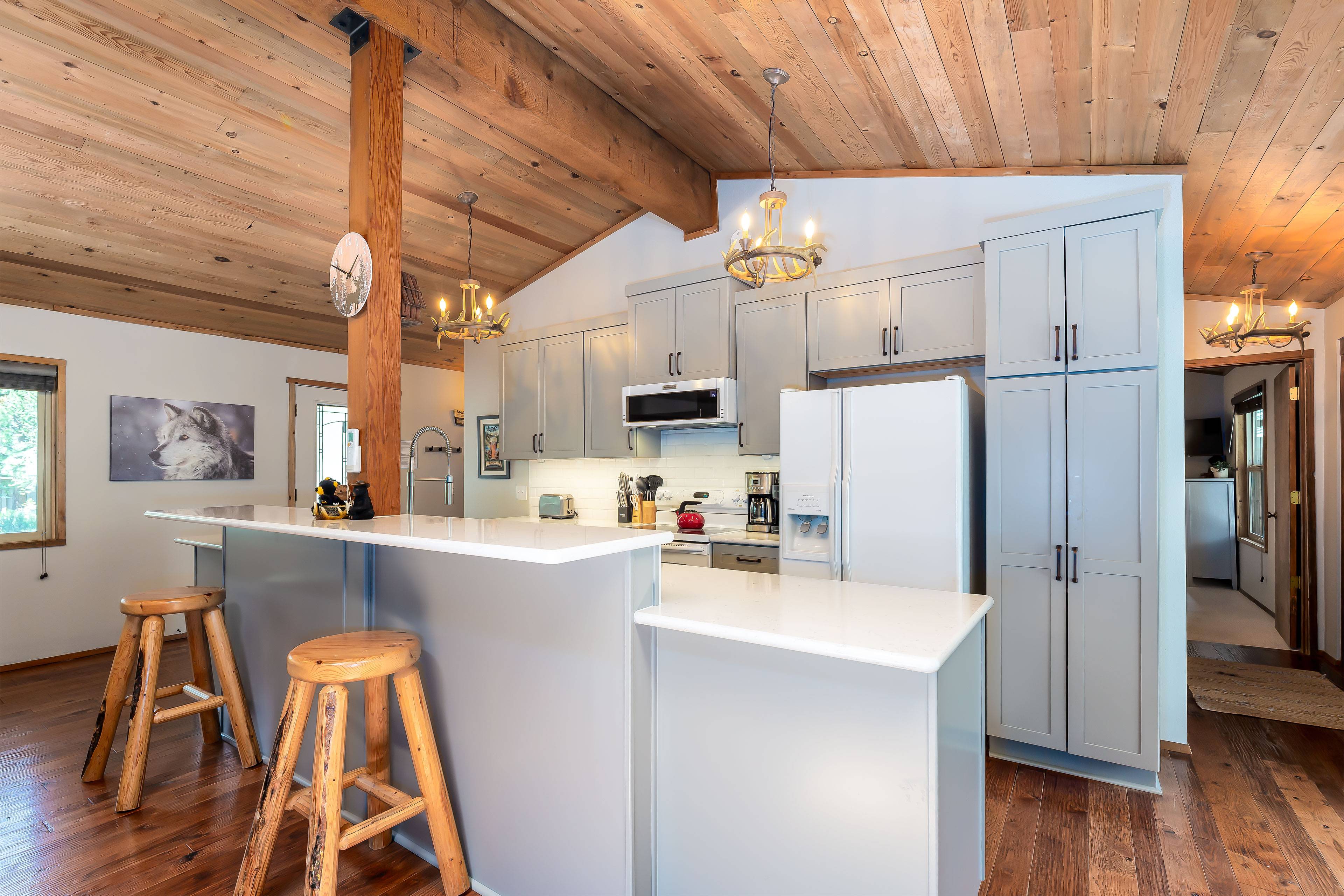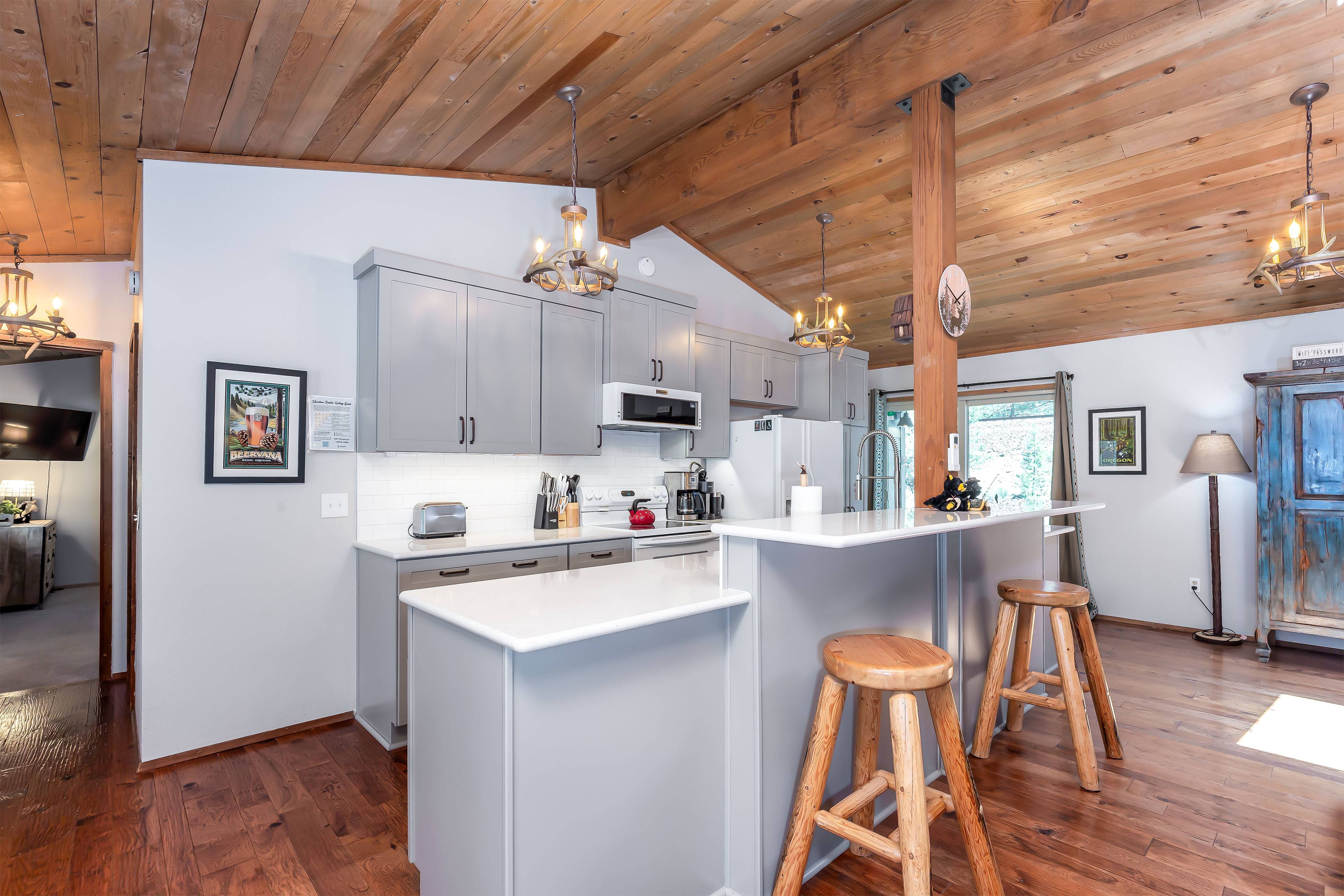 The living room features a 75" Smart TV, wood-burning stove, cozy furnishings and has access to the back deck area with a private hot tub and gas BBQ grill. In the updated kitchen you'll find everything you need to make any budding chef feel right at home. The ample countertops allow space to whip up your favorite meals. Adjacent to the kitchen is the dining room with seating for 8 plus two more at the breakfast bar.