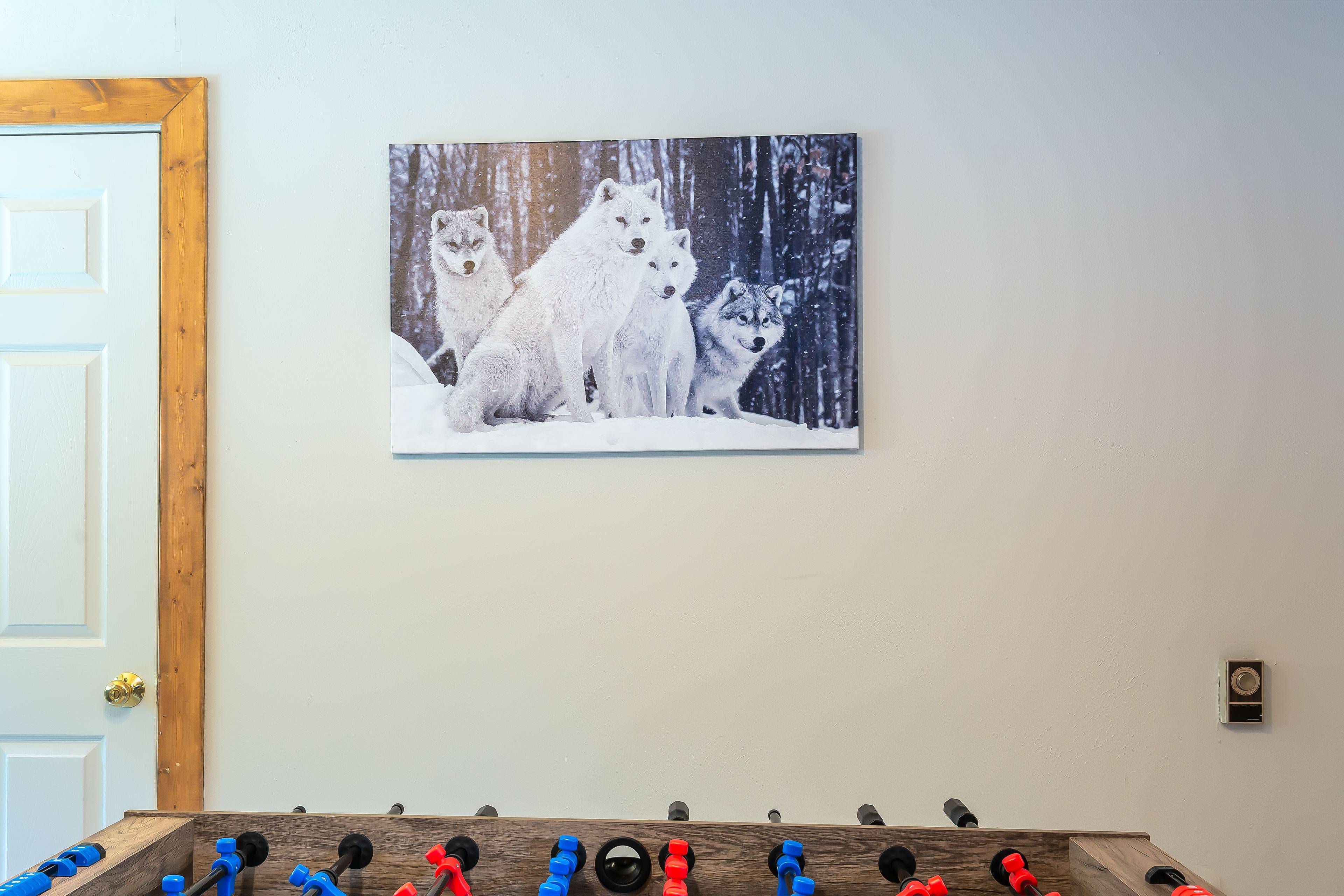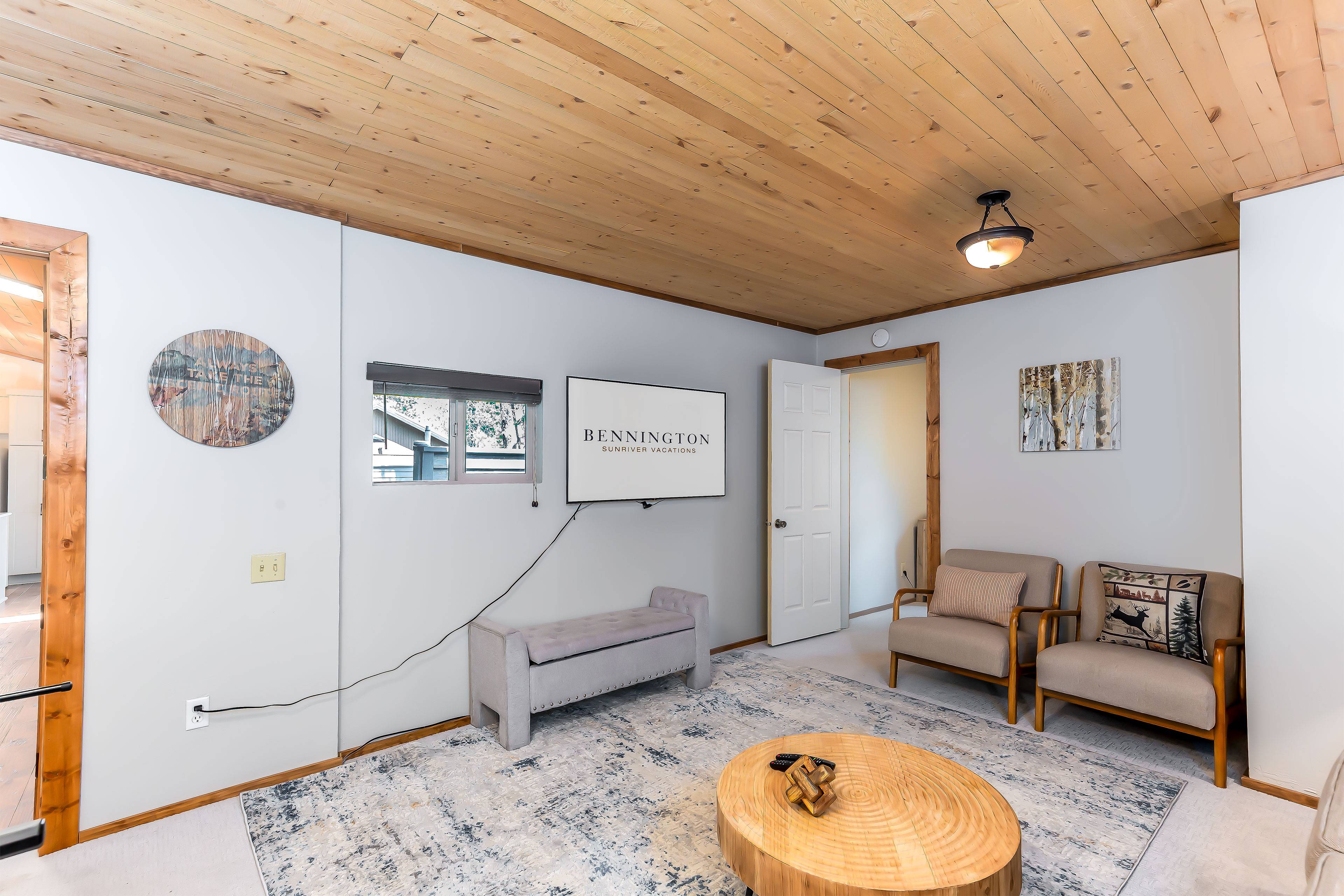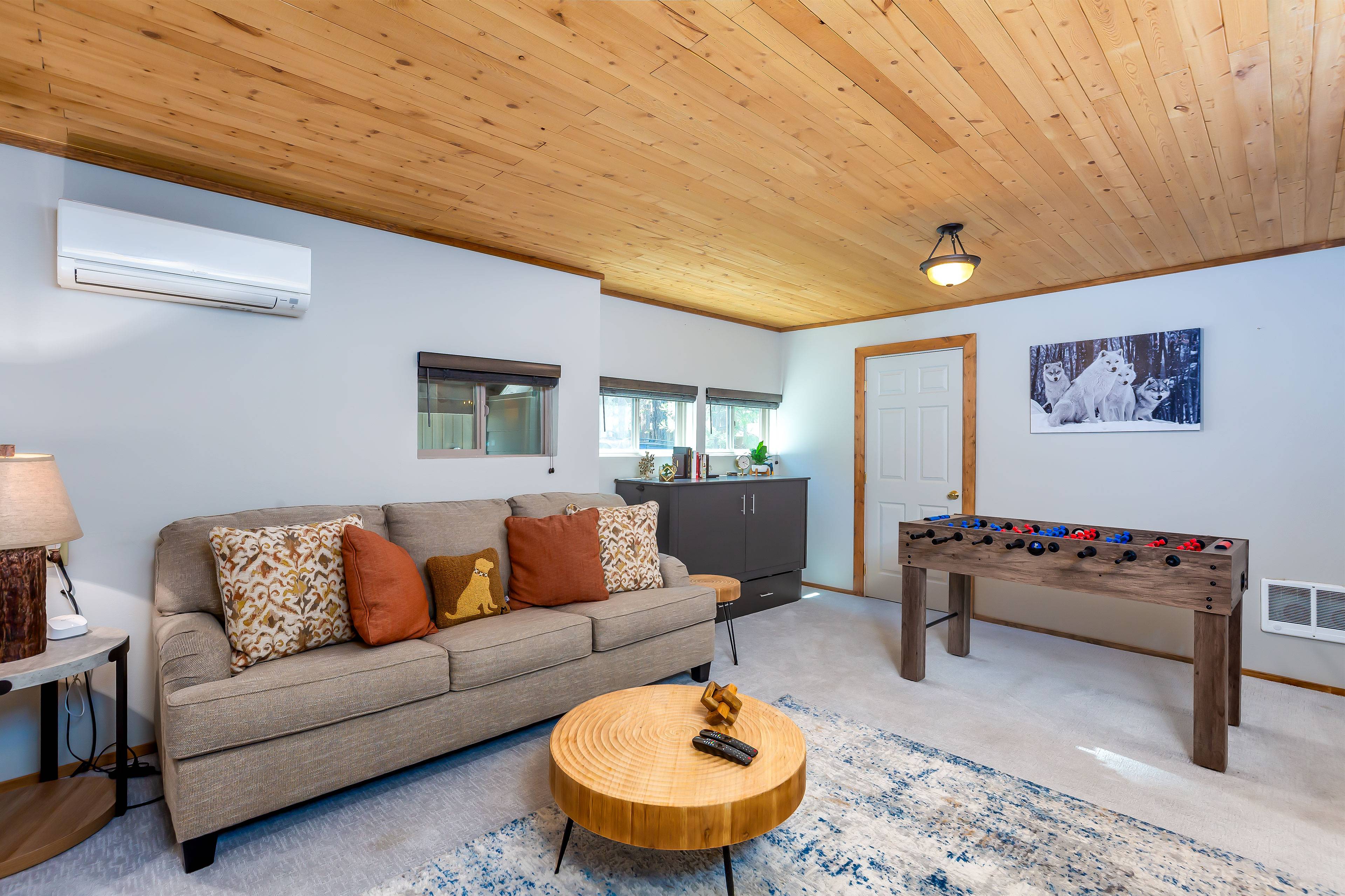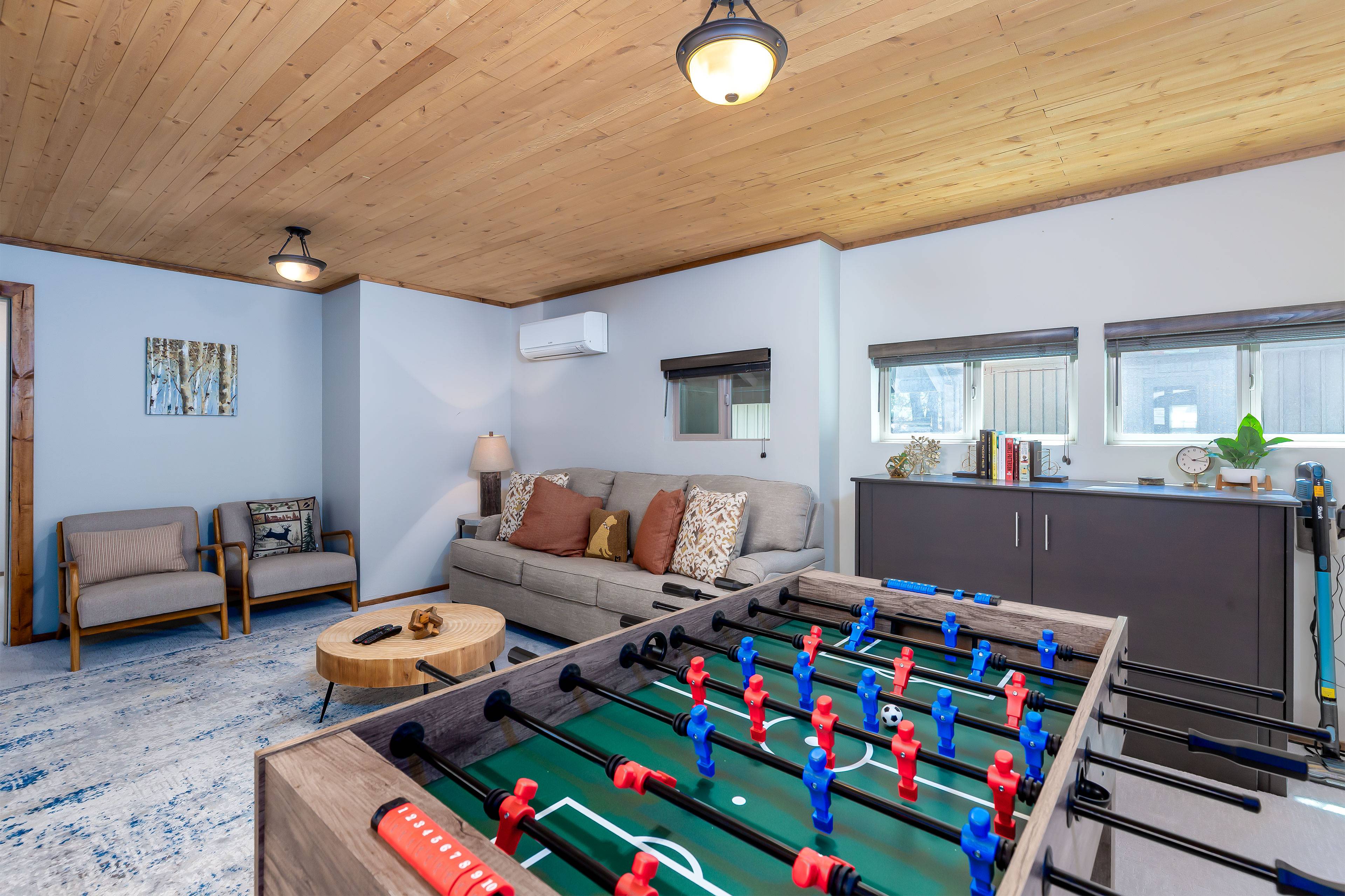 Off the living room is a bonus area with a 55" Smart TV, a DVD player, Murphy bed, foosball table, and plenty of seating to gather around for movie night.