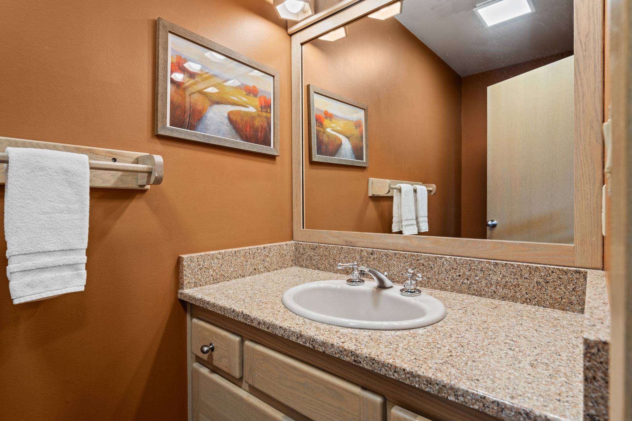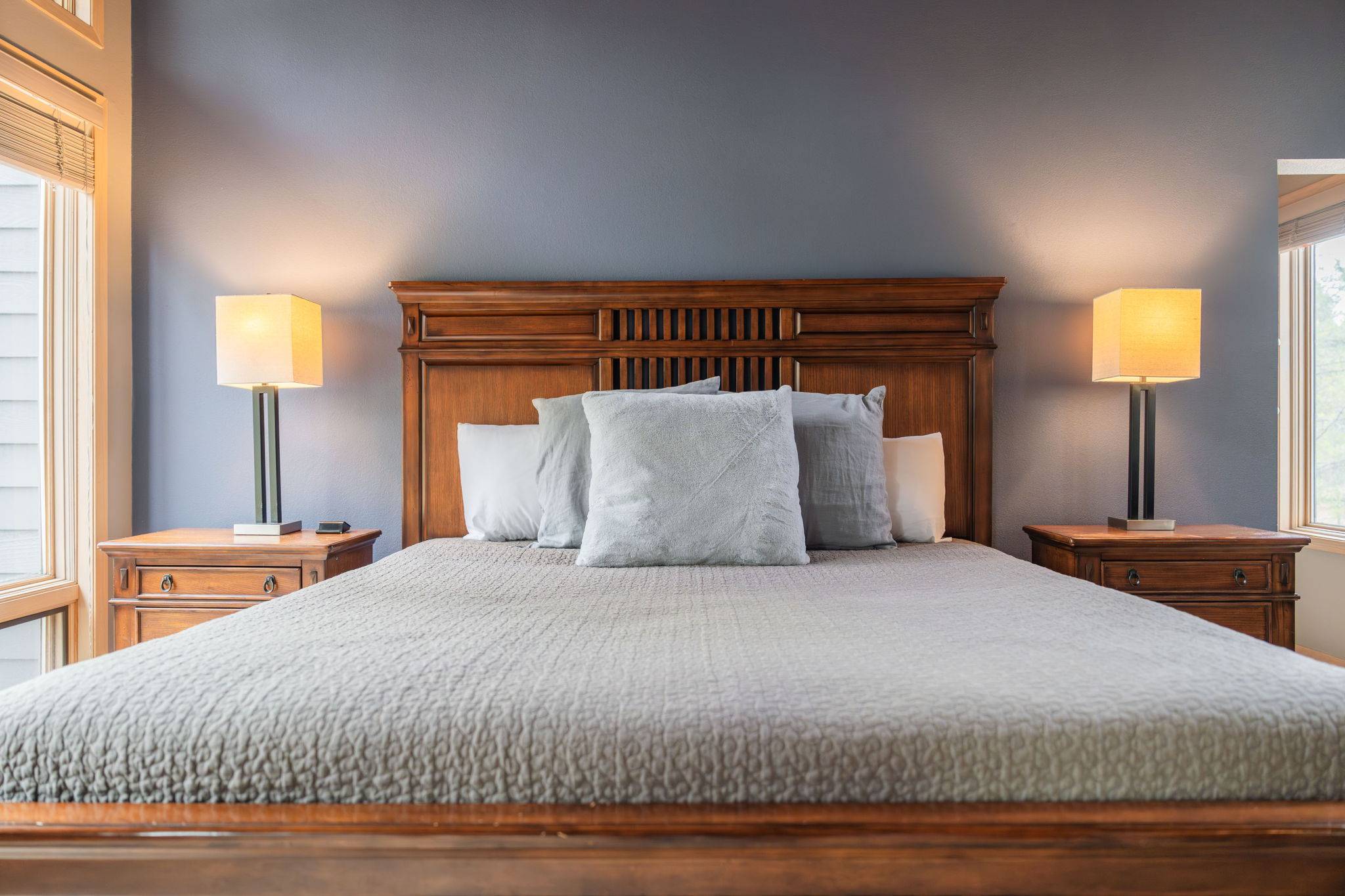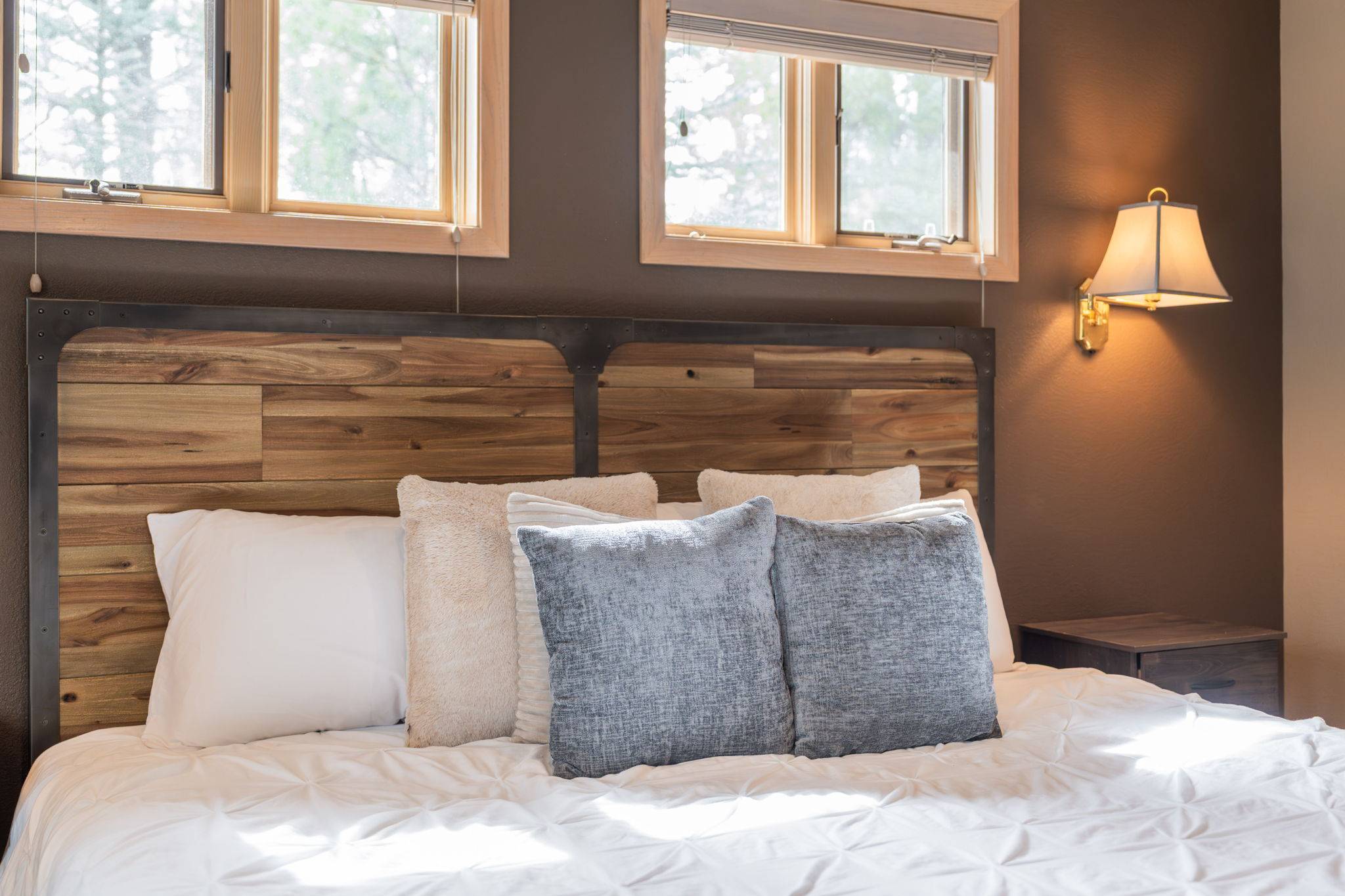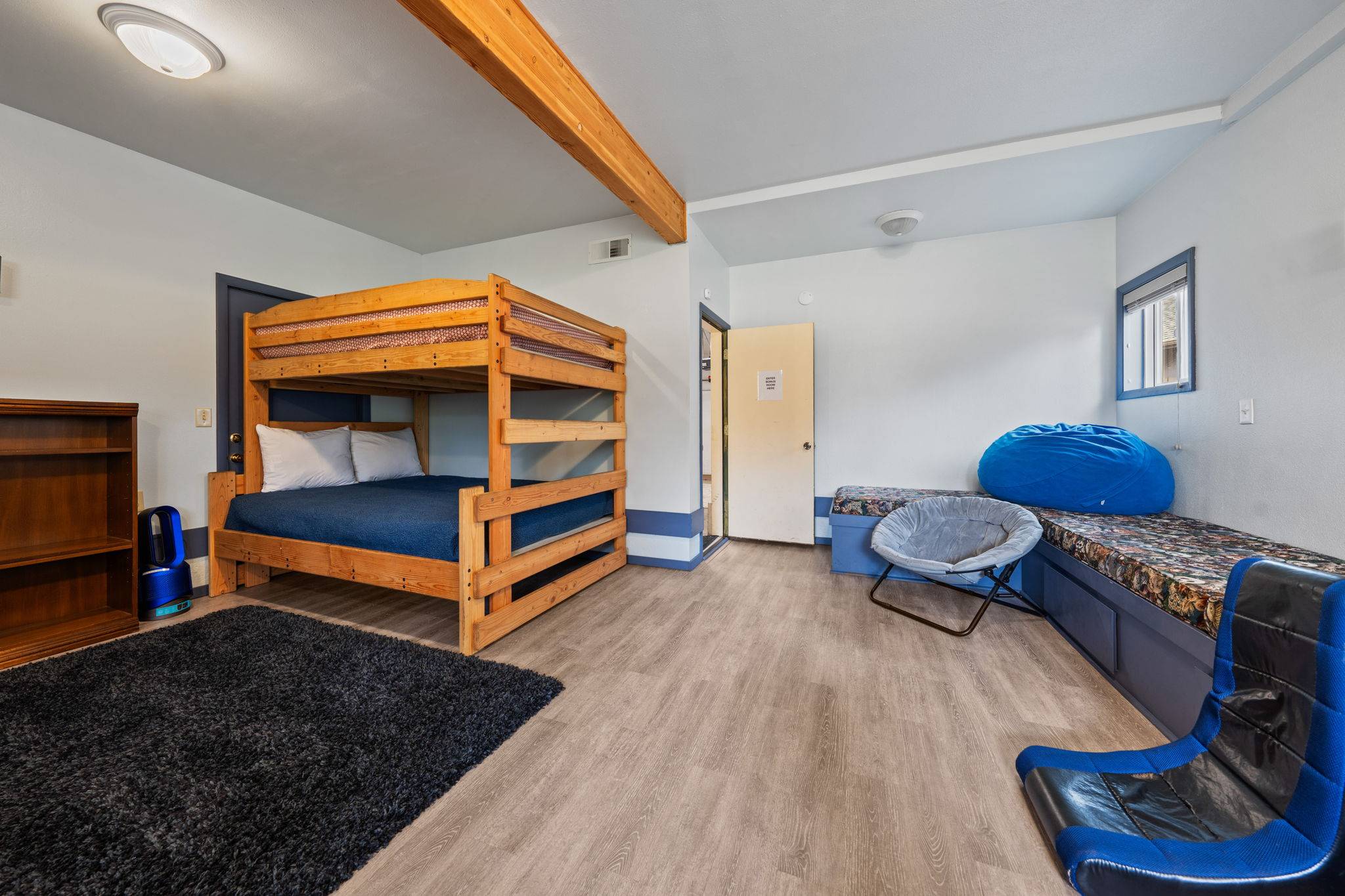 With a reverse-living layout, you'll find an ensuite king bedroom with a private bathroom on the main level, while the remaining three bedrooms are downstairs, providing privacy and comfort for everyone. Bedroom one features a king bed, bedroom two has a queen bed, and bedroom three holds a pyramid bunk bed. There is a bonus sleeping/office area with workspace and a futon off of the primary bedroom. Each bedroom is equipped with a TV.