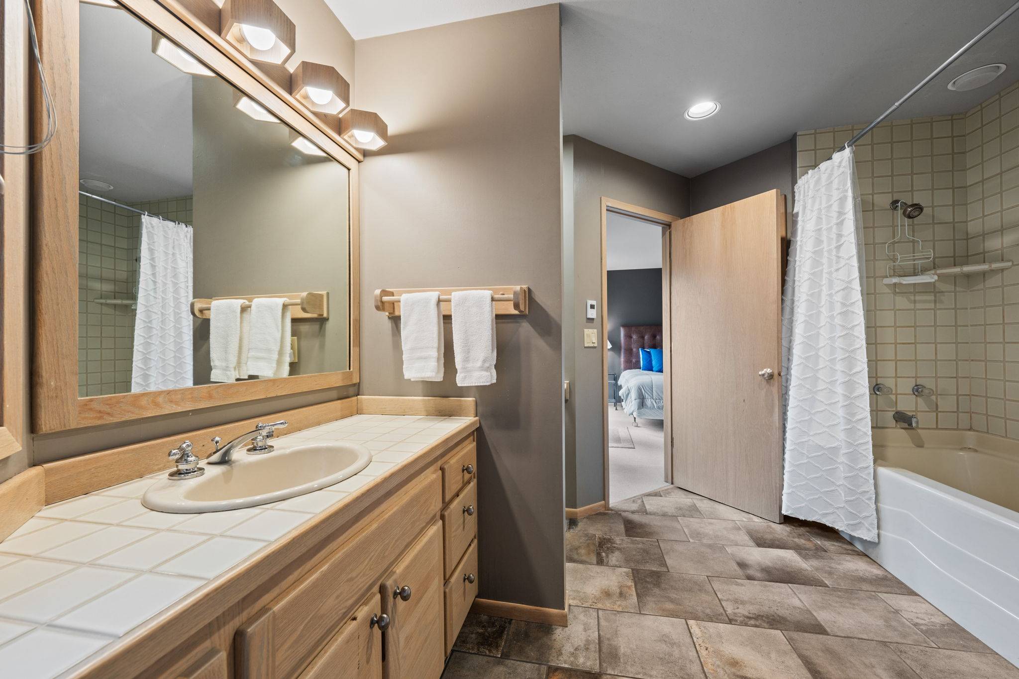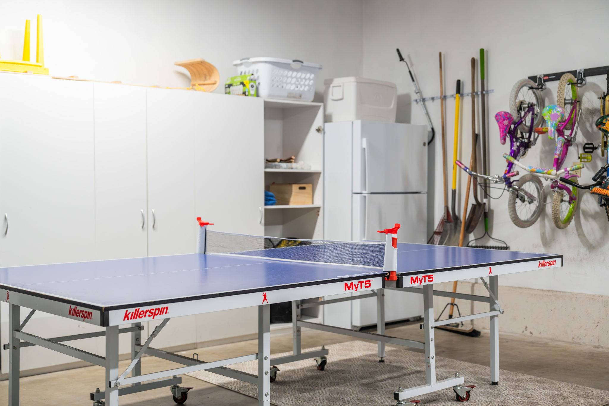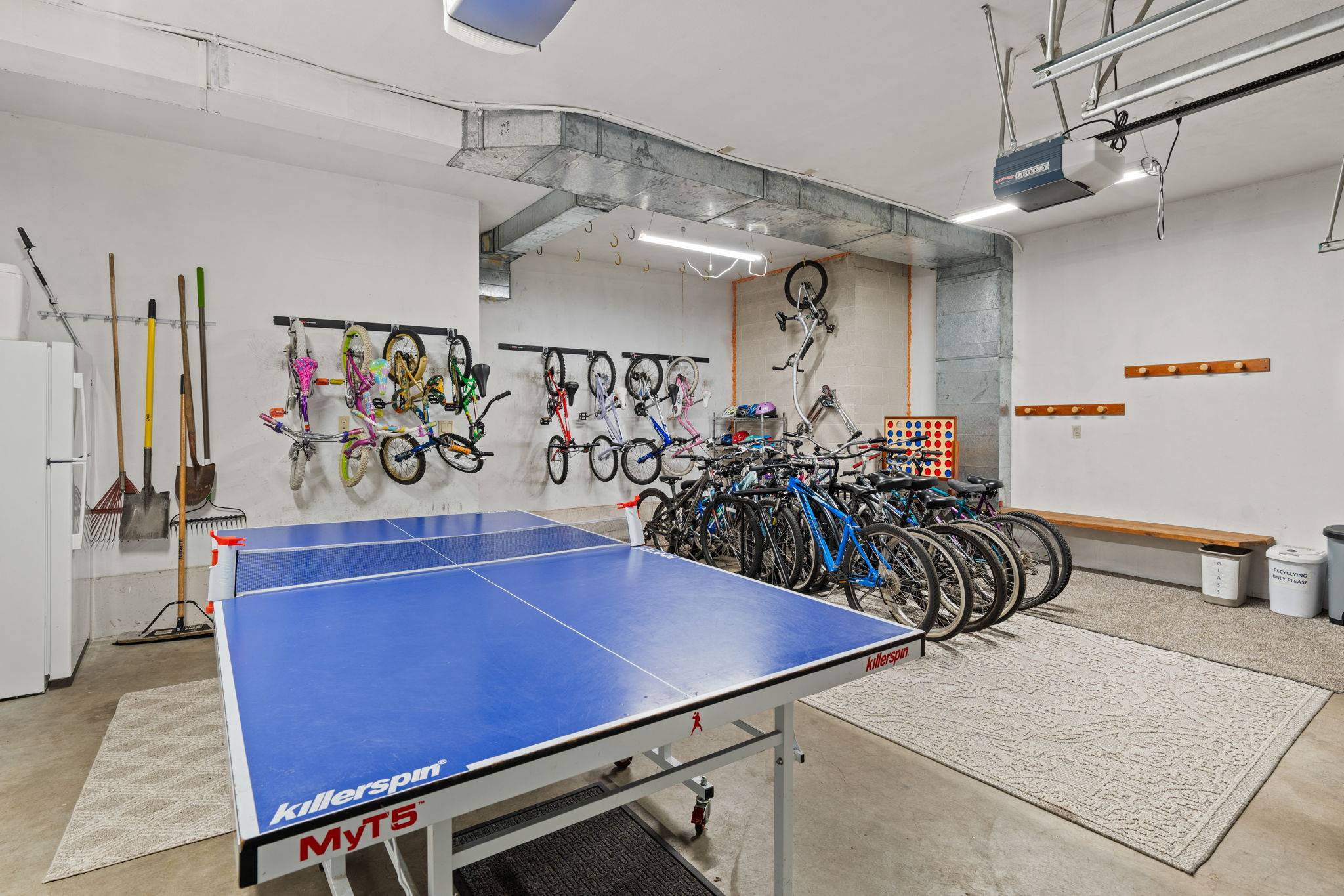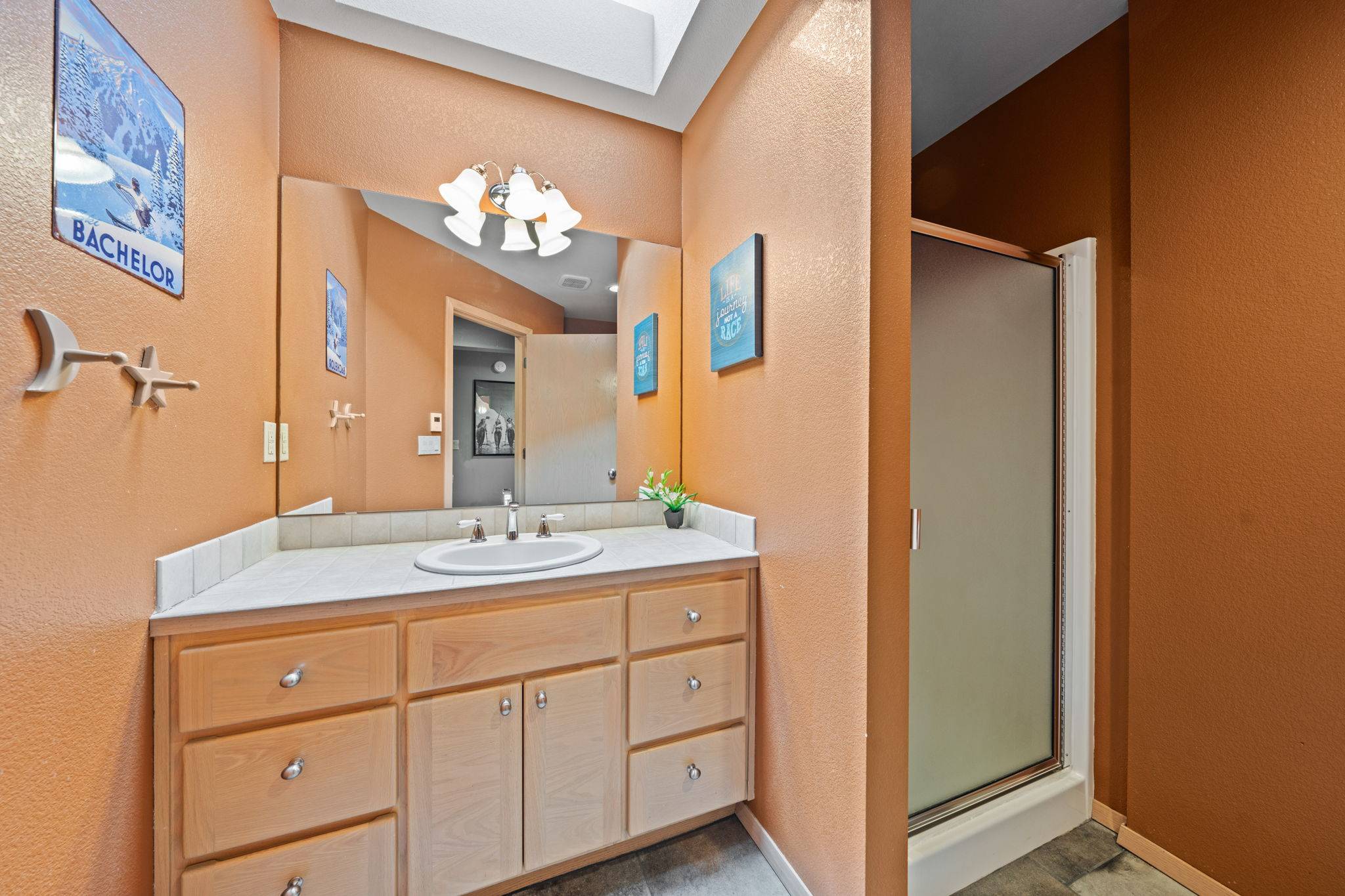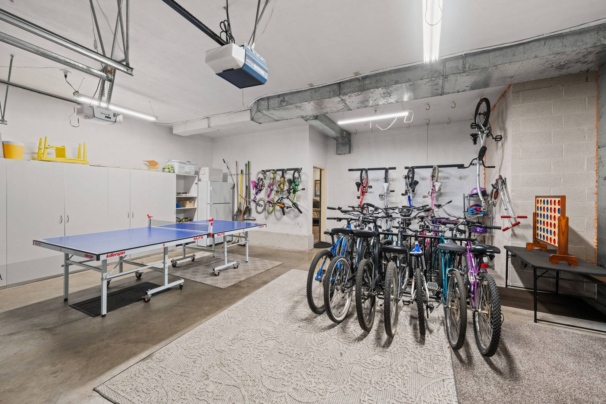 With a reverse-living layout, you'll find an ensuite king bedroom with a private bathroom on the main level, while the remaining three bedrooms are downstairs, providing privacy and comfort for everyone. Bedroom one features a king bed, bedroom two has a queen bed, and bedroom three holds a pyramid bunk bed. There is a bonus sleeping/office area with workspace and a futon off of the primary bedroom. Each bedroom is equipped with a TV.