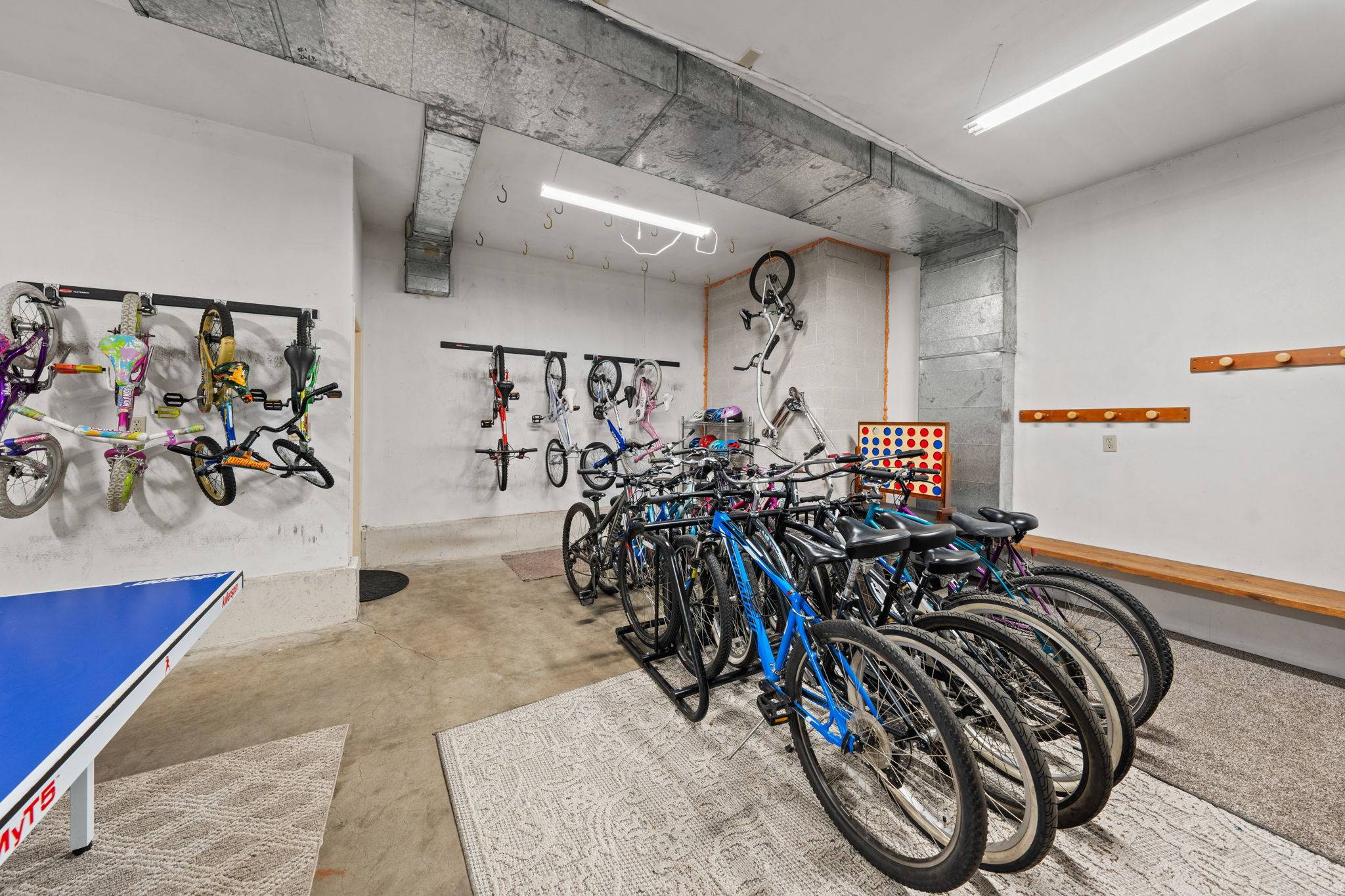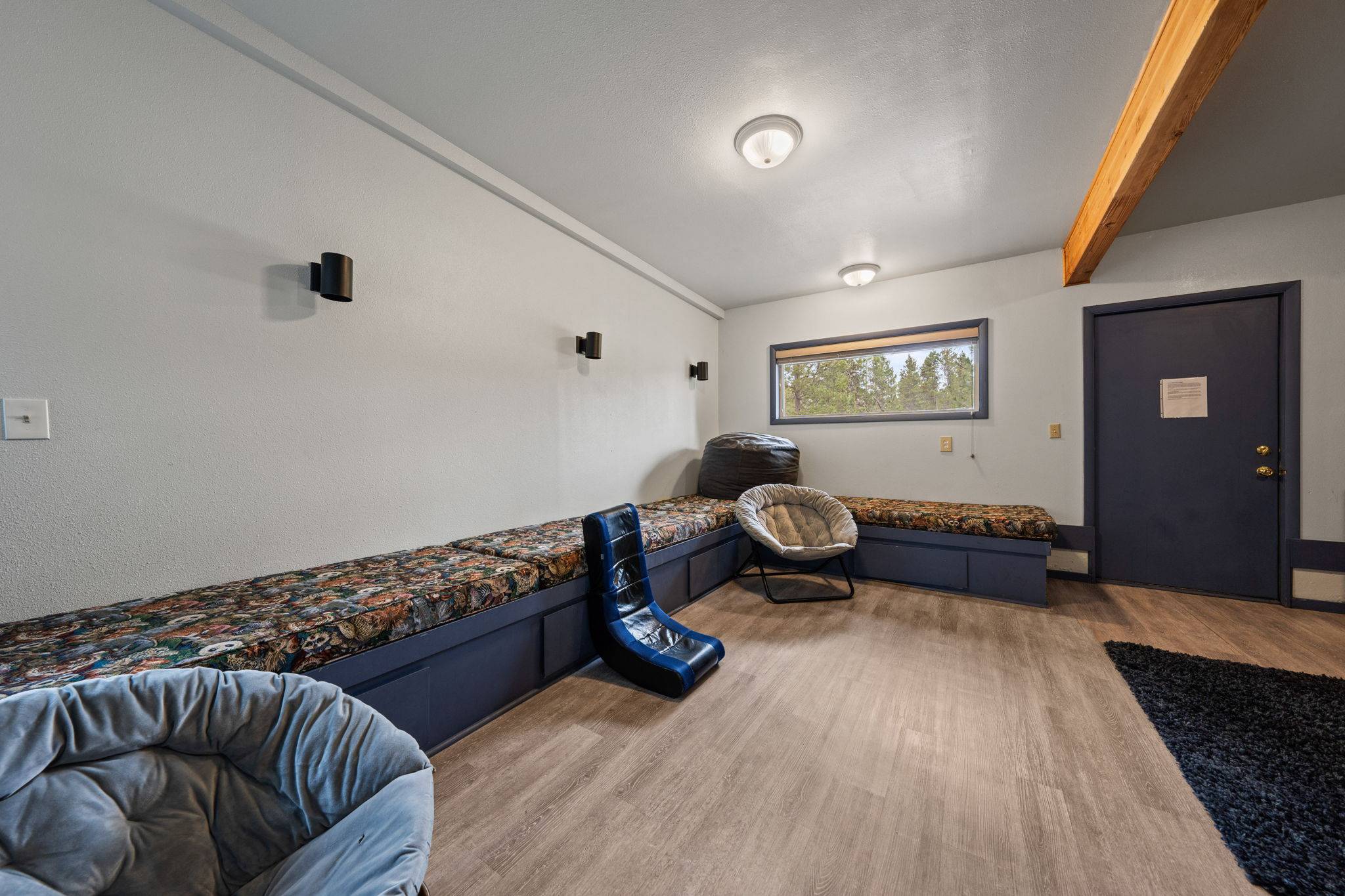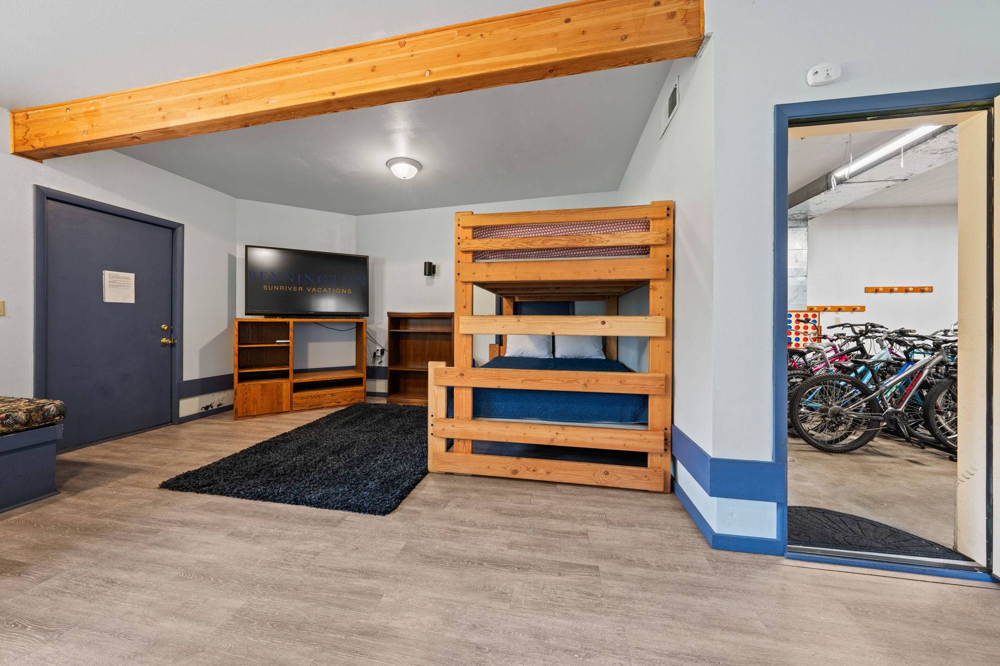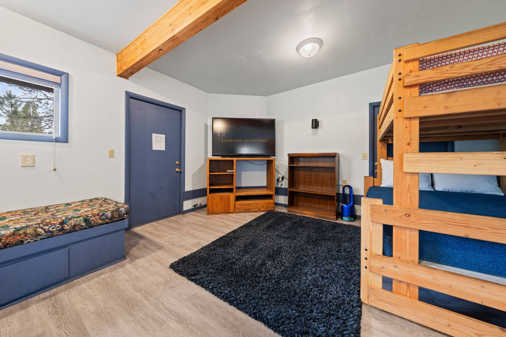 Through the garage is an additional bonus room with two bunk beds, built-in sleeping pads, TV, and DVD player. Please note: this room does not heat well, may be too cold for sleeping in the winter.