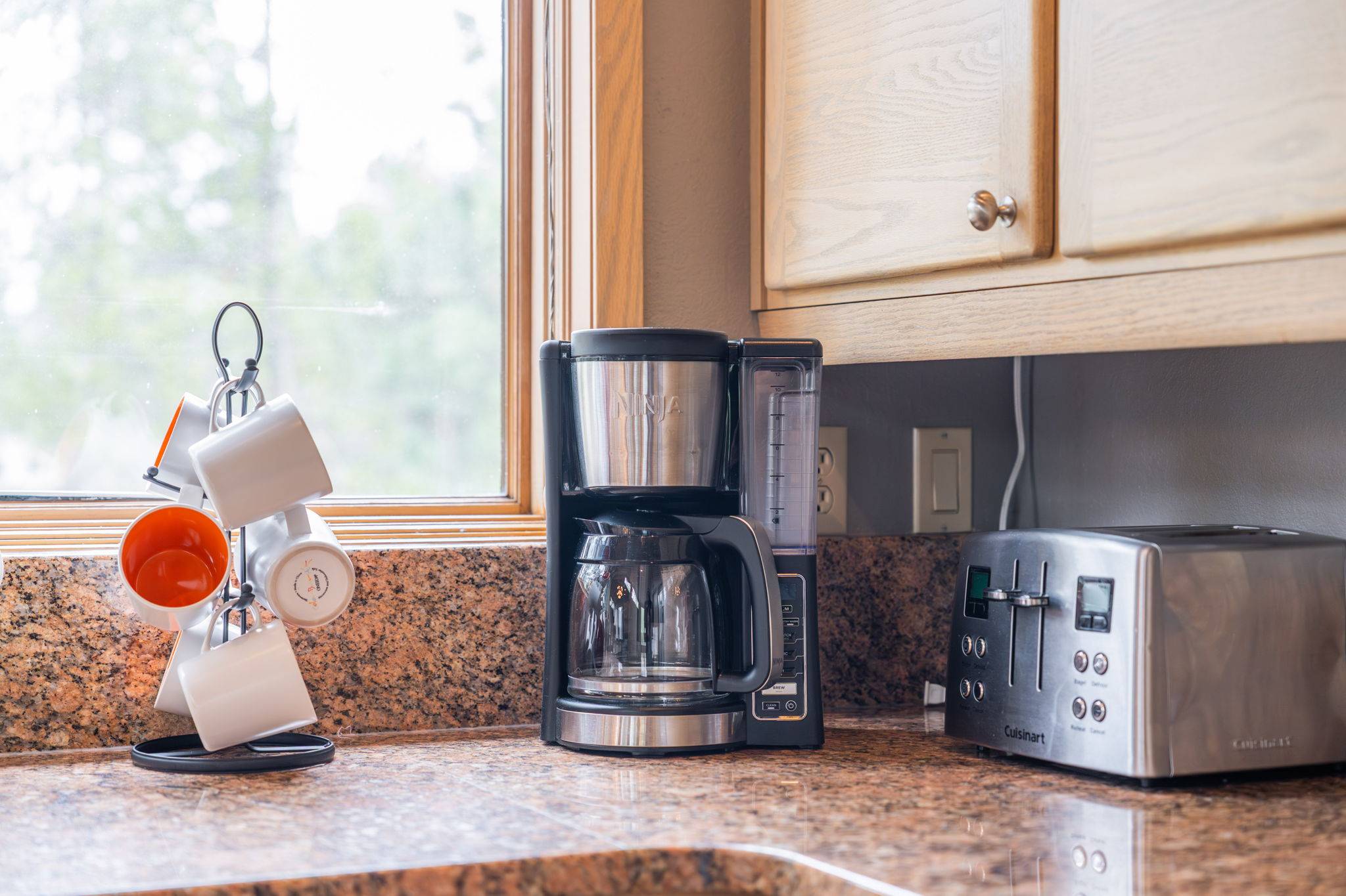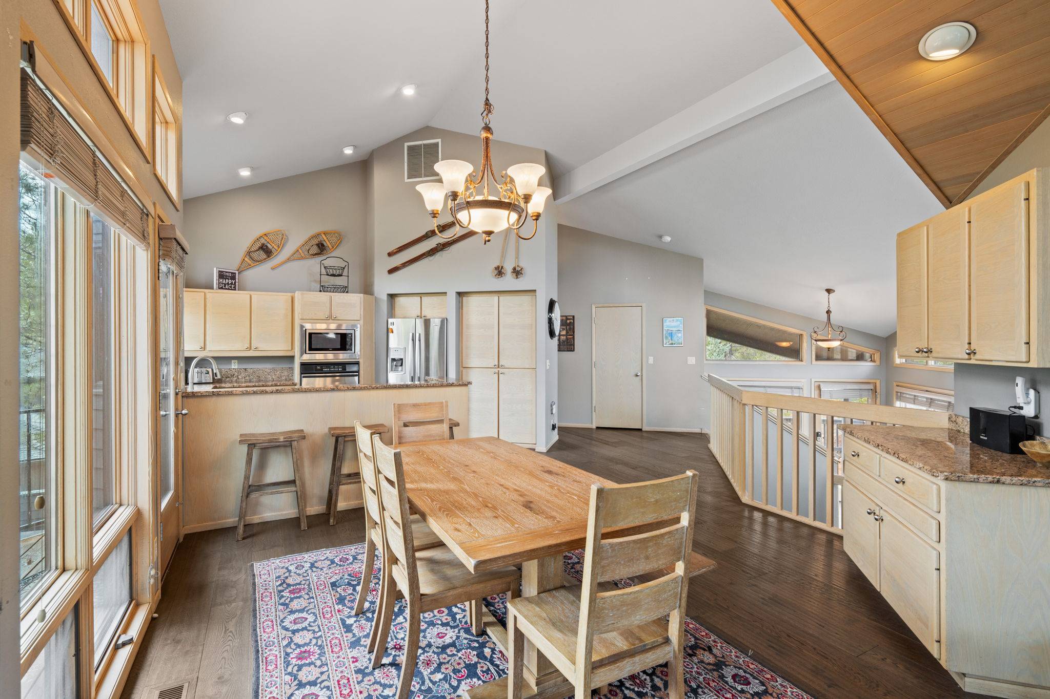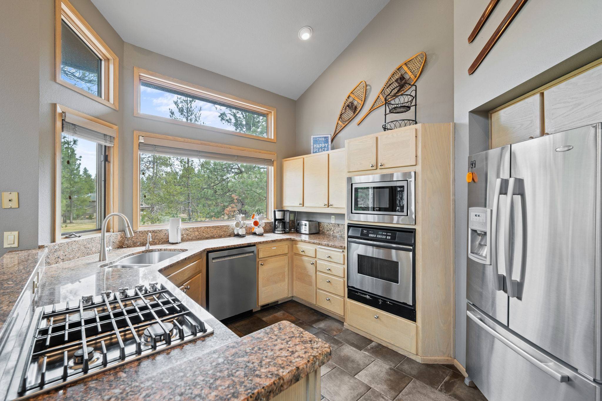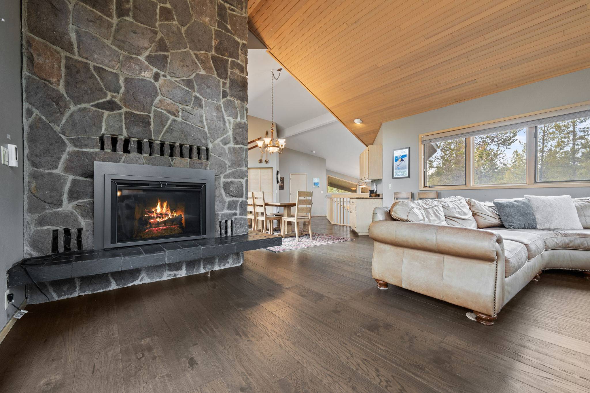 Step into the vaulted-ceiling living room, where natural light pours in, creating a warm, inviting space to unwind. Stream your favorite shows on the smart TV, or cozy up by the fireplace after a day of adventure.