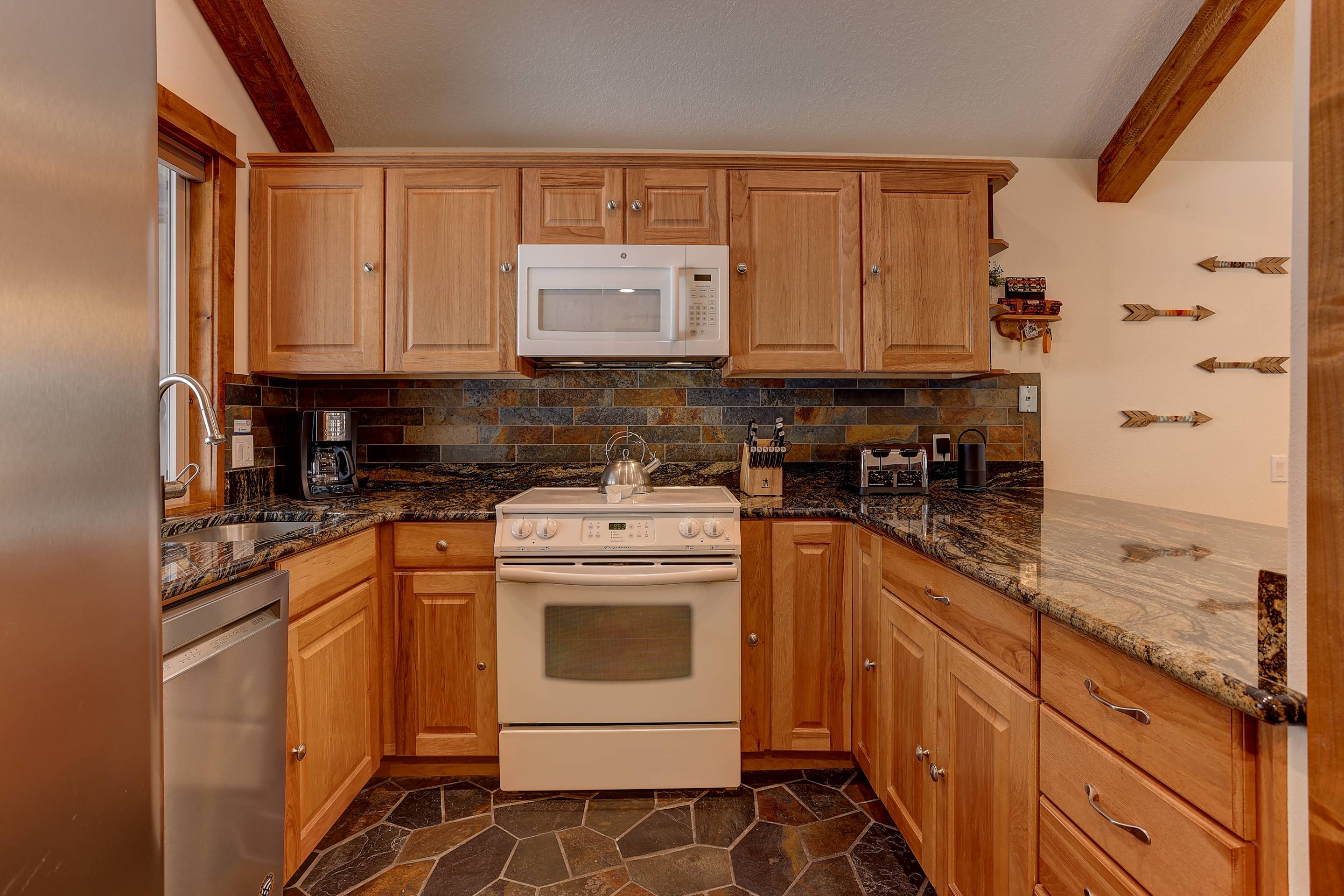 Warm and inviting, this thoughtfully furnished Sunriver home has the feeling of a cozy cabin in the woods, with updated features like hardwood floors and granite countertops. Downstairs air-conditioning keeps the home cool during the day, while a gas river-rock fireplace in the living room will keep you cozy when watching the big game or a movie on the 55" Smart TV with home theater system in the living room.