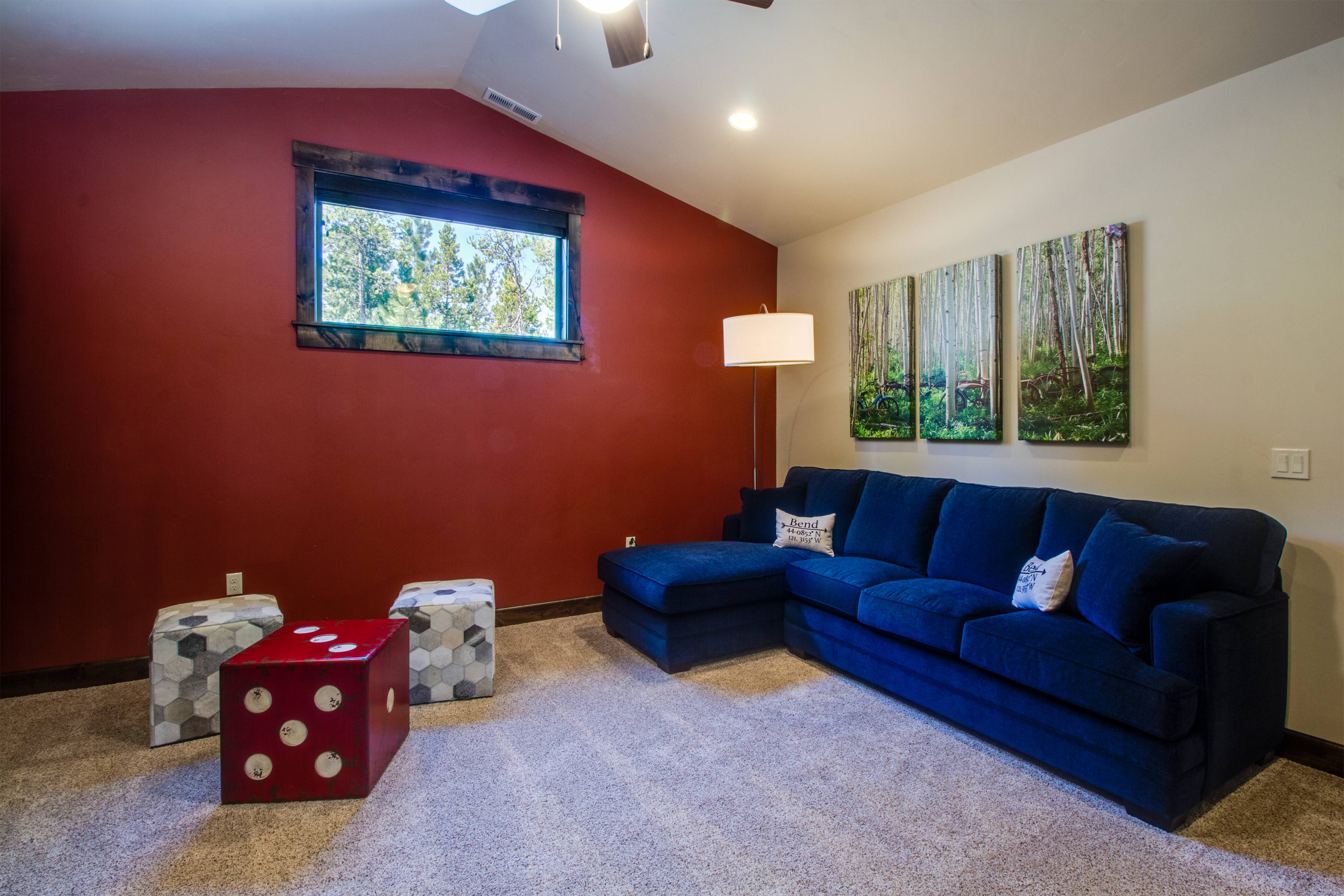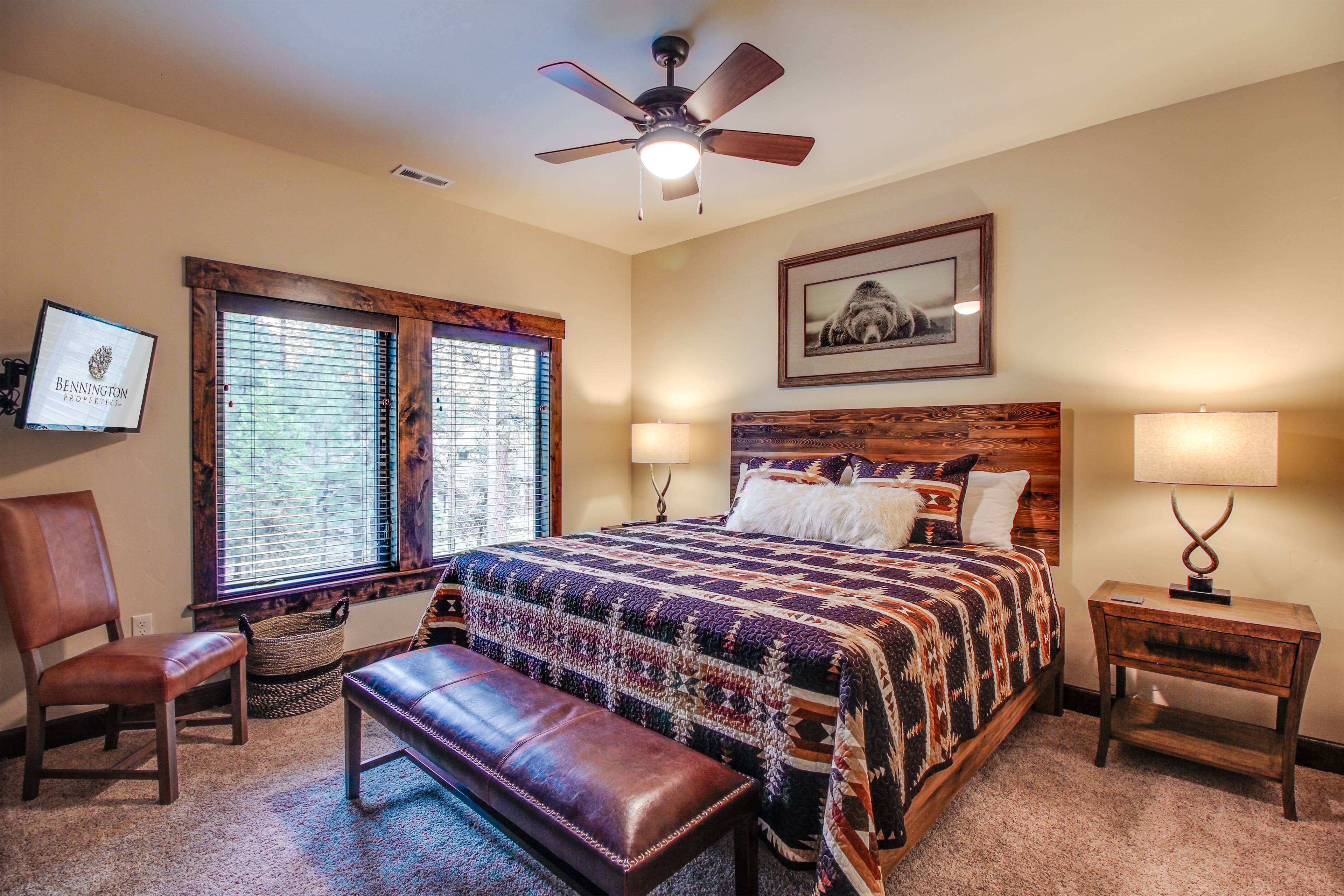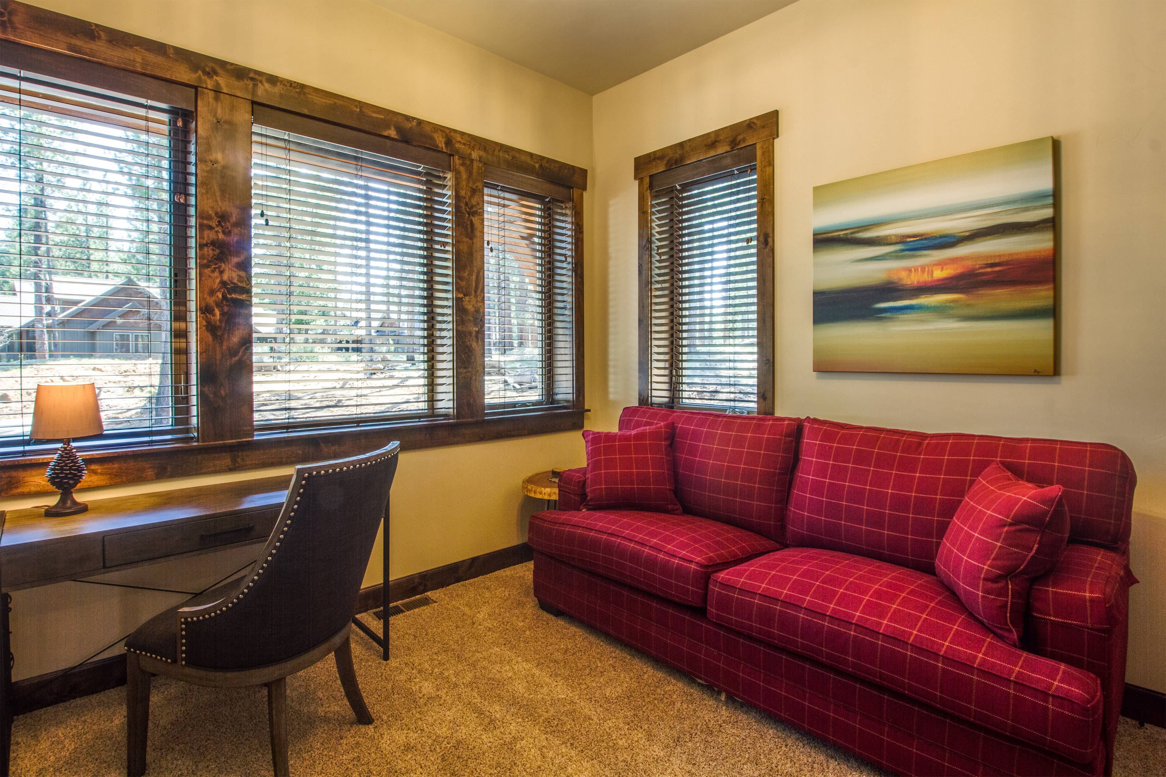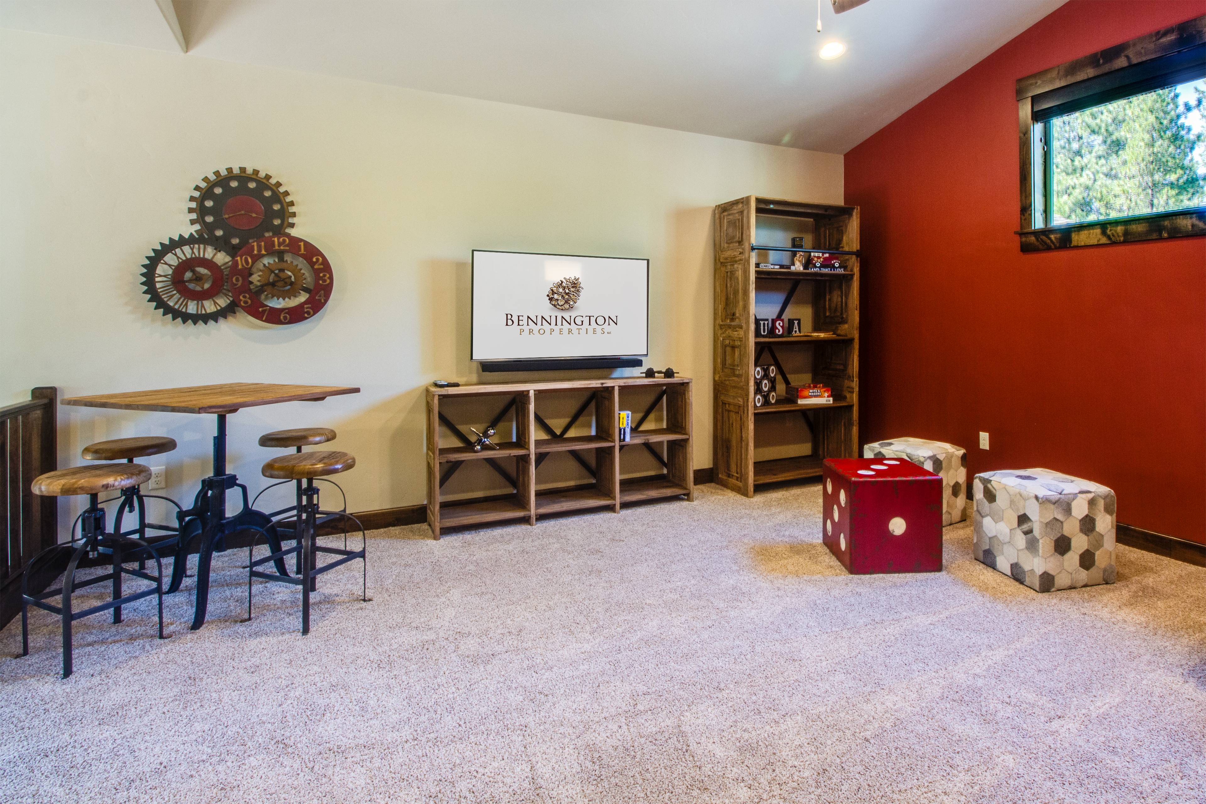 The living room, designed for family gatherings, features comfortable furnishings, a gas fireplace, and large TV. There is additional work and/or sleeping space in the bonus room downstairs which includes a sleeper sofa and desk. The King ensuite is on the main floor and includes a large TV, jetted, soaking tub, and walk-in closet.