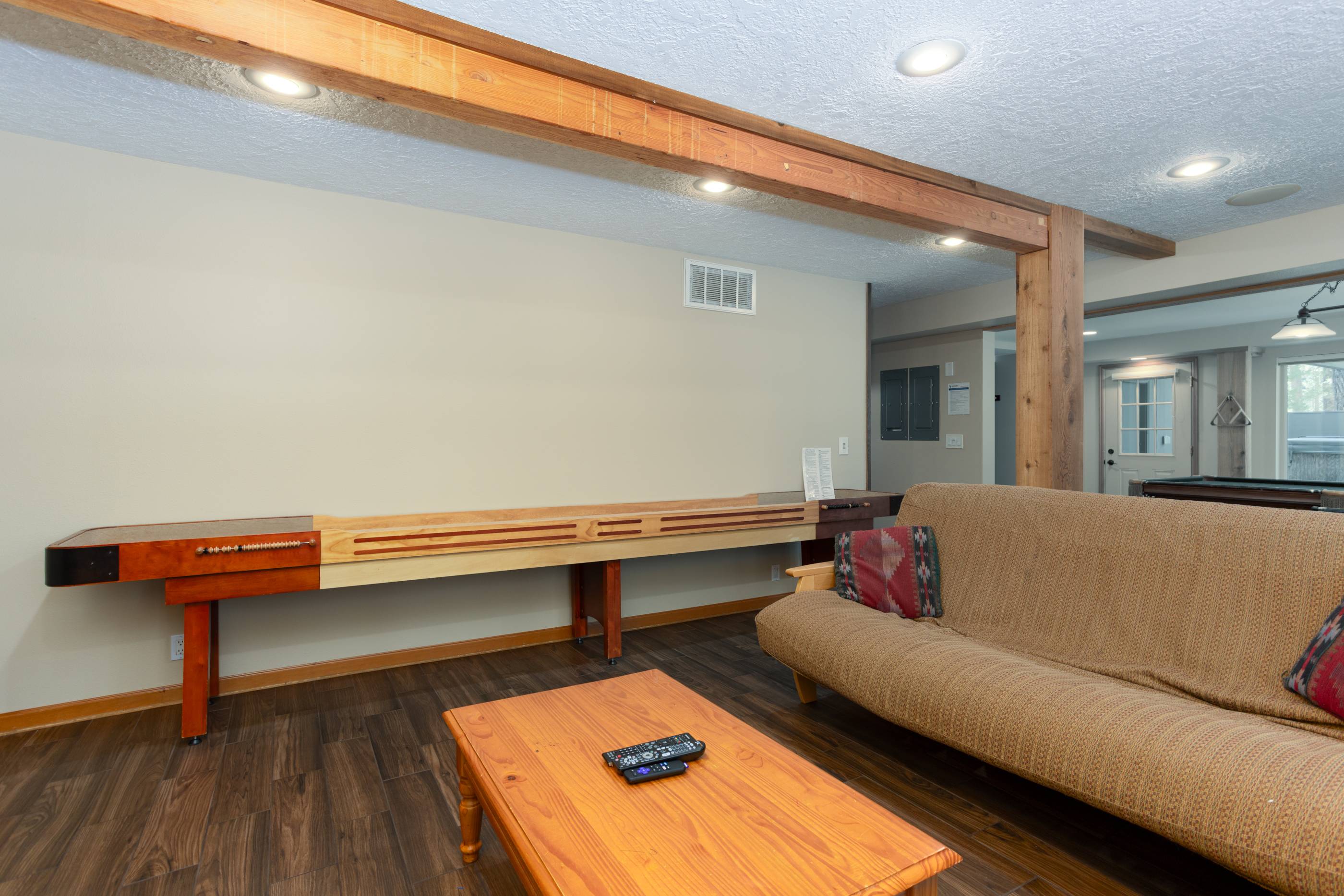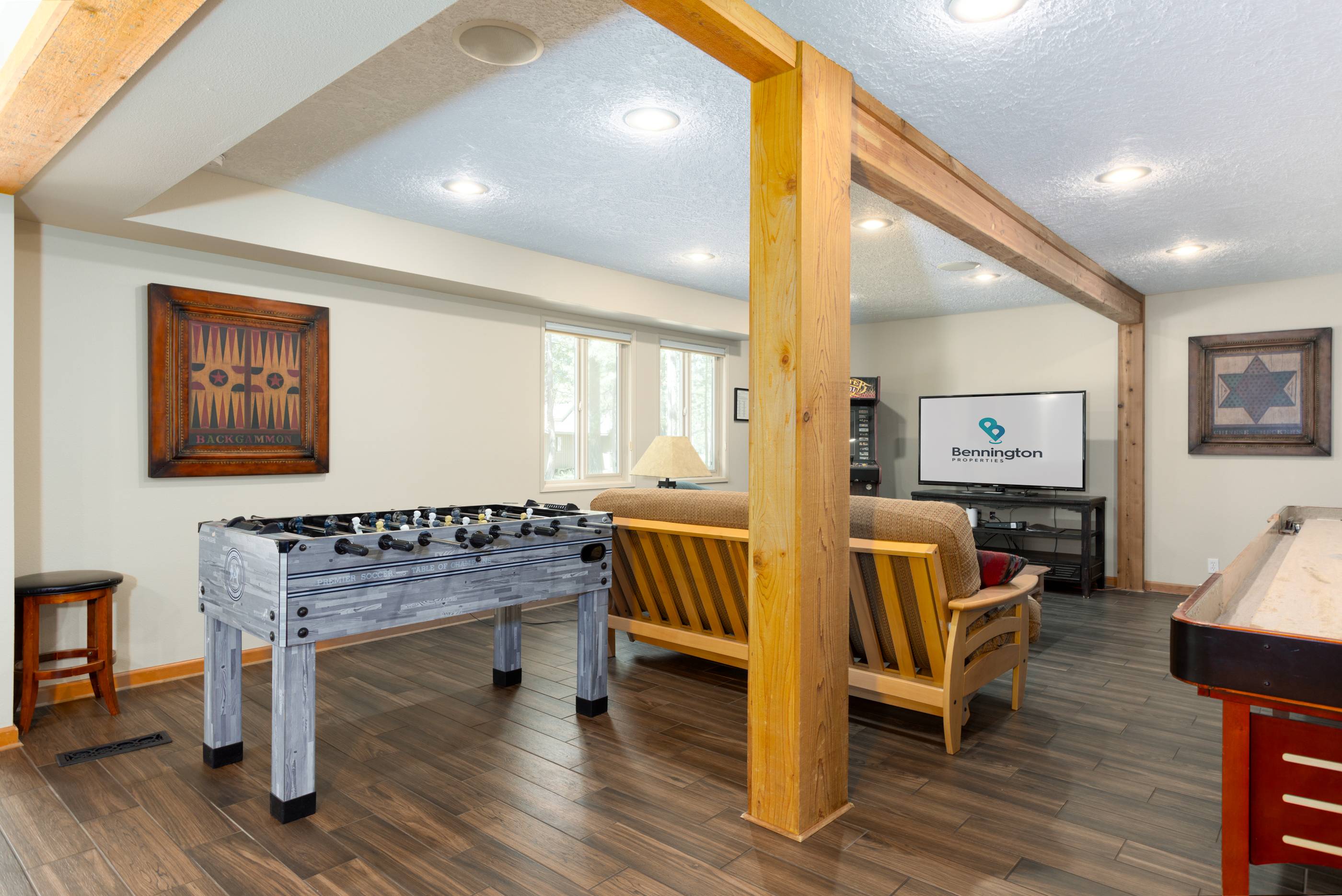 This beautiful, reverse living home is amazing! An entertainer's dream with flat screen TVs throughout the home and plenty to do for everyone. Two Big Screen TV's, one in the living room with surround sound and one in the Rec Room, provide the perfect stage for the big game or Family Movie Night. What all is in the Rec Room? We have everything from Foosball and Shuffle Board to a Pool Table and an arcade game. In addition to the Rec Room, enjoy the Hot Tub, Air Conditioning, and Sauna.