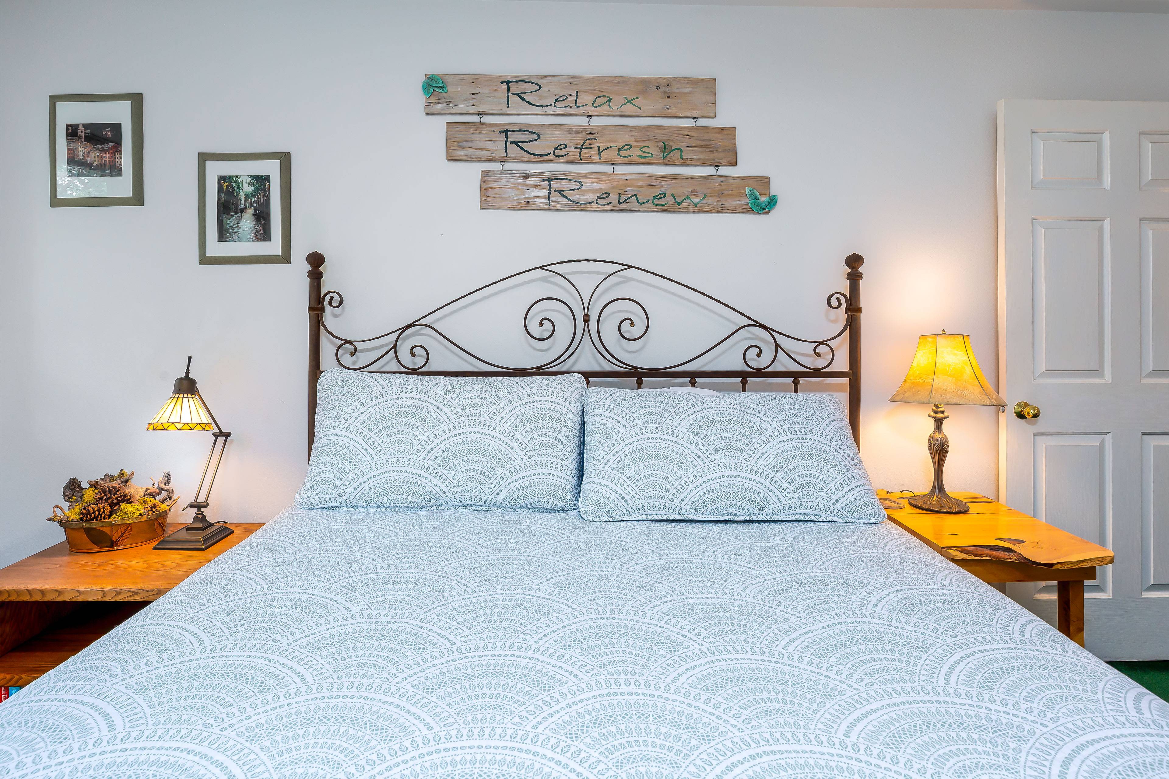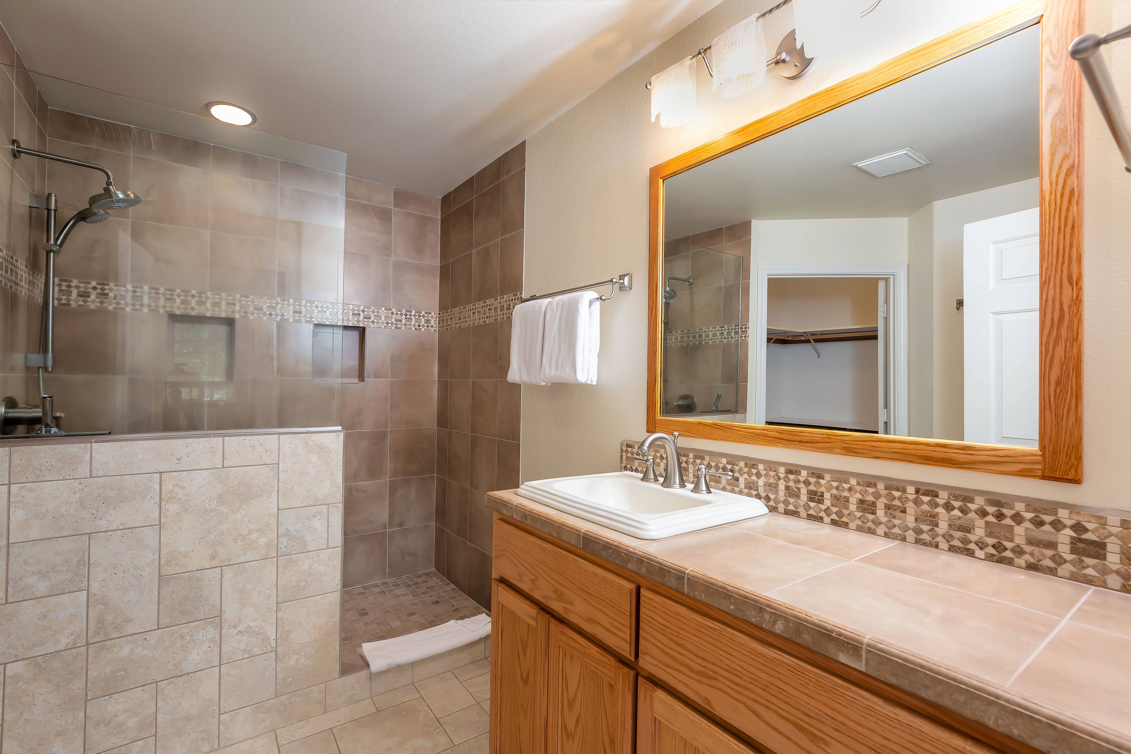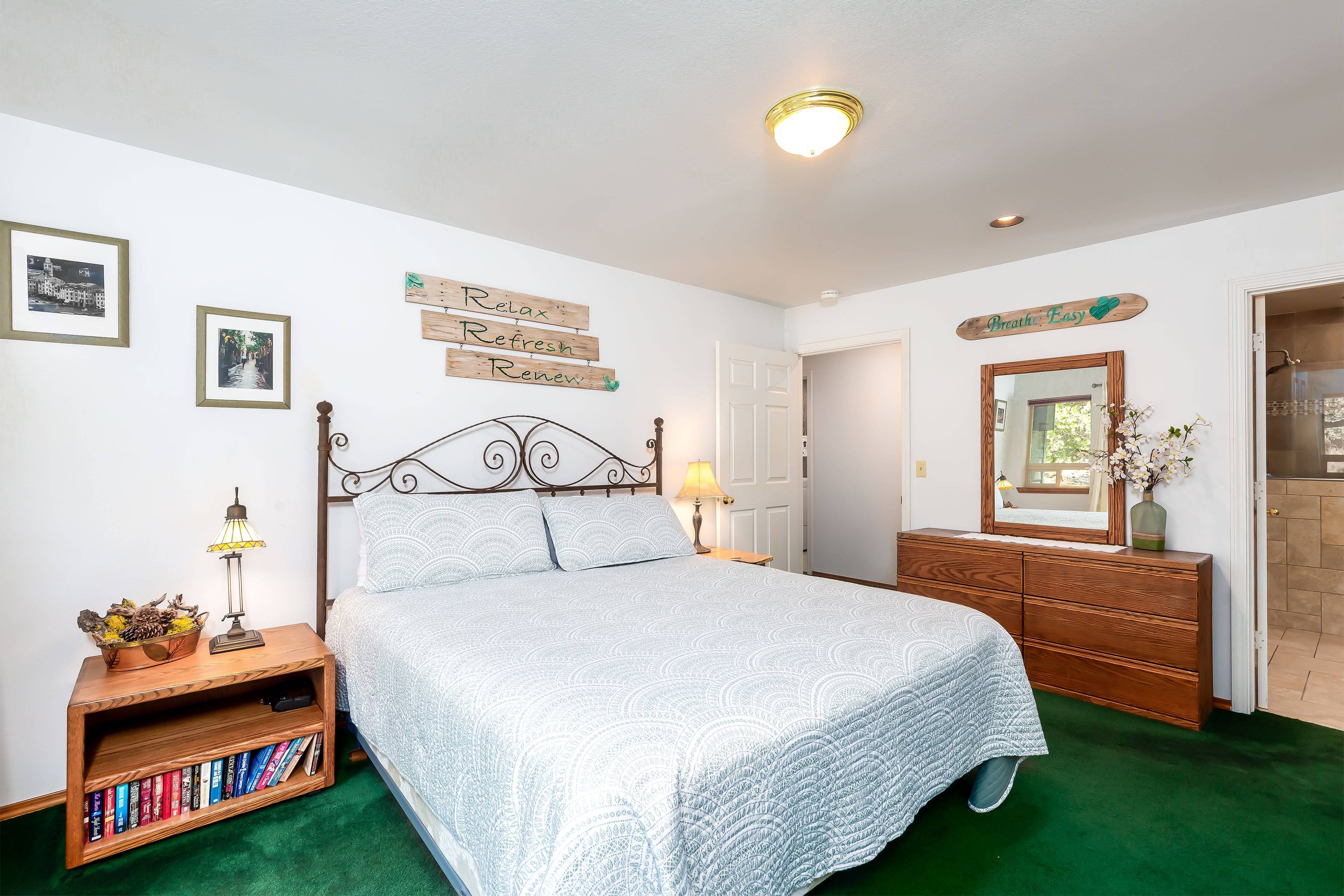 The main level ensuite bedroom has a King bed and attached private bath with large walk-in shower and access to the back deck. There is a queen bedroom and full bathroom on this level as well.