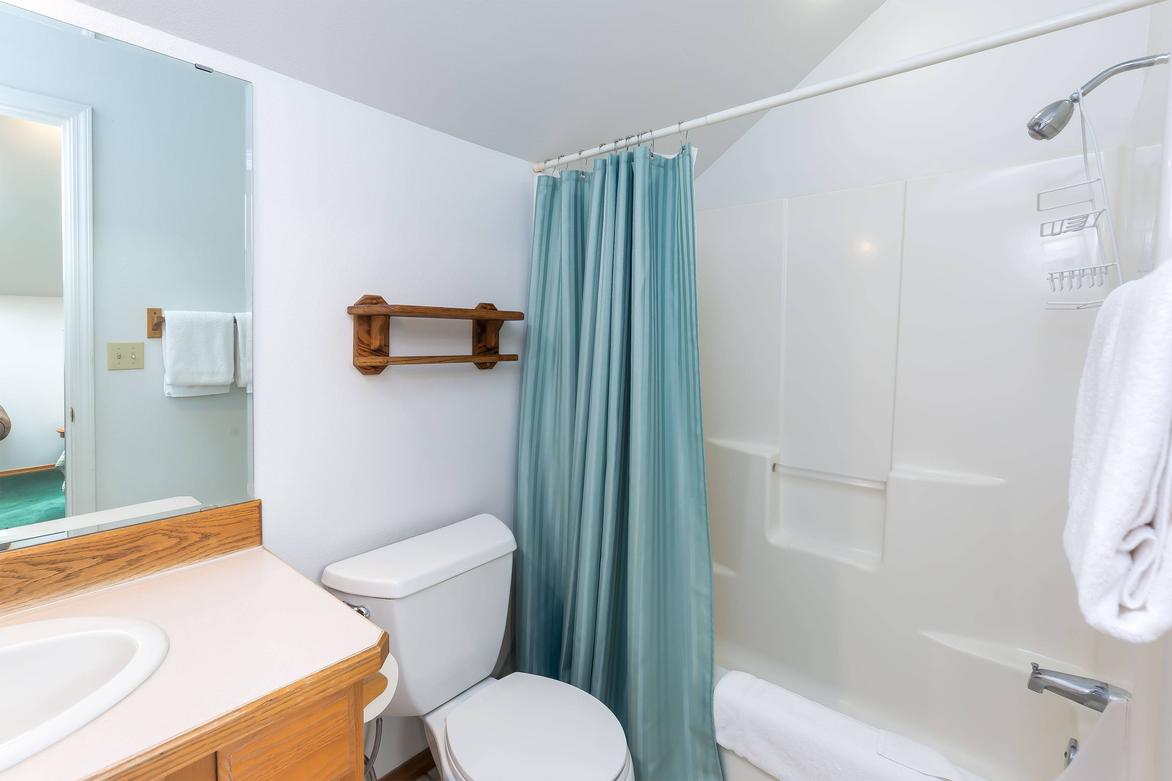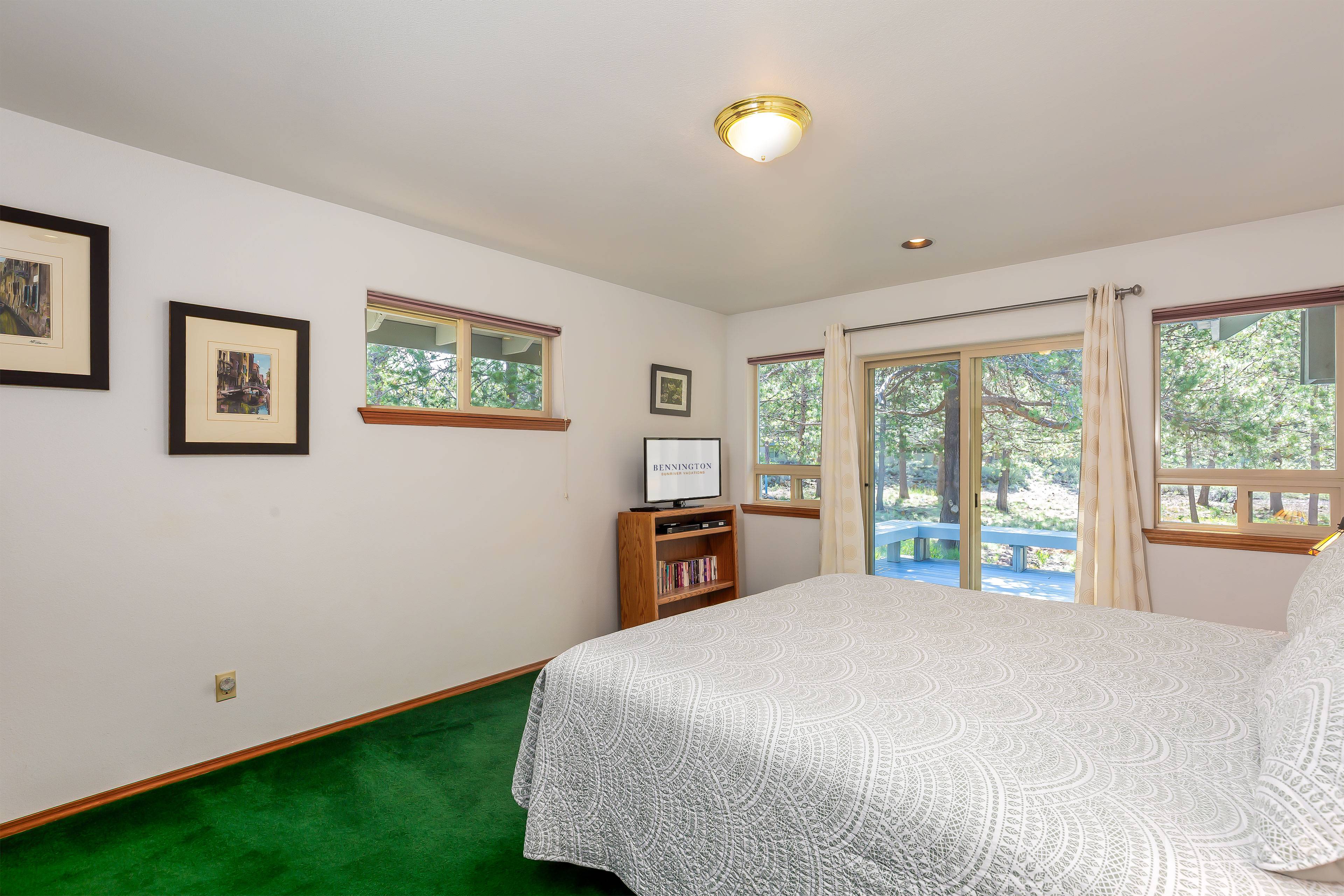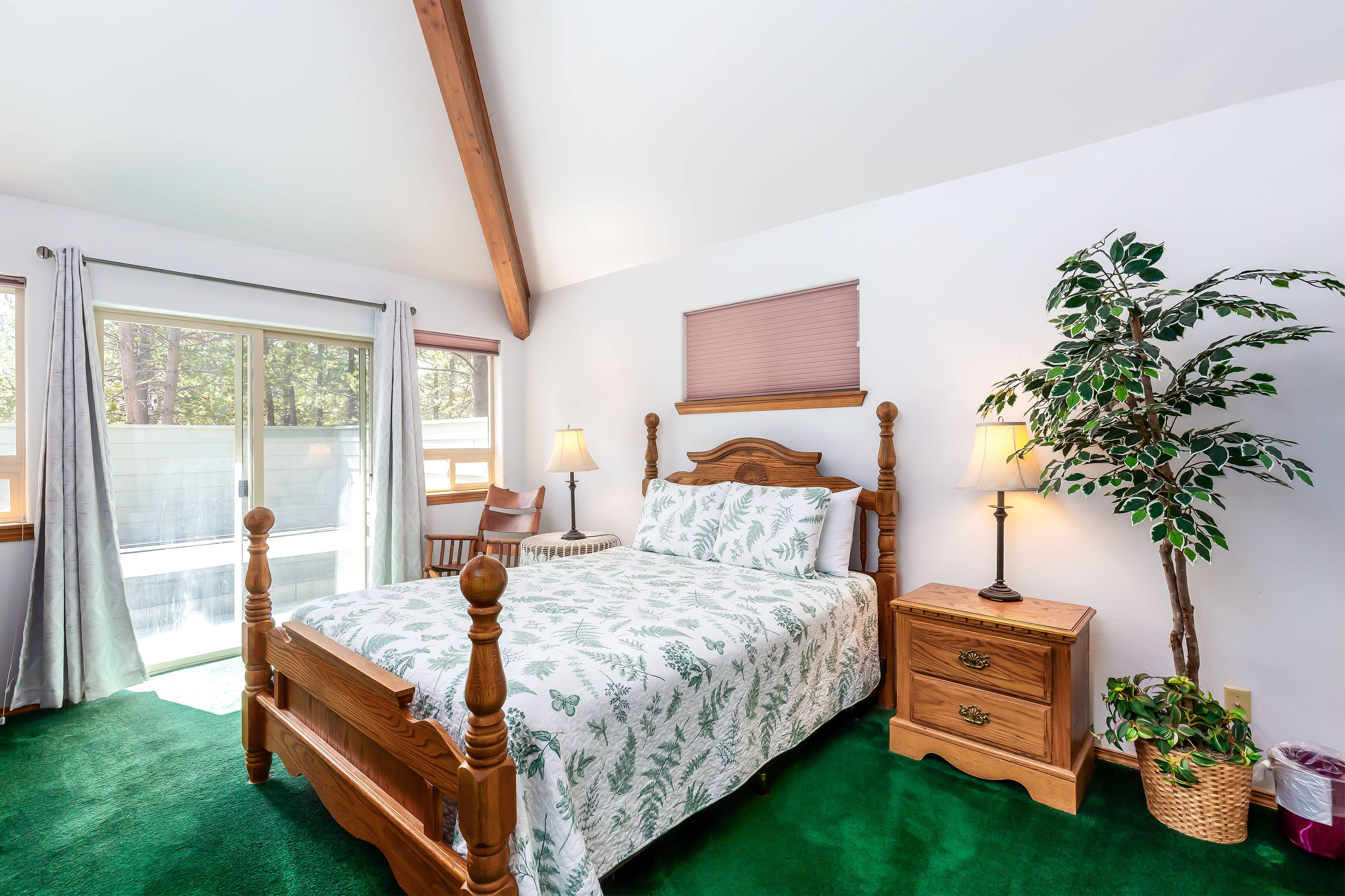 The main level ensuite bedroom has a King bed and attached private bath with large walk-in shower and access to the back deck. There is a queen bedroom and full bathroom on this level as well.