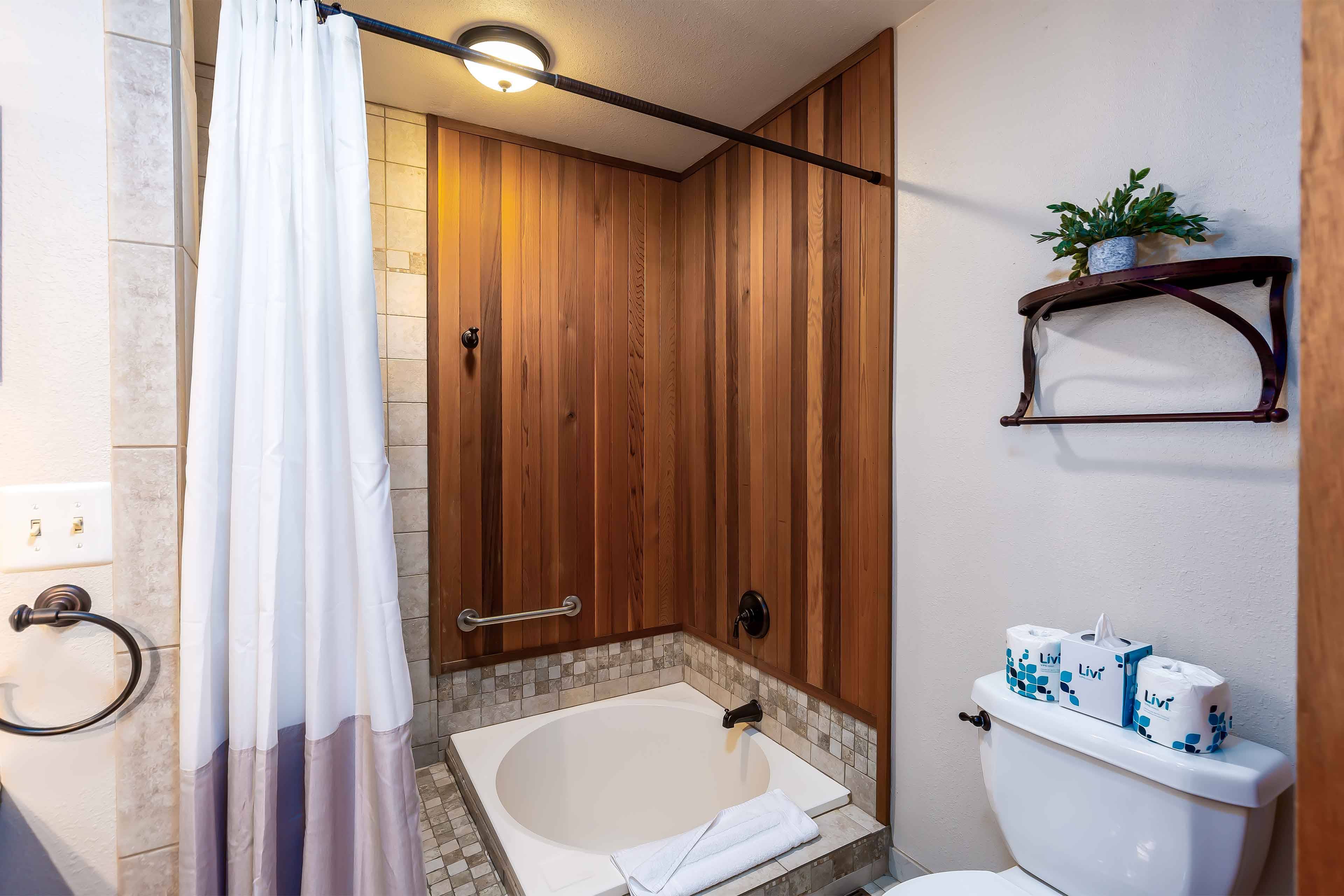 The main bedroom boasts a King bed, electric fireplace, Japanese soaking tub, and a private deck—ideal for morning coffee or evening wind-downs. The second bedroom features a Queen bed plus a bunk bed, perfect for kids or additional guests. There's also a sleeper sofa in the living room that accommodates two extra guests comfortably.