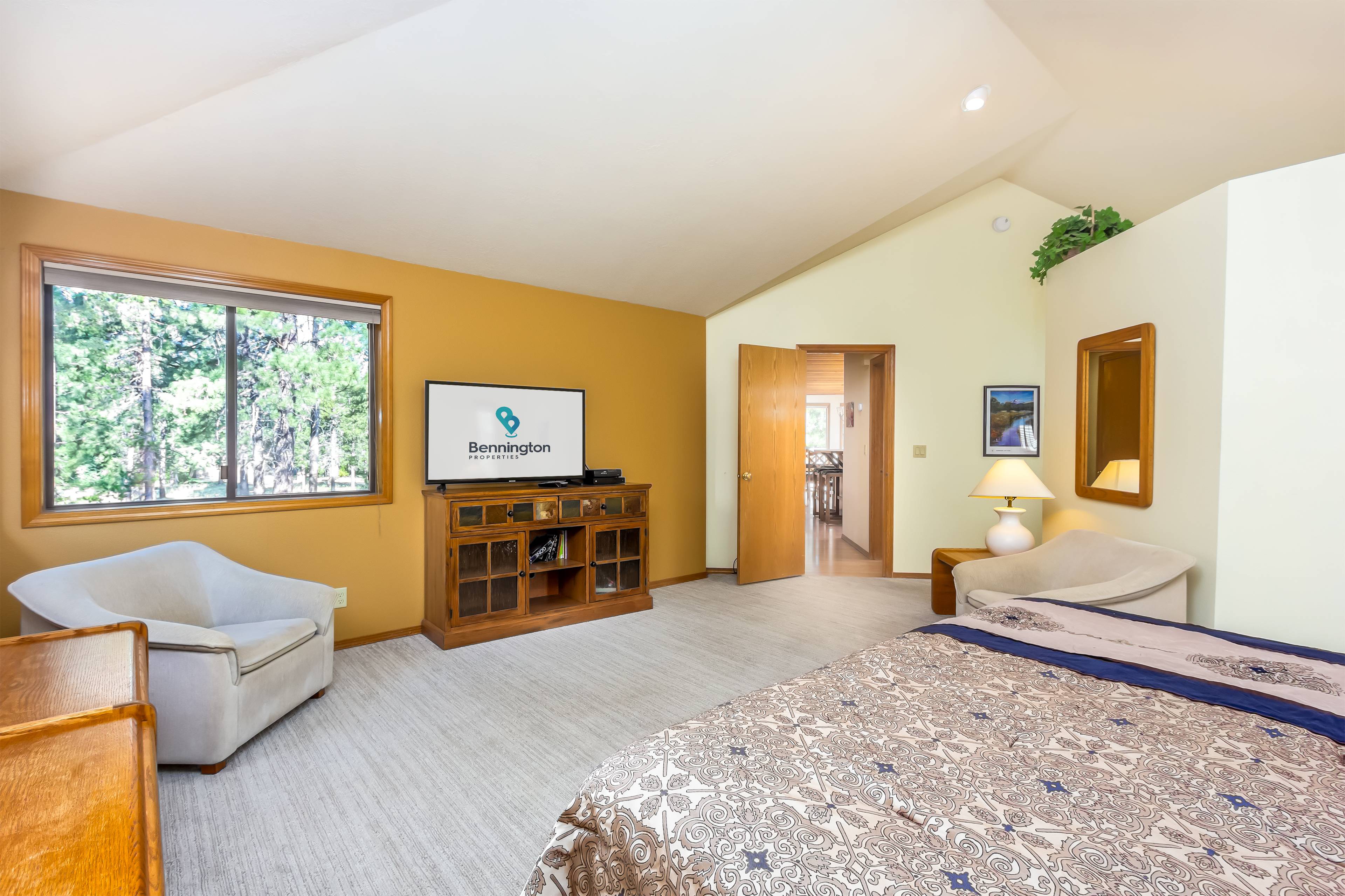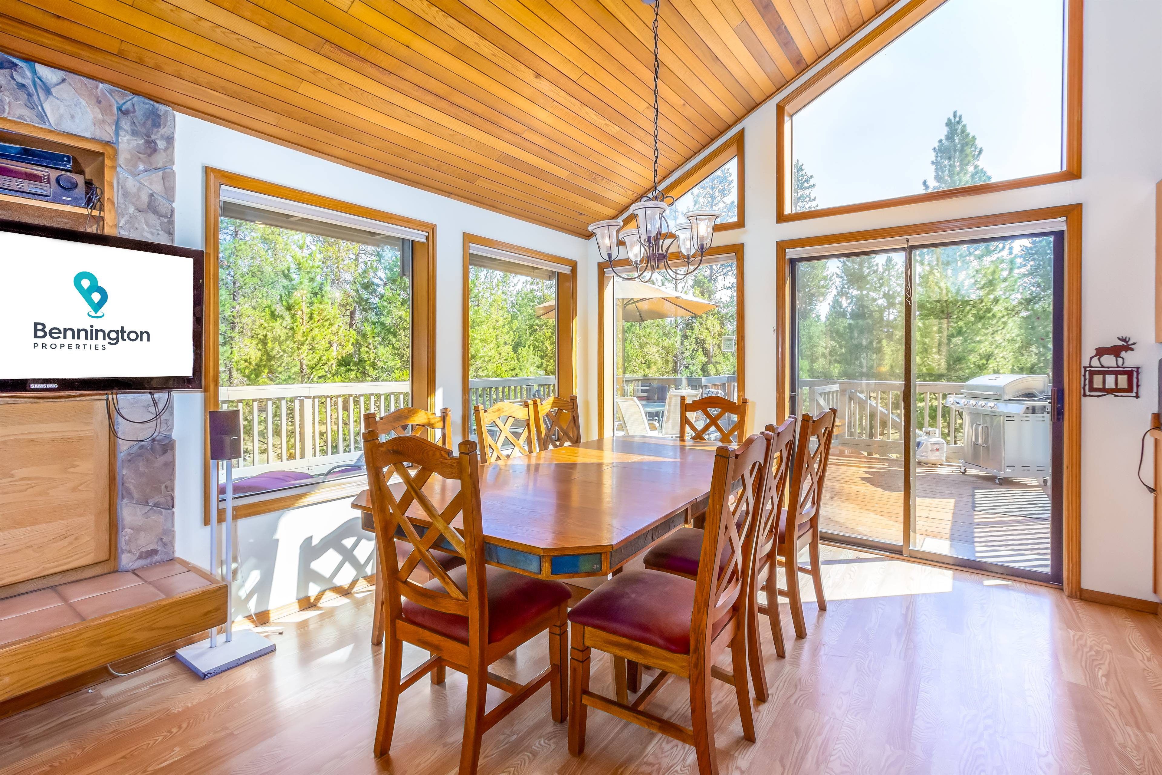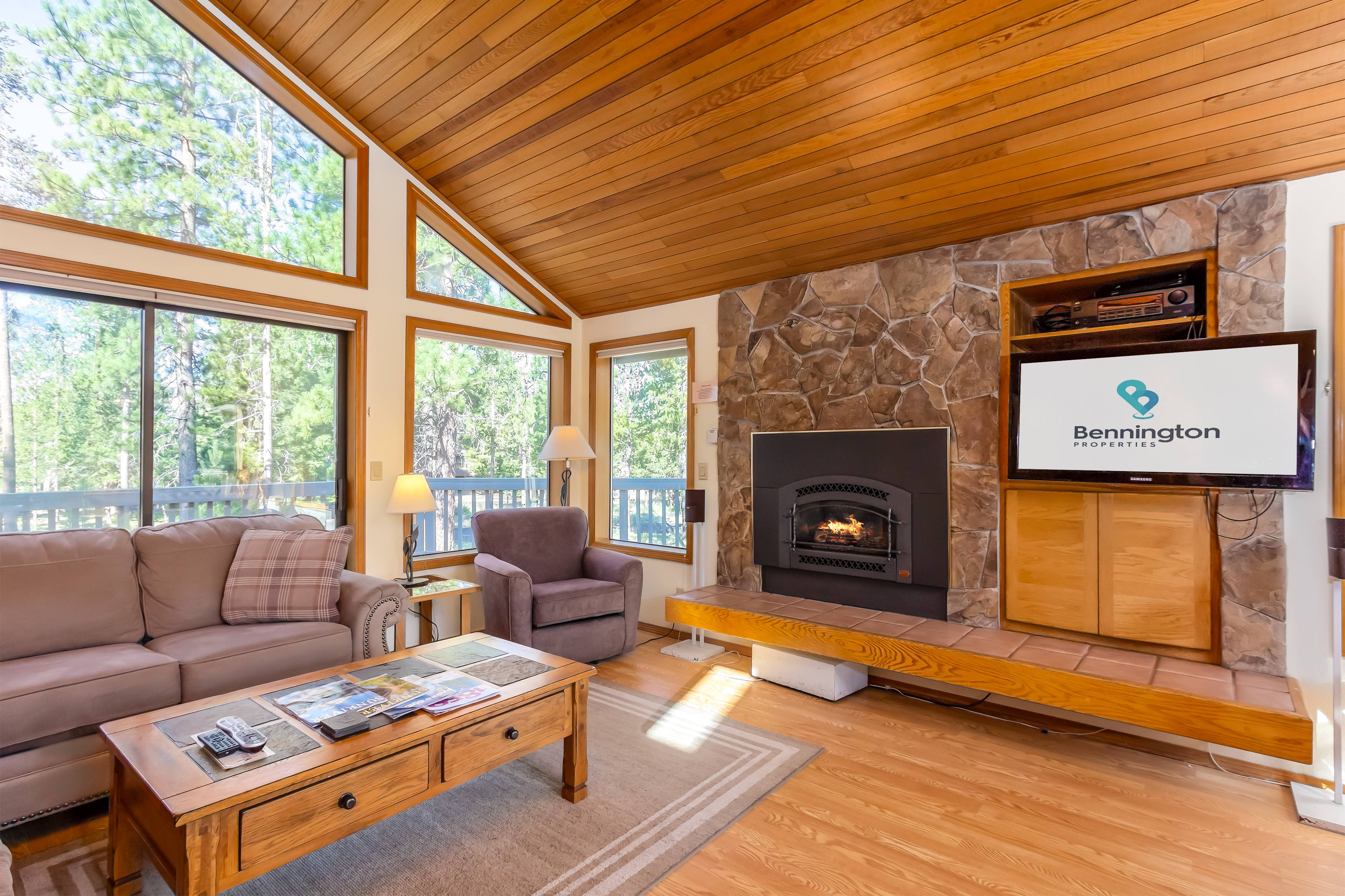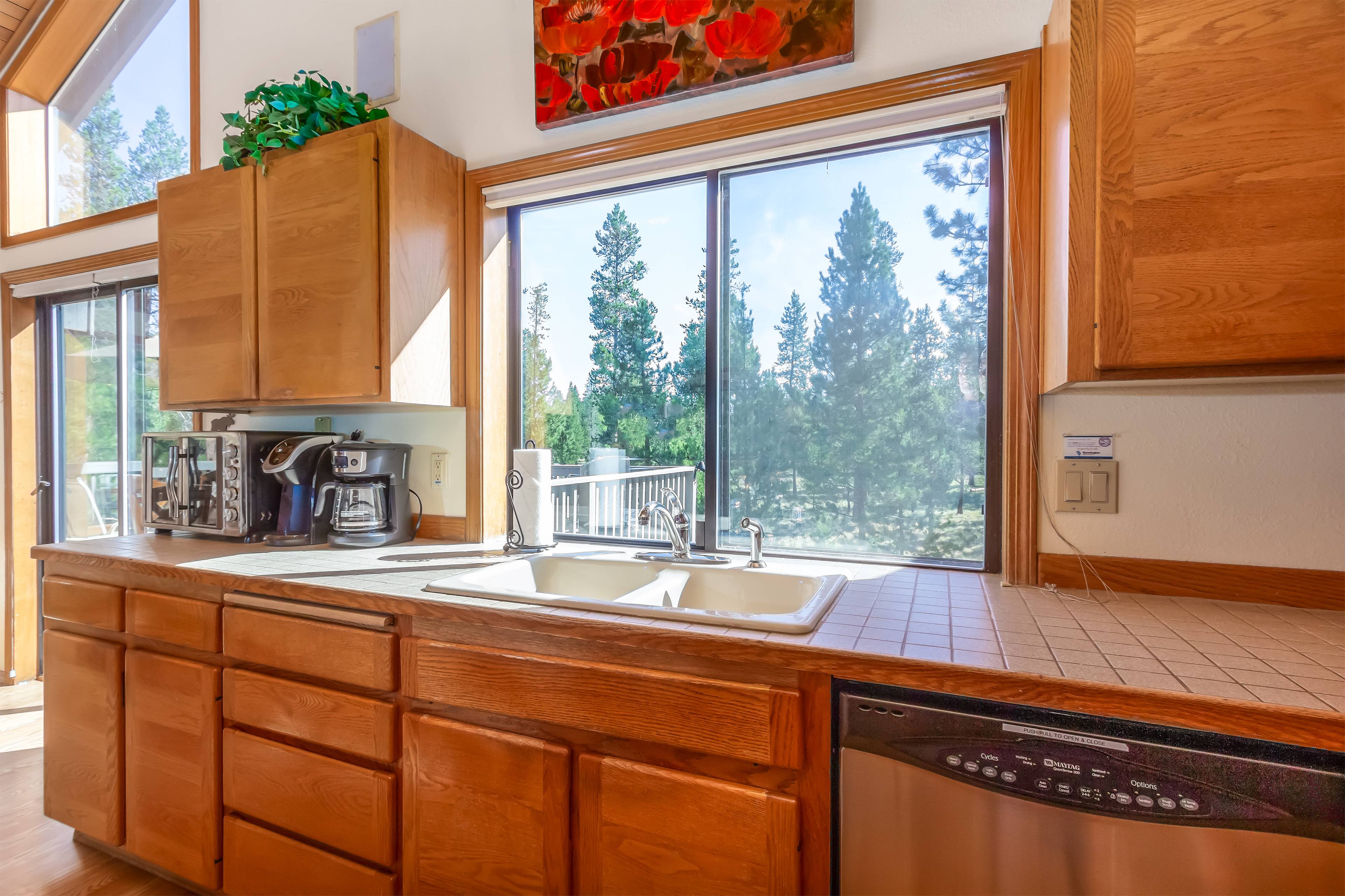 Great home in north Sunriver with tons of gorgeous natural light pouring in through the many windows. This reverse-living, air-conditioned home features a great room upstairs with cozy living room furnishings, a dining room with seating for 8, plus 3 more at the breakfast bar, and a fully stocked kitchen with a Keurig.