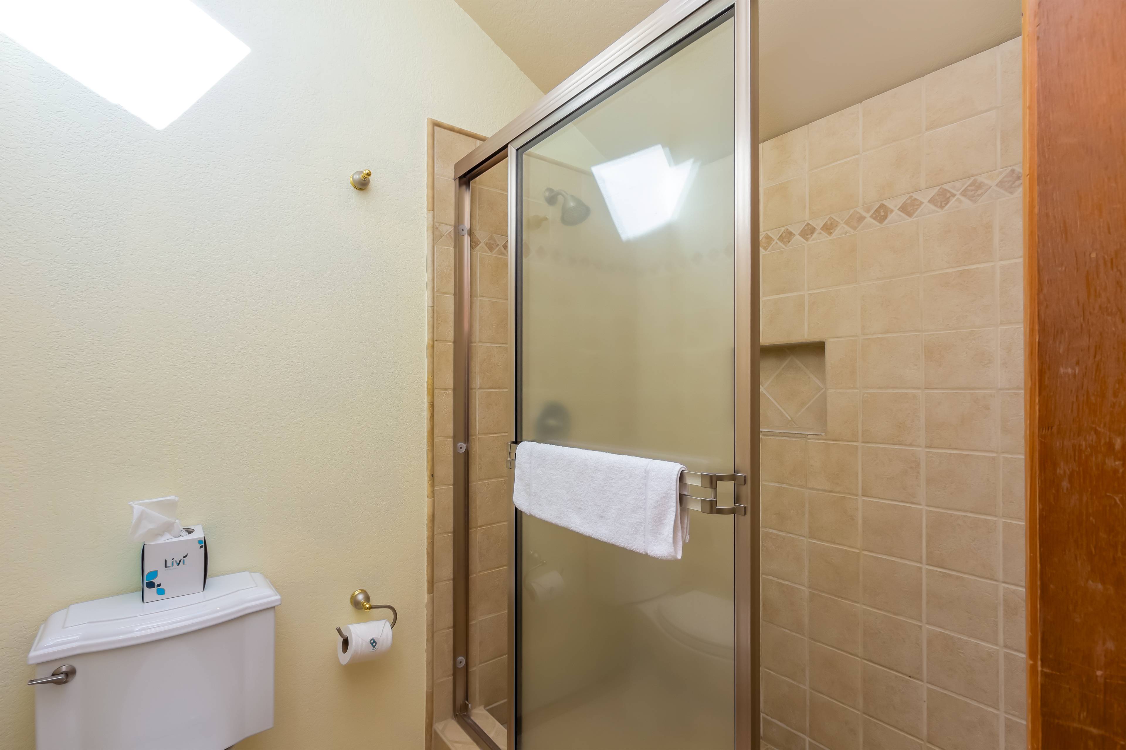 Upstairs, you'll find the king primary bedroom with a large TV, a sitting area, a private bath with a walk-in shower, plus a half guest bathroom.